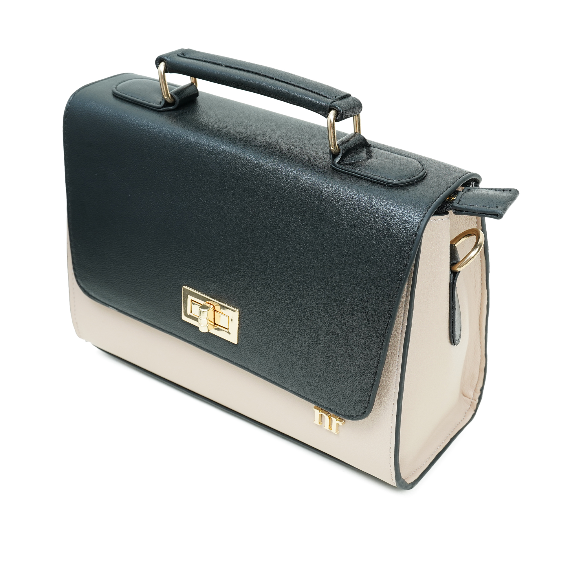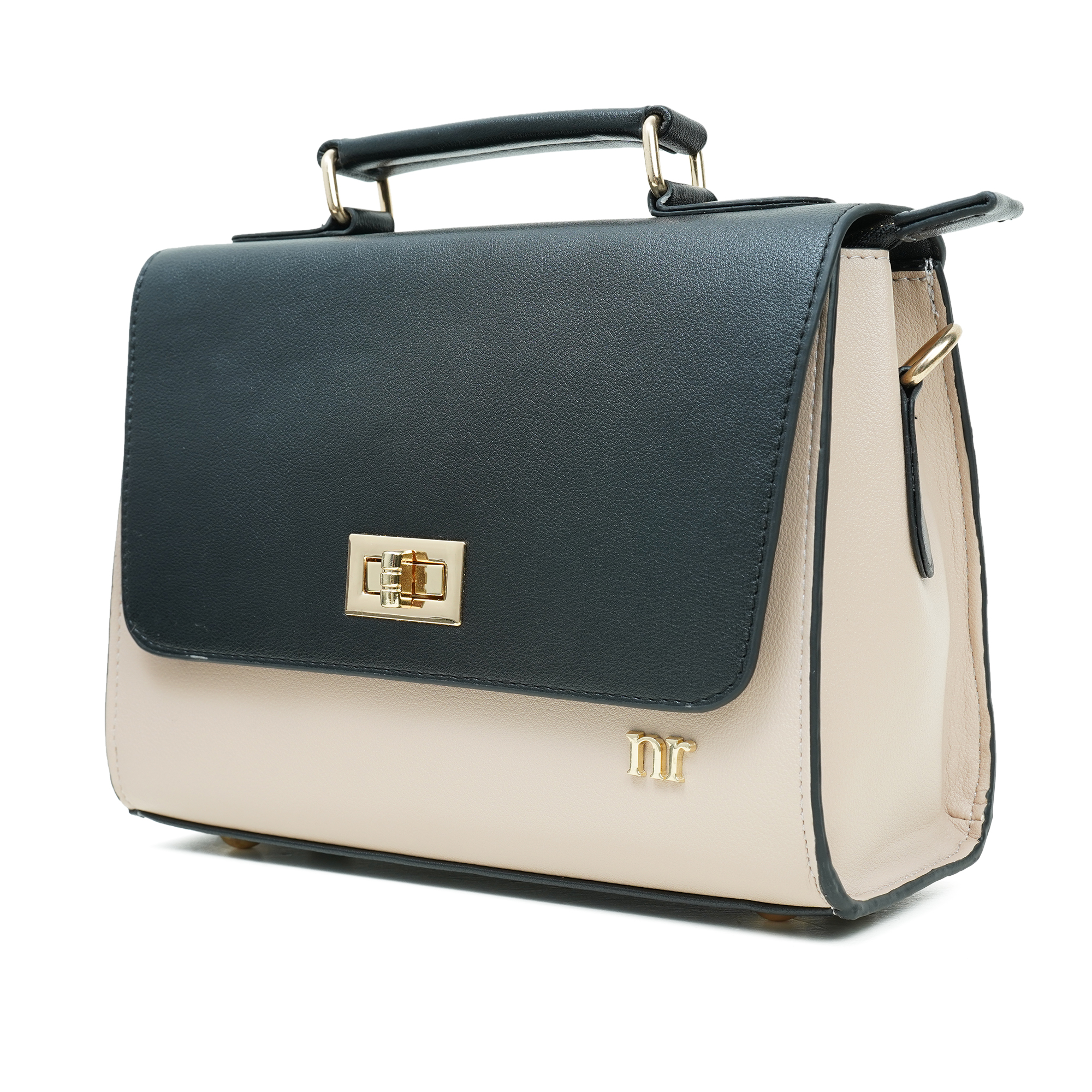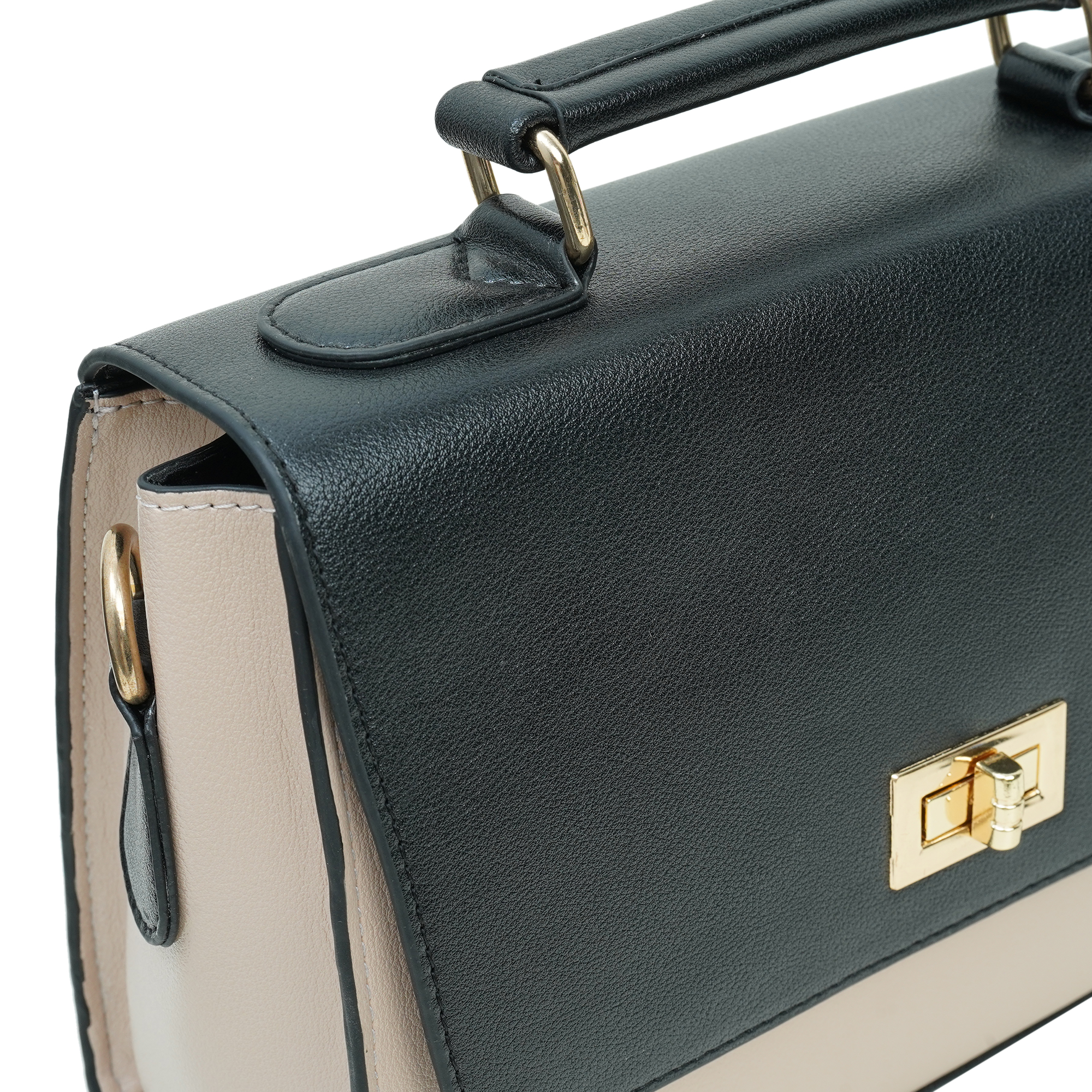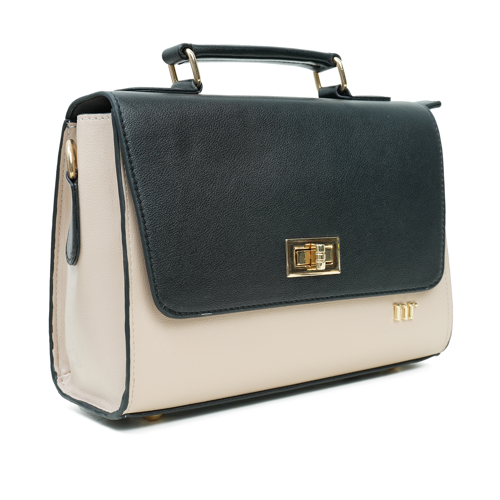 - Golden metal hardware with elegant beige accent trim