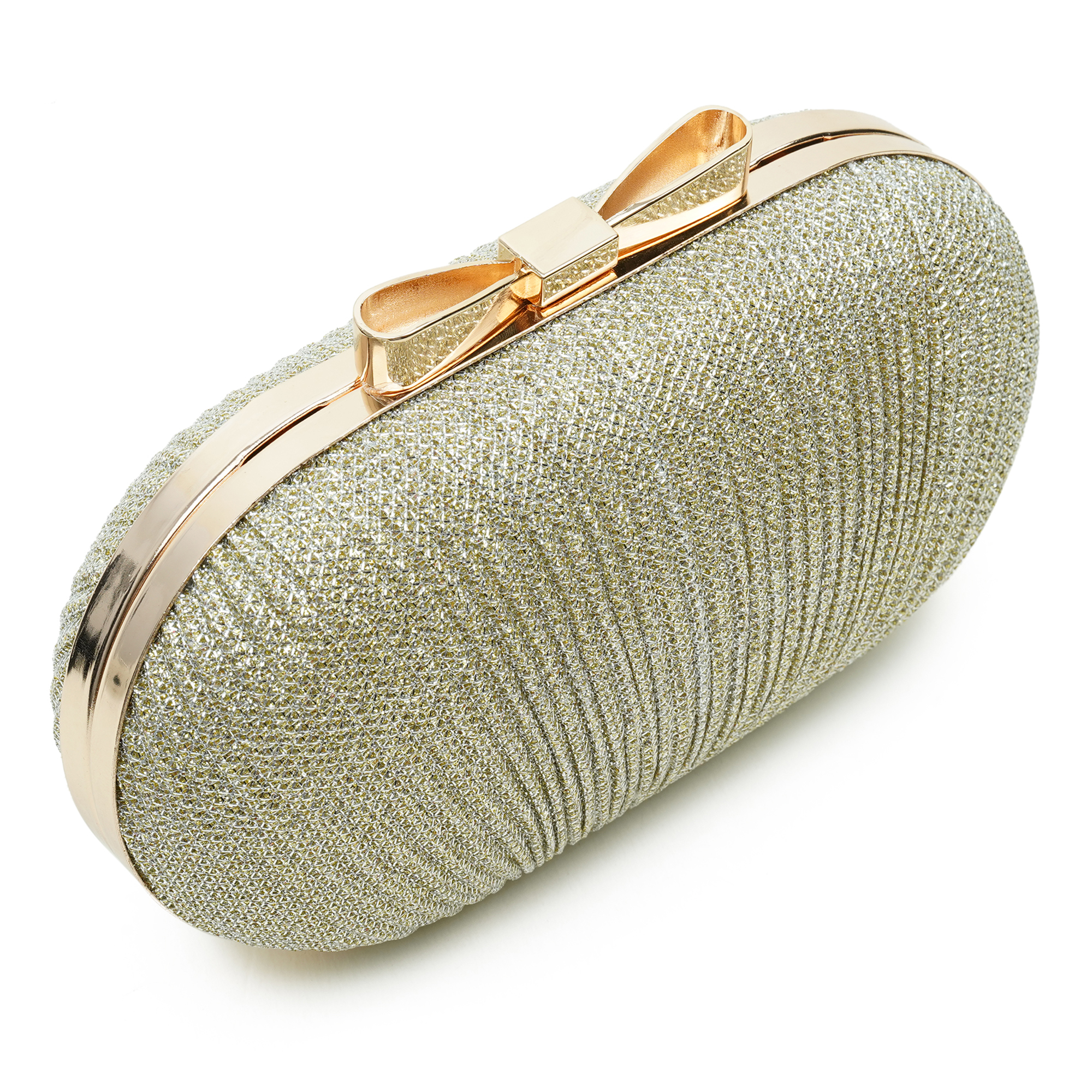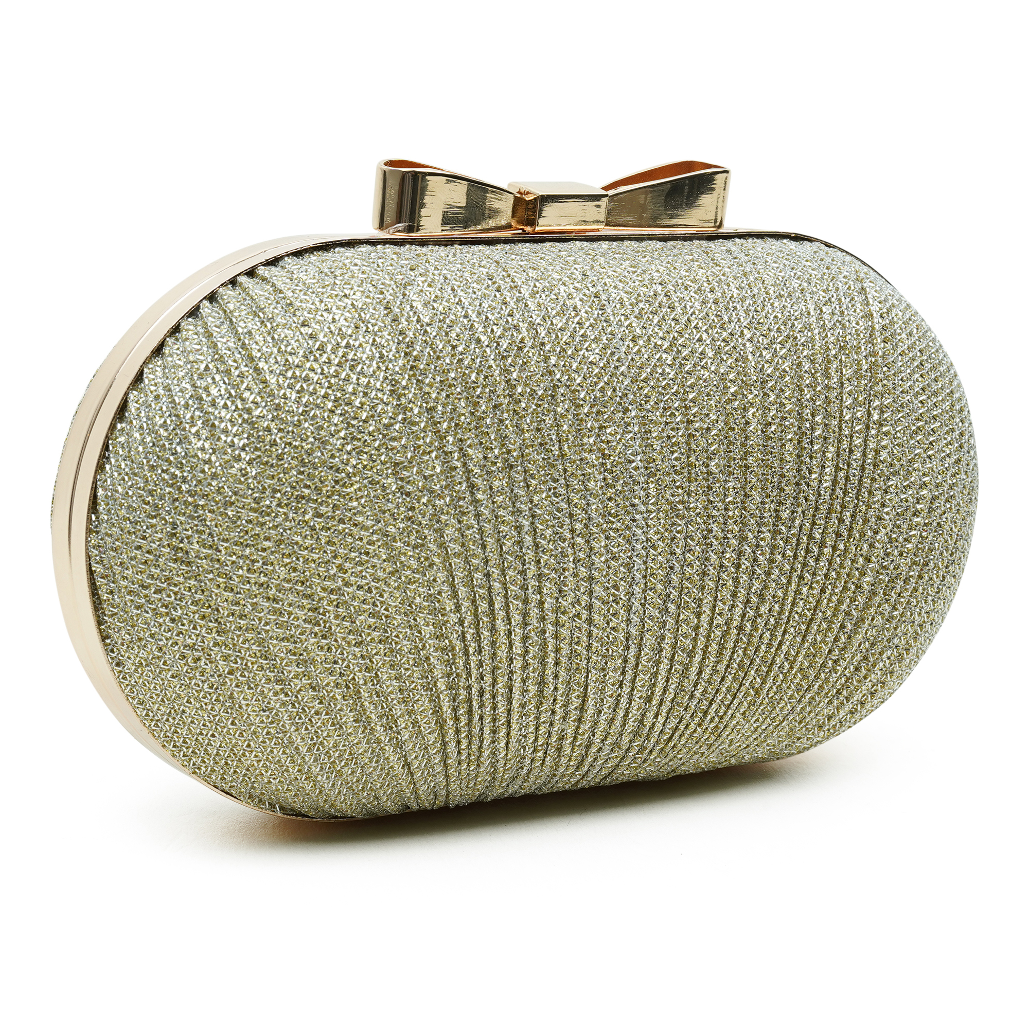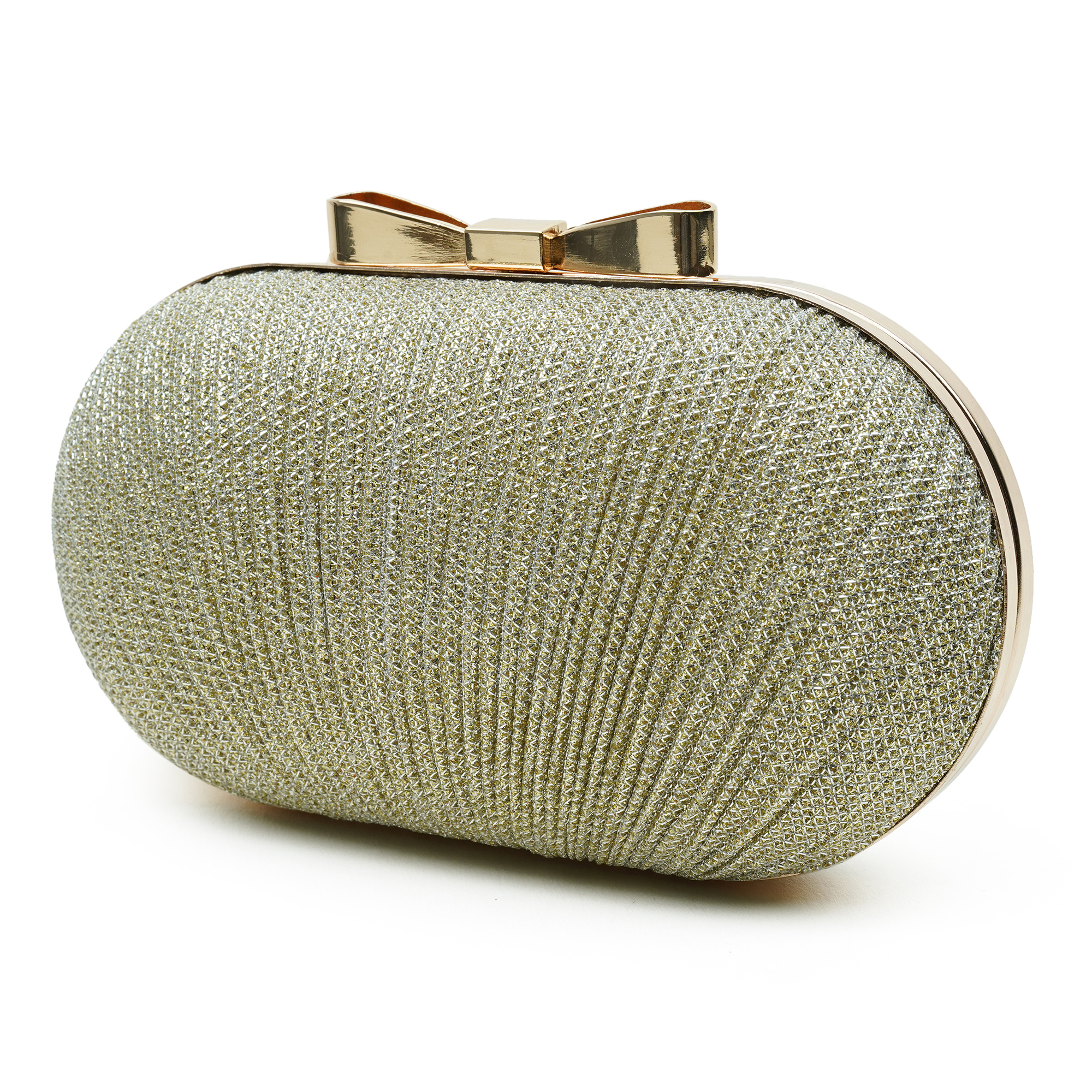 Make a stunning statement with this Moochie women’s clutch, designed to add elegance and glamour to your special occasions. Featuring a shimmering textured finish and a stylish metallic frame with a bow detail, this clutch perfectly blends sophistication with modern charm. Compact yet spacious enough for essentials, it’s the ideal accessory for parties, weddings and evening events.