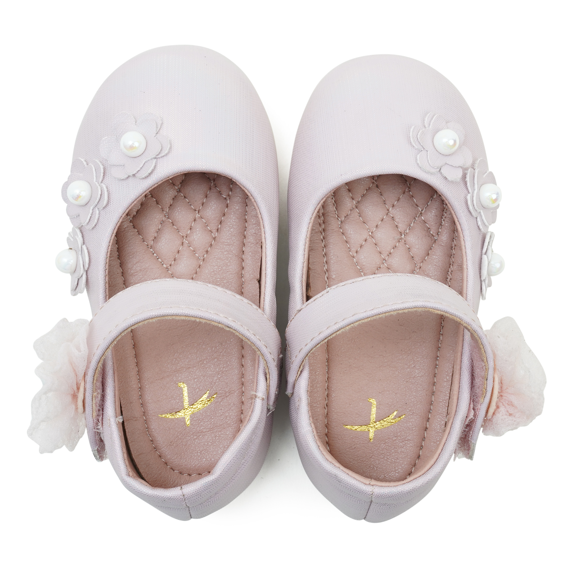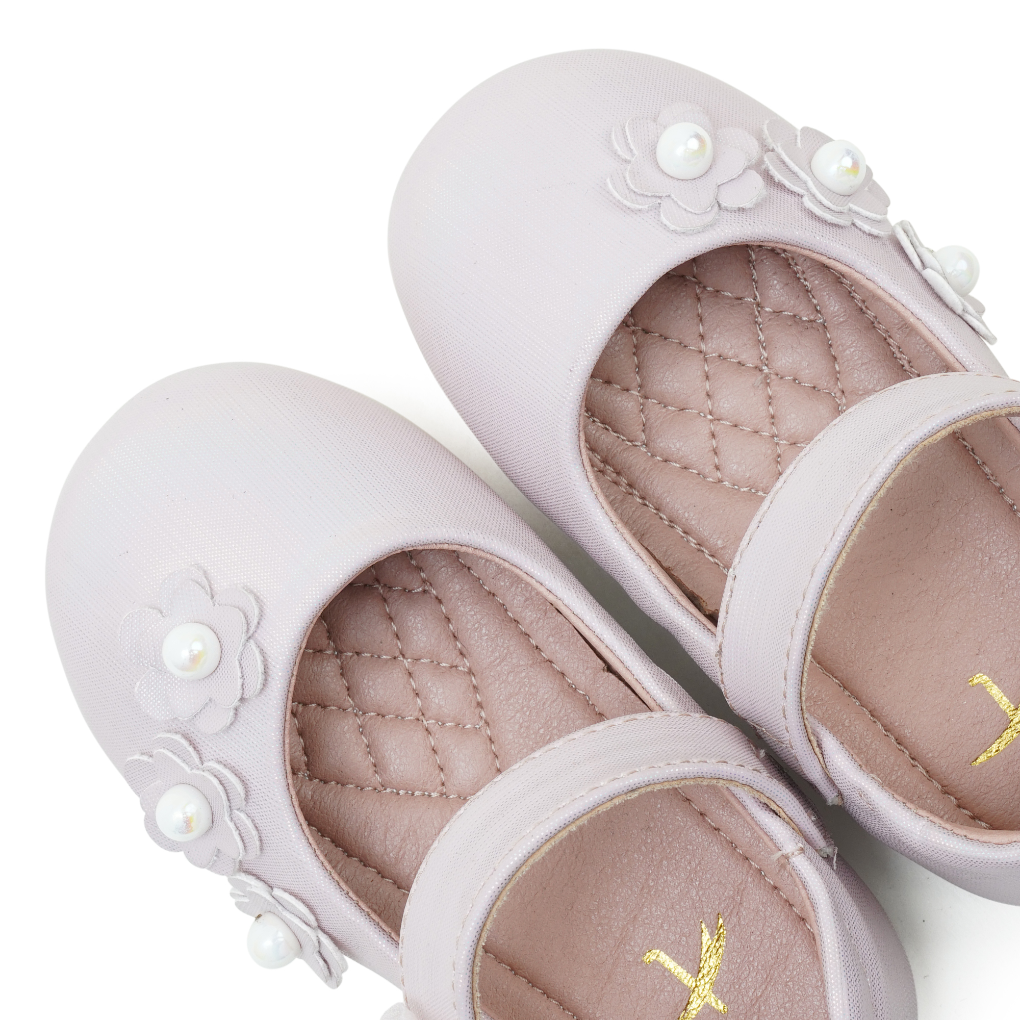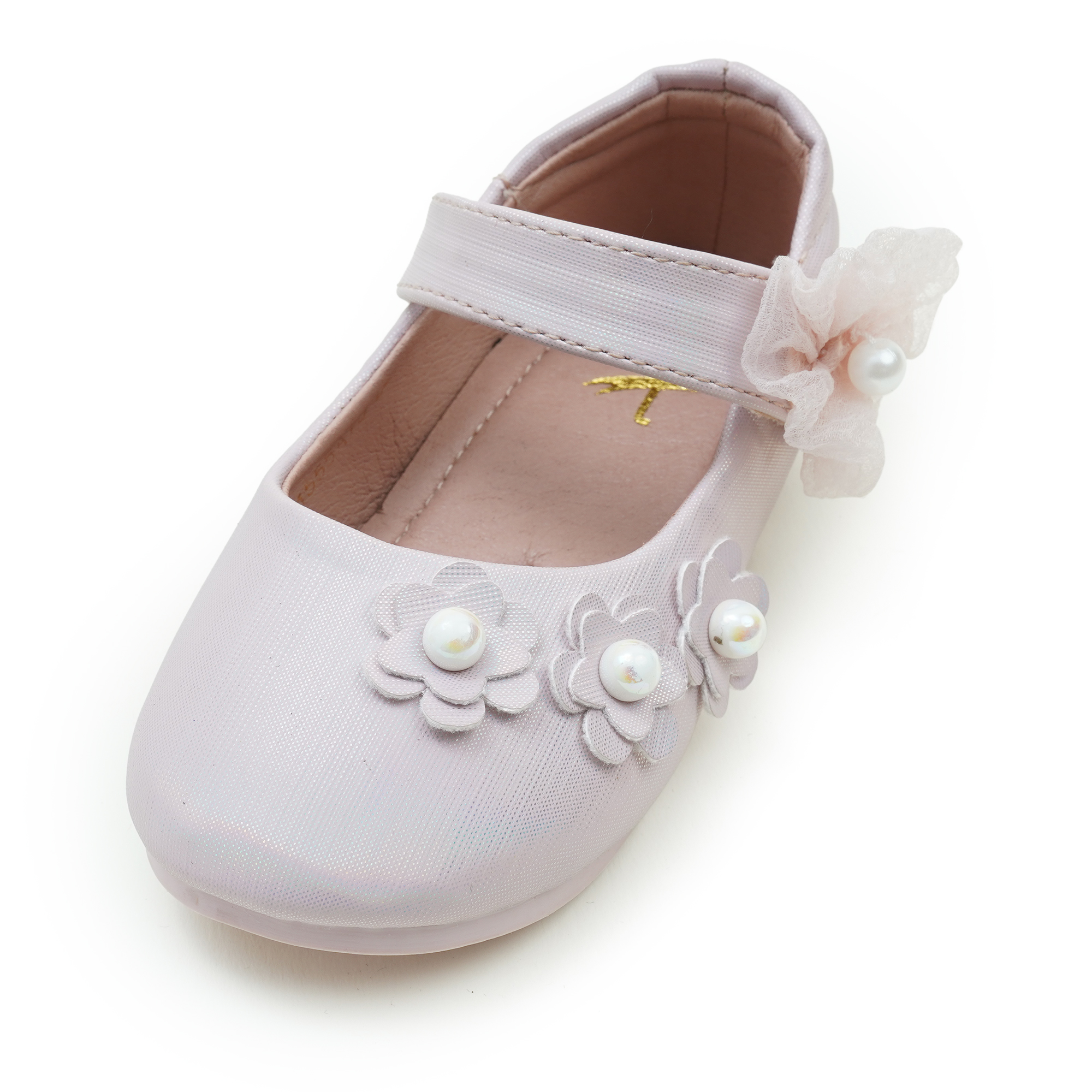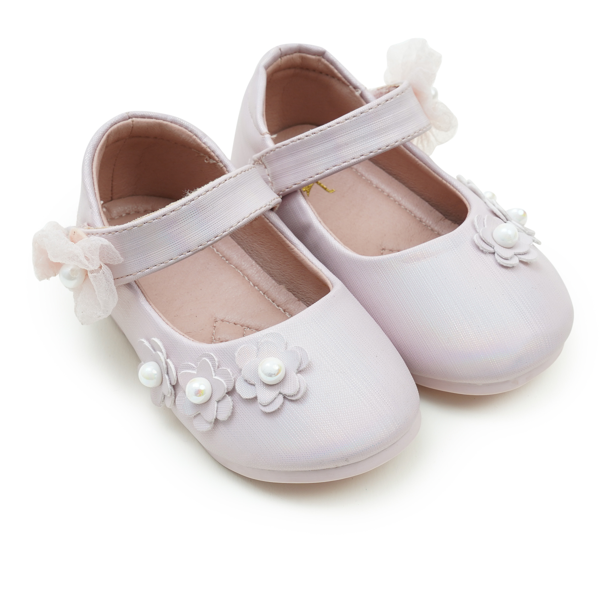 • Smooth PU upper with decorative floral and pearl details