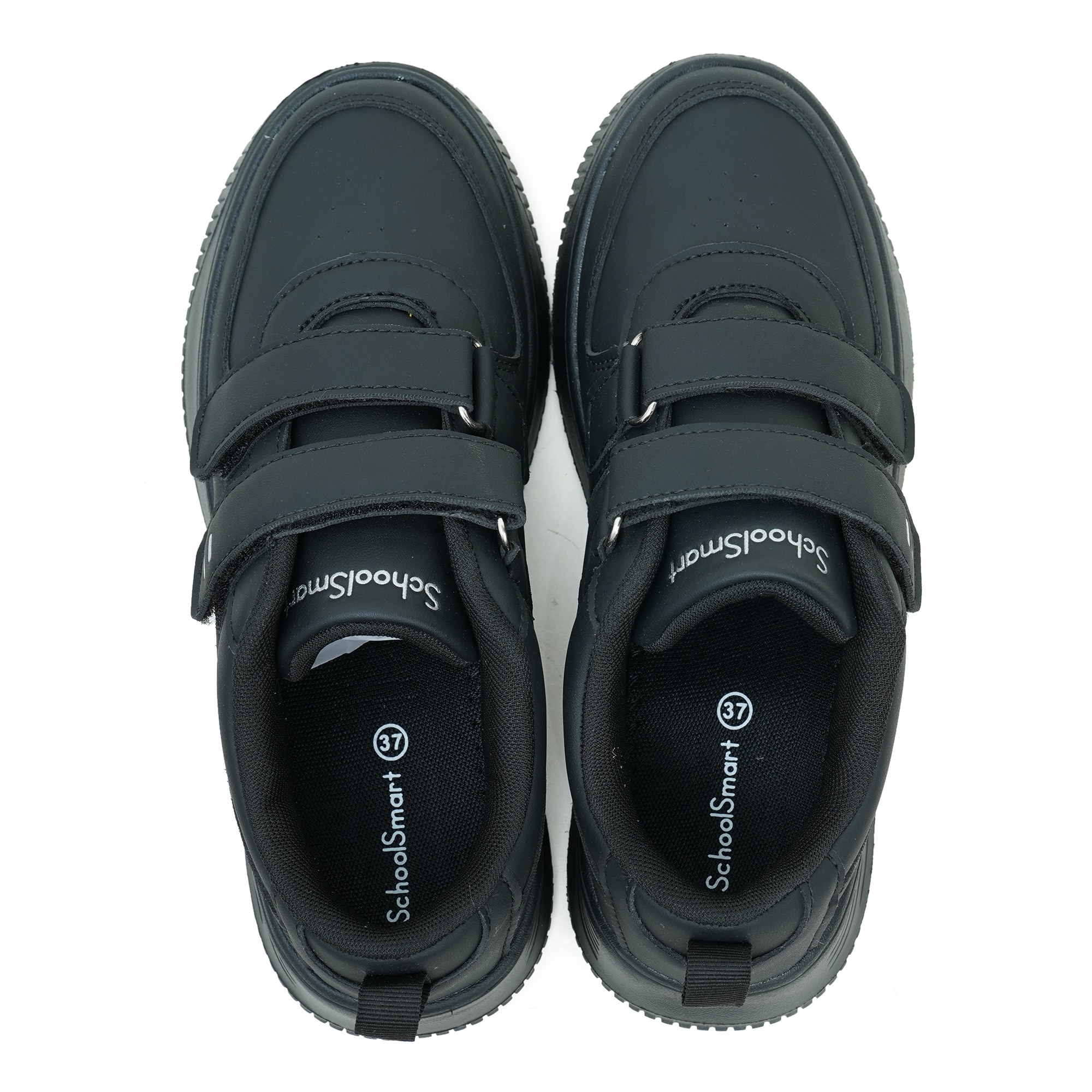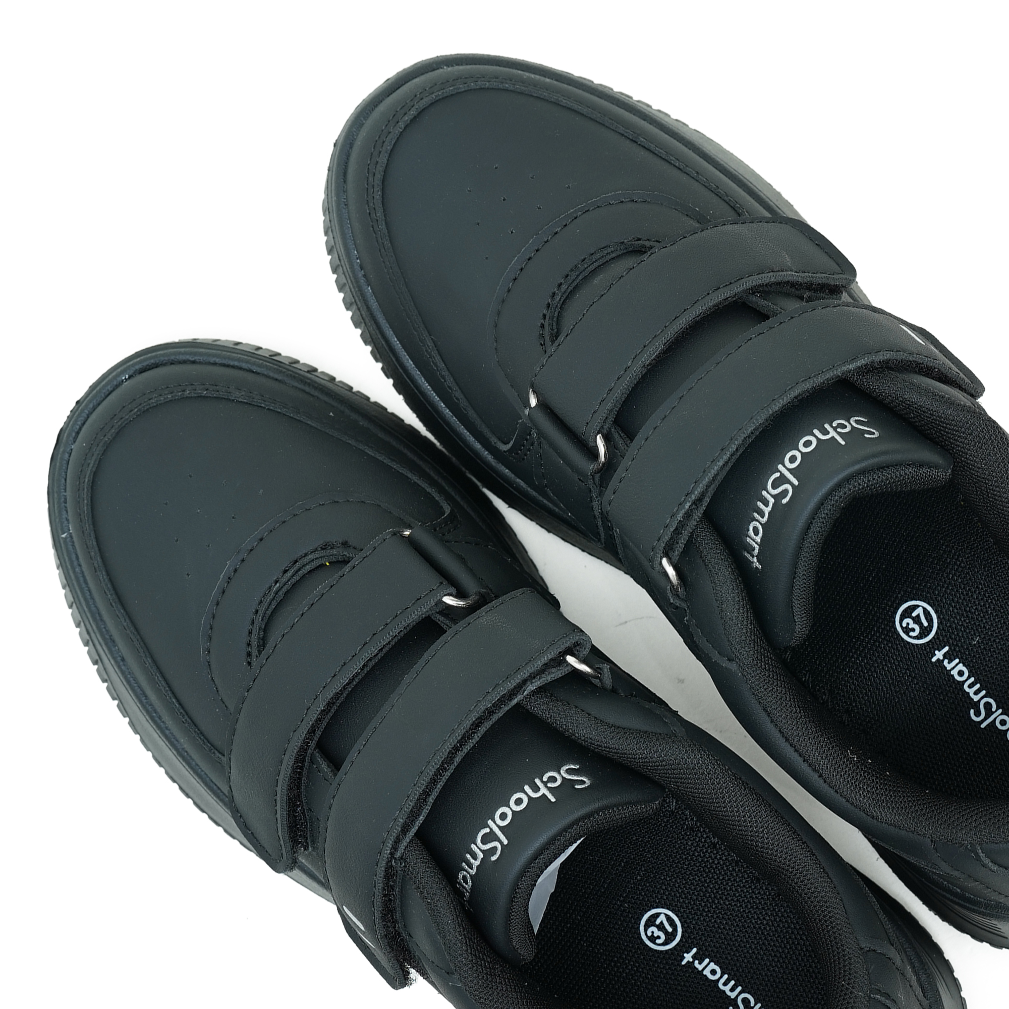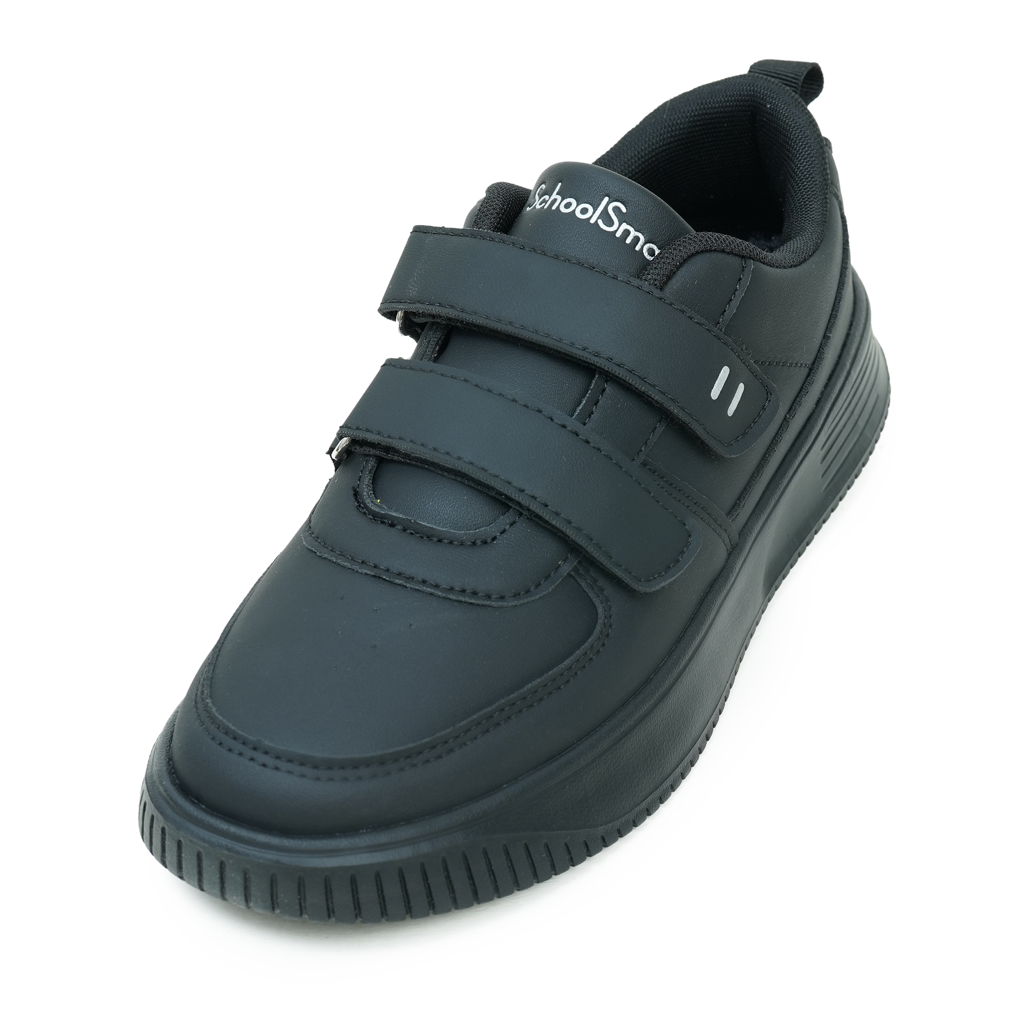 Designed for everyday school comfort and durability, the School Smart Black Unisex School Shoes are a dependable choice for active students. Crafted with a sturdy PU upper and a lightweight EVA sole, these shoes offer flexibility, cushioning, and reliable support throughout busy school days. The dual hook-and-loop strap closure ensures a secure and adjustable fit while allowing kids to put them on and take them off with ease. The classic black design maintains a neat school-ready look and pairs perfectly with any uniform. Built to handle daily wear, these shoes retain their shape, color and comfort even after regular use, making them ideal for everyday school activities.