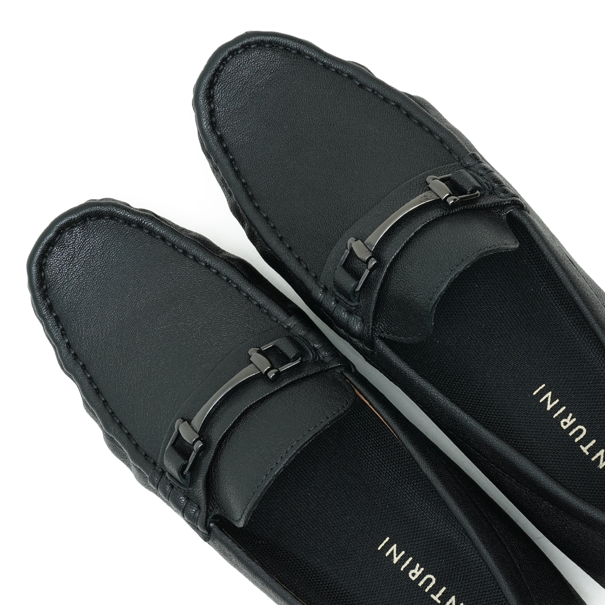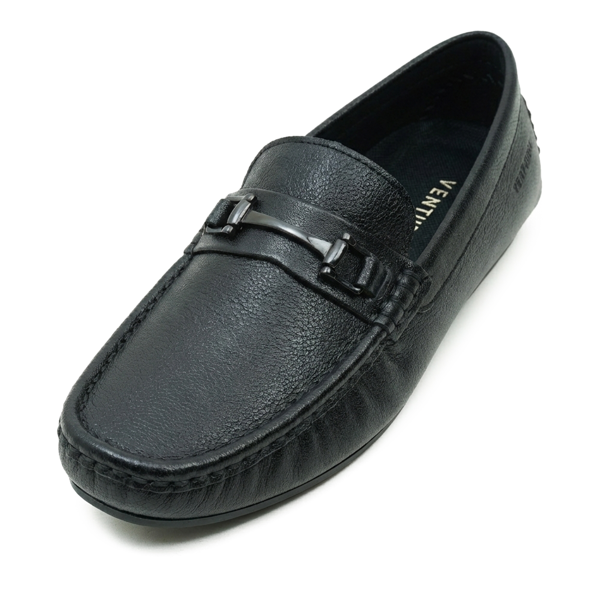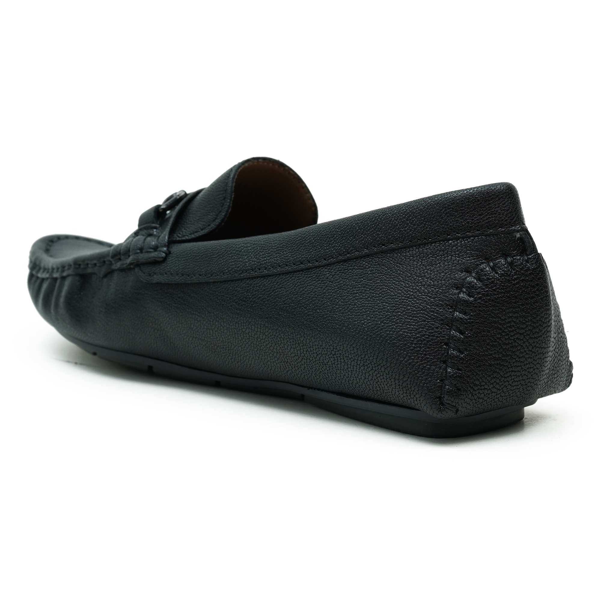 Black moccasin-style loafer crafted in premium leather with a refined metal trim detail across the vamp. The sophisticated finish and timeless silhouette embody craftsmanship and understated luxury, making it a versatile staple for formal, smart-casual, and weekend ensembles. Soft lining and cushion provide comfortable wear from morning meetings to evening socials.
