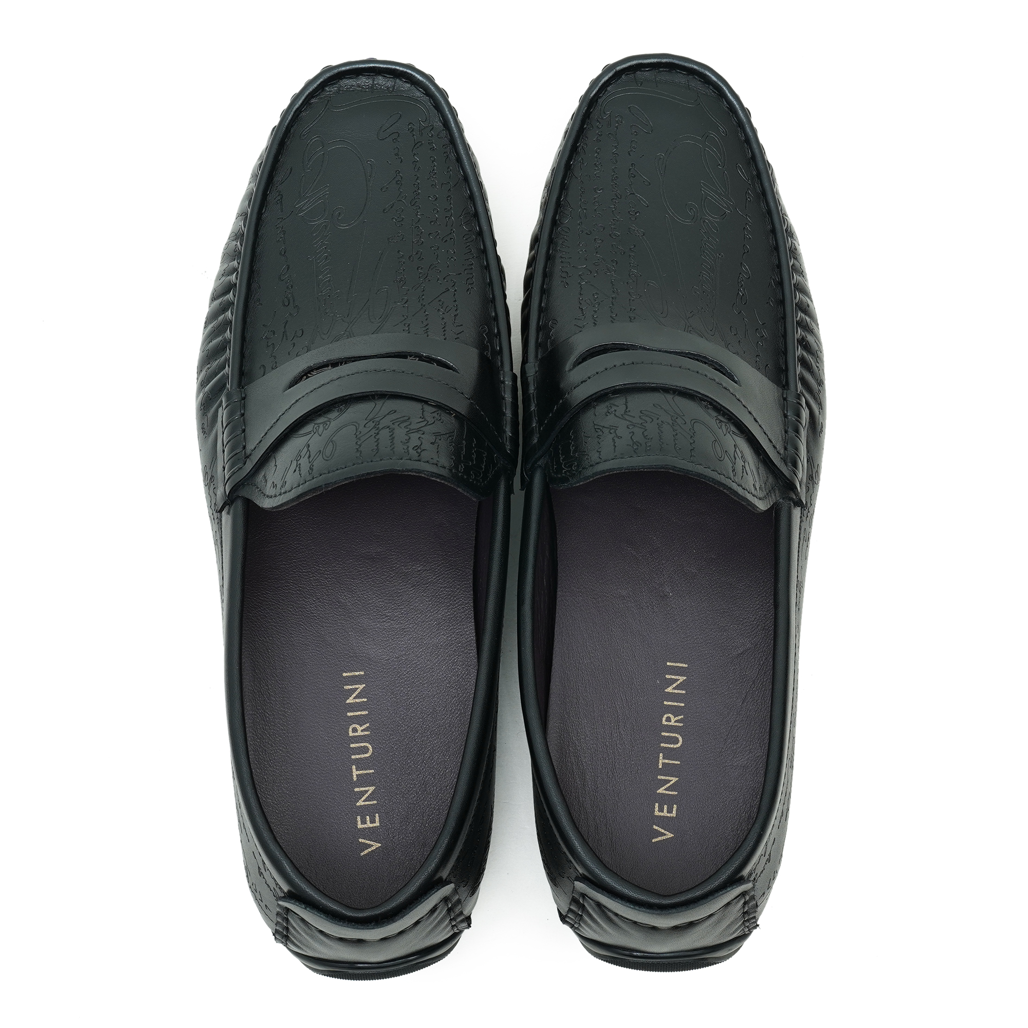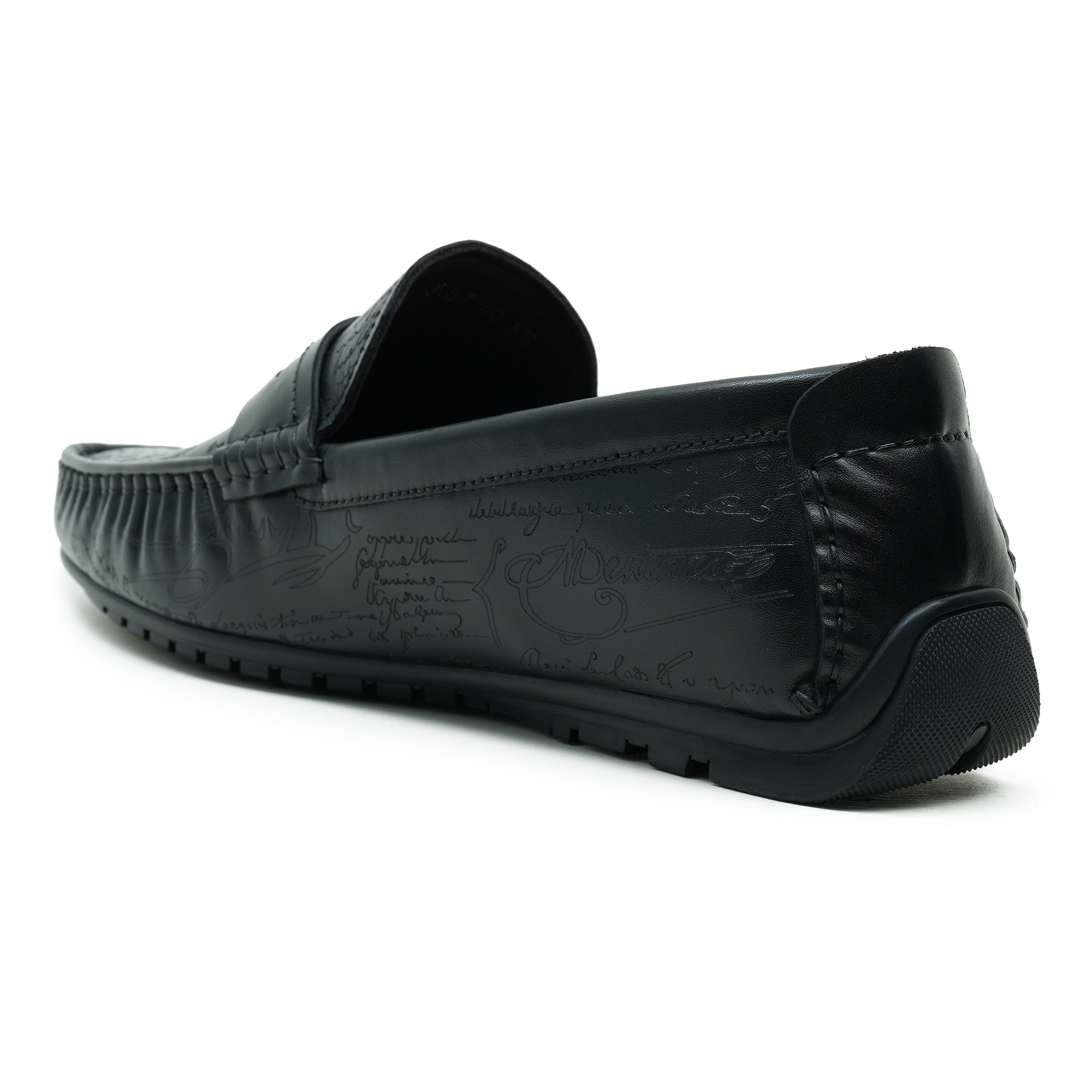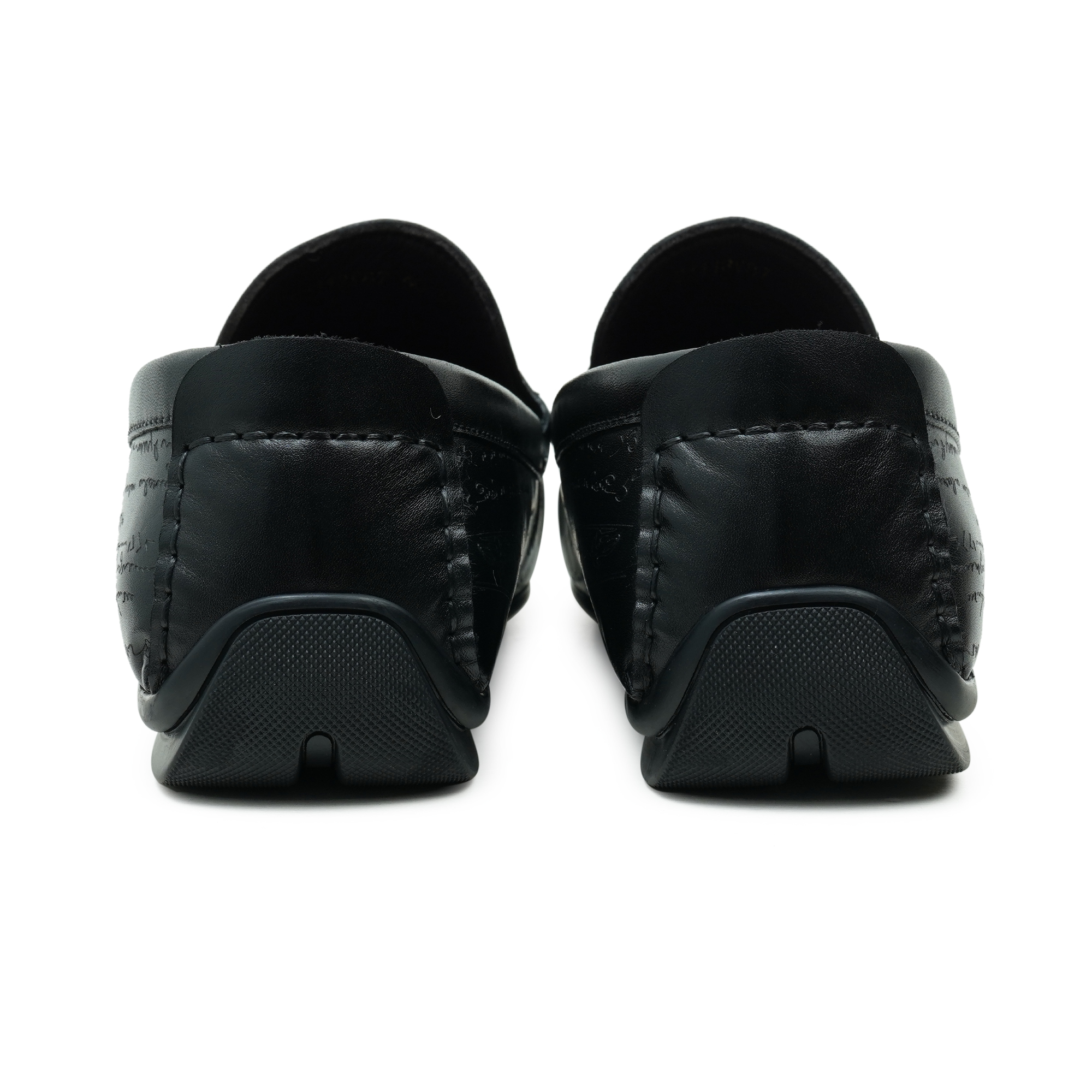 Timeless black moccasin loafer with a refined embossed top design. Premium finish and expert craftsmanship deliver a sophisticated, dress-ready silhouette. The slip-on moccasin style combines classic comfort with a contemporary edge, ideal for smart-casual and formal occasions. Inside, a soft lining and cushioned insole ensure all-day comfort while the durable outsole provides steady steps from boardroom to evening events.