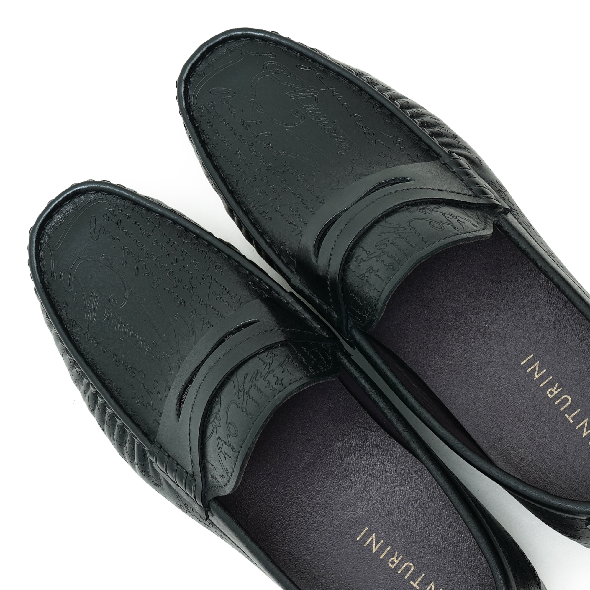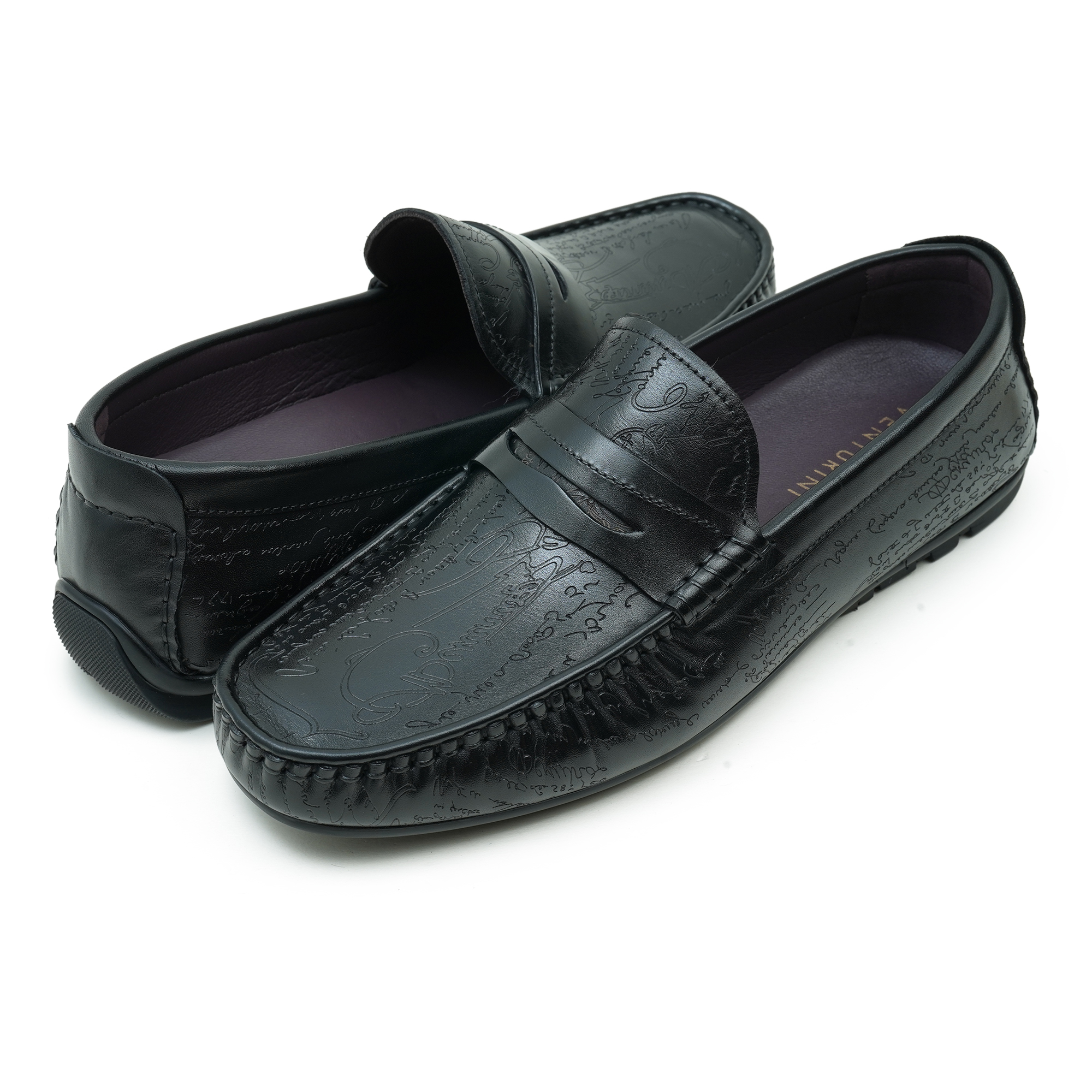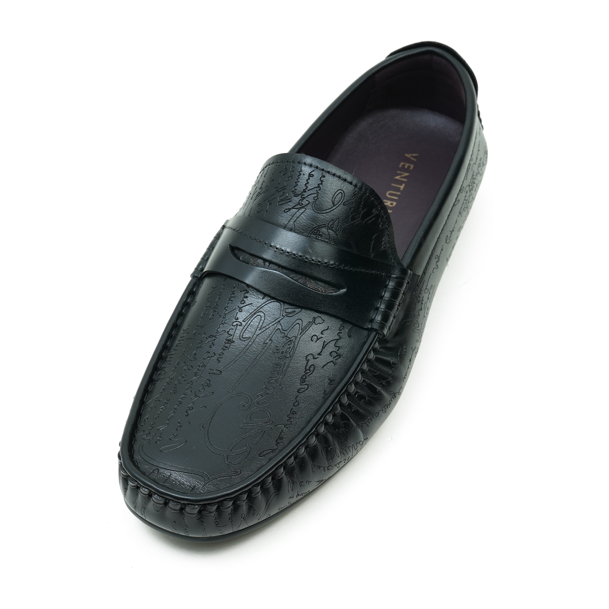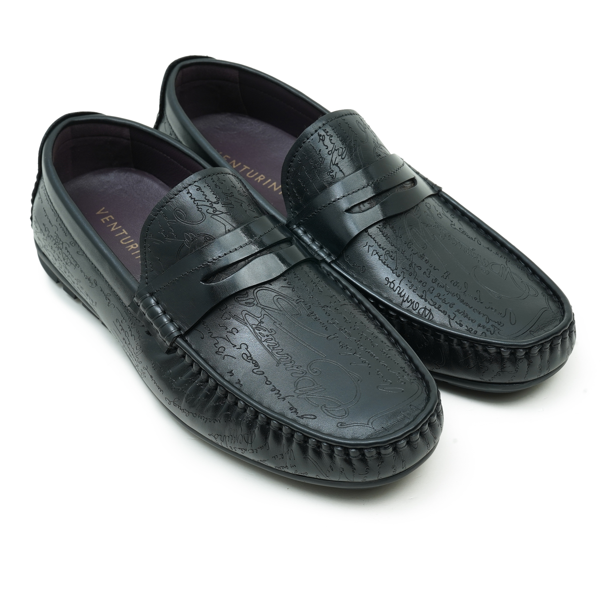 Timeless black moccasin loafer with a refined embossed top design. Premium finish and expert craftsmanship deliver a sophisticated, dress-ready silhouette. The slip-on moccasin style combines classic comfort with a contemporary edge, ideal for smart-casual and formal occasions. Inside, a soft lining and cushioned insole ensure all-day comfort while the durable outsole provides steady steps from boardroom to evening events.