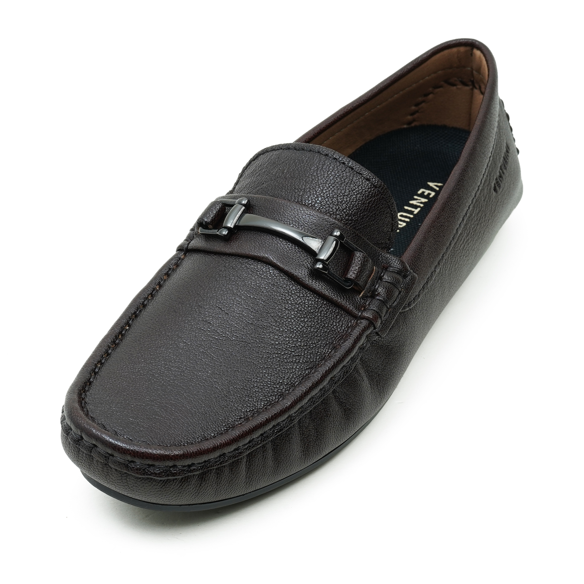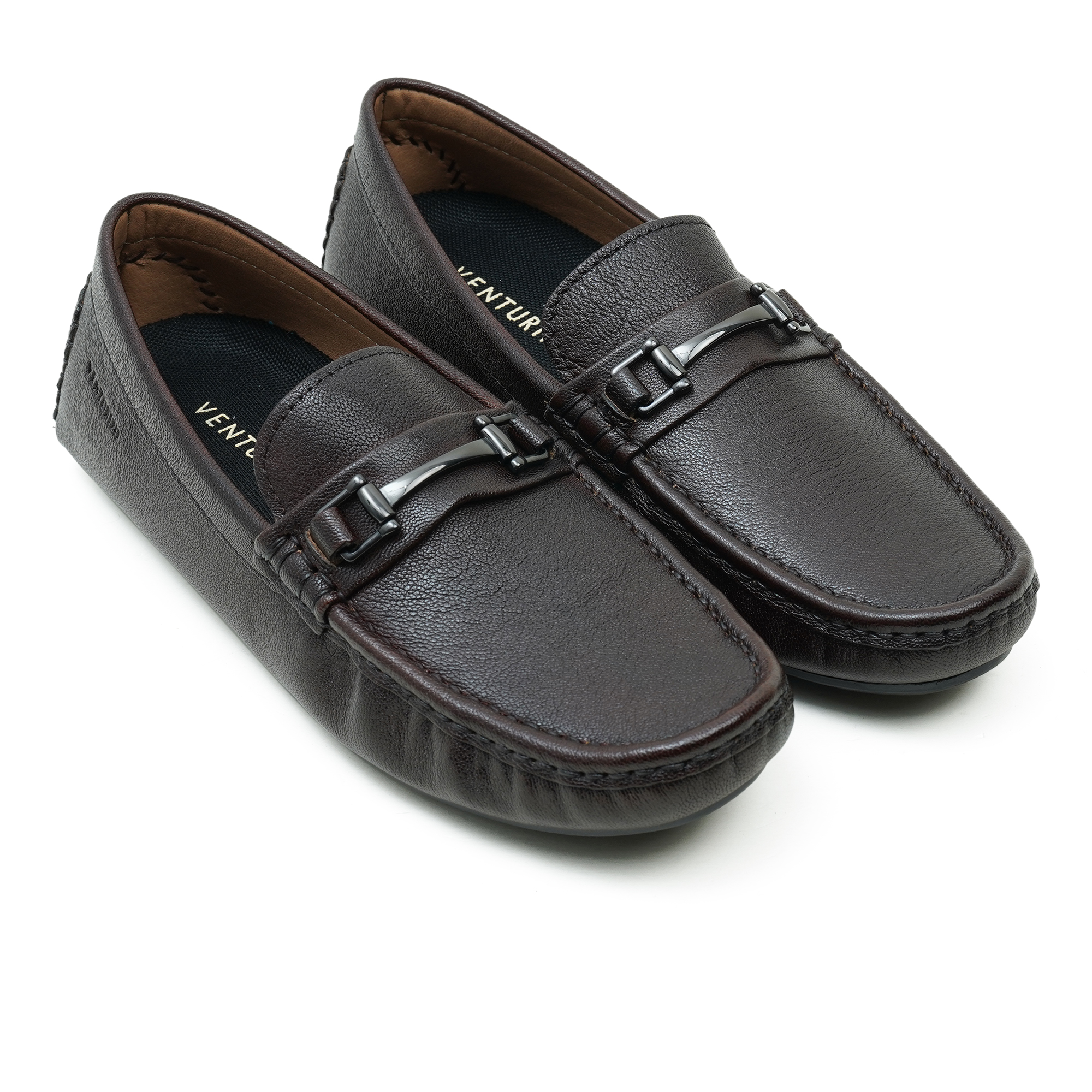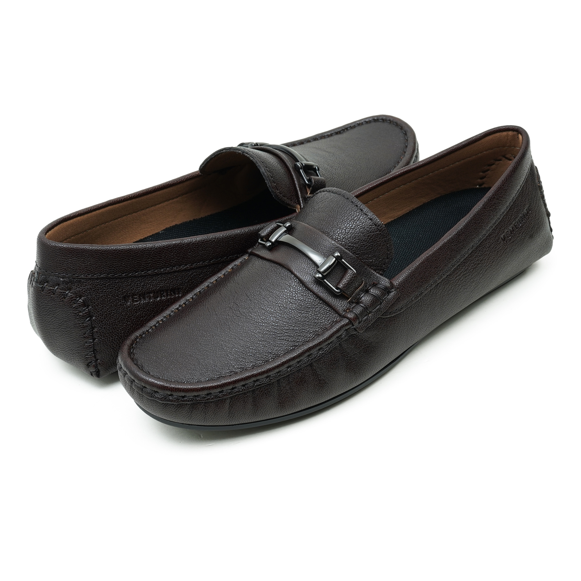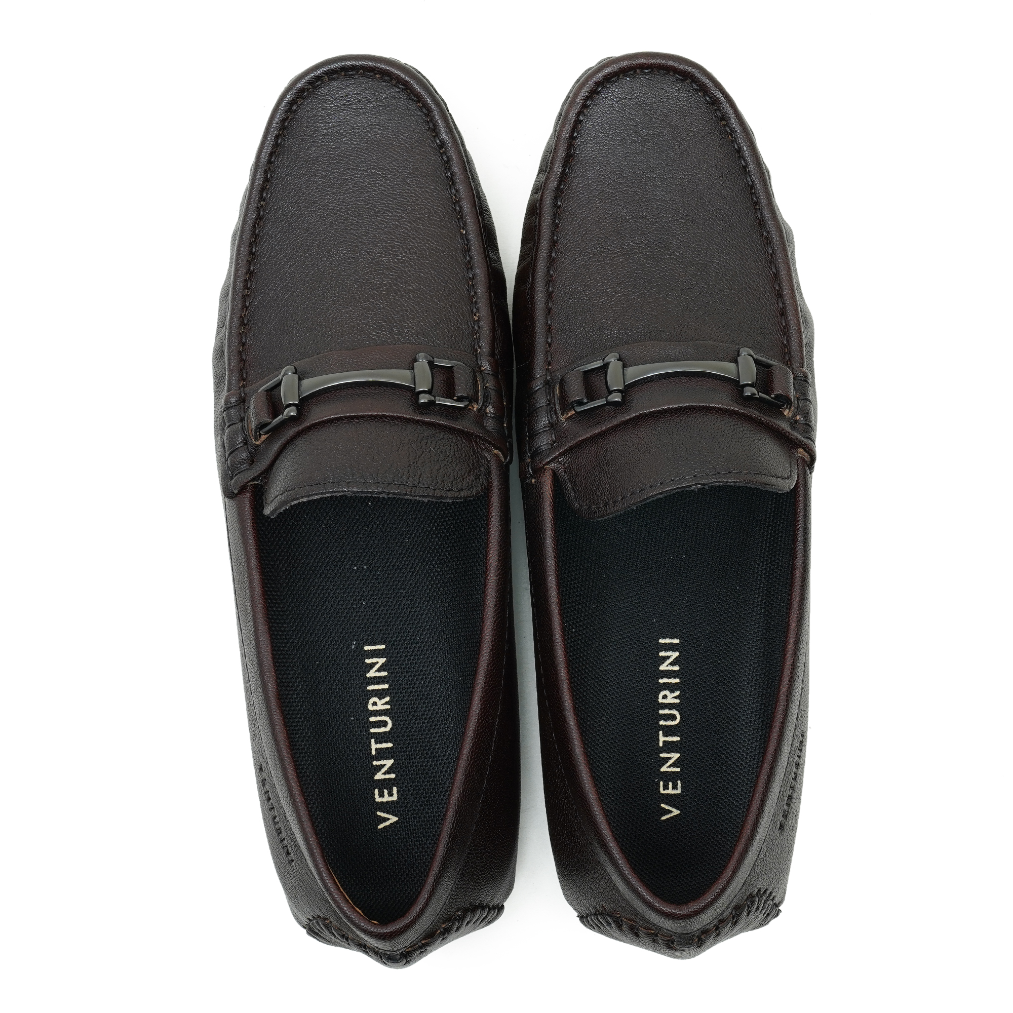 Crafted in a rich coffee tone, this Venturini loafer is defined by its polished metal trim—an understated statement of premium taste. The refined finish and clean, elongated profile reflect meticulous craftsmanship, designed to elevate smart-casual and evening looks with effortless sophistication. Slip in and move with quiet confidence, where every detail feels considered and timeless.