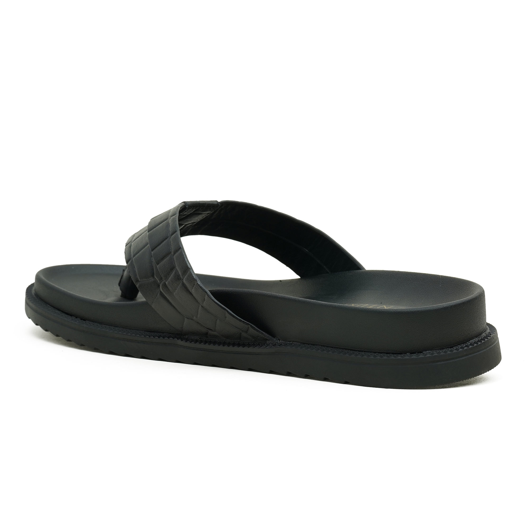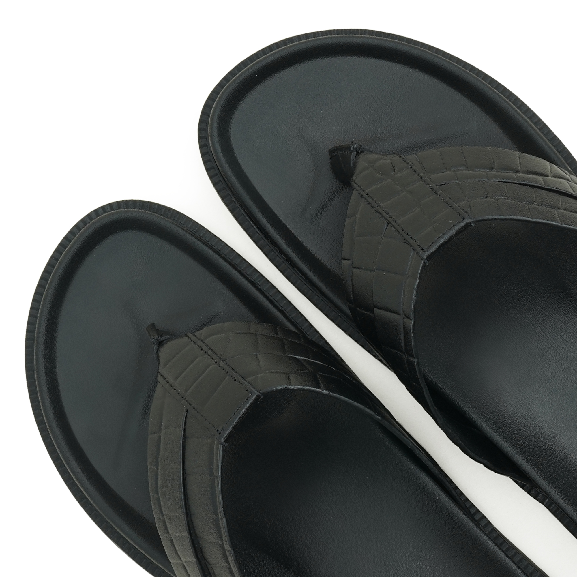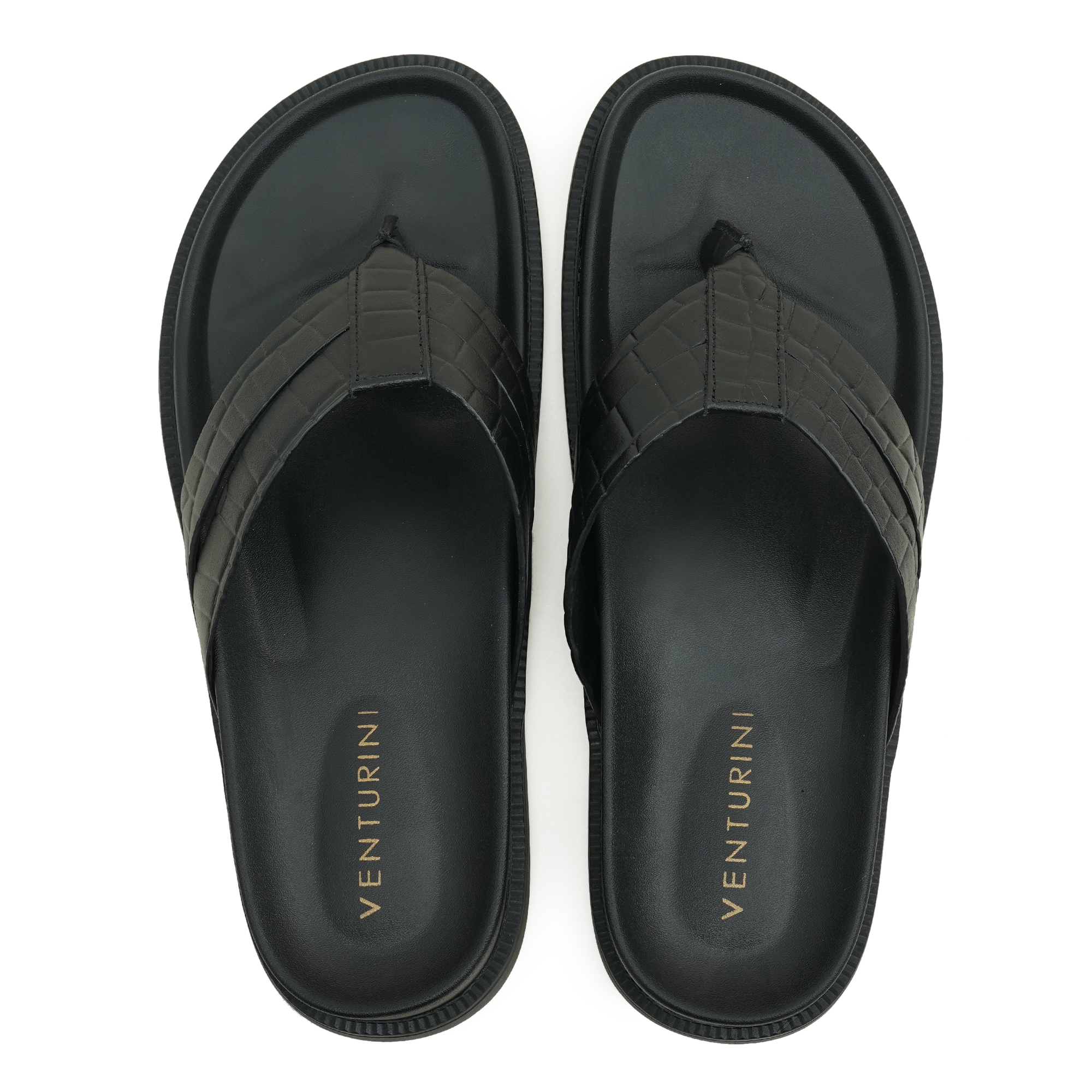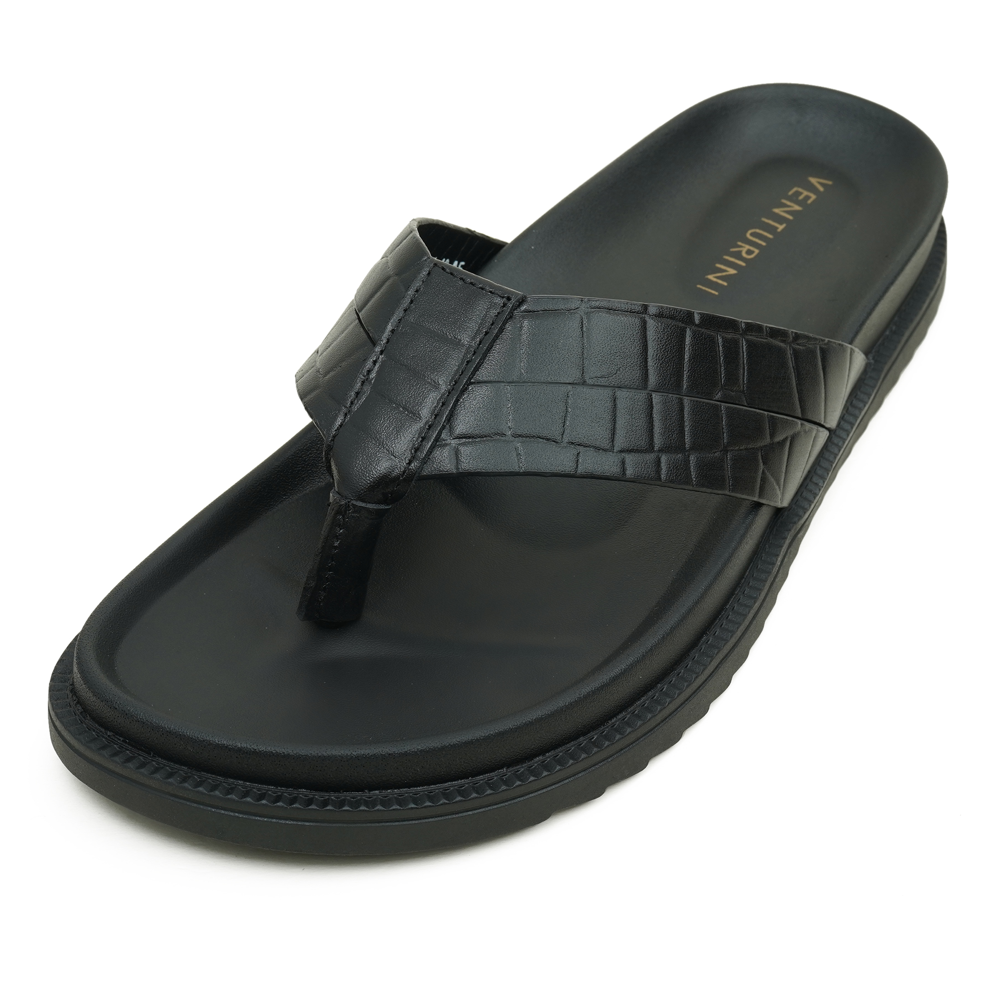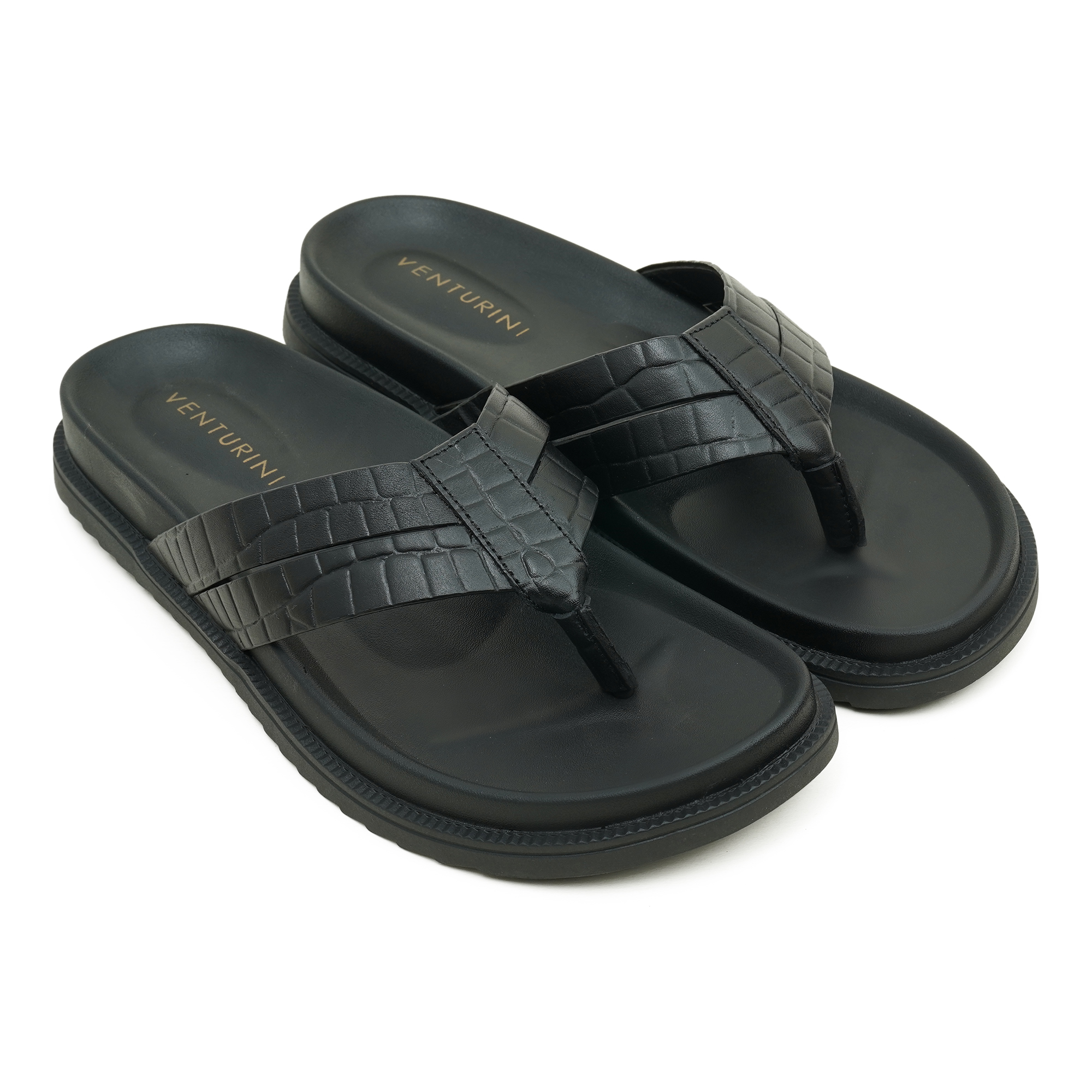 Discover refined sophistication with the Venturini men’s luxury black leather sandal, crafted for timeless elegance and superior comfort. Designed with a premium crocodile-textured leather strap, this thong sandal embodies meticulous craftsmanship and understated luxury. The sleek black finish enhances its versatile appeal, making it ideal for smart casual wear, summer outings and elevated everyday styling. A cushioned, contoured footbed ensures lasting comfort, while the durable anti-slip sole provides confident stability. With every detail thoughtfully constructed, this premium men’s sandal reflects Venturini’s commitment to craftsmanship, elegance, and modern luxury footwear.