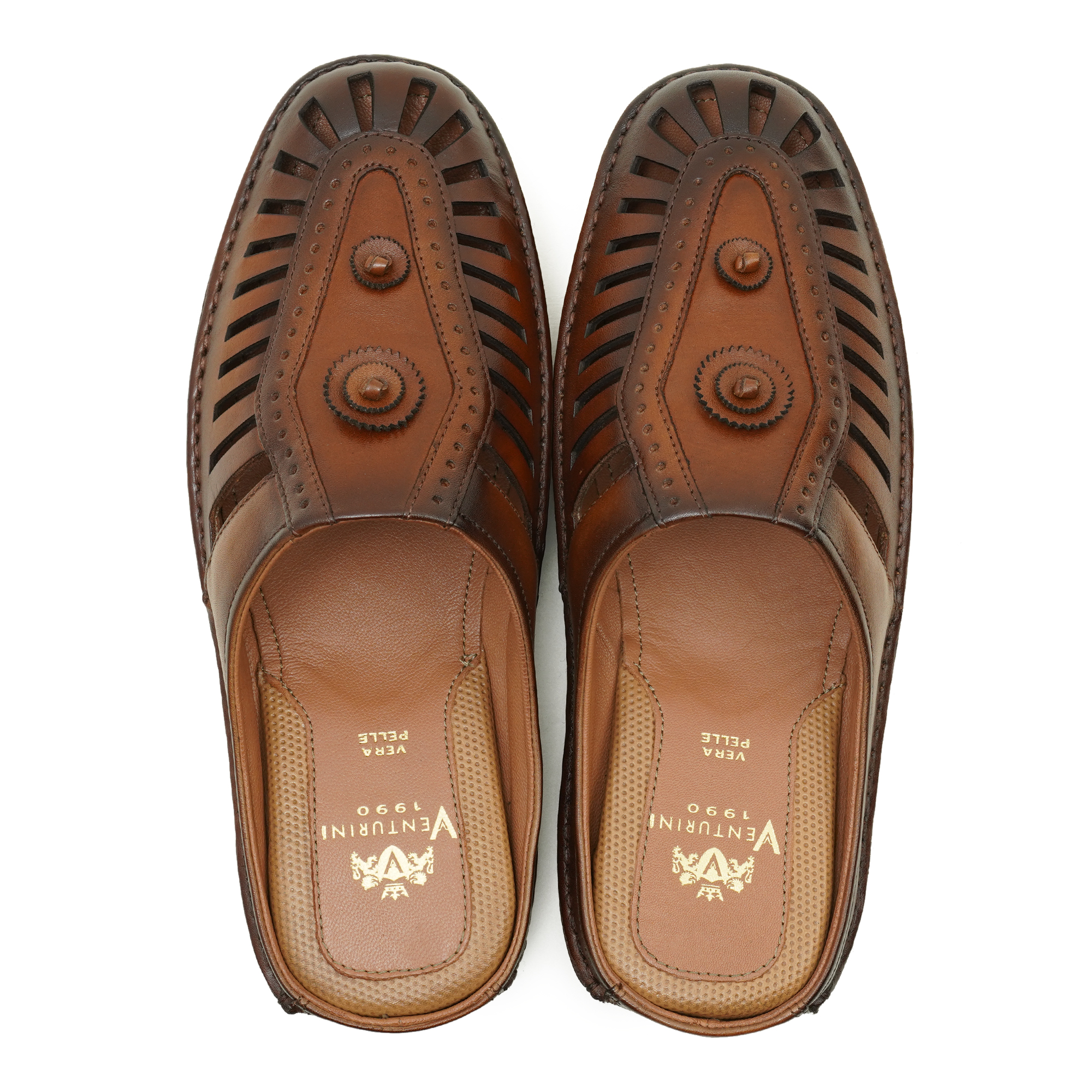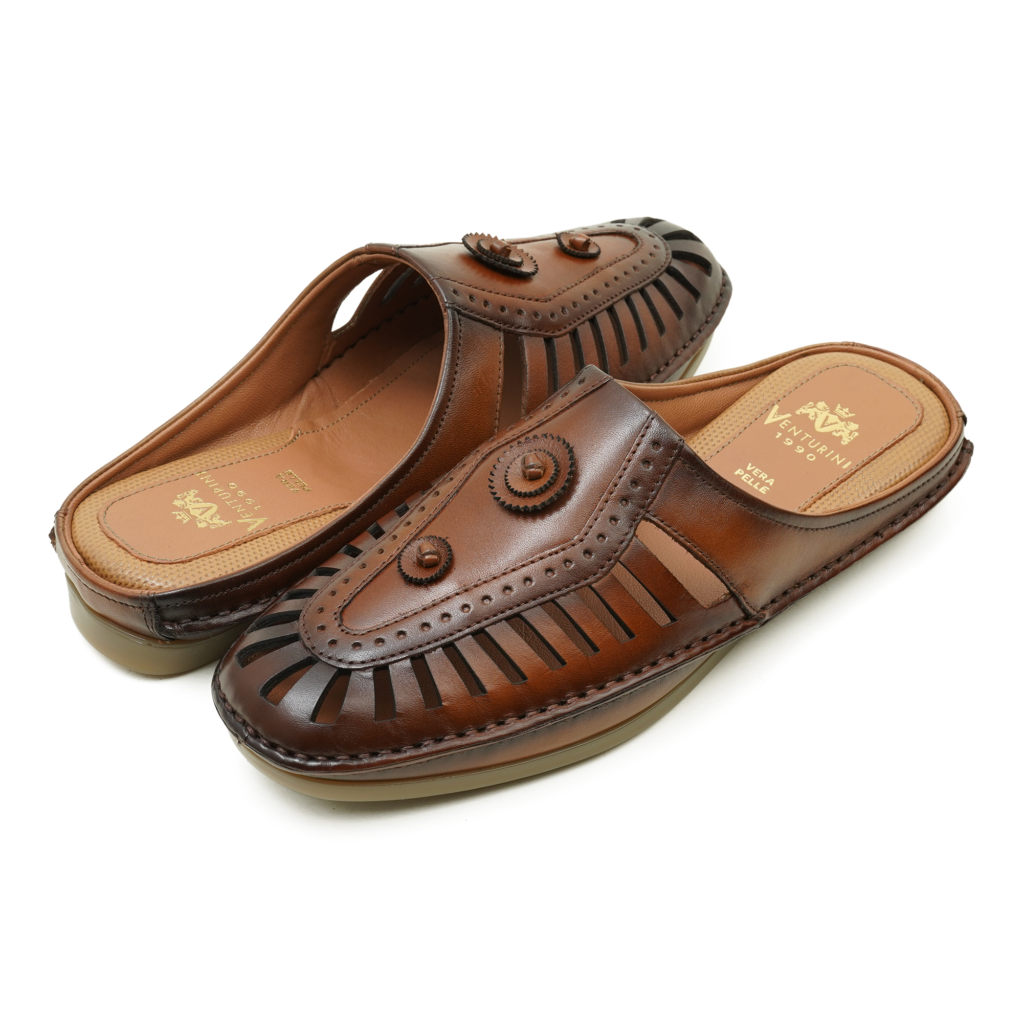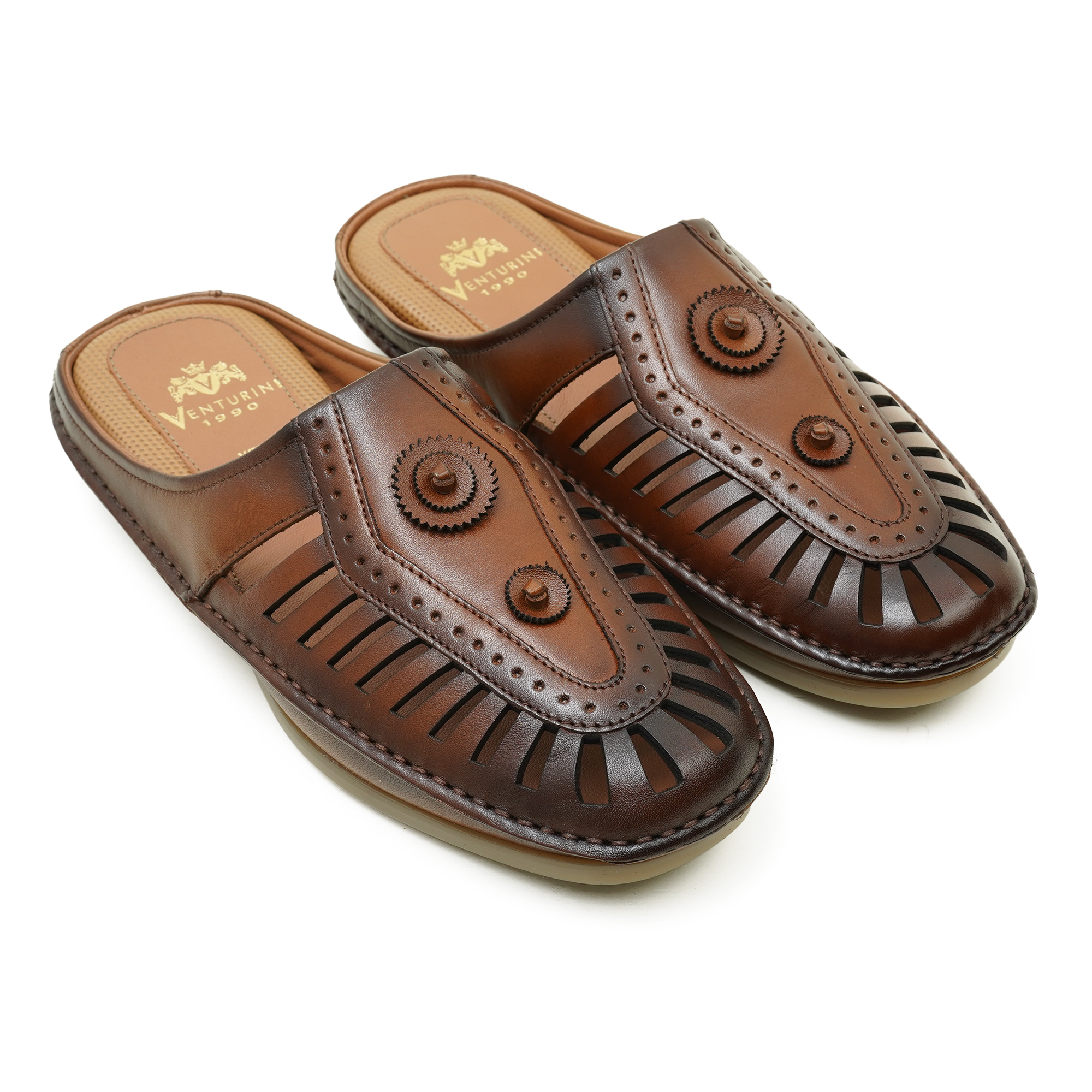 The Venturini Men’s Mule Sandal in brown is a masterpiece of traditional aesthetics and modern luxury, featuring a refined Kolhapuri inspired design. Meticulously crafted from high-grade leather, this mule showcases a rich, warm tone that highlights the intricate hand-finished details and superior craftsmanship.