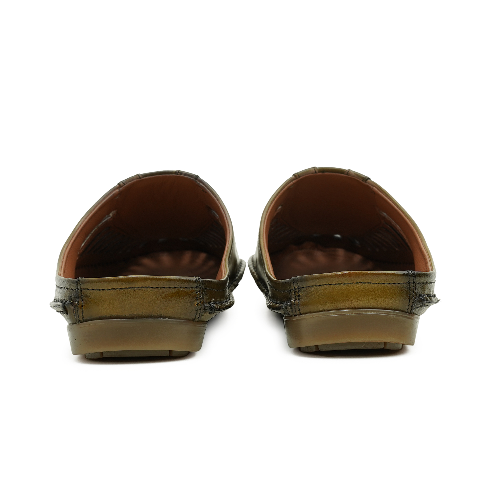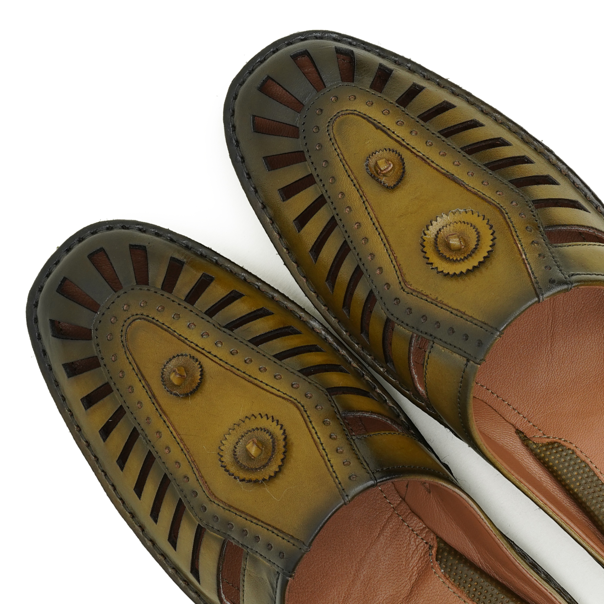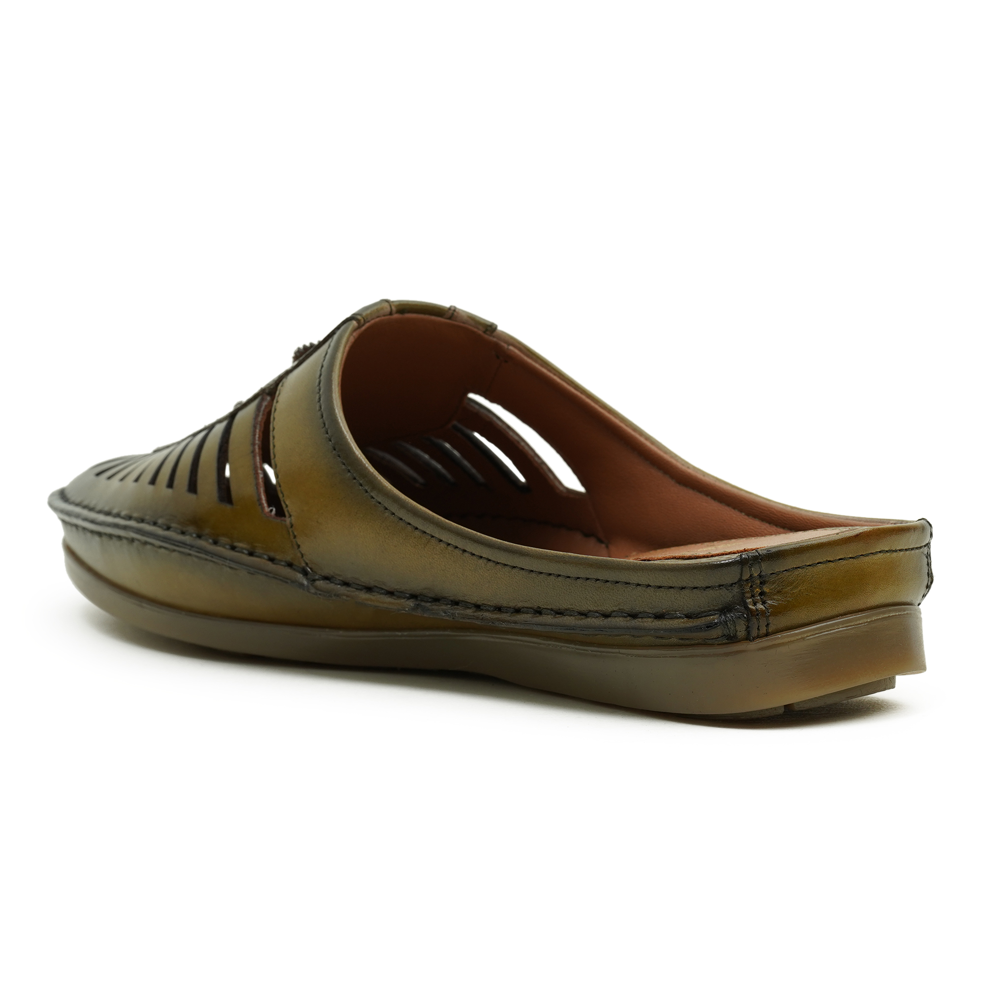 This Sandal offers a distinctive and earthly twist on luxury, merging a sophisticated color palette with an artisanal Kolhapuri inspired design. Meticulously crafted from premium leather, this mule showcases the intricate hand-finished details that define high-end craftsmanship. The muted olive tone provides a modern, versatile aesthetic that stands out from traditional blacks and browns while maintaining a professional edge. Designed for the discerning gentleman, the open-back mule construction ensures an effortless slip-on experience, providing a breathable and comfortable fit that transitions seamlessly from cultural celebrations to refined social gatherings.