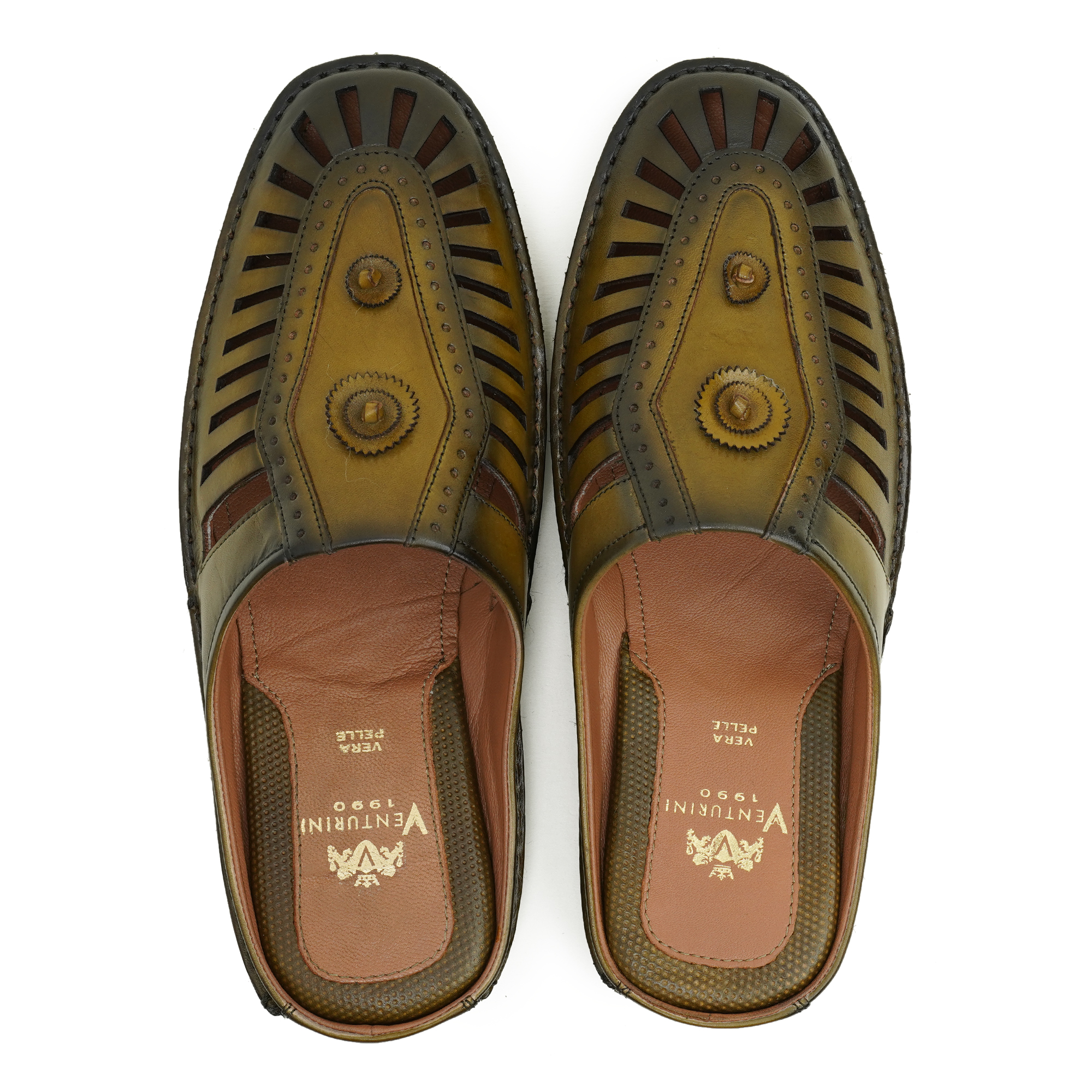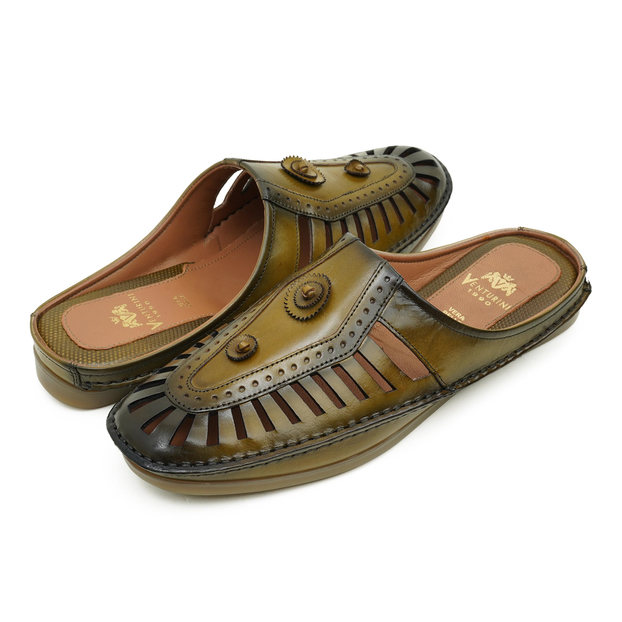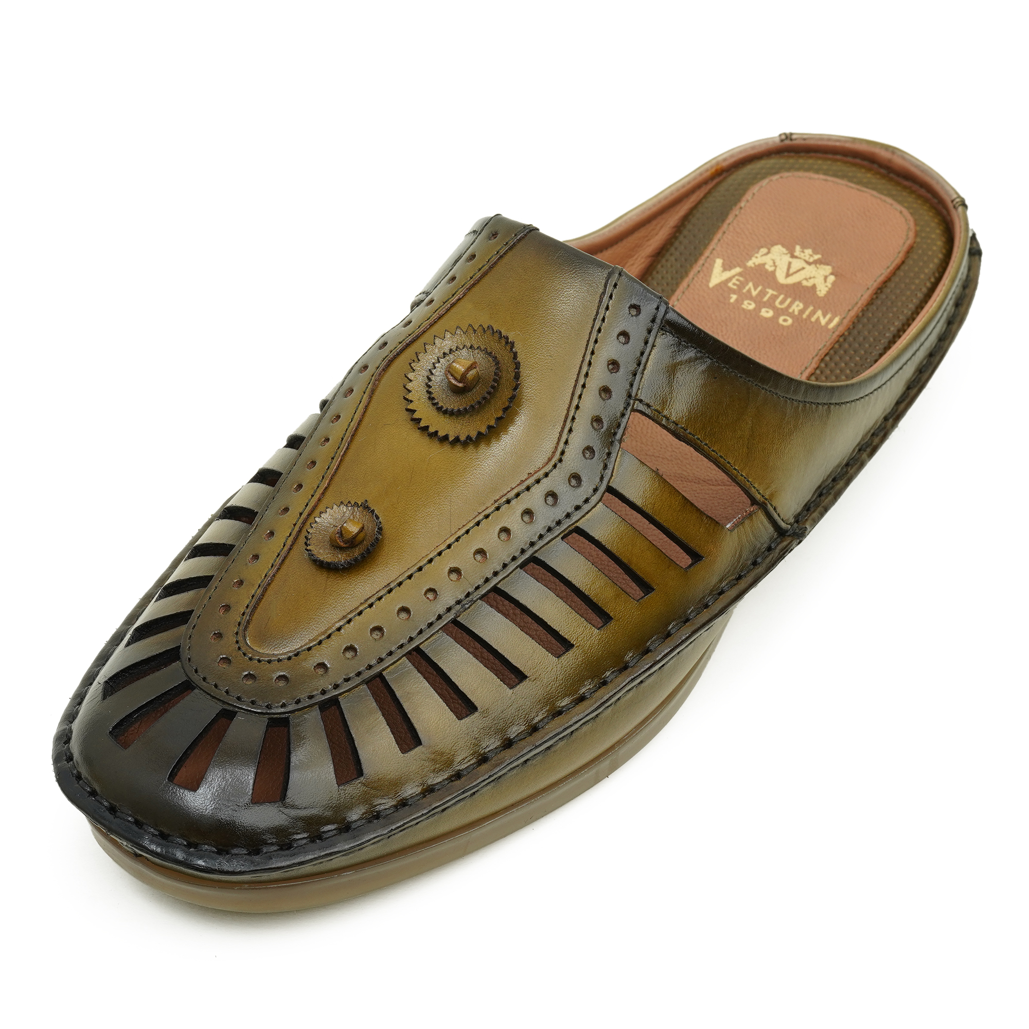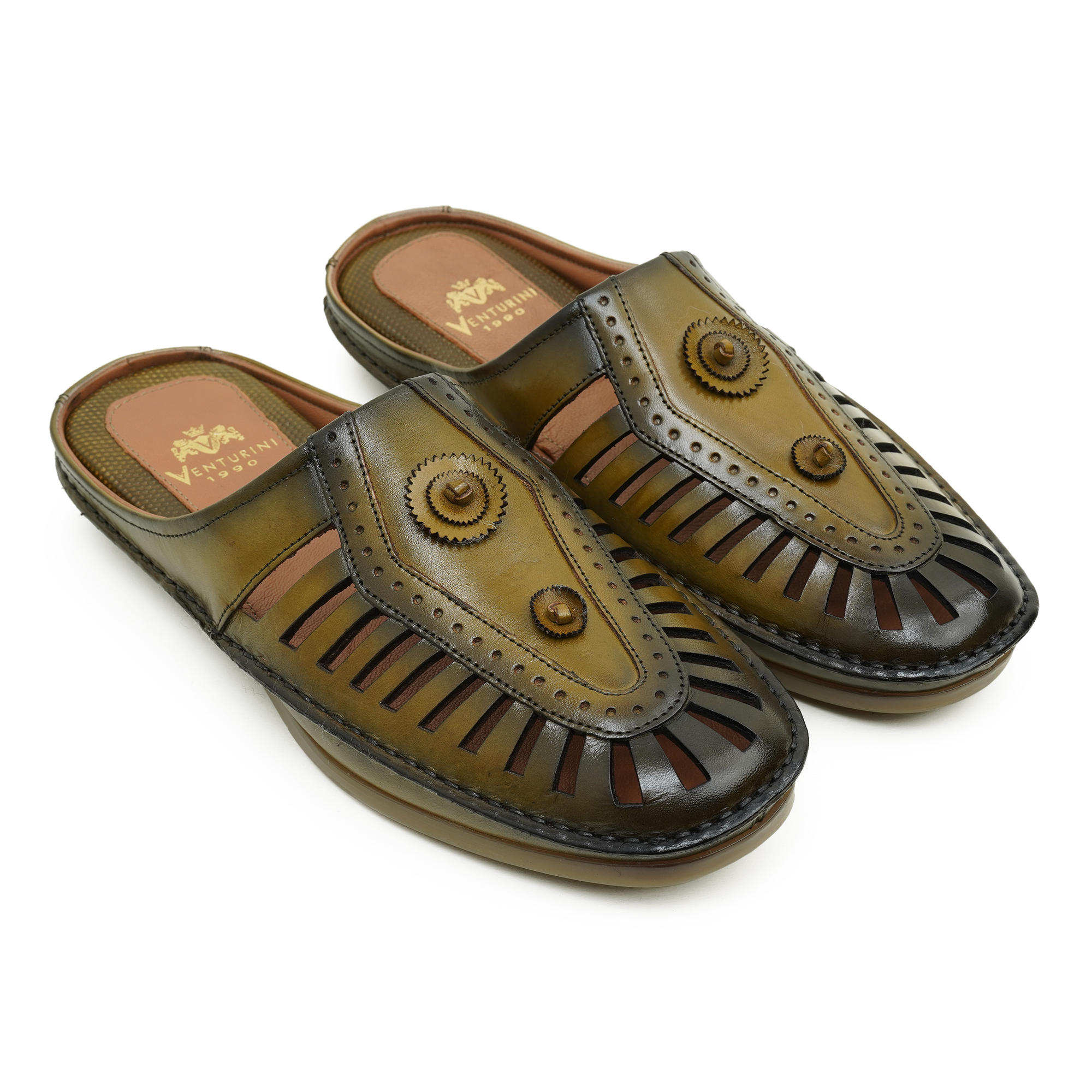 This Sandal offers a distinctive and earthly twist on luxury, merging a sophisticated color palette with an artisanal Kolhapuri inspired design. Meticulously crafted from premium leather, this mule showcases the intricate hand-finished details that define high-end craftsmanship. The muted olive tone provides a modern, versatile aesthetic that stands out from traditional blacks and browns while maintaining a professional edge. Designed for the discerning gentleman, the open-back mule construction ensures an effortless slip-on experience, providing a breathable and comfortable fit that transitions seamlessly from cultural celebrations to refined social gatherings.