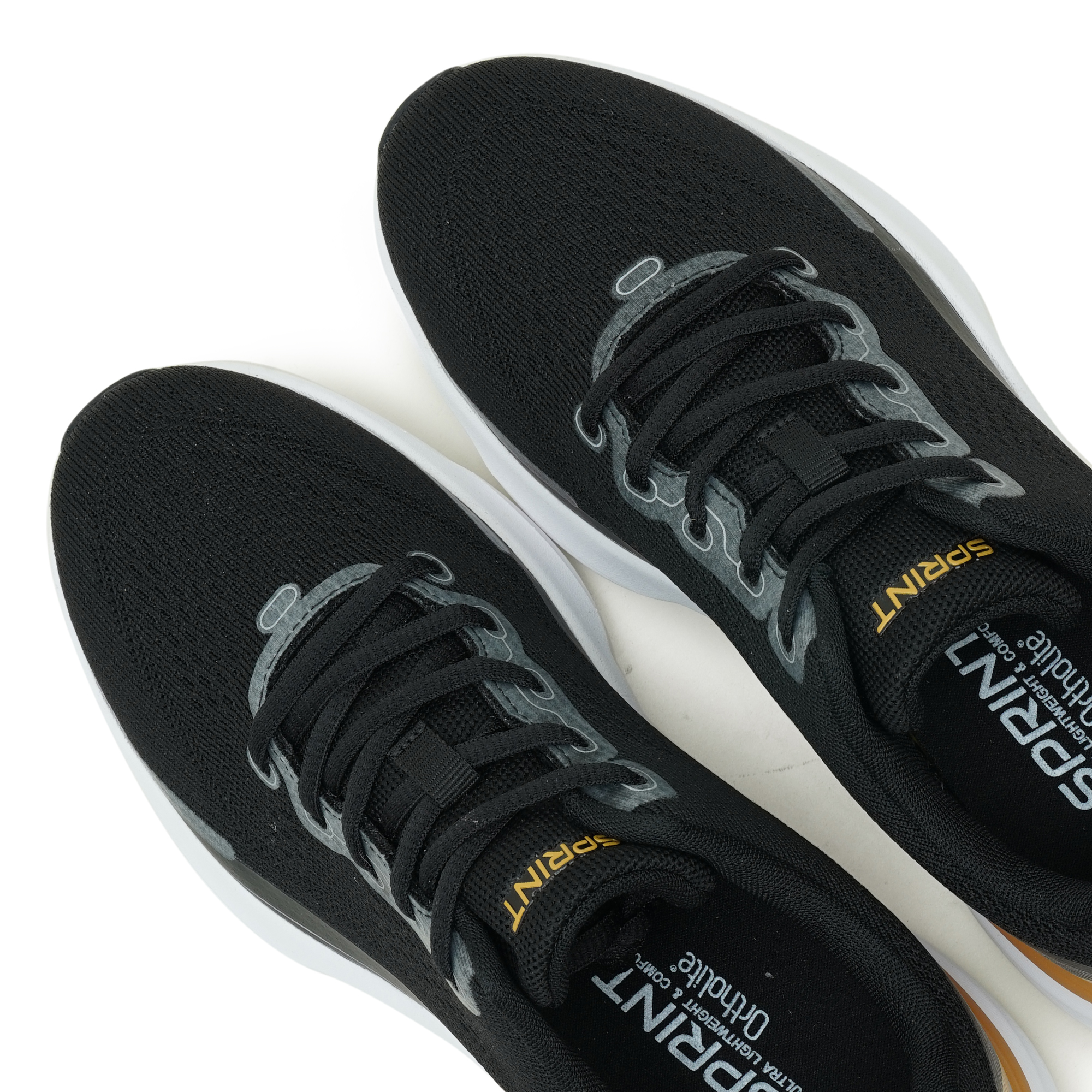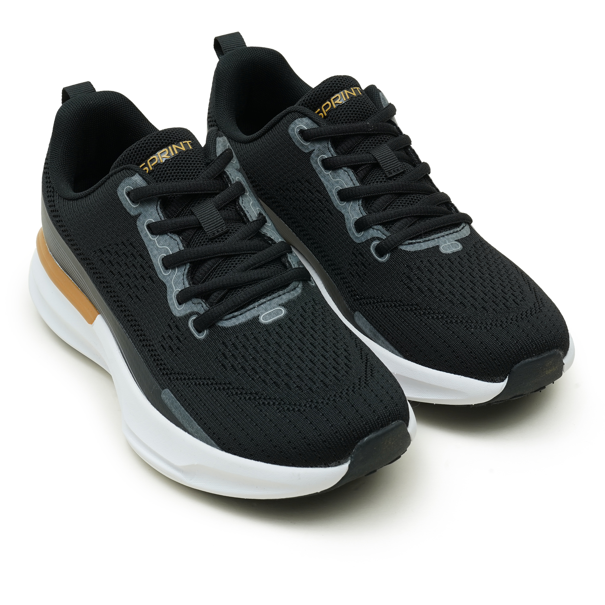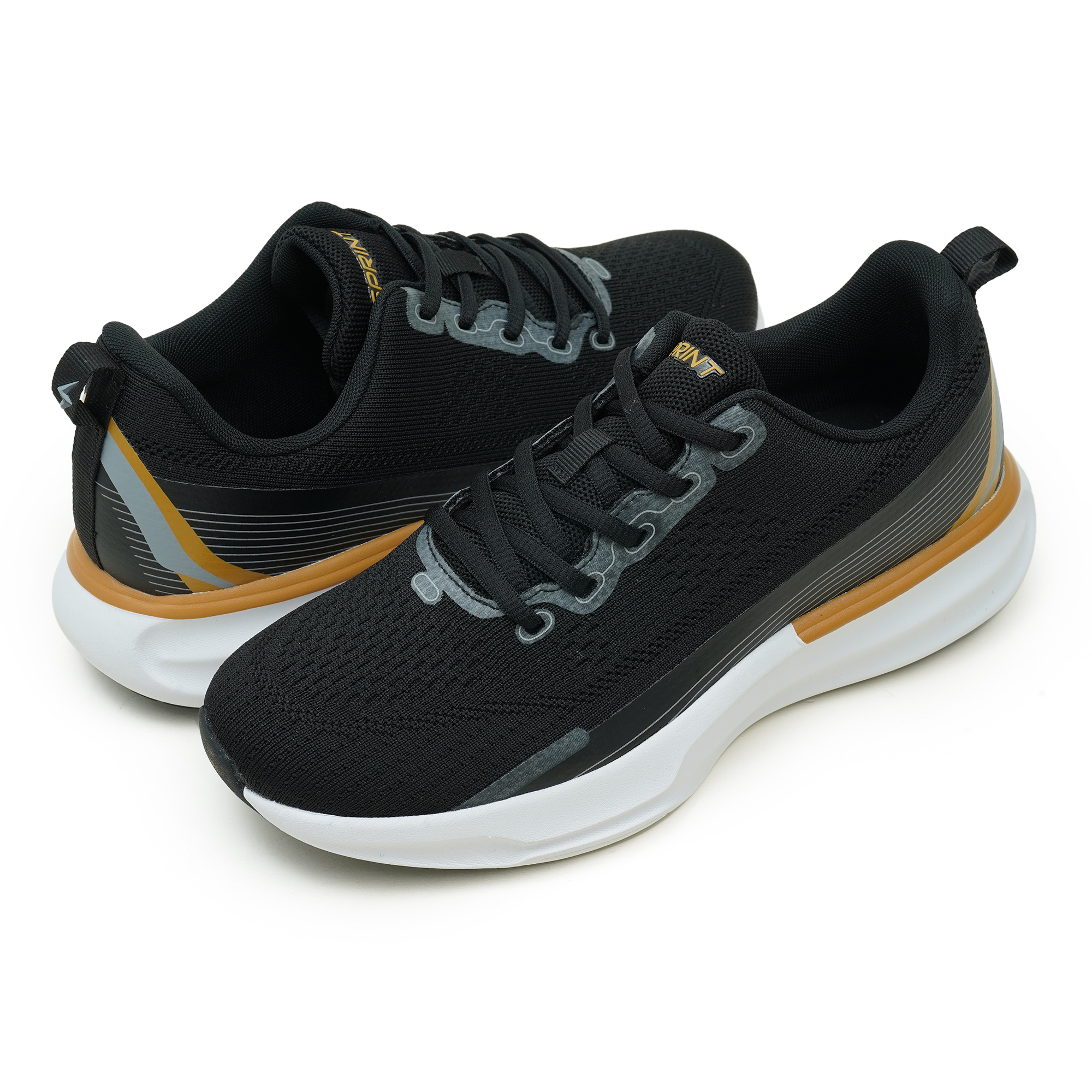 Sprint Black men's sports shoe combines performance-driven design with everyday versatility. A breathable mesh upper keeps feet cool during workouts, while the EVA midsole delivers responsive cushioning. The TPR outsole provides reliable traction across surfaces. Sleek, supportive knit with a secure lace-up system enhances fit, stability, and confidence. Subtle color accents elevate the look, making it suitable for training, jogging, or casual wear. Built for focus, momentum, and durability, these shoes help you push your limits with comfort and style.