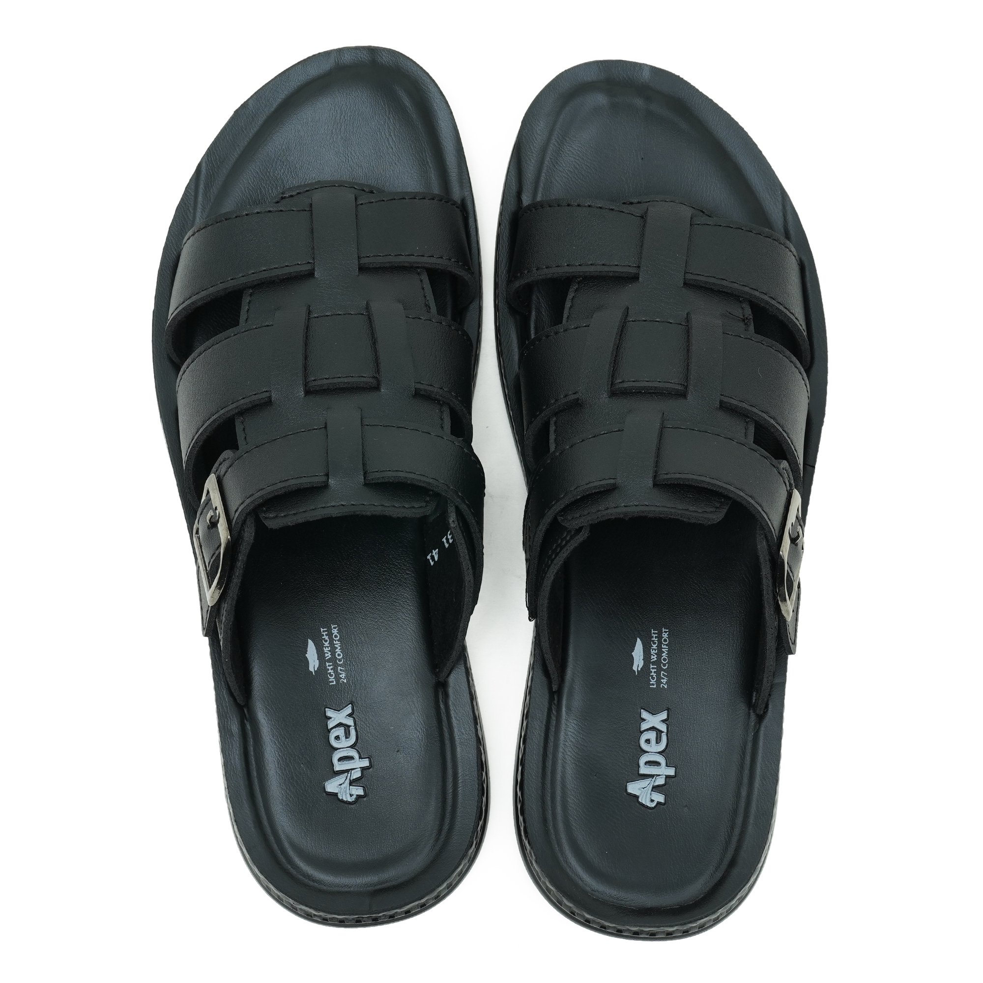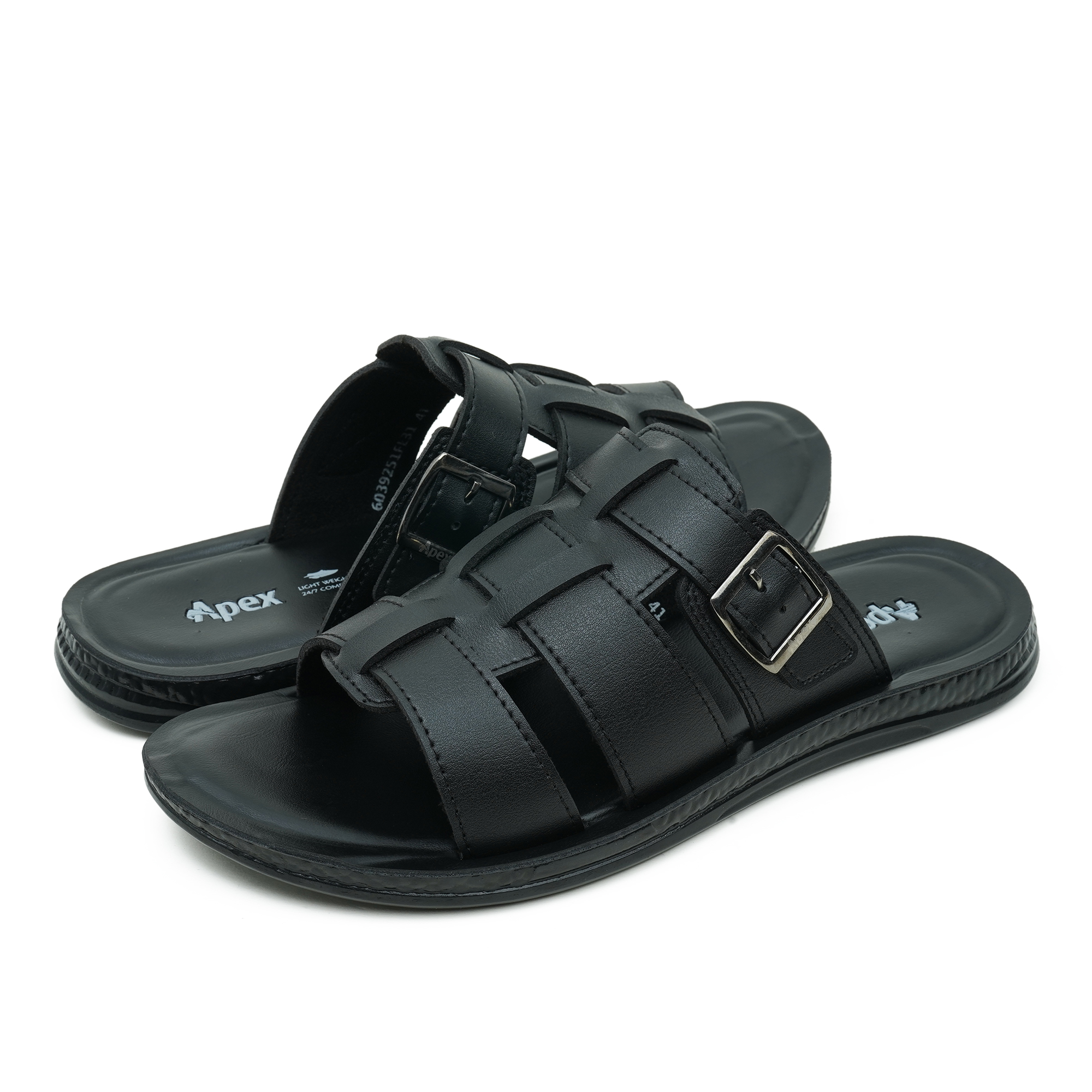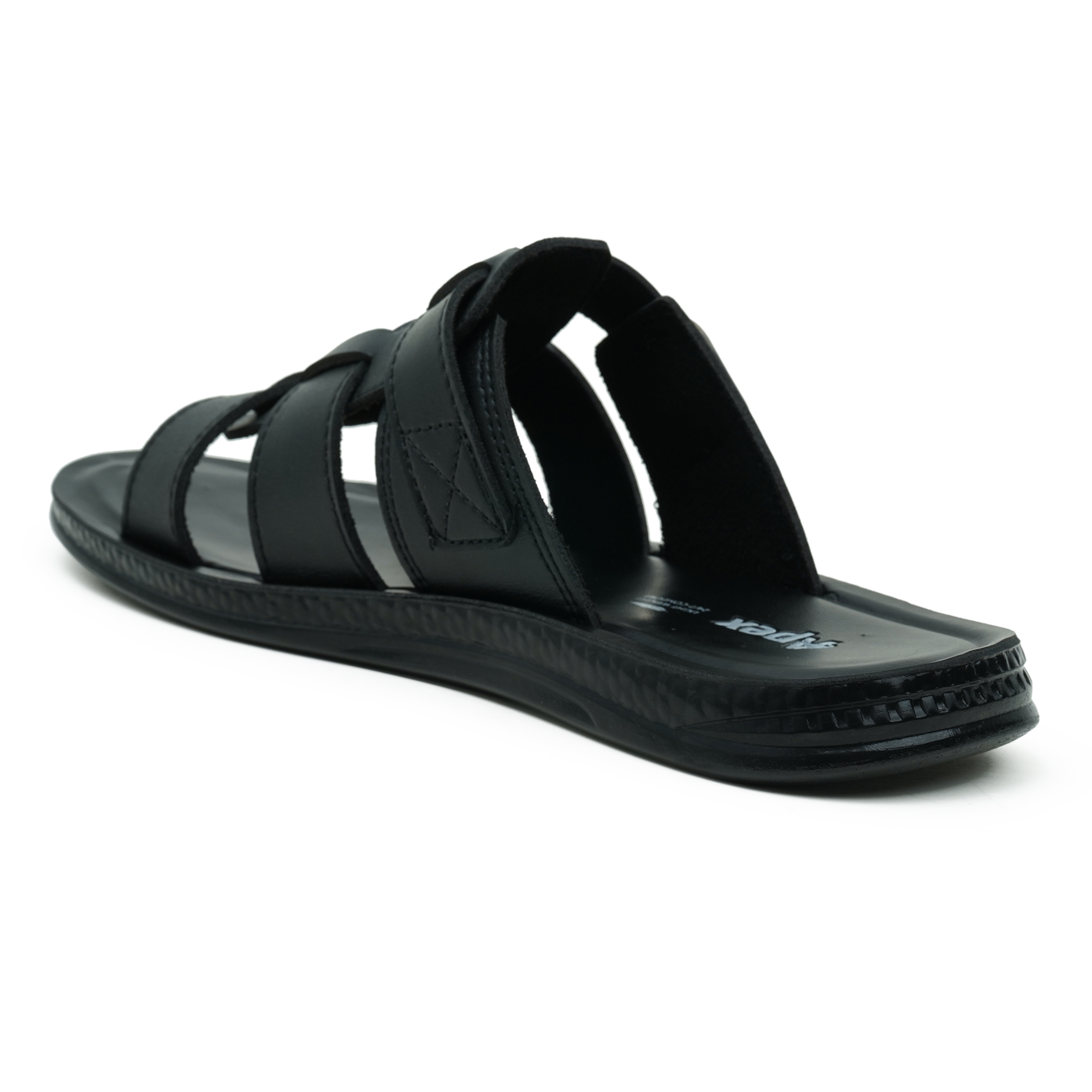 Go for everyday comfort with this Apex men’s sandal in timeless black. The open-toe design keeps your feet cool, while the slip-on construction makes it easy to wear on busy days. Built with a durable PVC upper and a lightweight PU sole, it offers a practical balance of support and flexibility for daily use. The broad, woven-style strap pattern adds a smart finish and helps hold the foot comfortably—ideal for casual outings, errands, or regular wear.