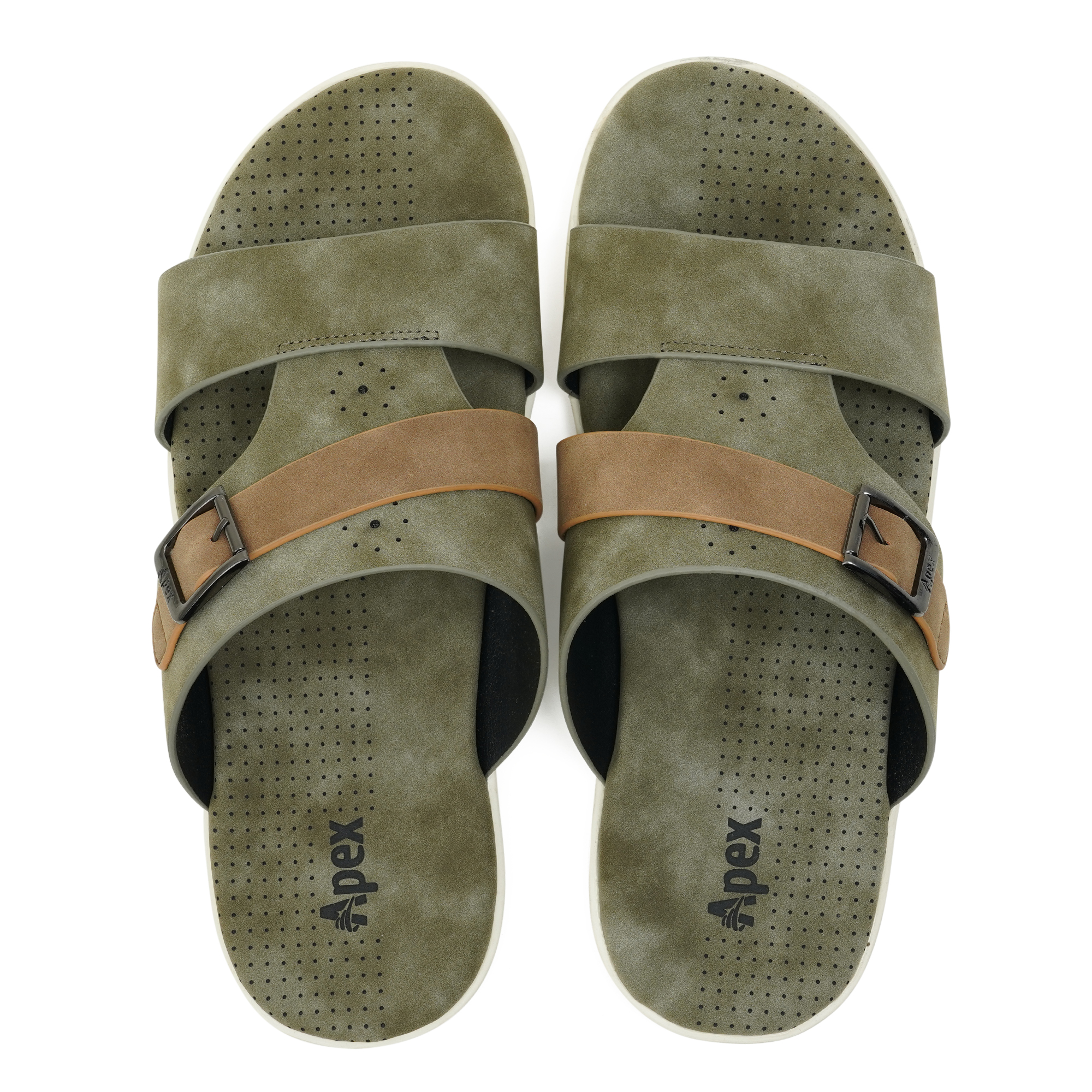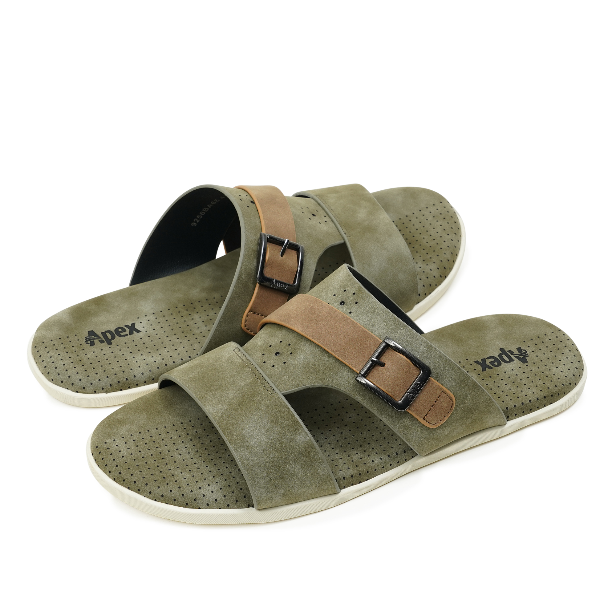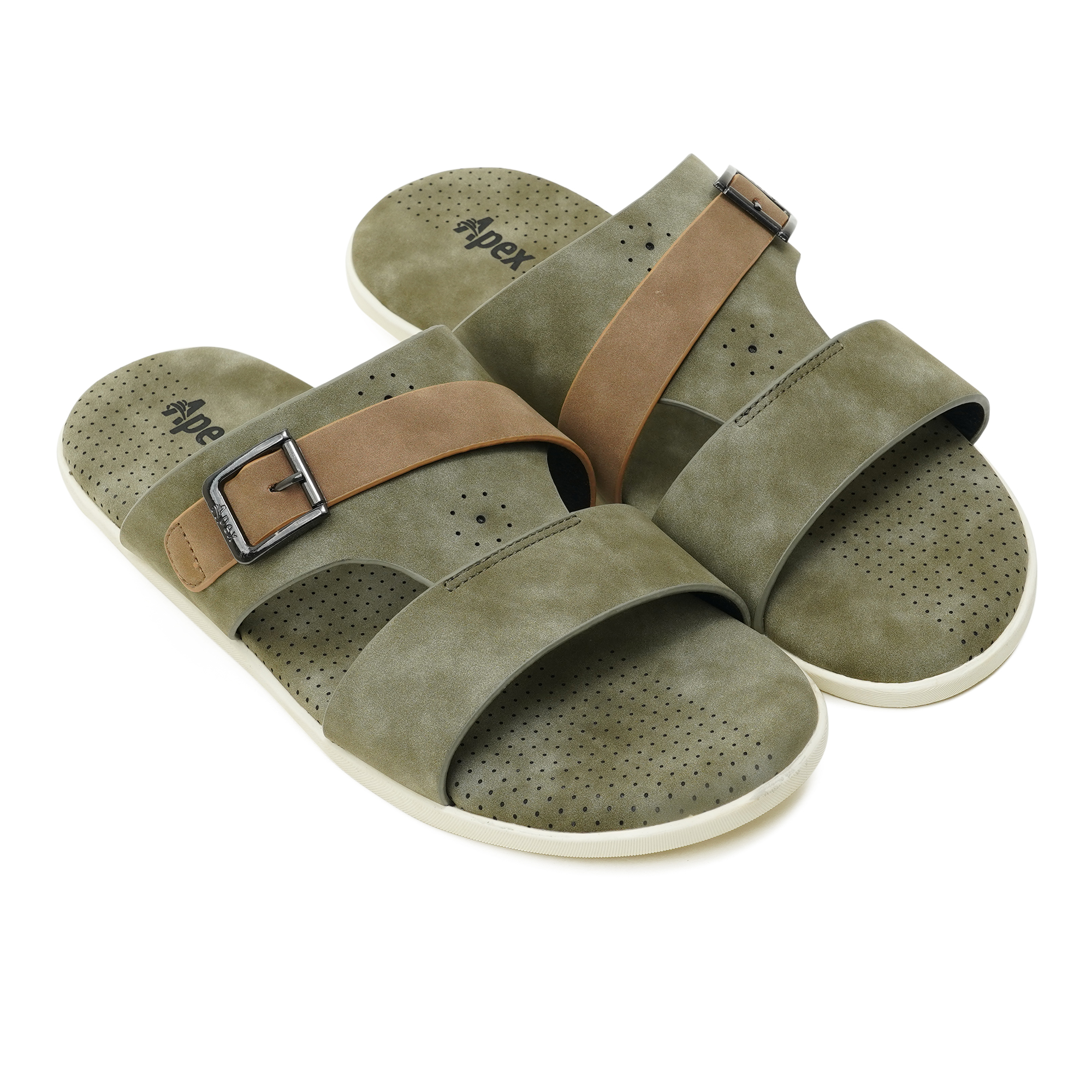 Refine your casual look with these premium slides from Apex. Featuring a soft, suede-like synthetic finish in a muted olive tone, these sandals offer a sophisticated upgrade to the standard slipper. The design highlights a classic dual-strap silhouette: a wide front strap for stability and an adjustable instep strap with a contrasting tan accent and gunmetal buckle for a custom fit. The footbed is perforated for breathability, ensuring you stay cool and comfortable all day. Resting on a flexible white TPR outsole, this pair delivers the perfect balance of style, grip and durability.