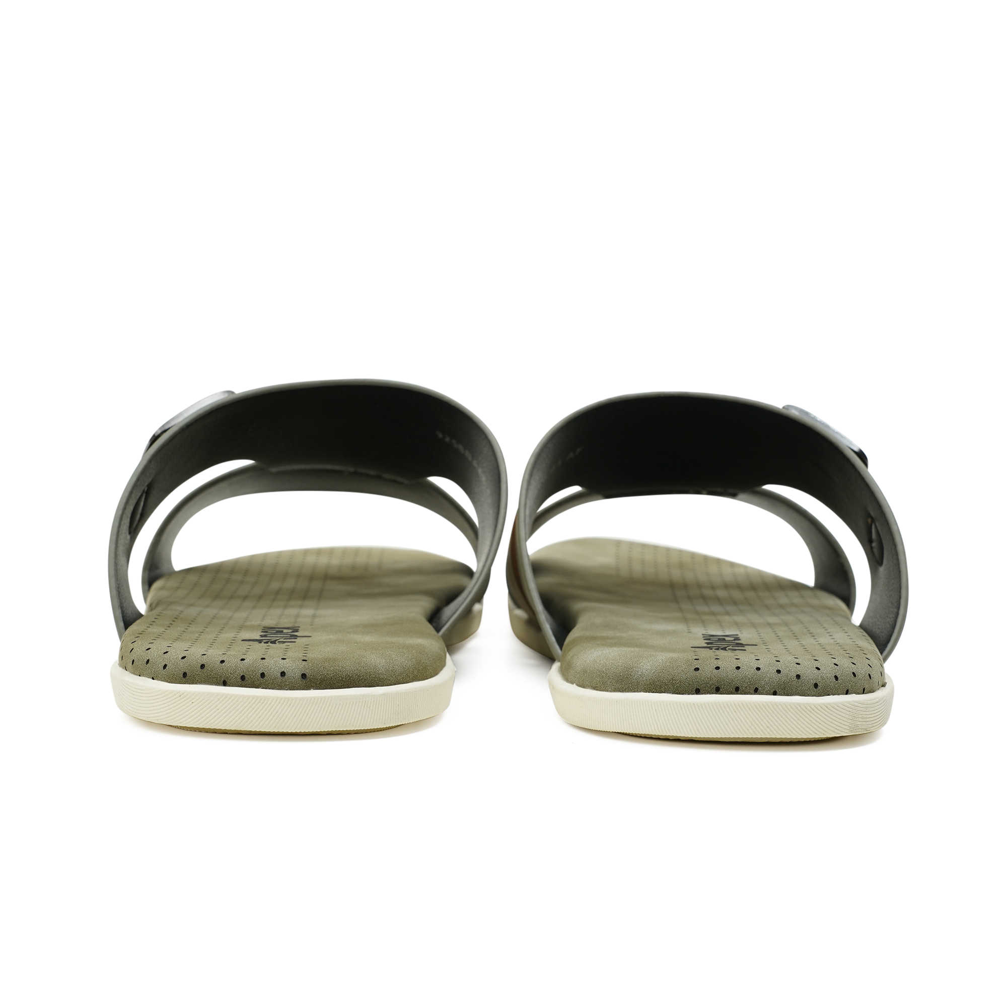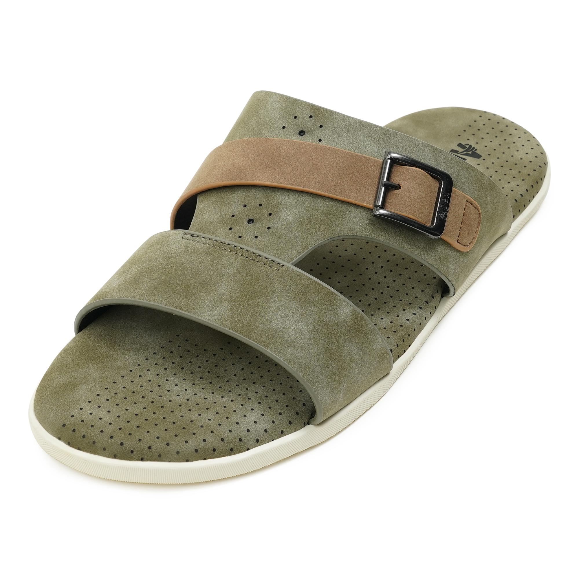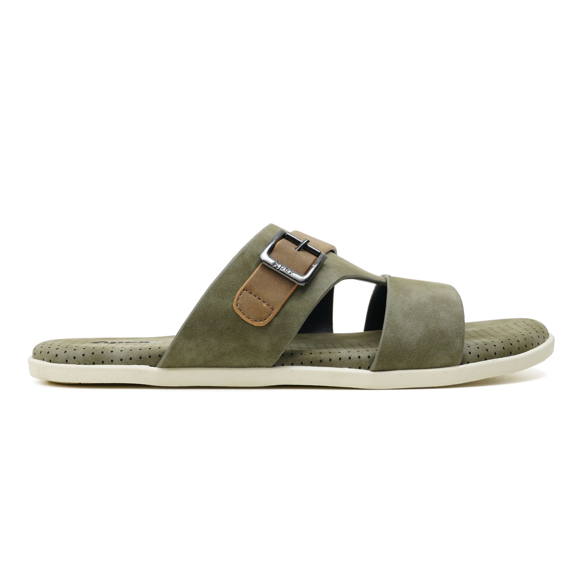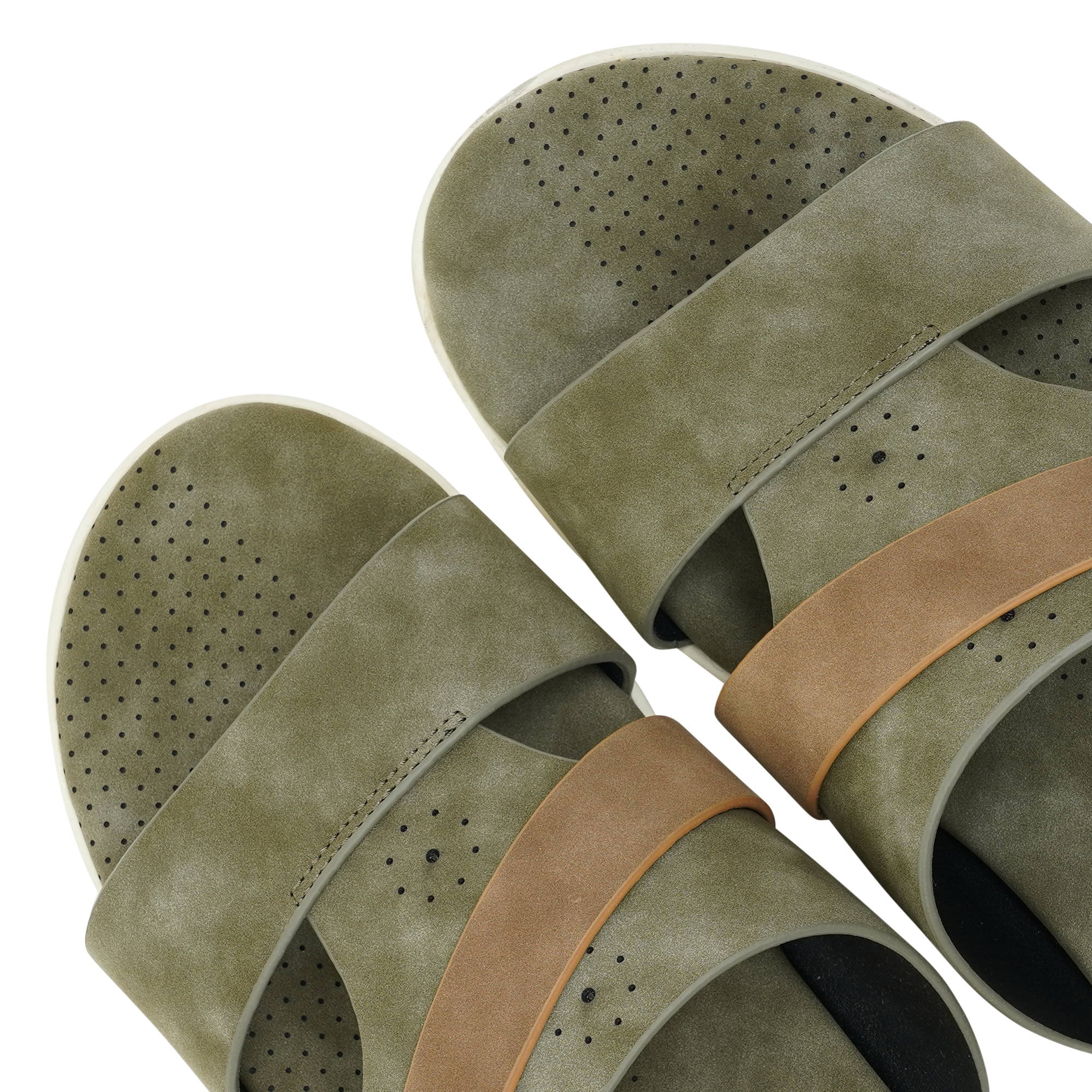 Refine your casual look with these premium slides from Apex. Featuring a soft, suede-like synthetic finish in a muted olive tone, these sandals offer a sophisticated upgrade to the standard slipper. The design highlights a classic dual-strap silhouette: a wide front strap for stability and an adjustable instep strap with a contrasting tan accent and gunmetal buckle for a custom fit. The footbed is perforated for breathability, ensuring you stay cool and comfortable all day. Resting on a flexible white TPR outsole, this pair delivers the perfect balance of style, grip and durability.
