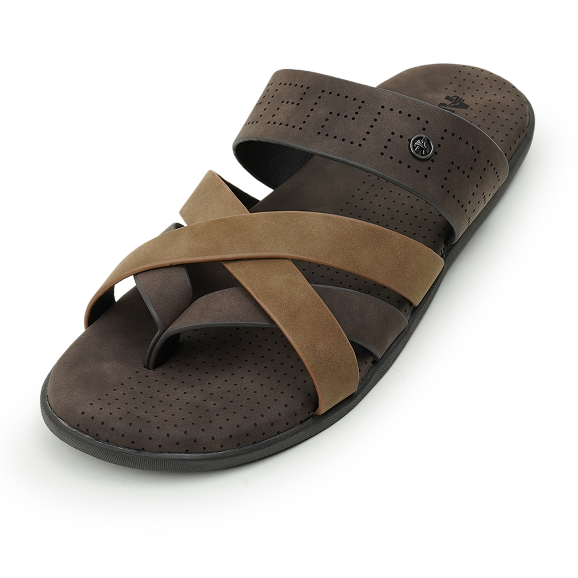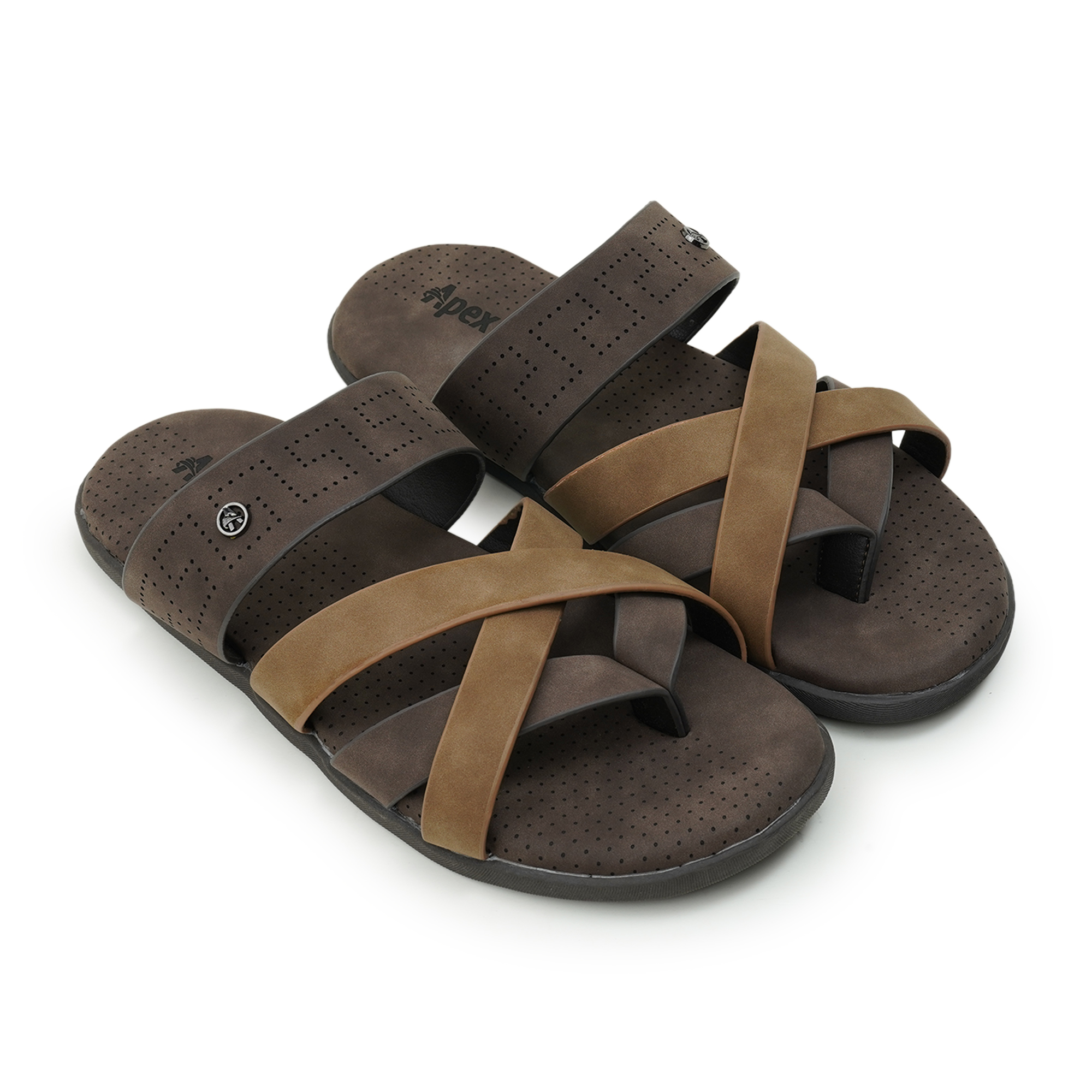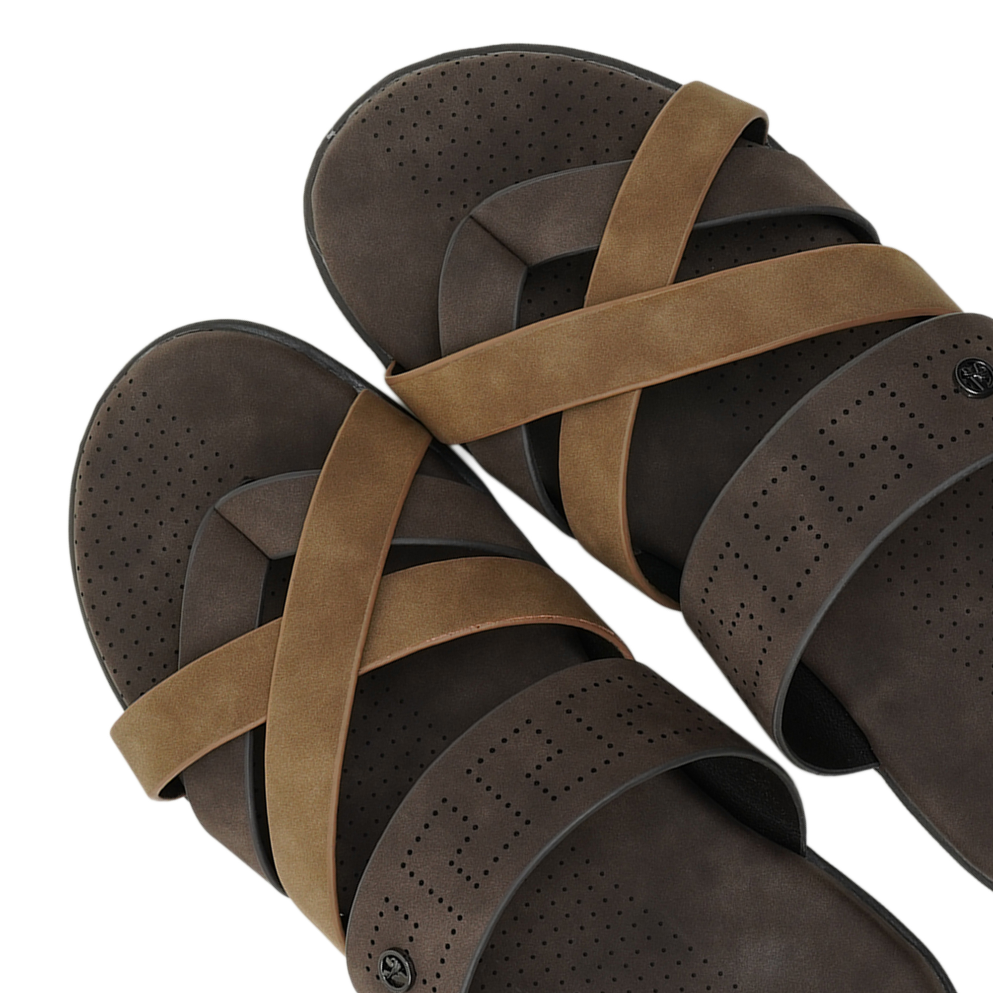 The Apex Men's Toe-ring Sandaldesign features a grey and black primary strap detailed with a geometric perforation pattern, interlaced with lighter suede-finish cross-straps for a stylish contrast. The secure toe-loop construction ensures stability with every step, while the perforated footbed provides breathability. Built on a flexible TPR sole, this is the ideal footwear for smart-casual or traditional occasions.