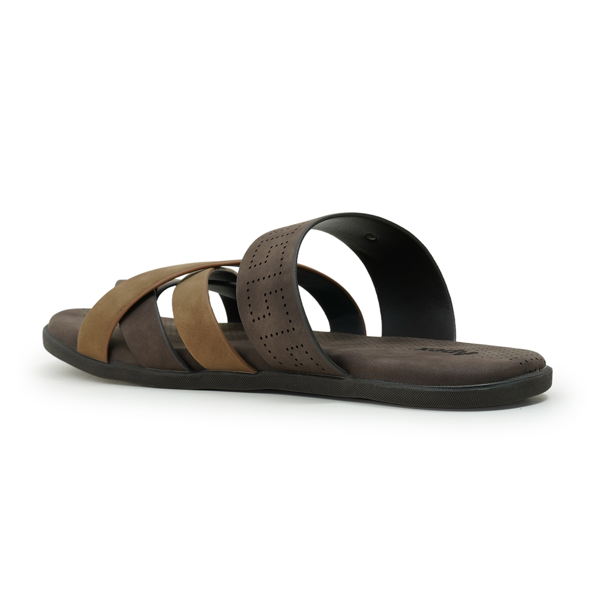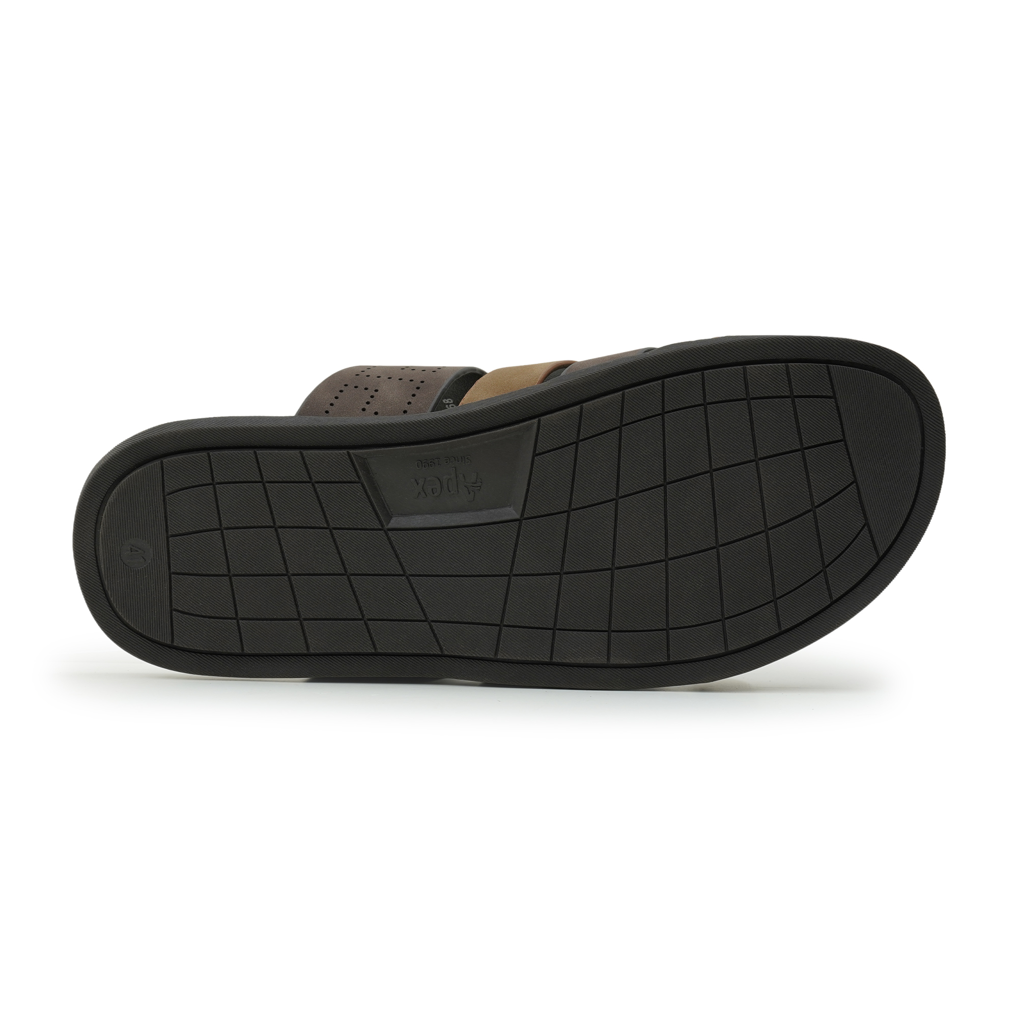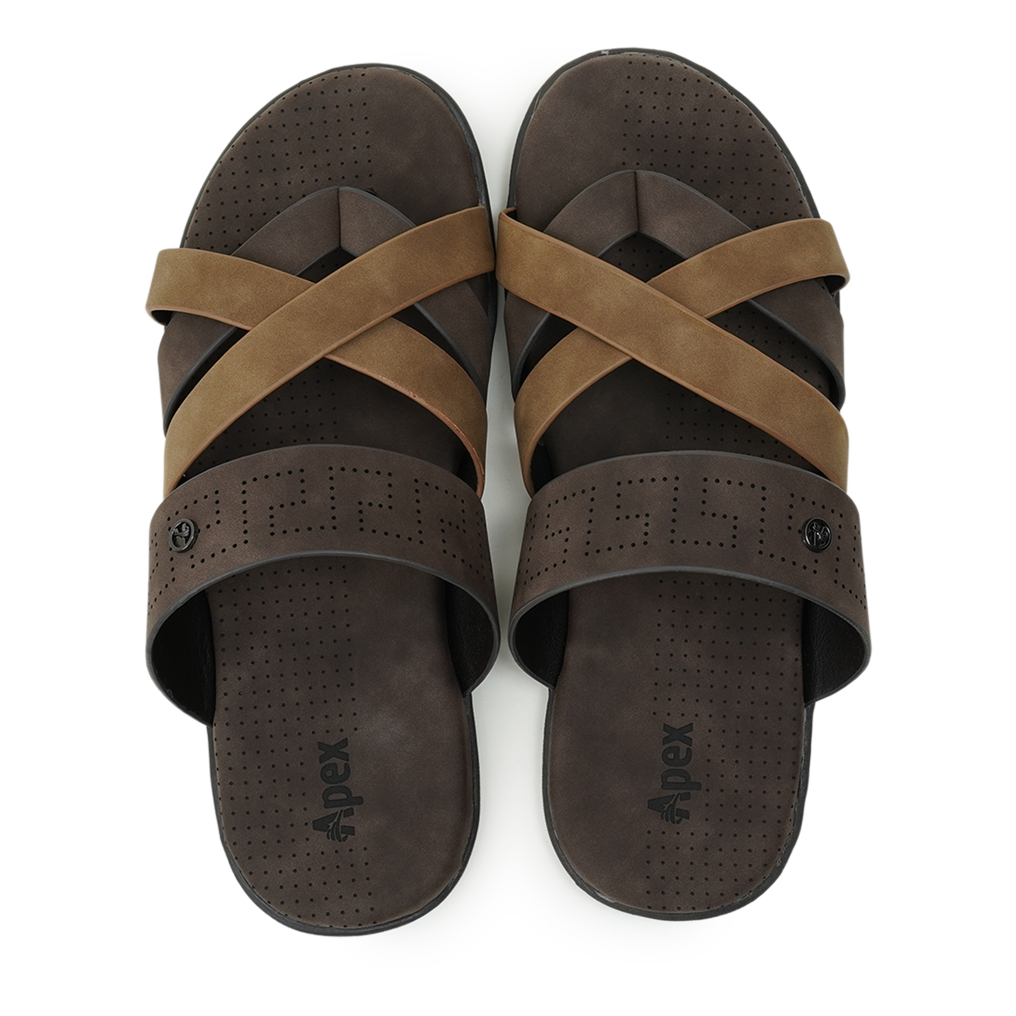 The Apex Men's Toe-ring Sandaldesign features a grey and black primary strap detailed with a geometric perforation pattern, interlaced with lighter suede-finish cross-straps for a stylish contrast. The secure toe-loop construction ensures stability with every step, while the perforated footbed provides breathability. Built on a flexible TPR sole, this is the ideal footwear for smart-casual or traditional occasions.