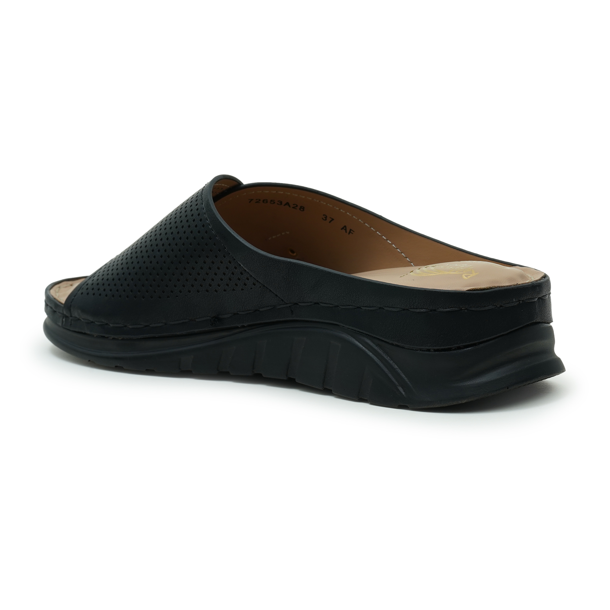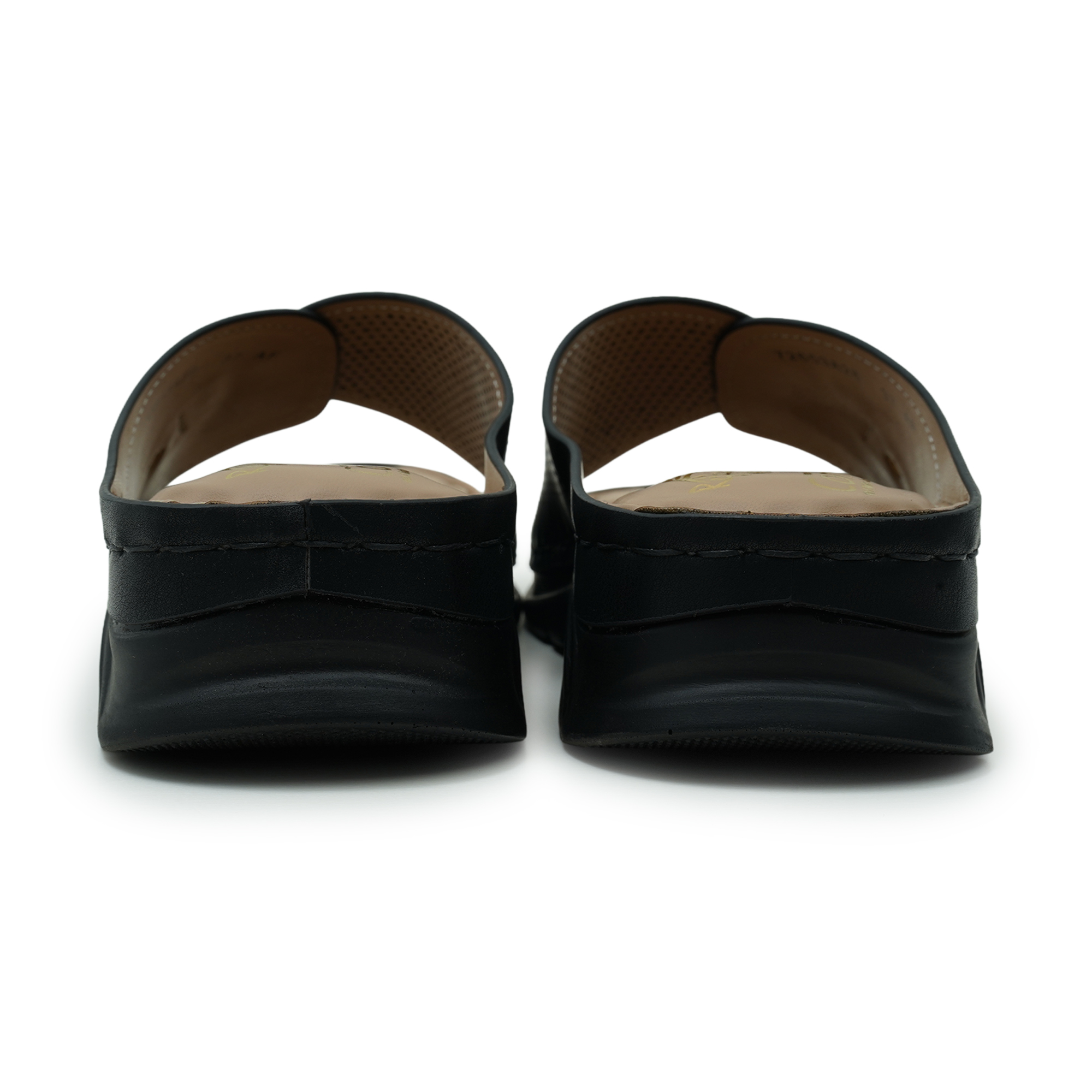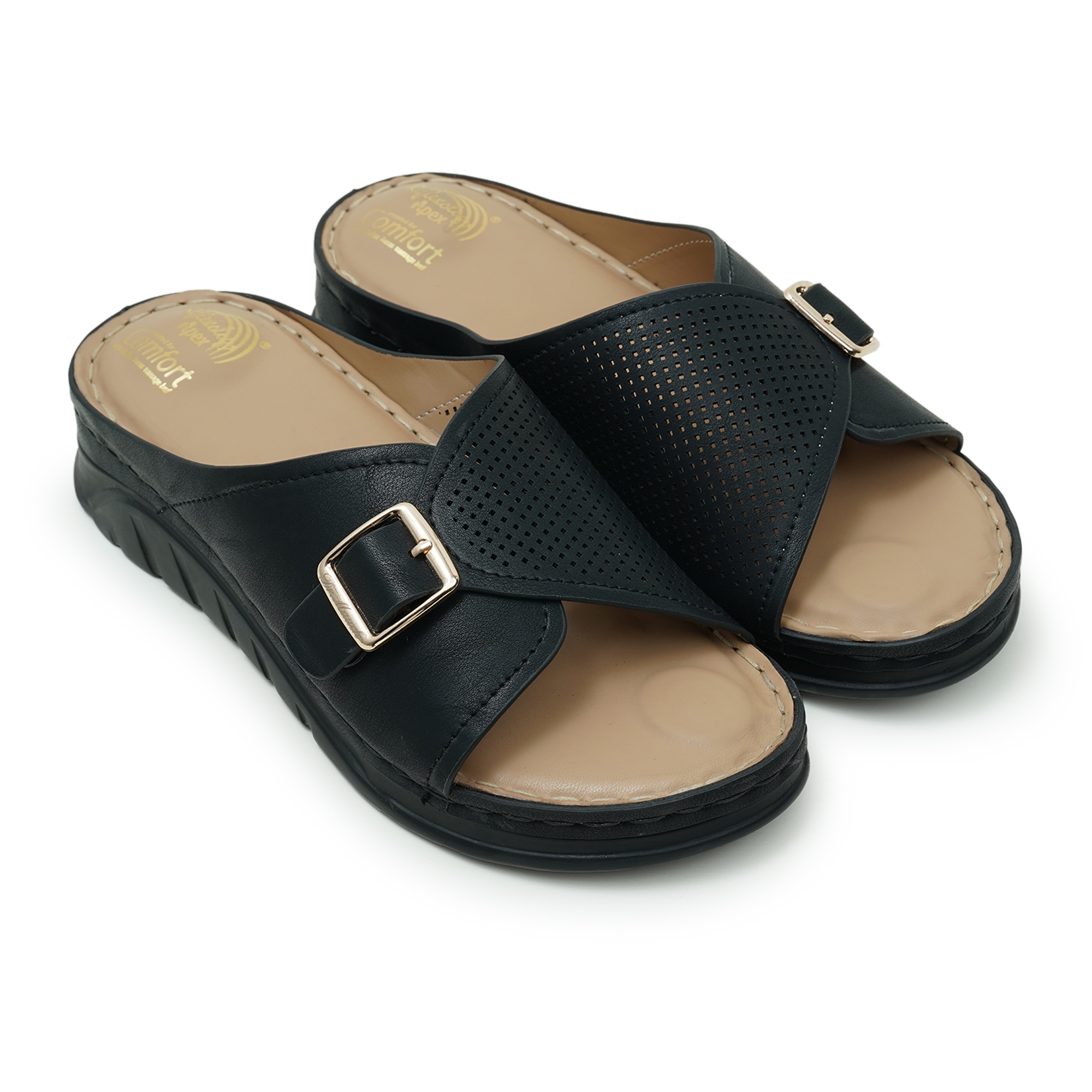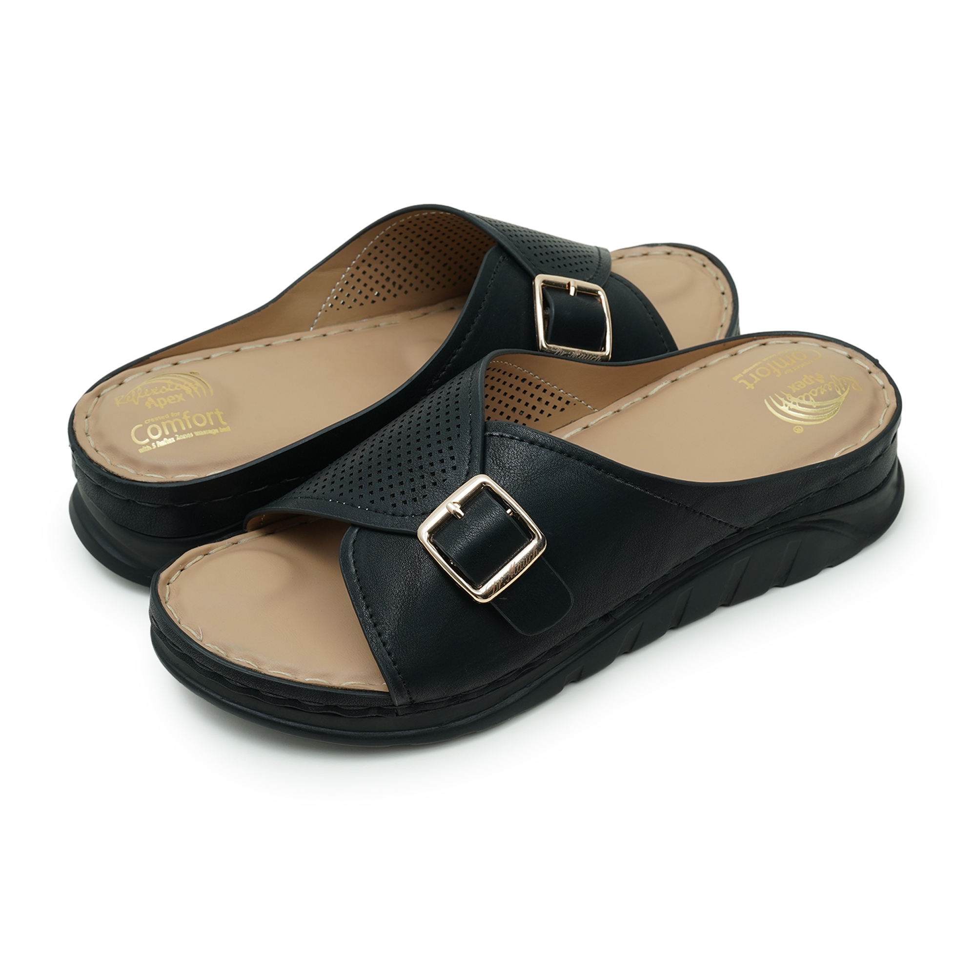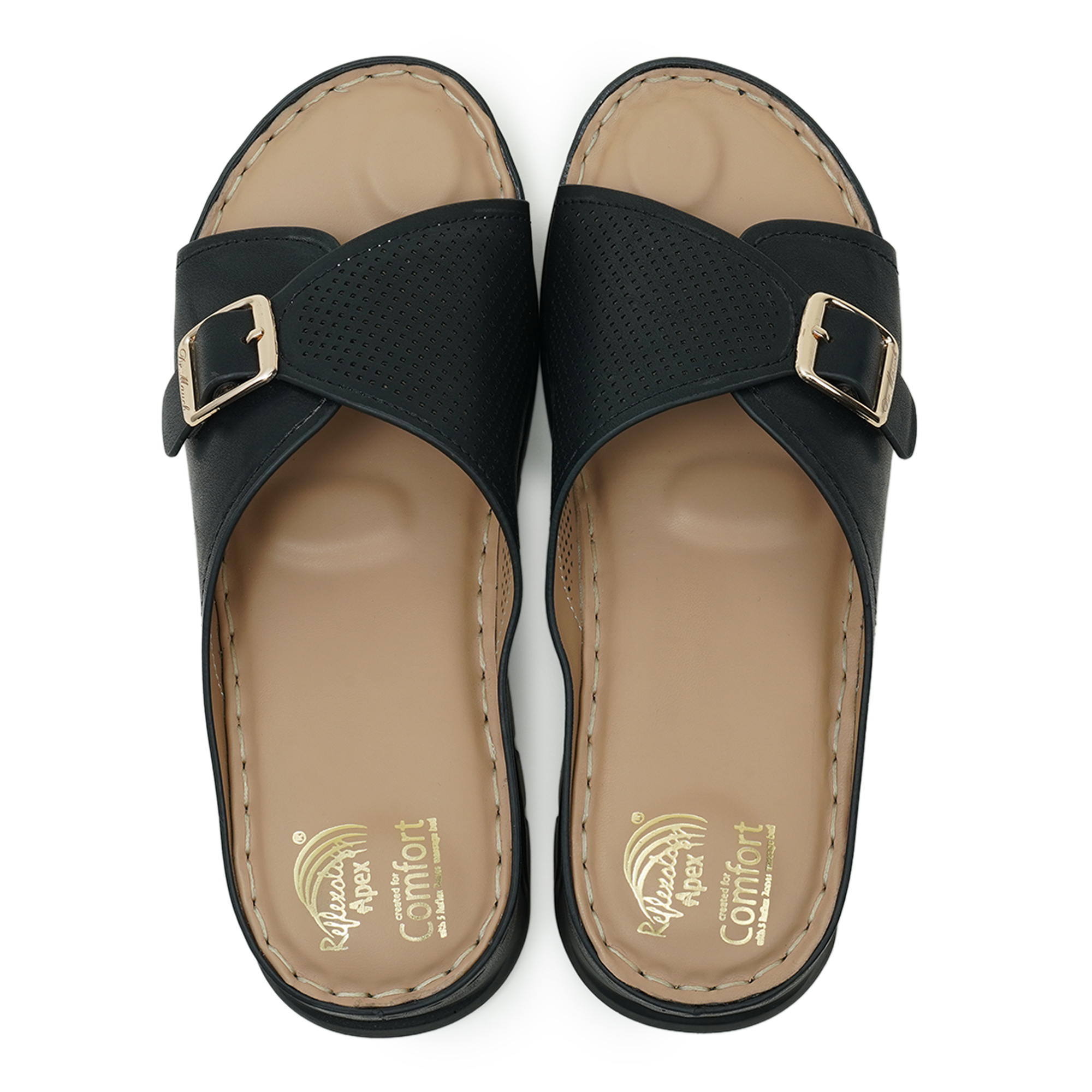 Step out in comfort and style with the Dr. Mauch women’s sandal in elegant black. Built with Reflex Zone technology, the footbed is designed to provide targeted comfort and help reduce pressure on key areas during everyday walking. The durable PU upper offers a smooth, premium feel, while the golden metal design adds a smart, dressy touch. Easy to slip on and comfortable for regular use, this sandal works well for daily errands, office wear, and casual outings.