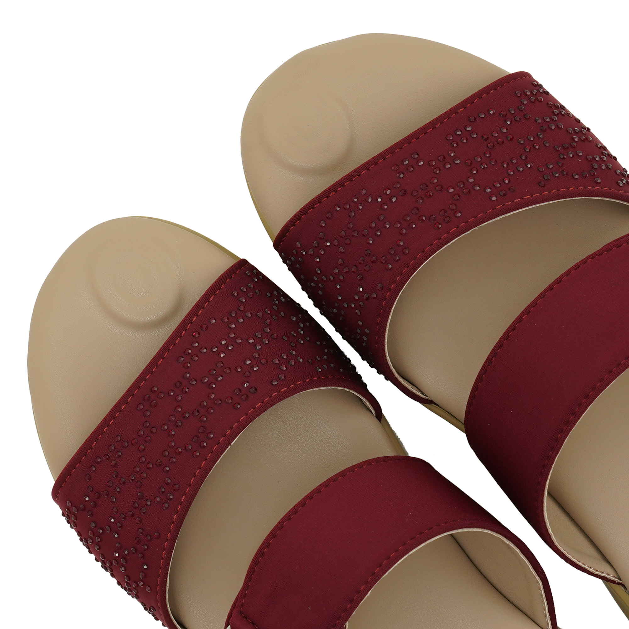 - Deep maroon straps with intricate tonal floral rhinestone detailing