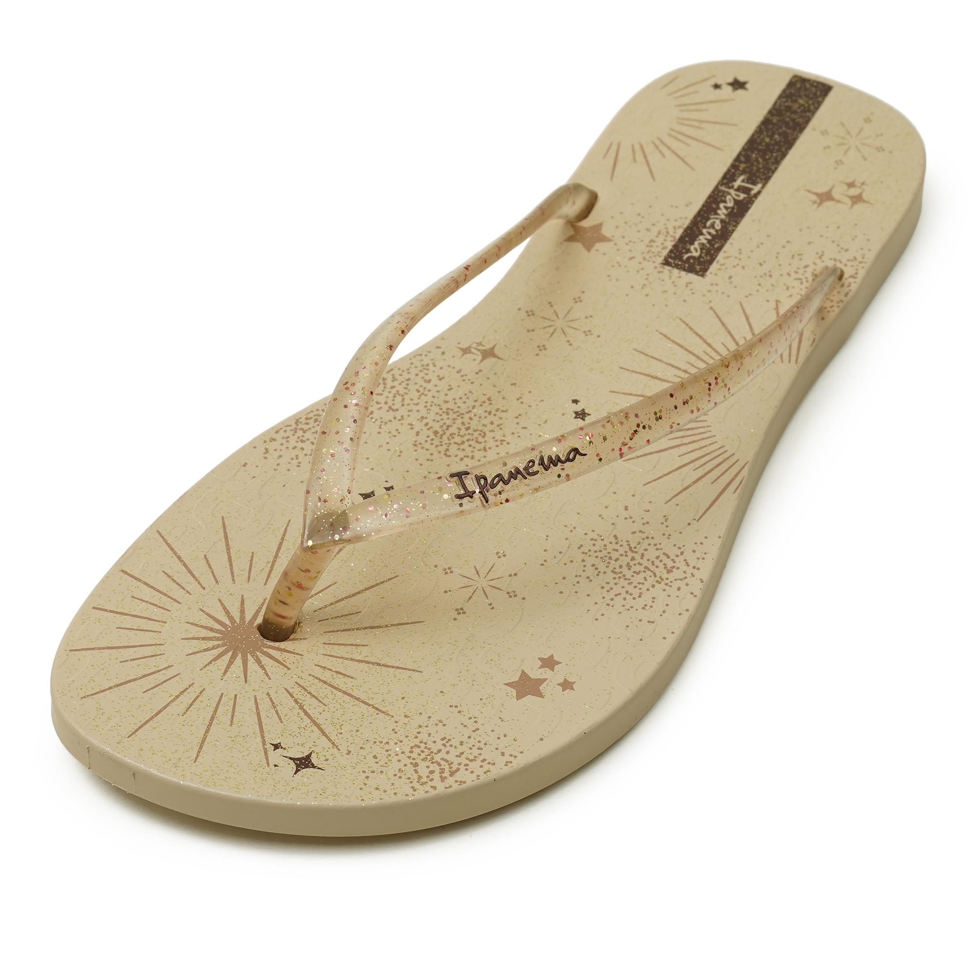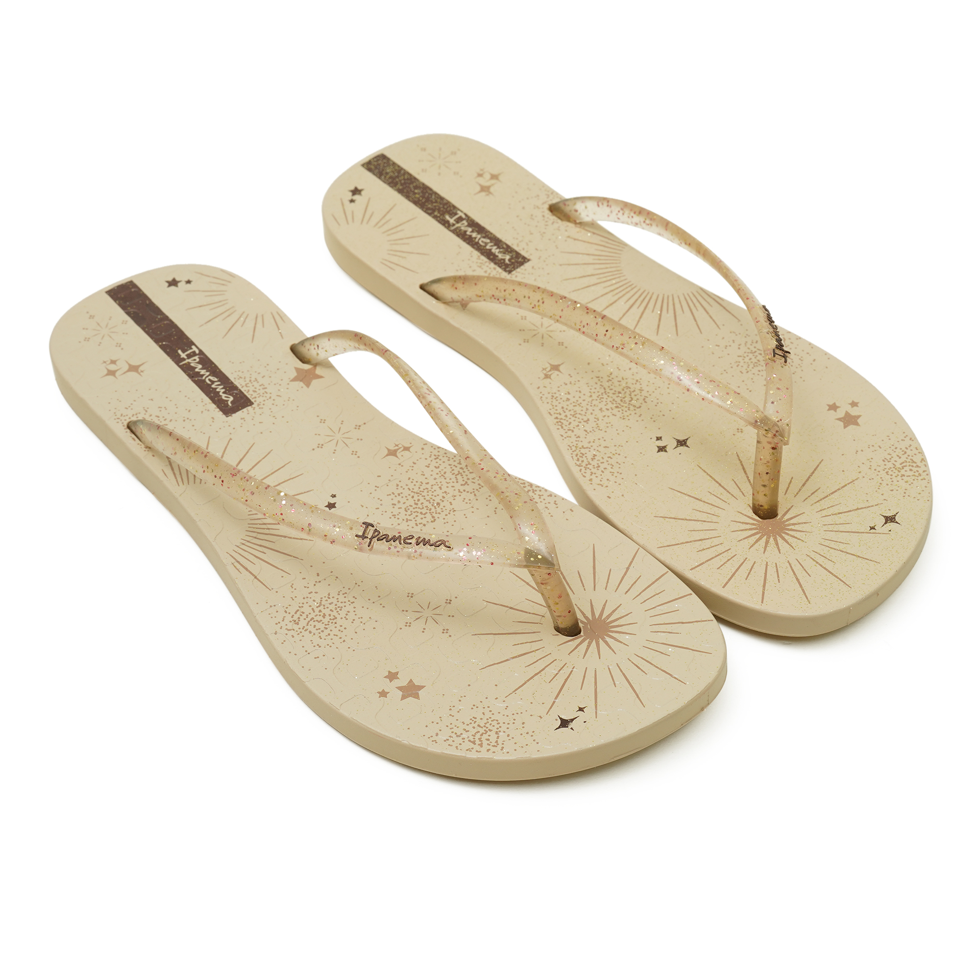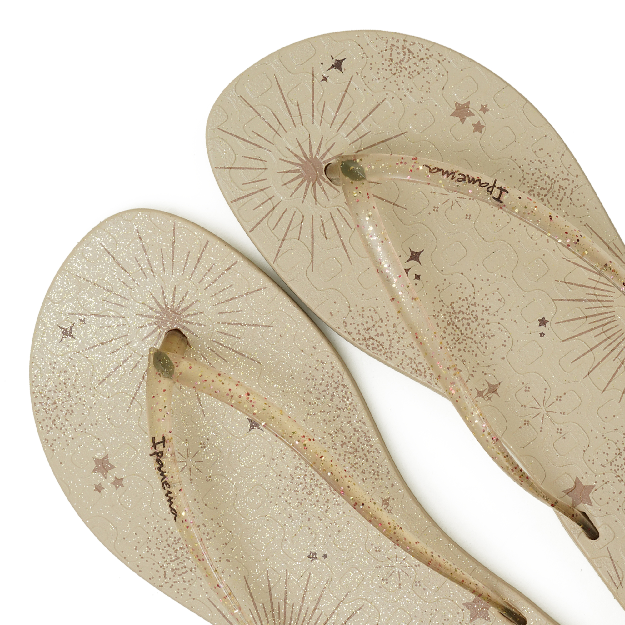 Add a touch of celestial charm to your everyday style with these Ipanema "Cosmic Sparkle" flip-flops in a soft beige hue. Designed for ladies, these sandals feature a delightful starry graphic print and sparkling glitter accents on the straps. Crafted from durable and water-friendly PVC, they offer comfort and a secure fit, perfect for casual wear, beach days, or everyday adventures.