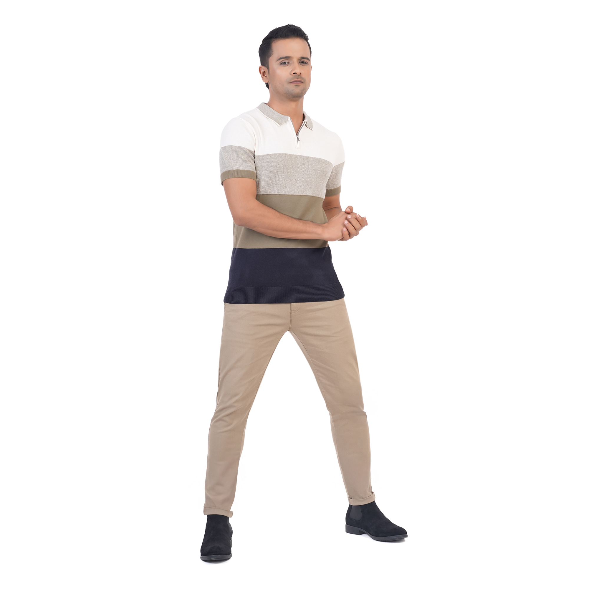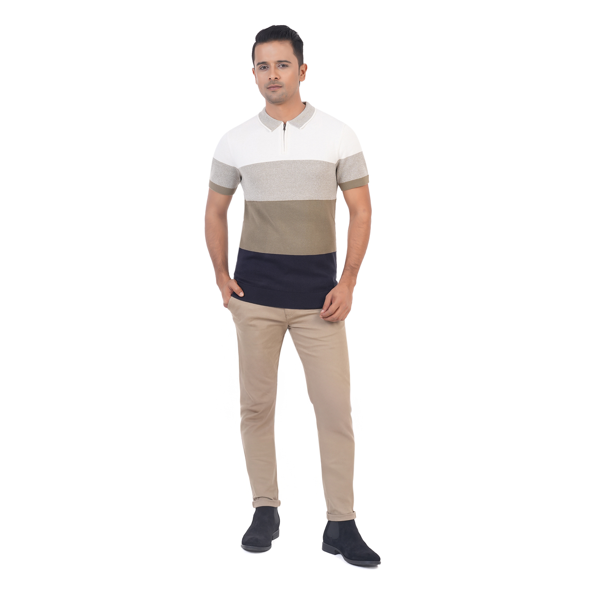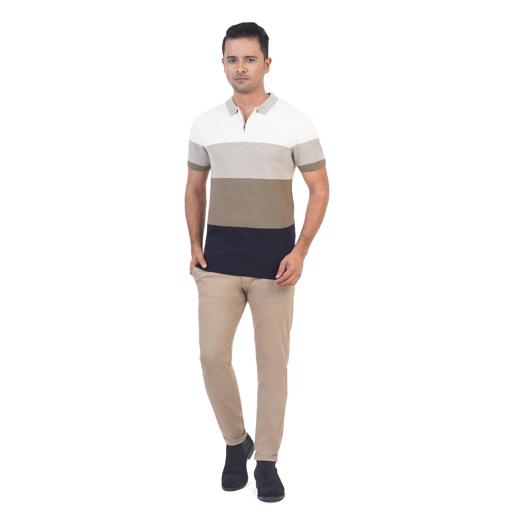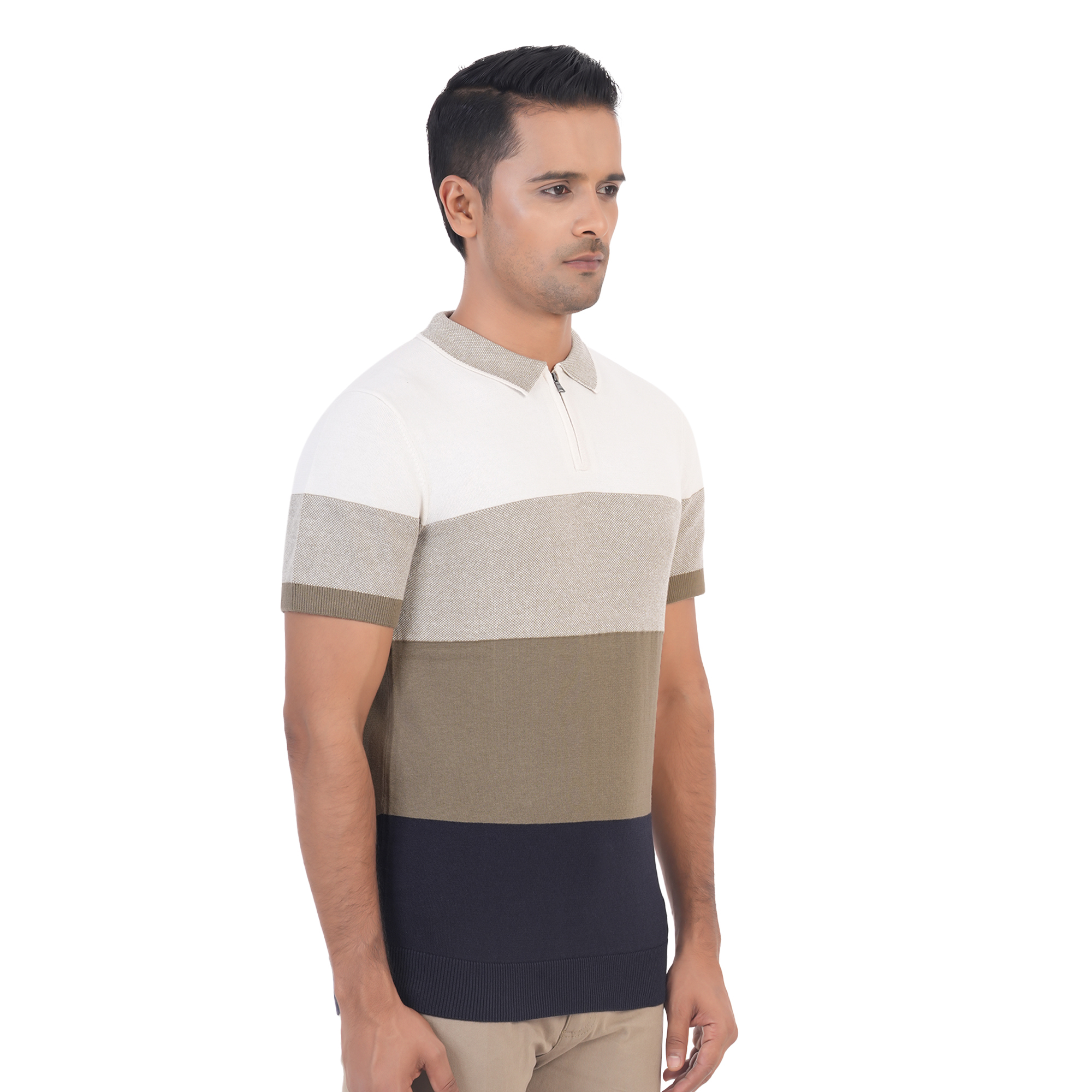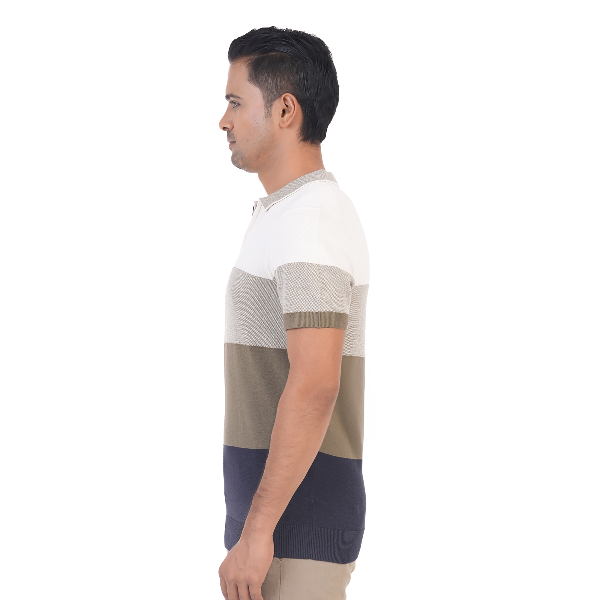 Maverick Men's Polo T-shirt brings a bold twist to your casual wardrobe with its striking four-tier color combination. Designed with breathable cotton, it features a polo collar, front button placket, and half sleeves—making it a stylish and comfortable choice for all-day wear.
