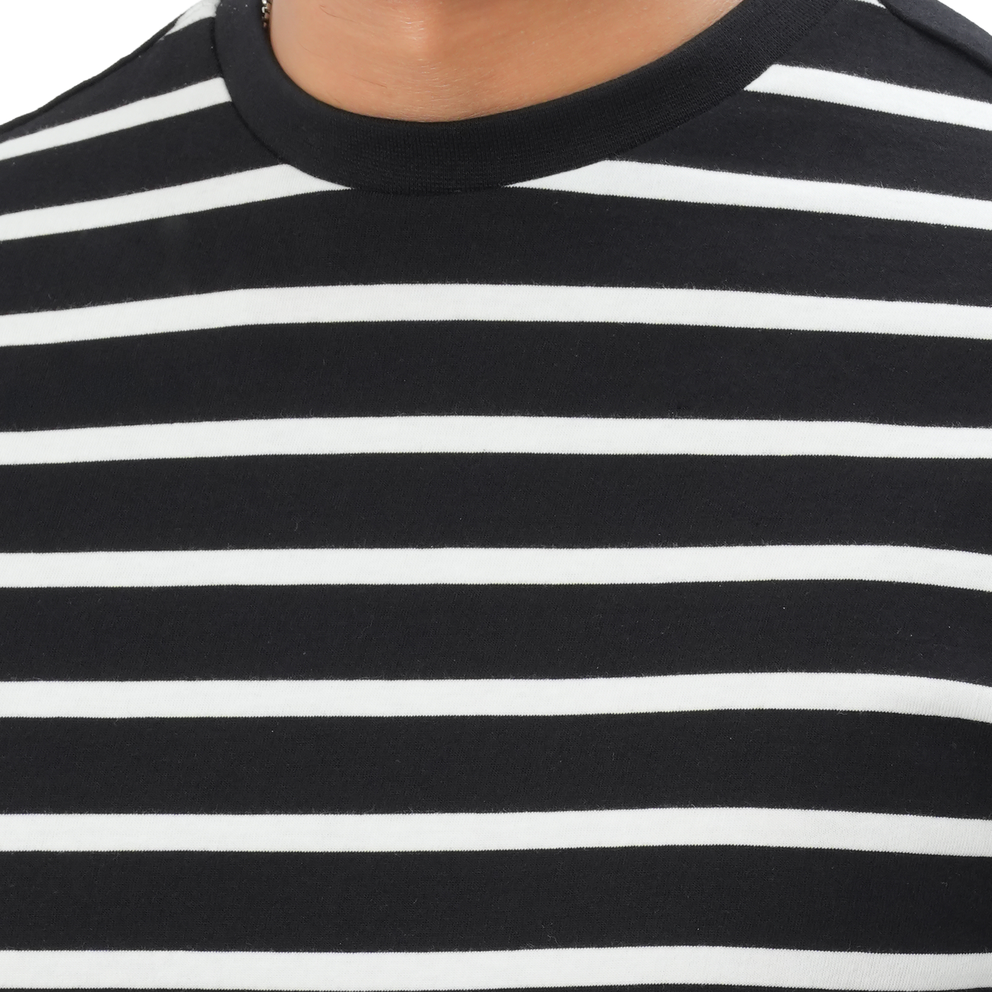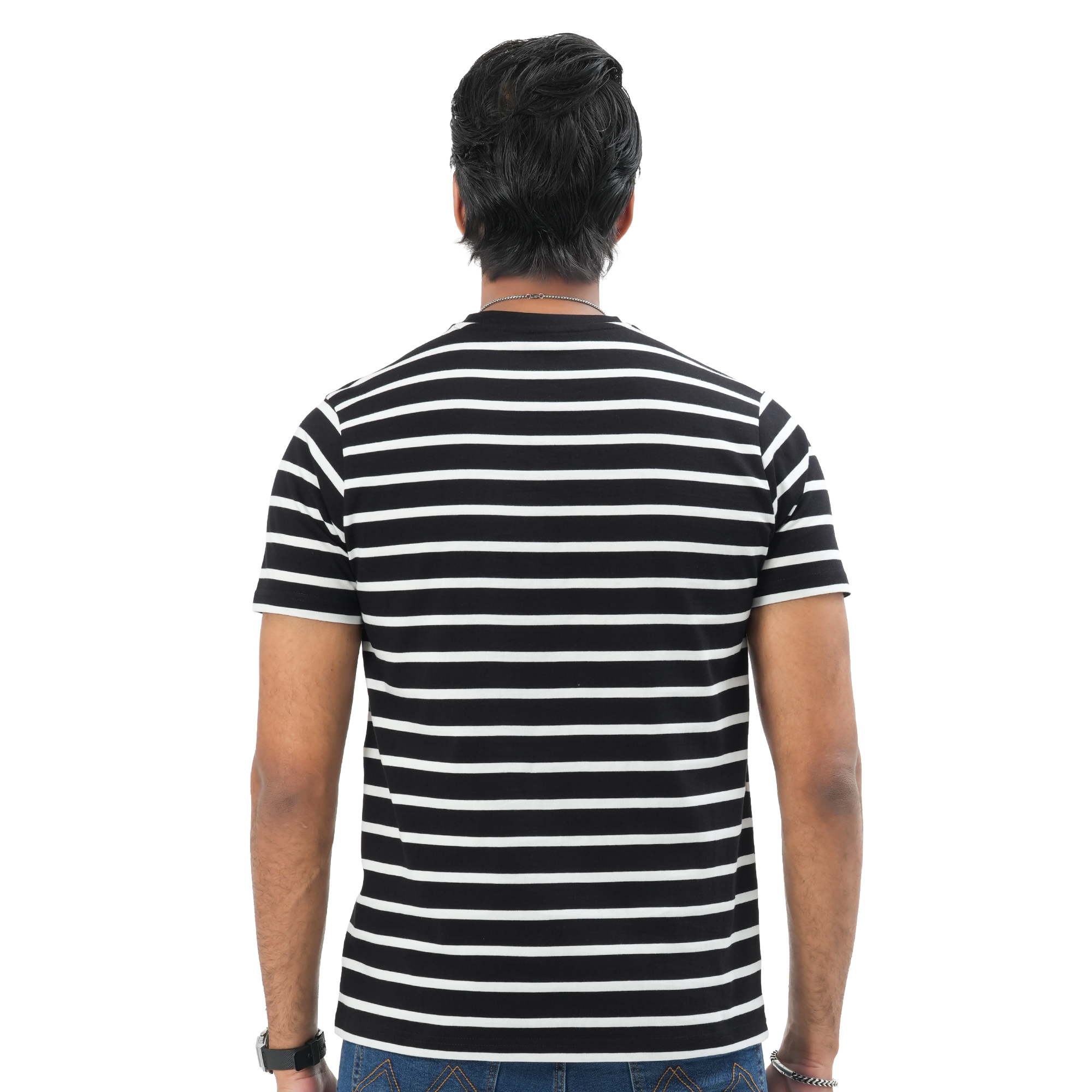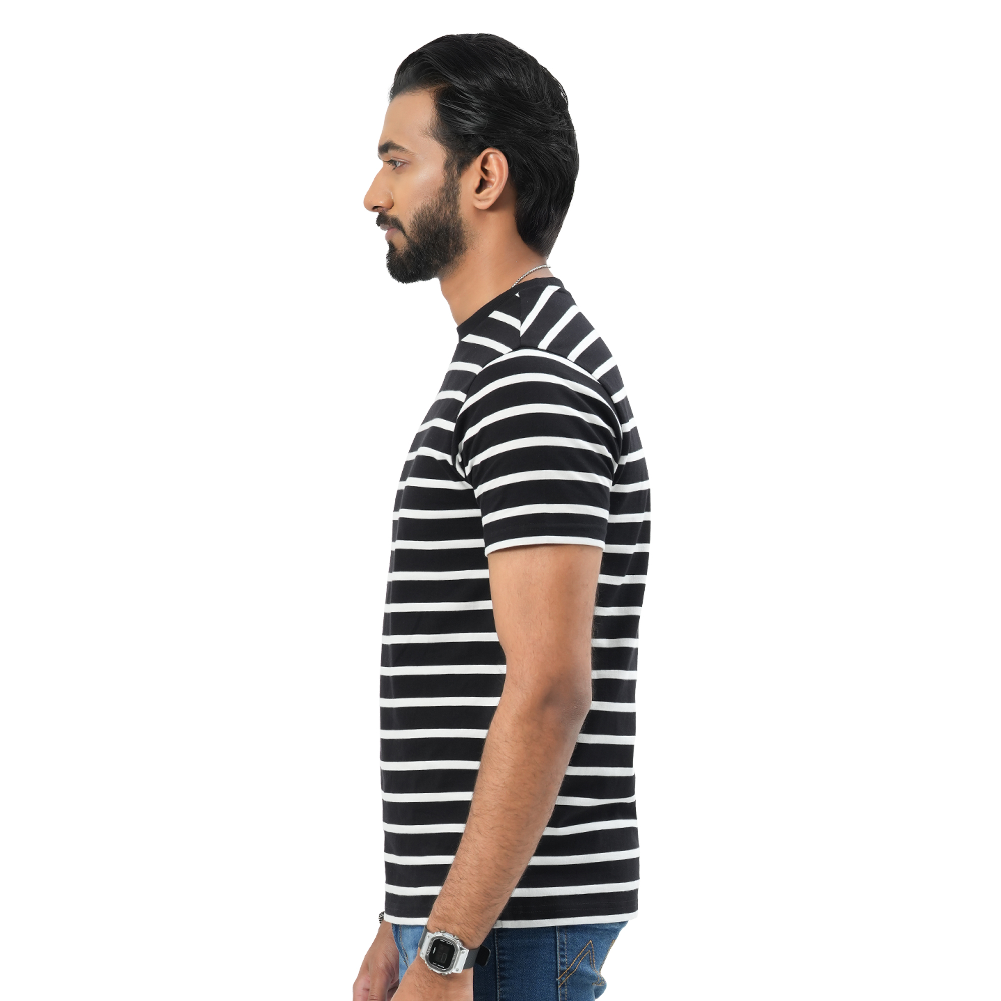 A timeless striped design meets everyday comfort in this men’s black t-shirt. Made from soft, breathable fabric, it delivers a lightweight feel that keeps you comfortable throughout the day. The clean black and white stripe pattern adds a sharp, modern touch, making it easy to style for casual outings or relaxed weekends. Pair it with jeans or chinos for a simple yet confident look.