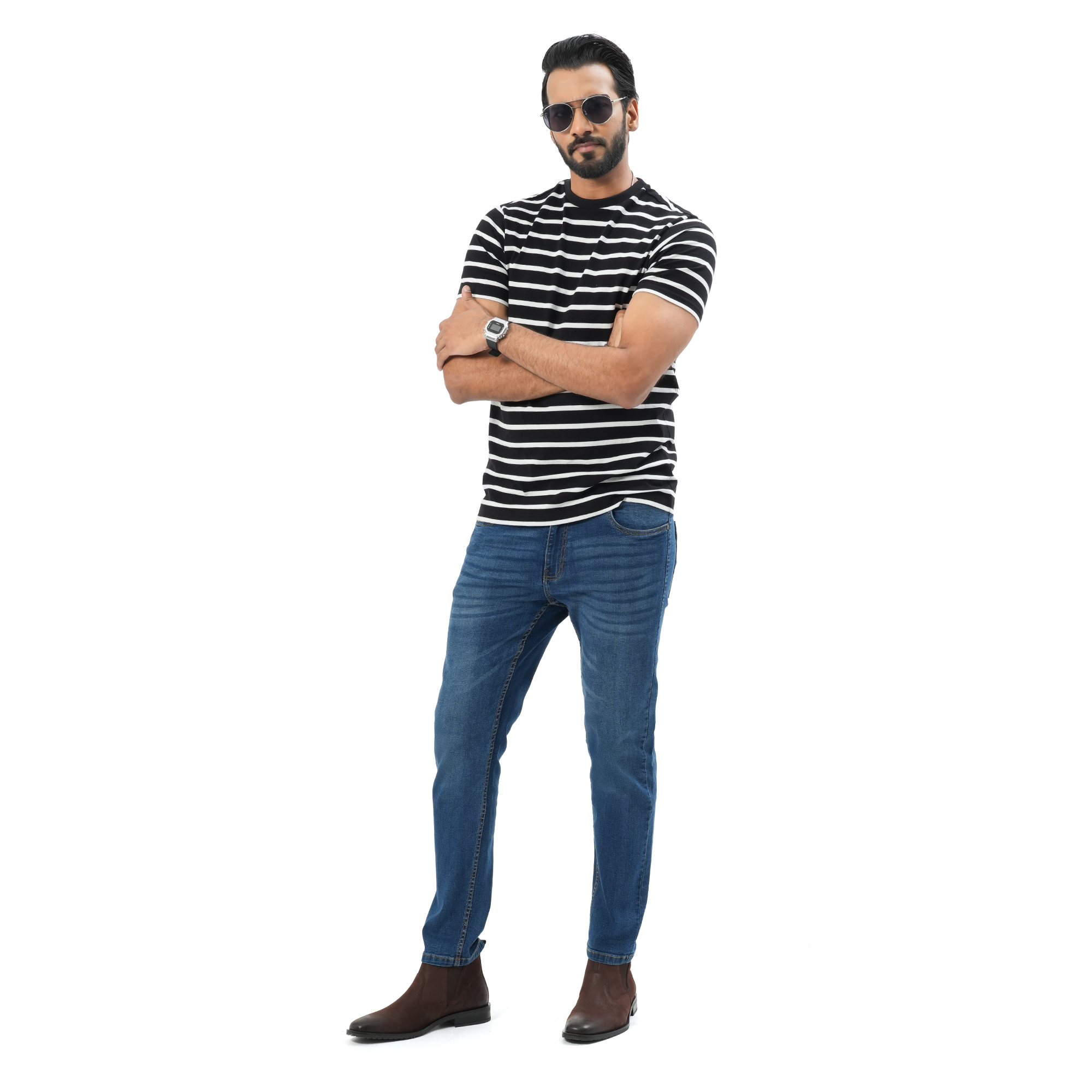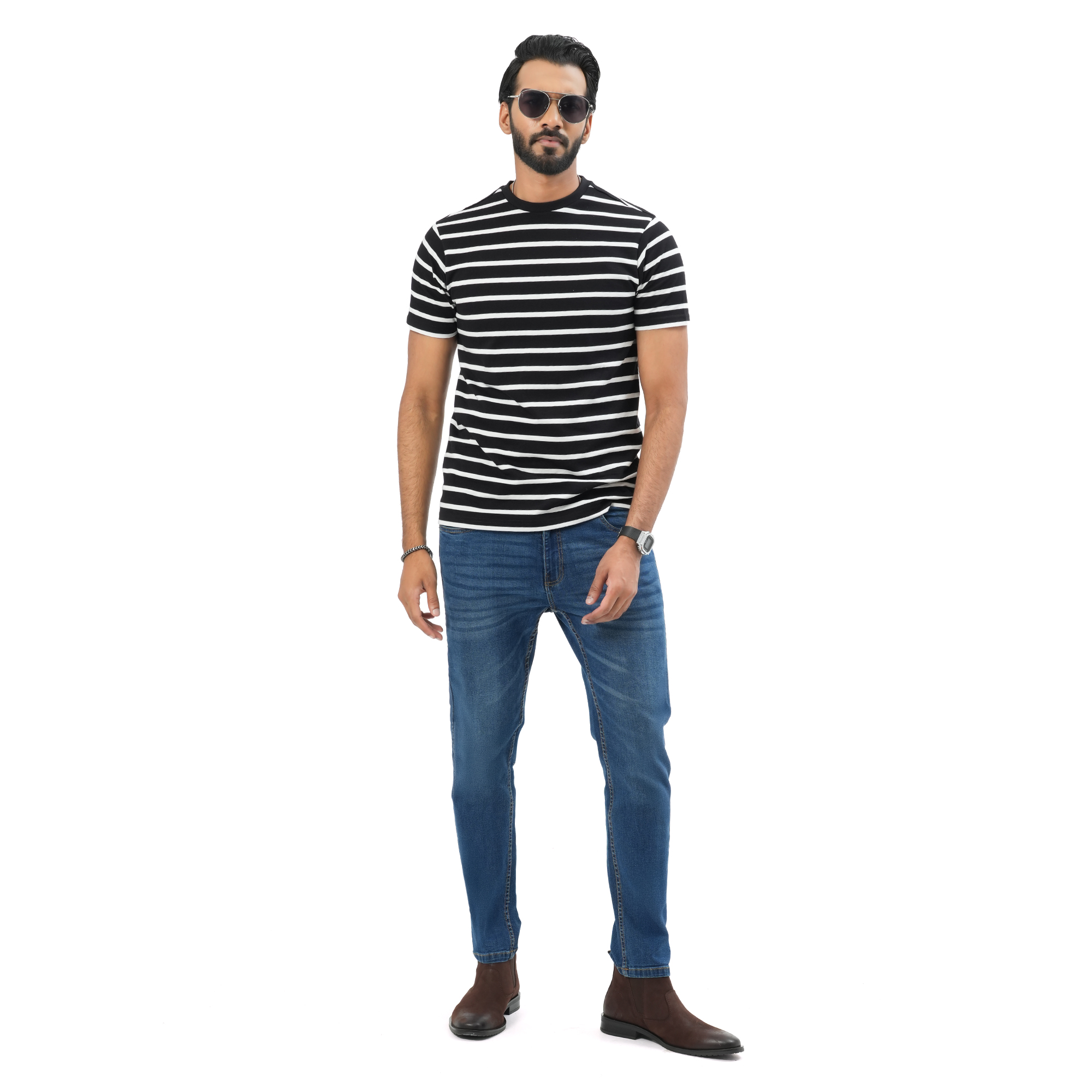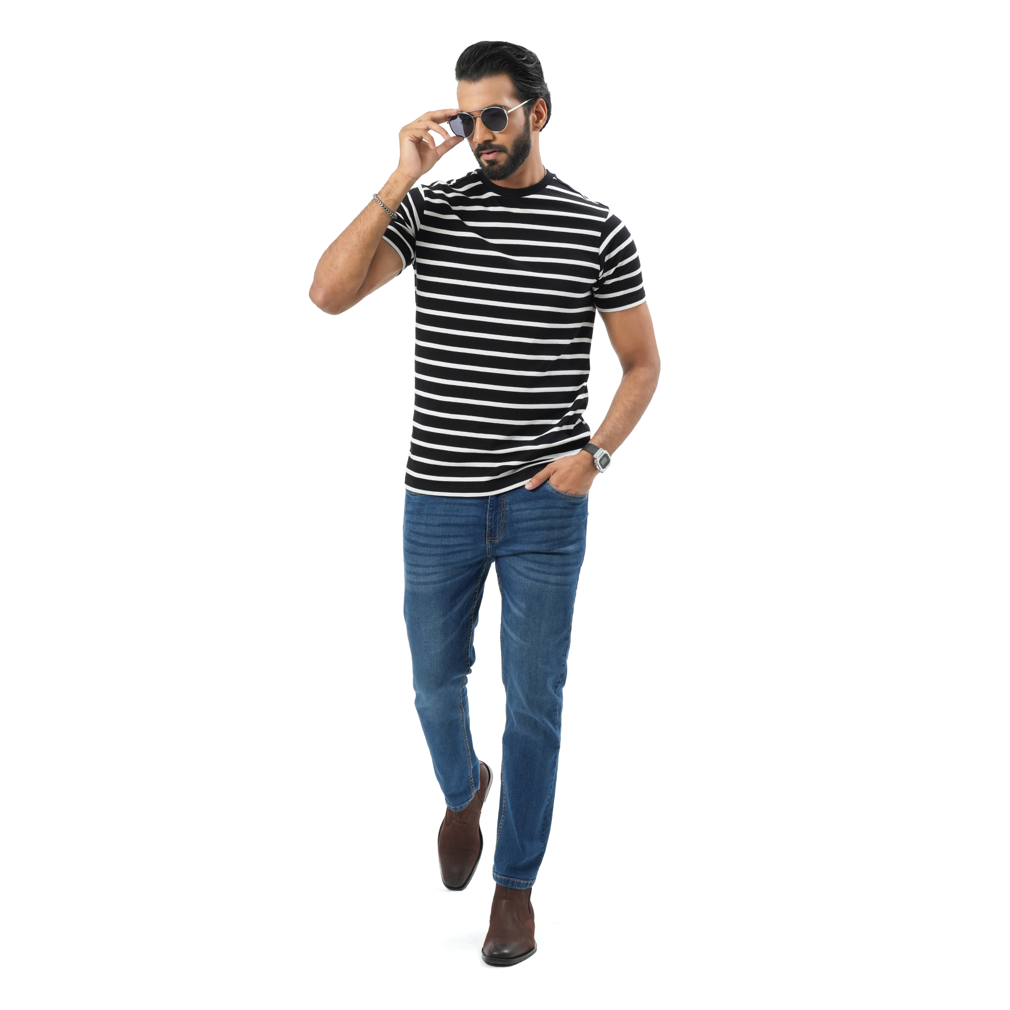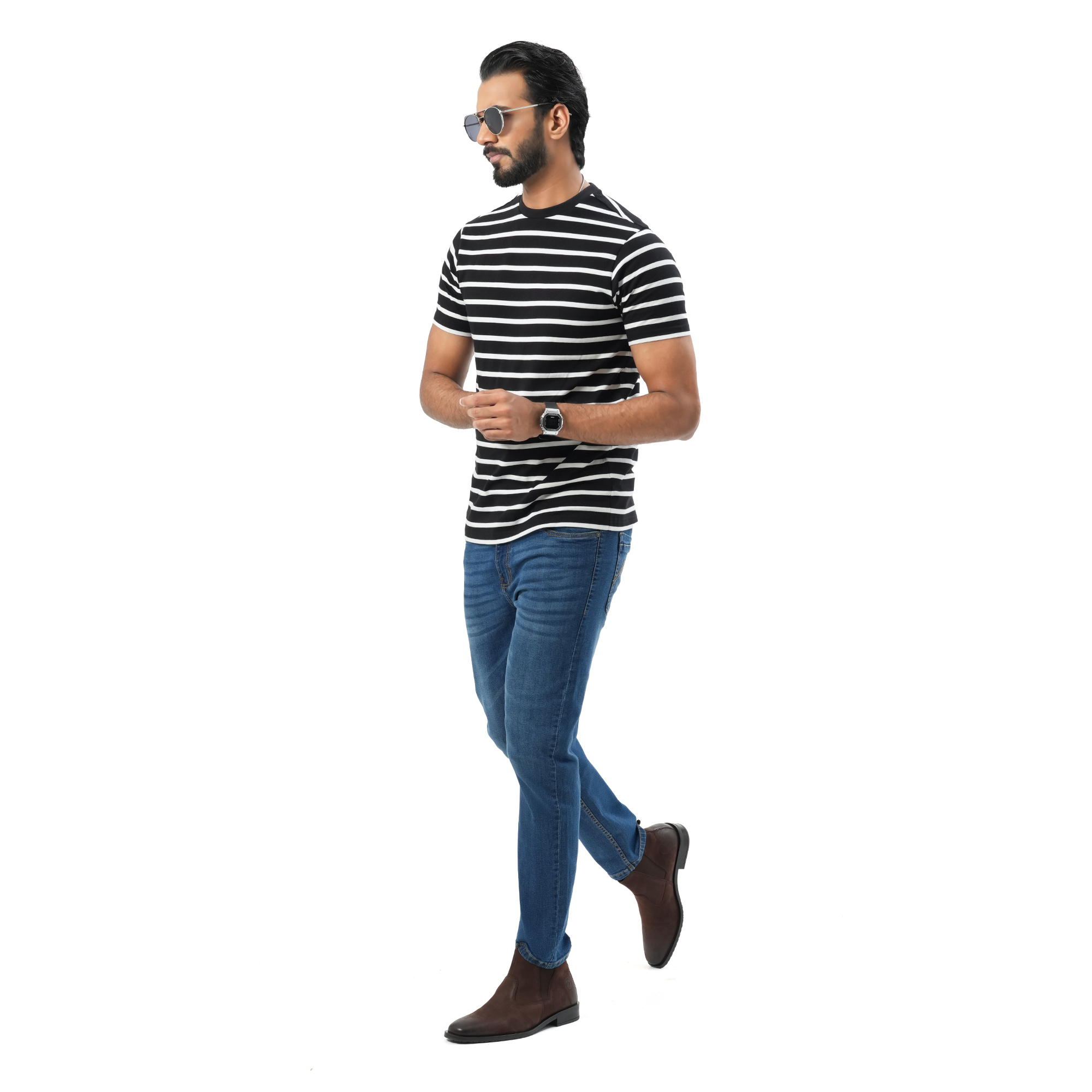 A timeless striped design meets everyday comfort in this men’s black t-shirt. Made from soft, breathable fabric, it delivers a lightweight feel that keeps you comfortable throughout the day. The clean black and white stripe pattern adds a sharp, modern touch, making it easy to style for casual outings or relaxed weekends. Pair it with jeans or chinos for a simple yet confident look.