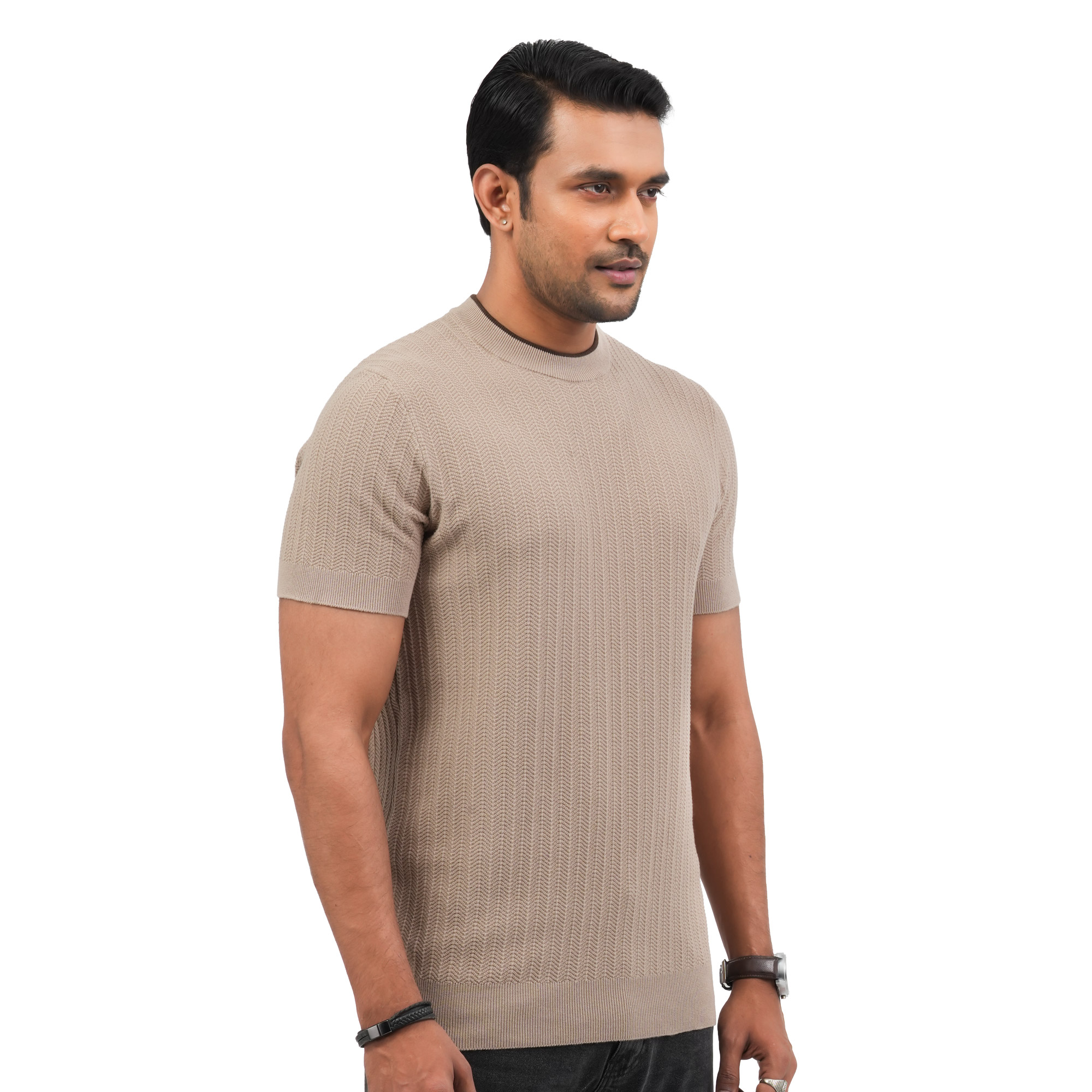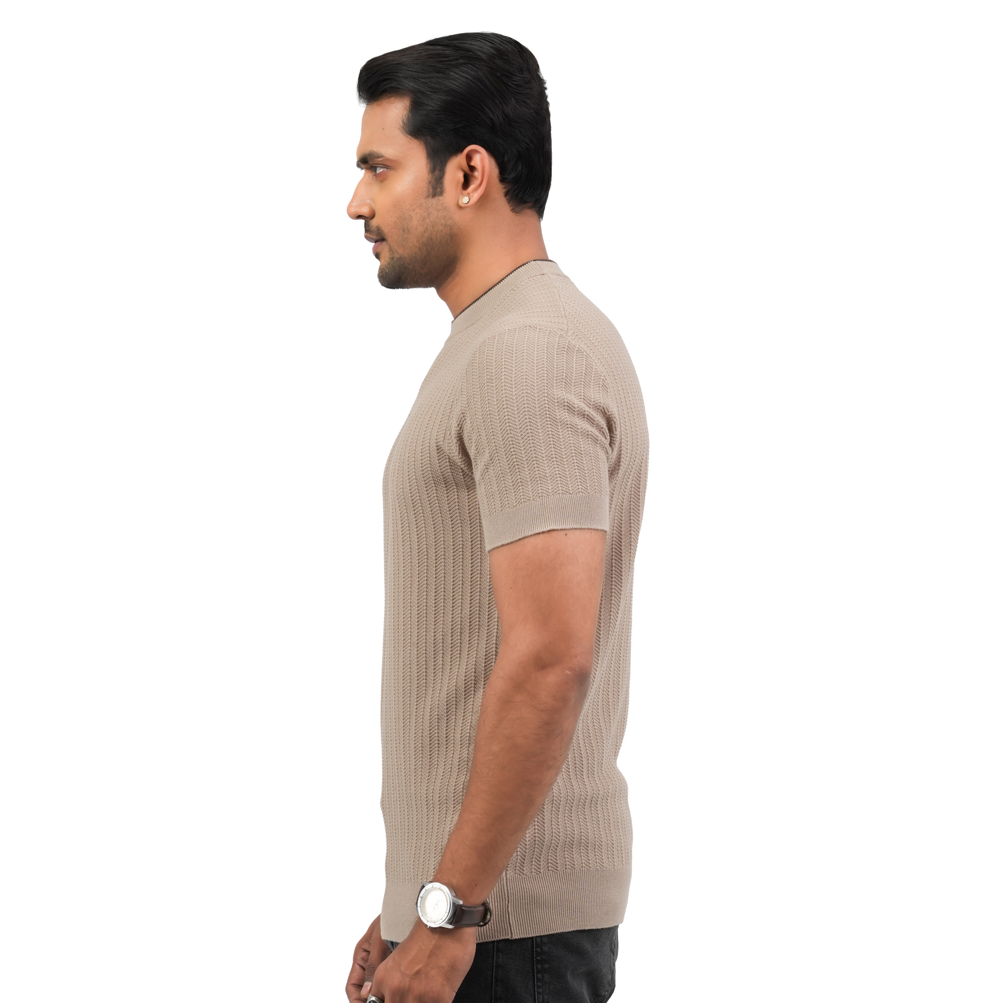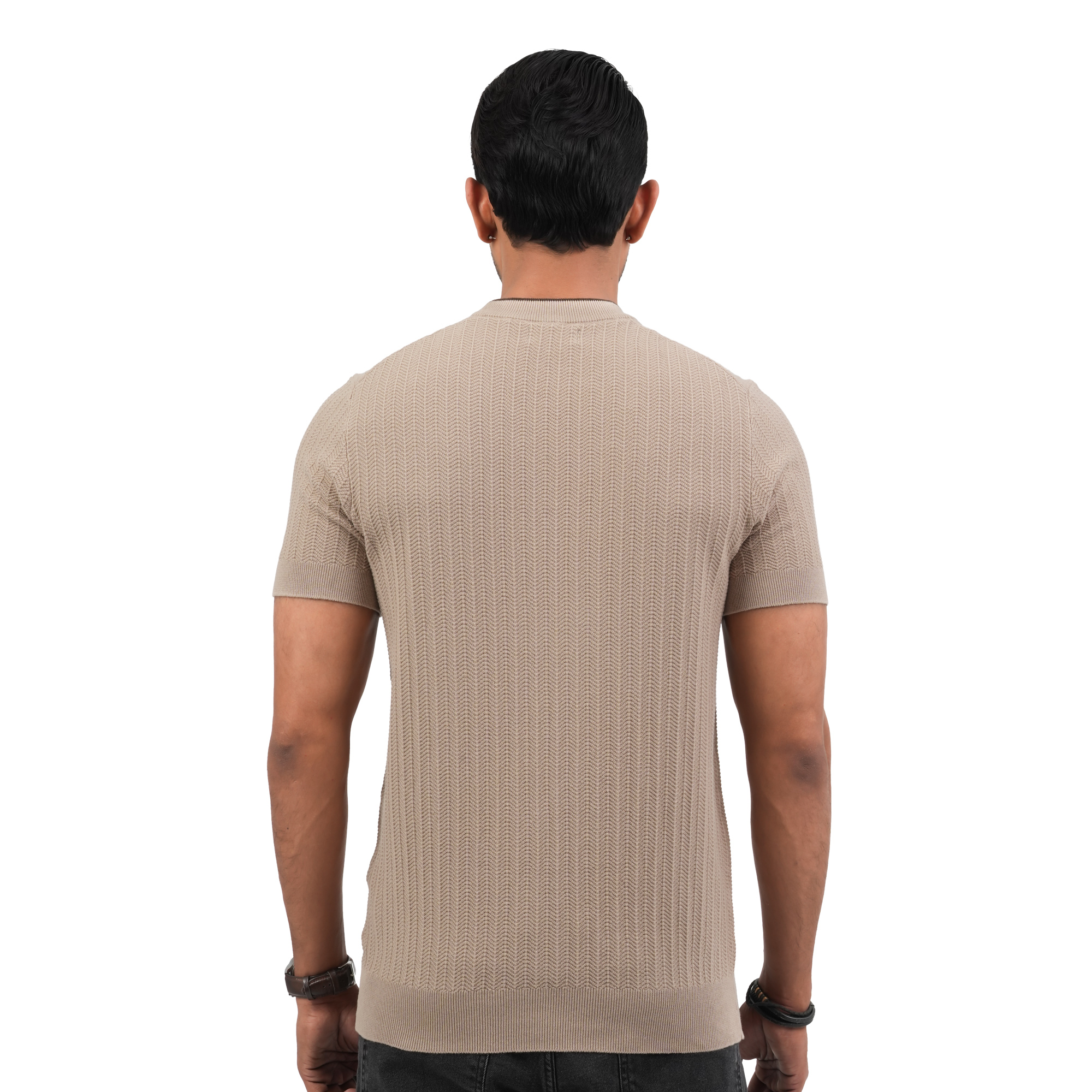 Designed for modern minimal style, this Maverick men’s beige t-shirt offers a refined and versatile look for everyday wear. Crafted from premium breathable fabric, it provides a soft touch and all-day comfort. The subtle textured pattern enhances its premium appeal, while the smart fit silhouette ensures a clean and polished appearance. Ideal for casual outings or relaxed smart-casual styling this piece blends comfort with understated elegance.
