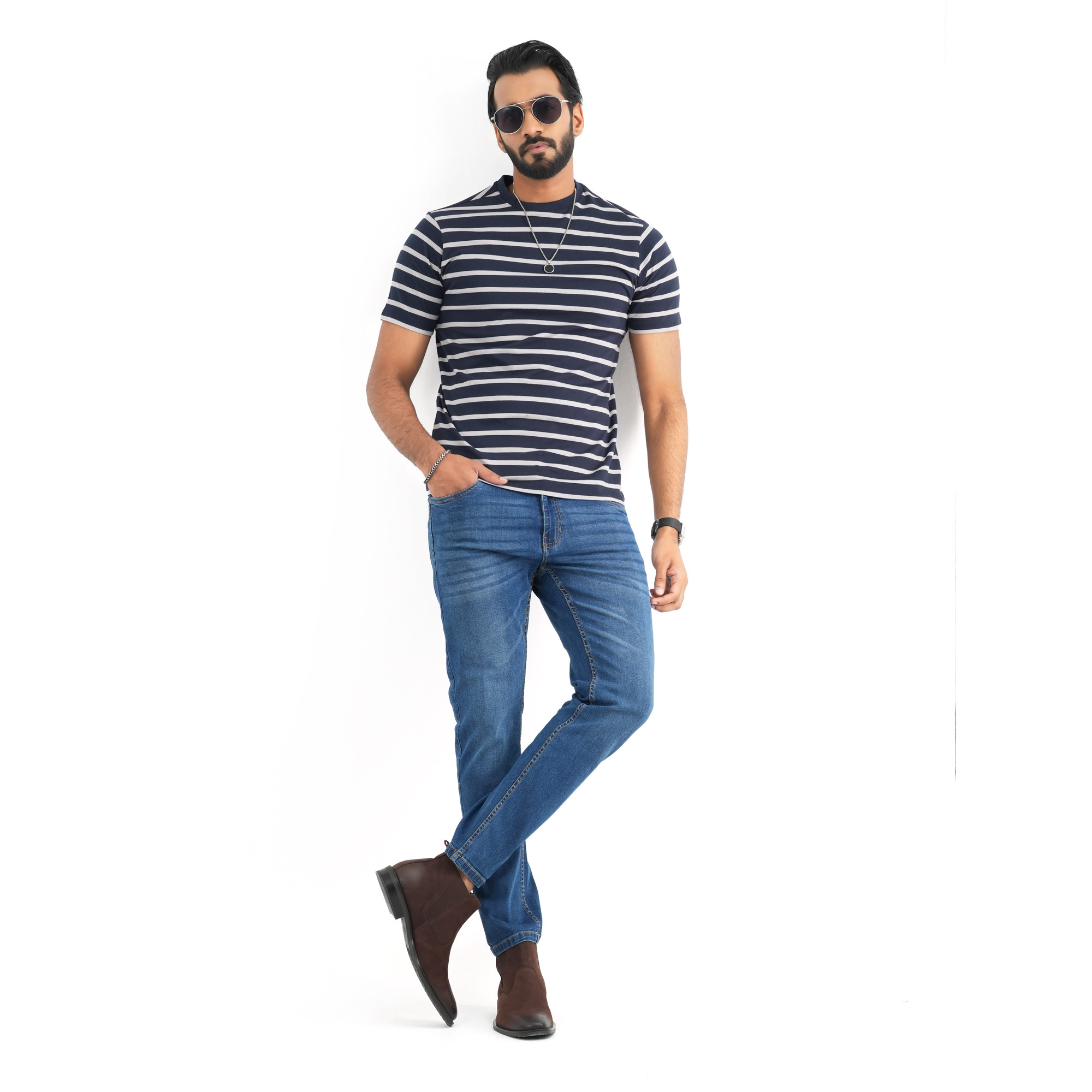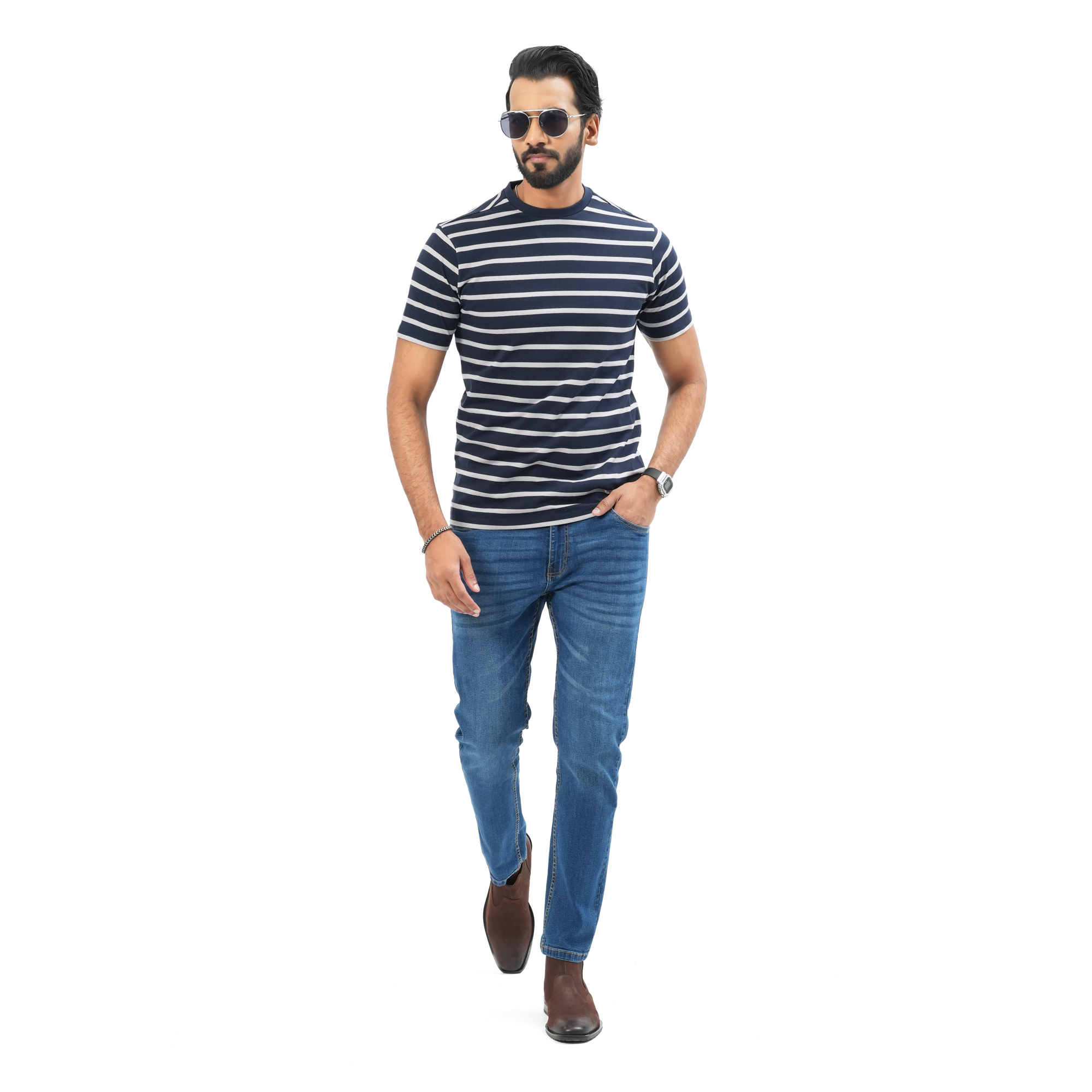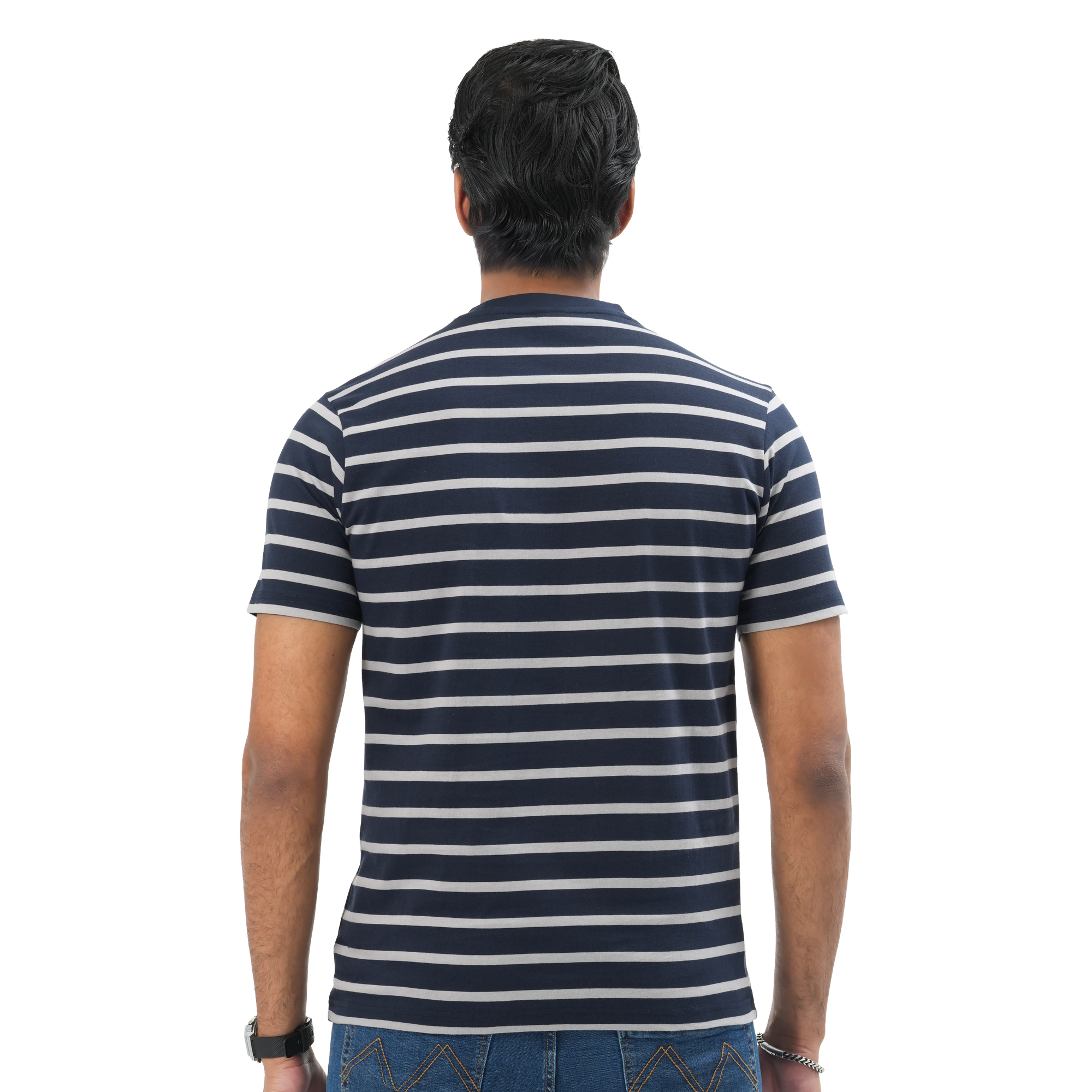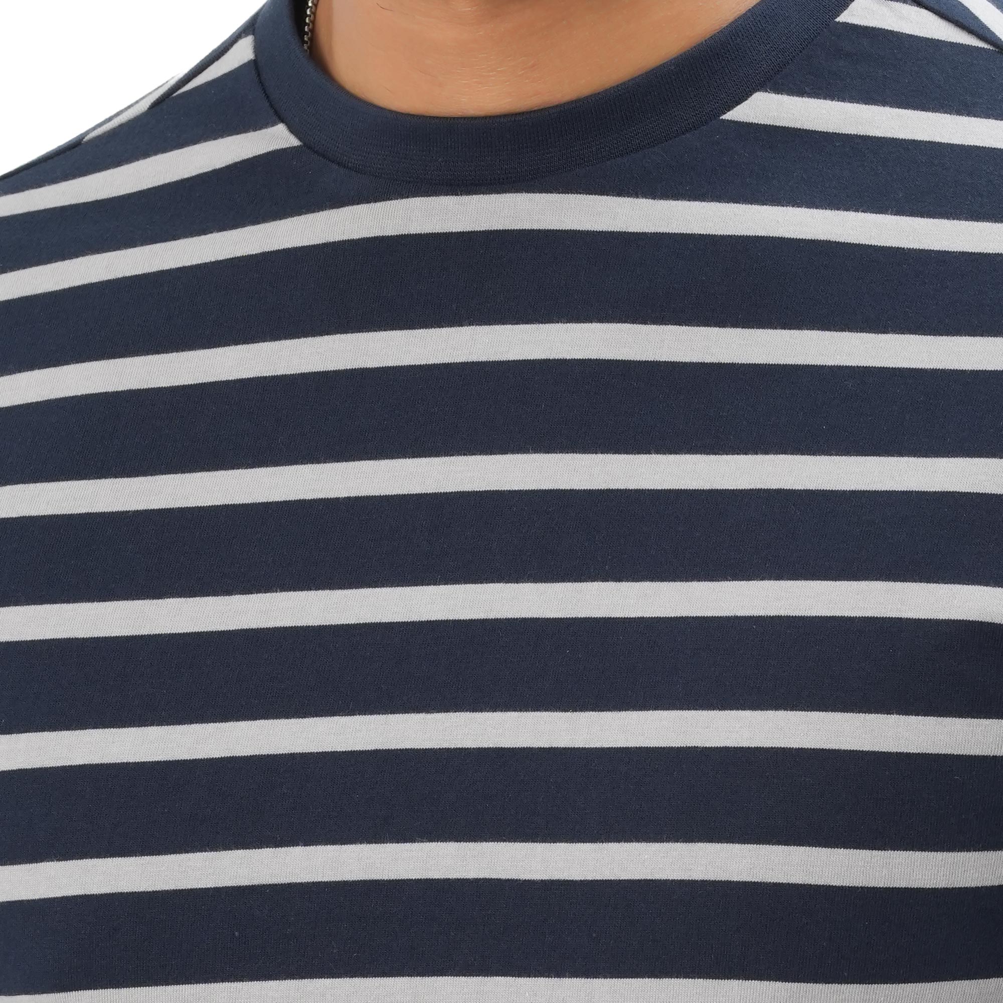A perfect blend of comfort and modern style, this Maverick men’s striped t-shirt is designed for everyday wear. Crafted from soft, breathable fabric, it keeps you cool and comfortable throughout the day. The navy blue base with clean white stripes offers a sharp, versatile look that pairs effortlessly with jeans or casual trousers. Ideal for both relaxed outings and daily wear.