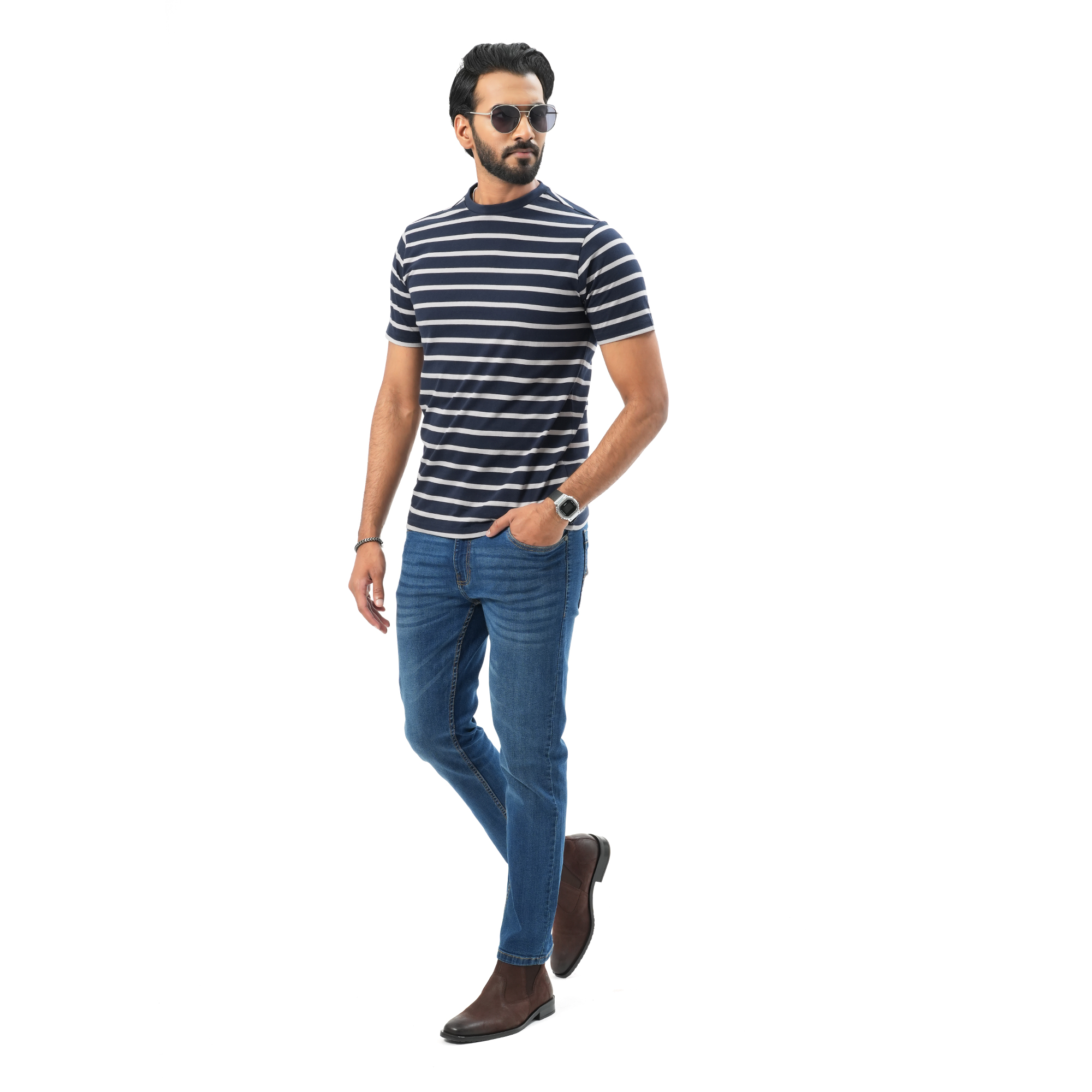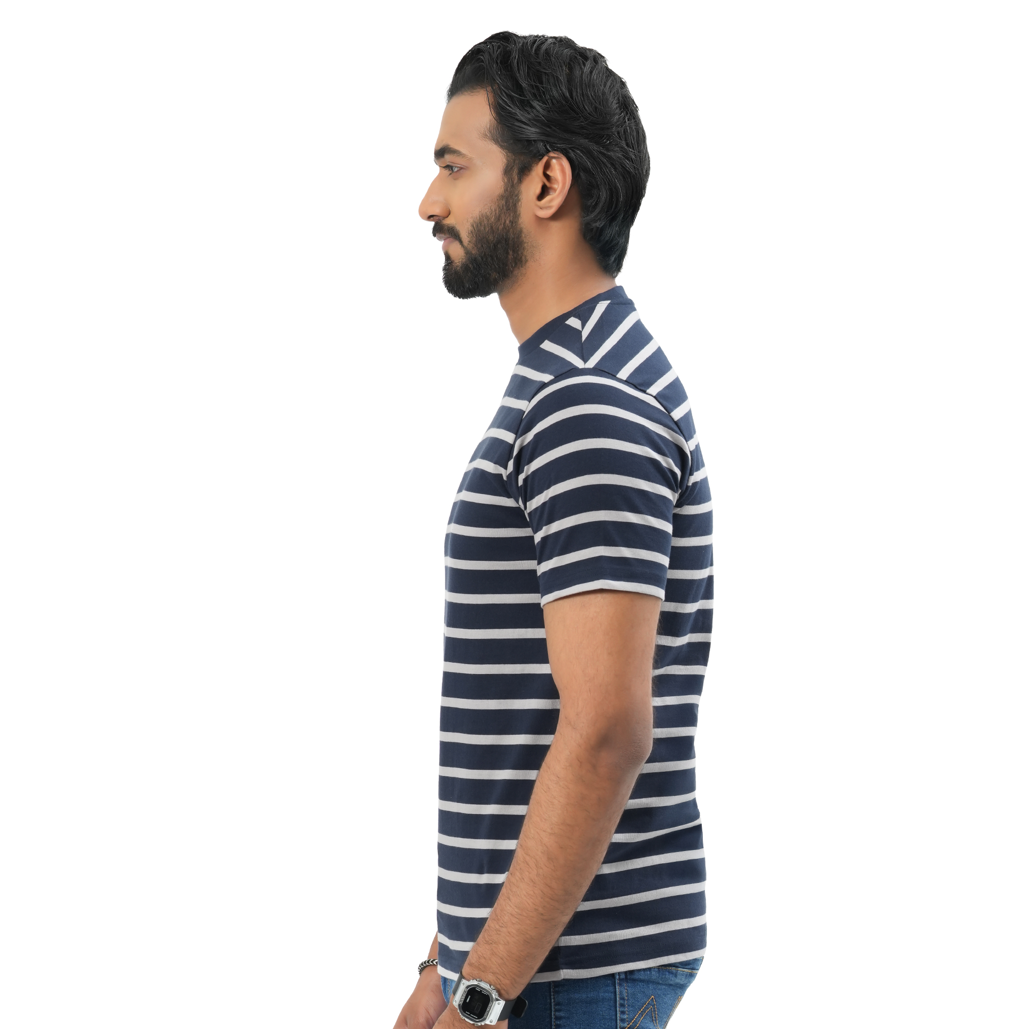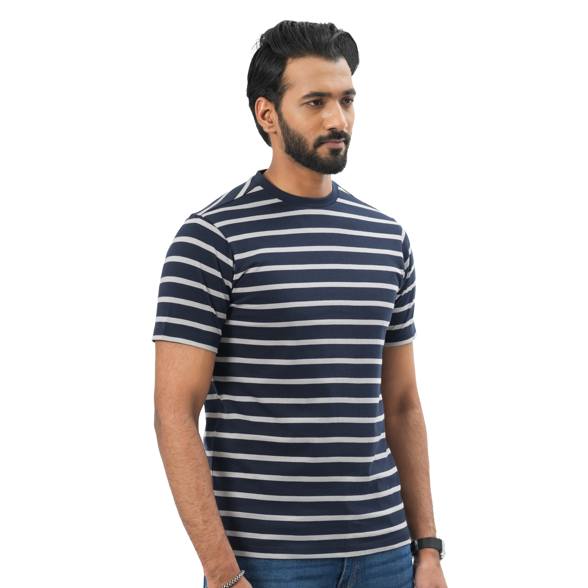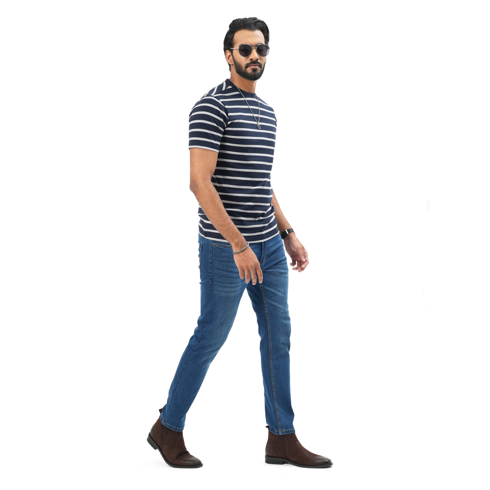 A perfect blend of comfort and modern style, this Maverick men’s striped t-shirt is designed for everyday wear. Crafted from soft, breathable fabric, it keeps you cool and comfortable throughout the day. The navy blue base with clean white stripes offers a sharp, versatile look that pairs effortlessly with jeans or casual trousers. Ideal for both relaxed outings and daily wear.