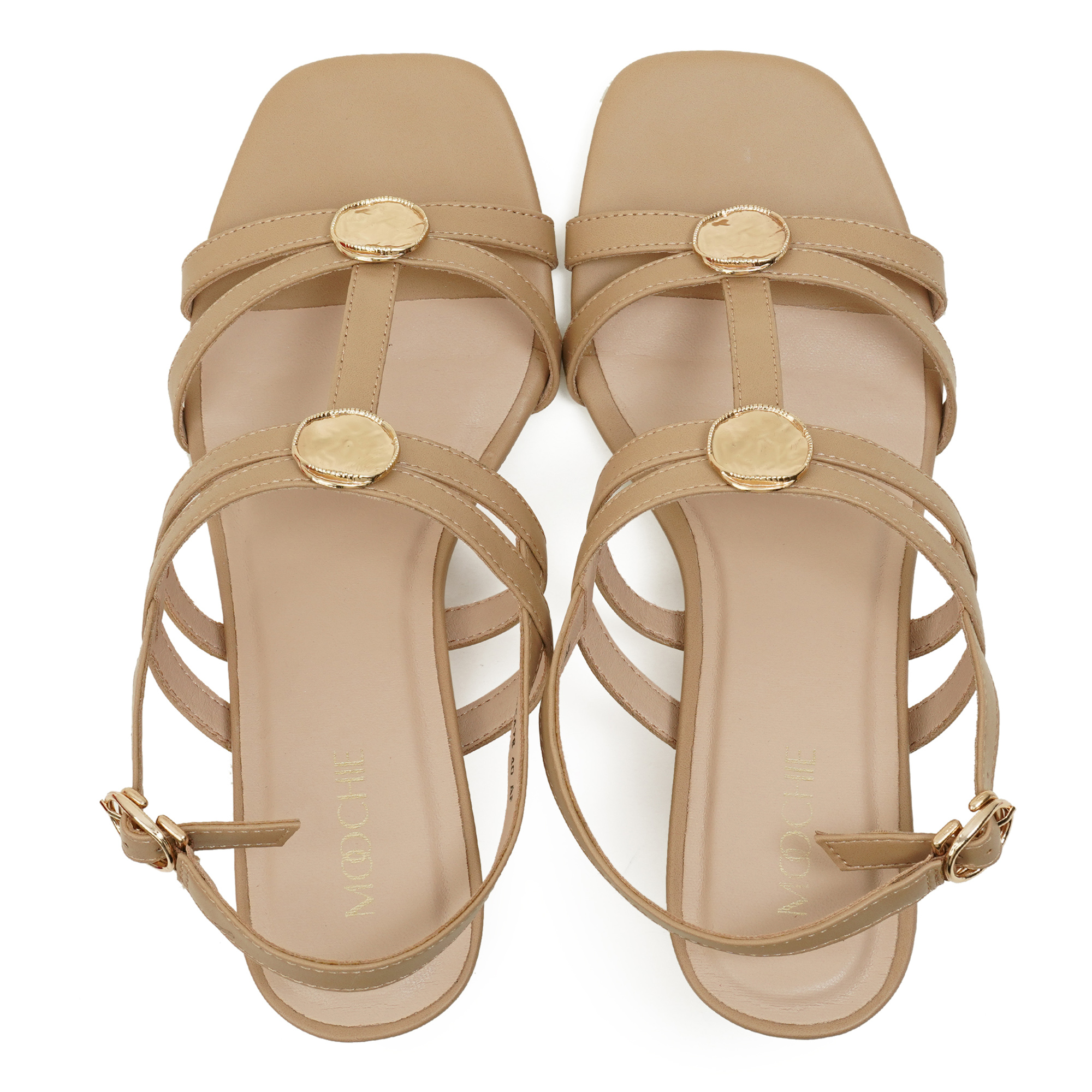 Slip into understated glamour. Five minimalist straps in creamy beige PU embrace the foot, while gleaming gold coin medallions and buckles deliver luxe contrast. Perched on a walk-easy in block heel, the modern square toe elongates the leg without sacrificing comfort. From garden weddings to city dinners, these sandals turn neutral into noteworthy.