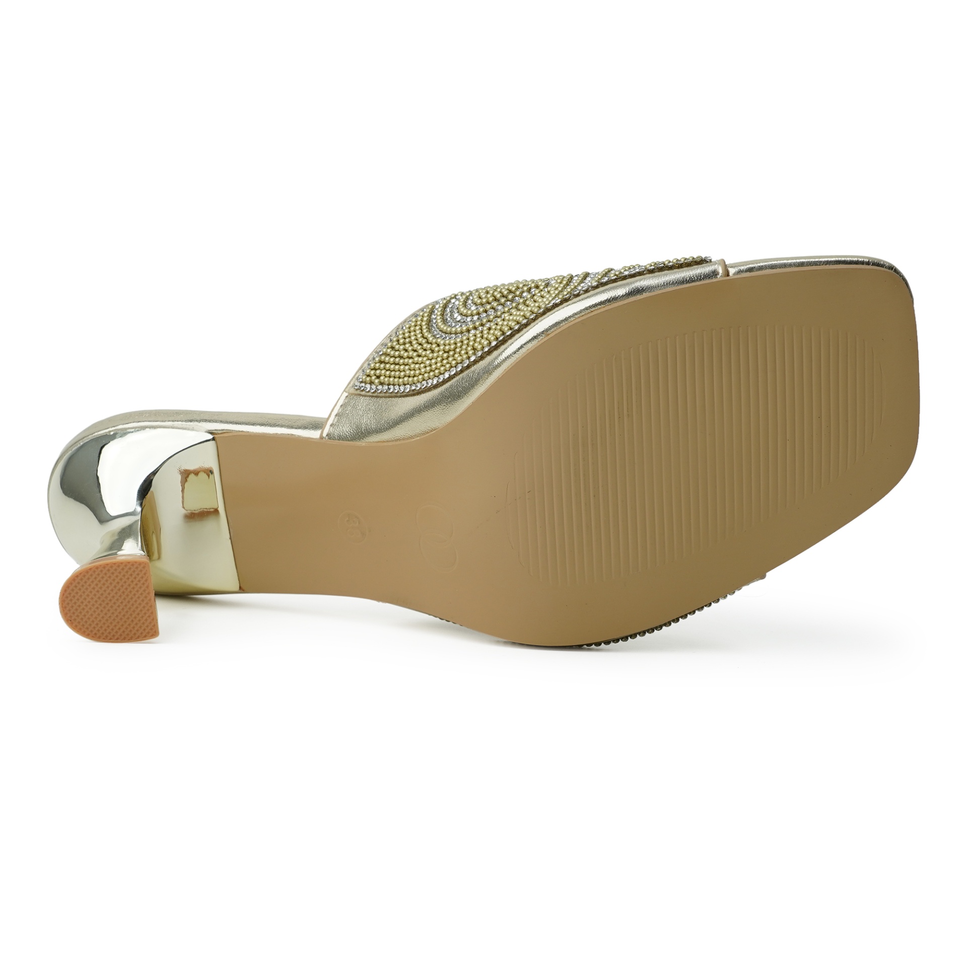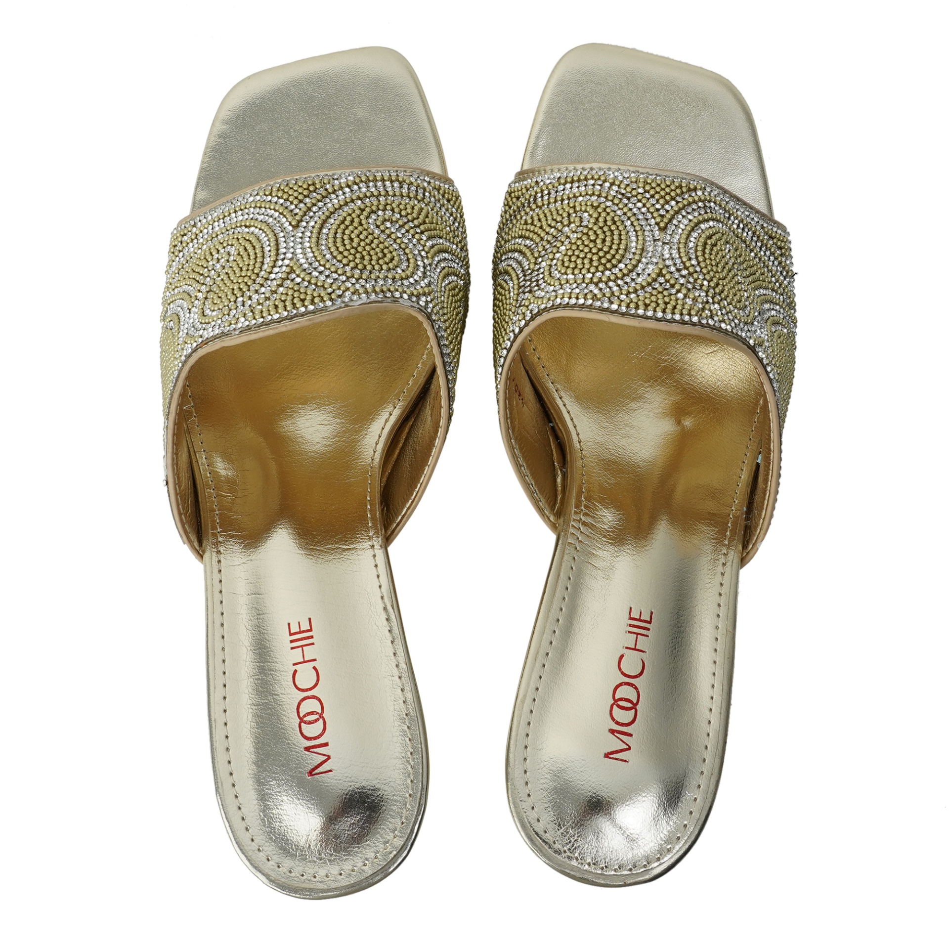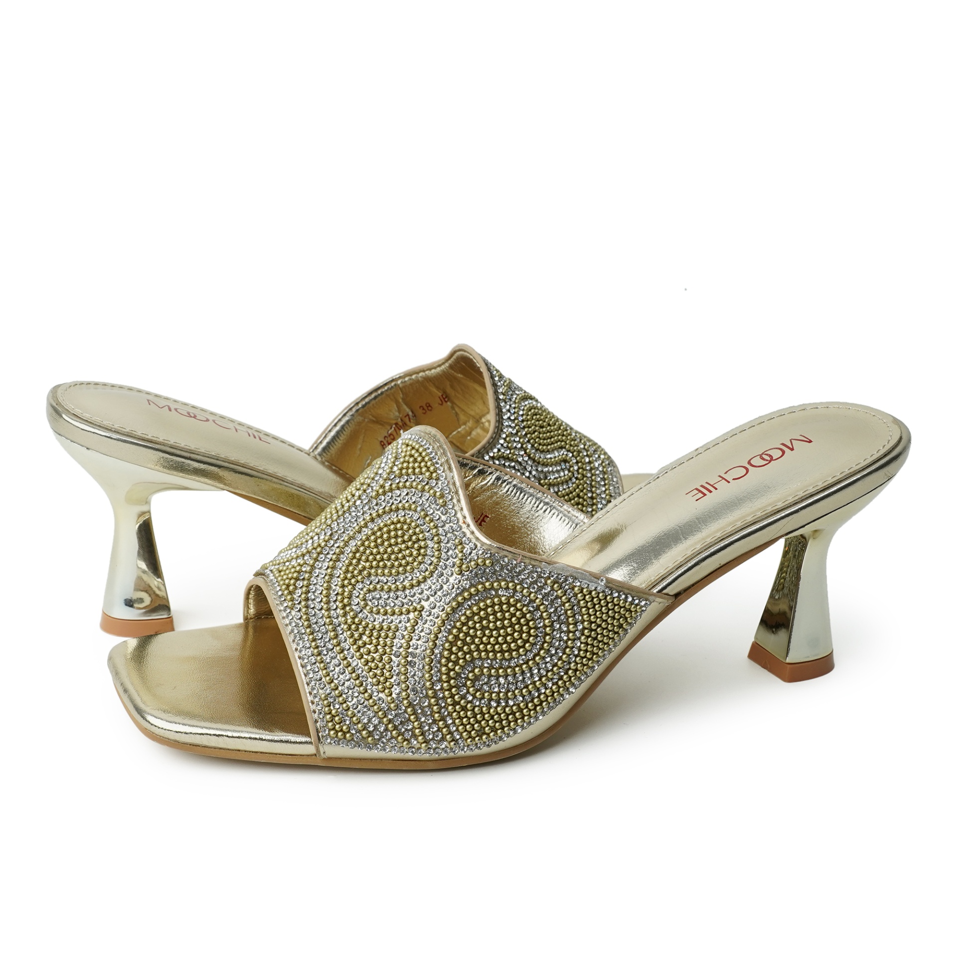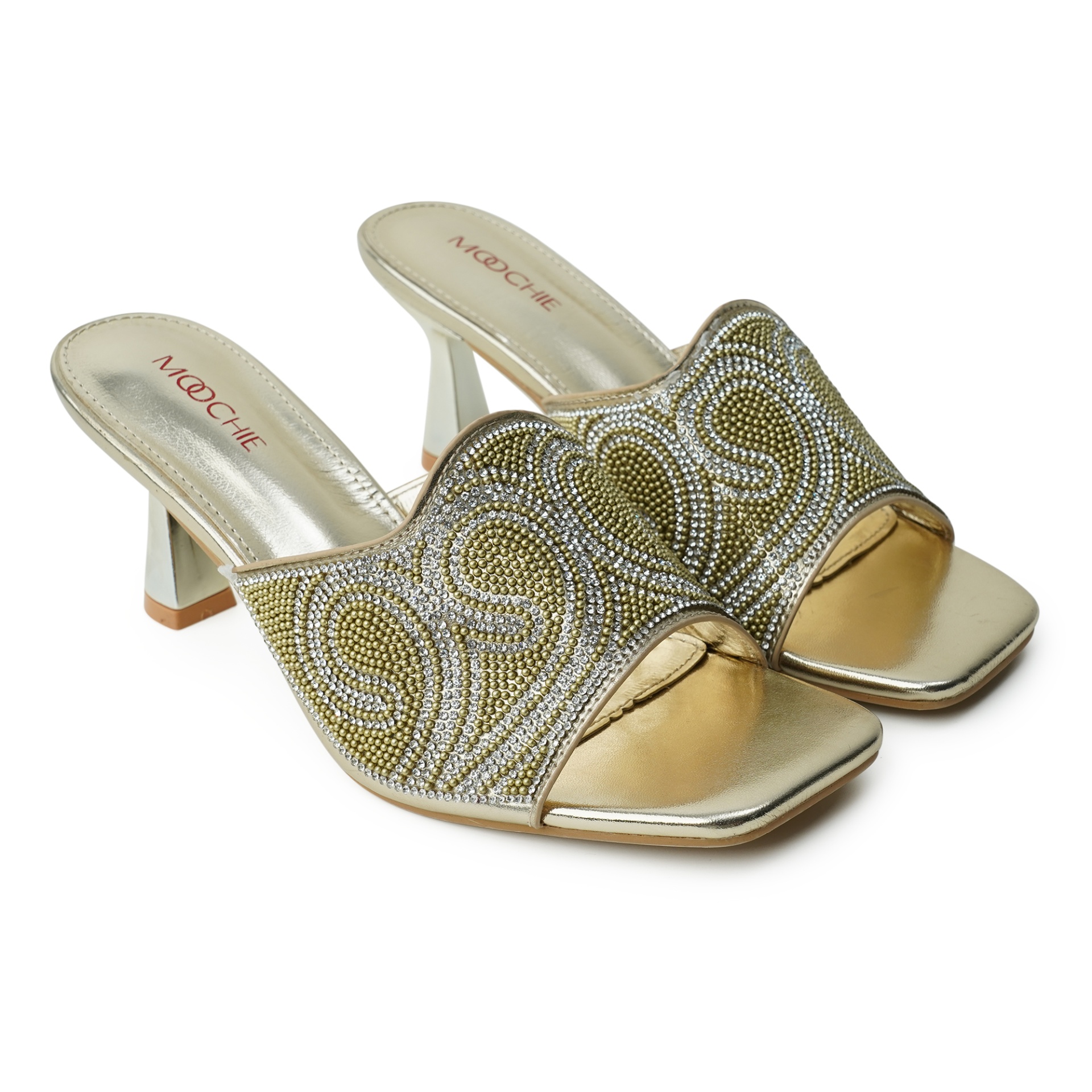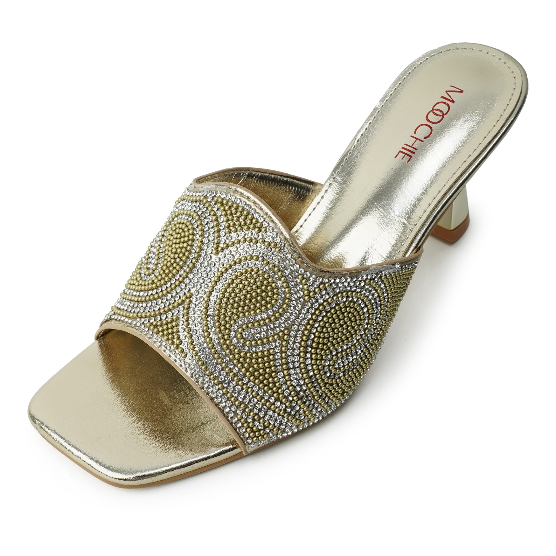 Make a statement with the Moochie Women’s High Heel in gold, a glamorous fusion of elegance and bold style. The PU upper is adorned with intricate stonework in a captivating pattern, radiating sophistication and luxury. Paired with a durable rubber sole and a perfectly balanced heel, this design ensures confident, polished wear—ideal for those who want to exude refinement, allure, and iconic, upscale charm at every occasion.