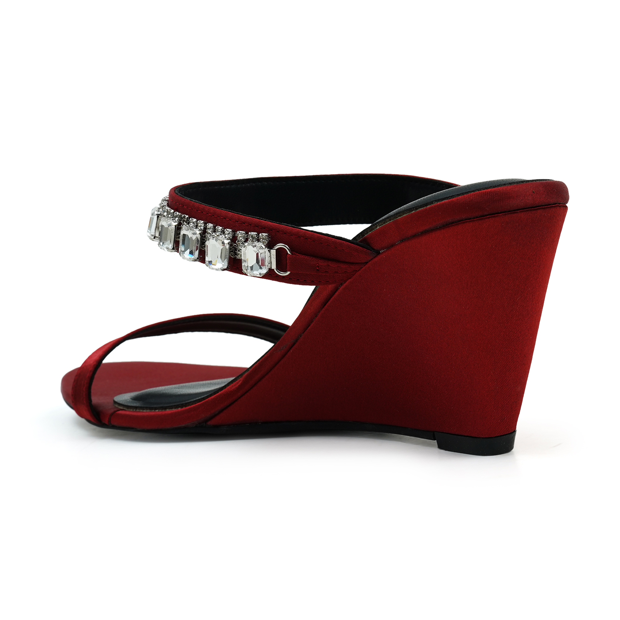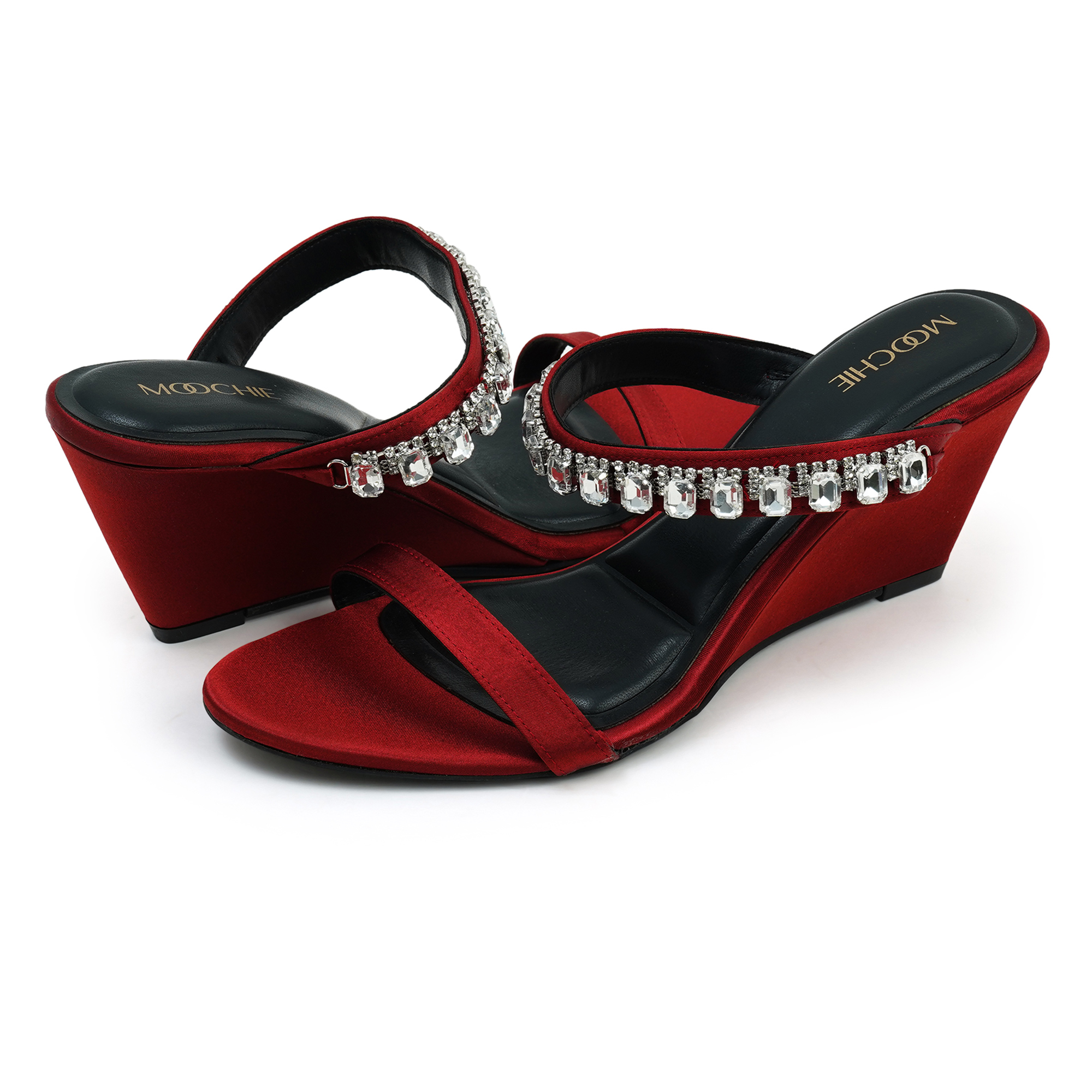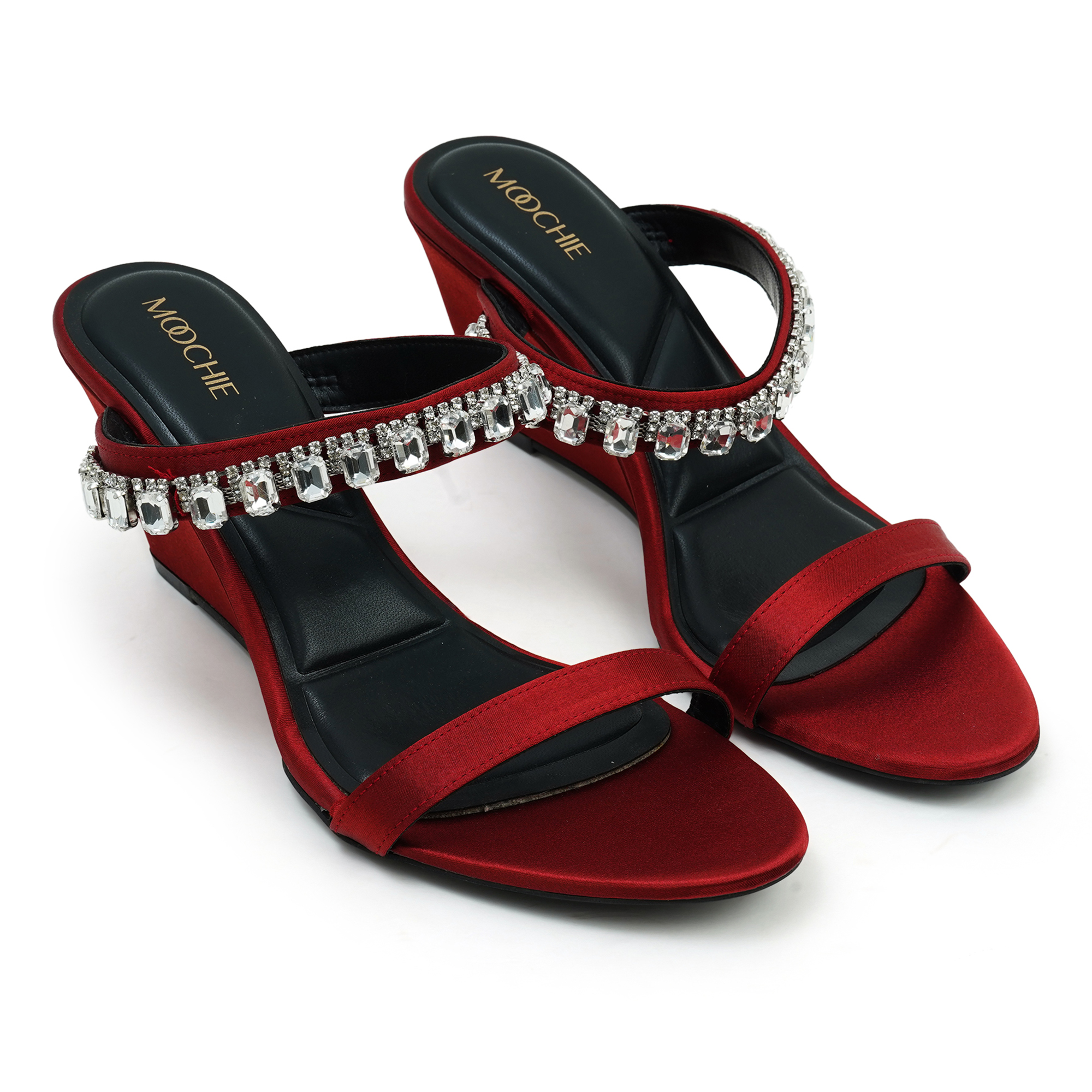 Turn every sidewalk into a red carpet. The Moochie Ruby Radiance Heels wrap your foot in liquid-smooth maroon PU and finish it with a row of sparkling crystal drops. A sky-high yet stable wedge keeps you comfortable while you collect compliments.