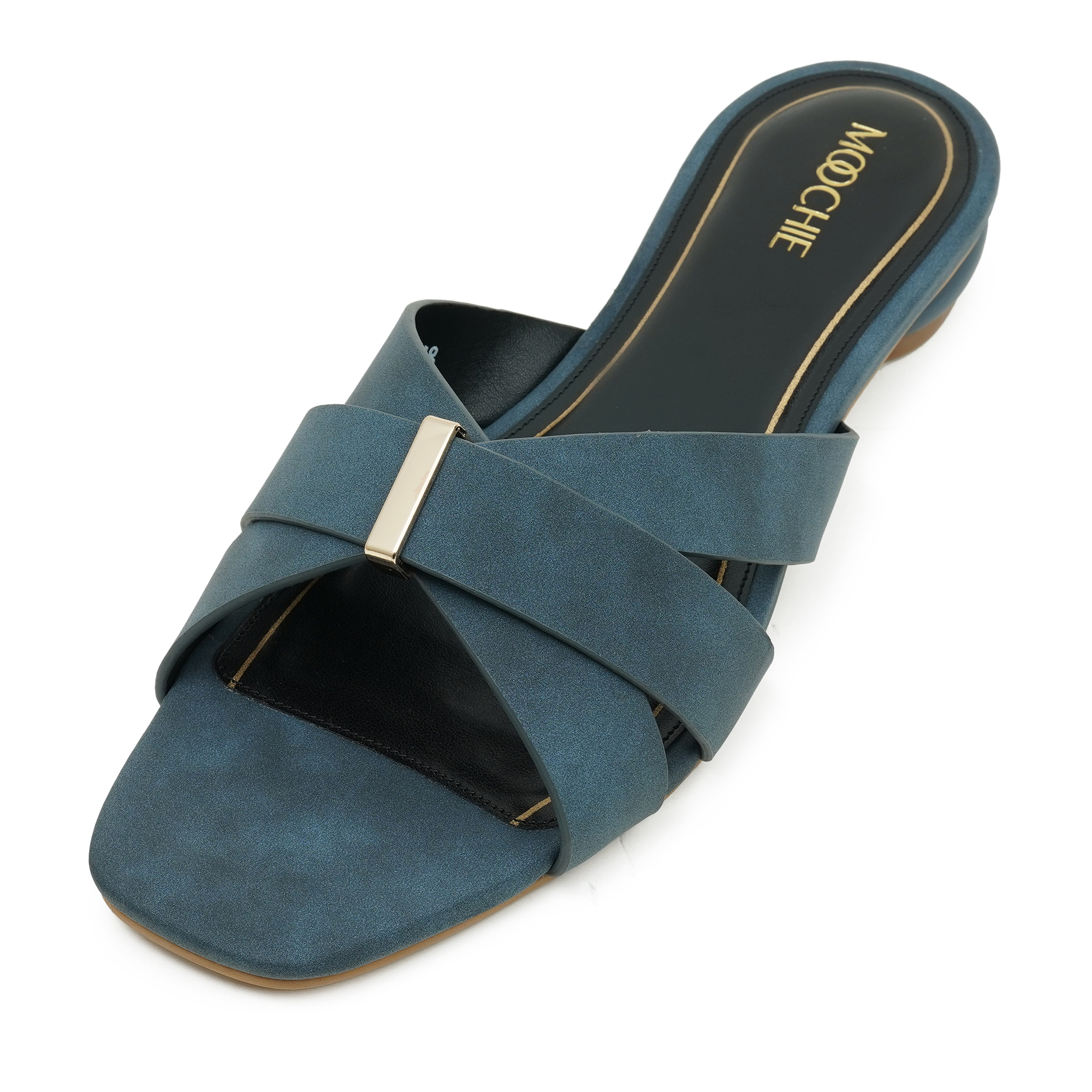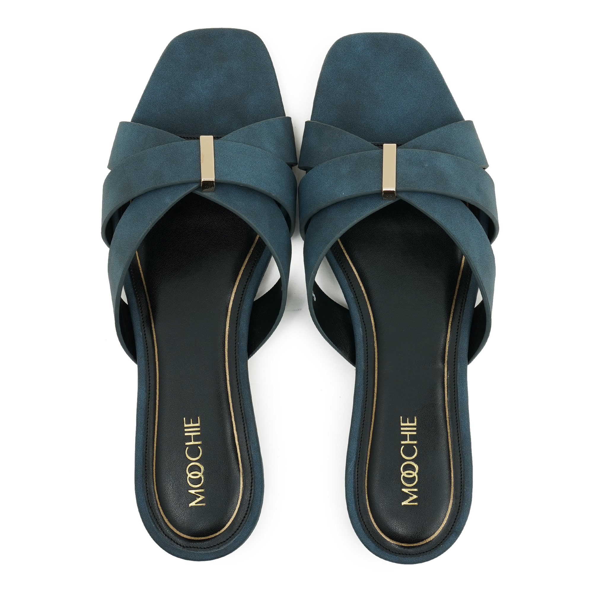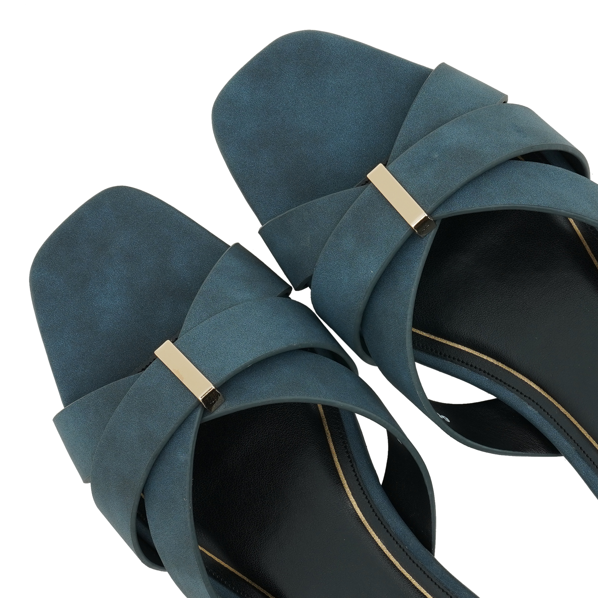 Understated glamour meets effortless wearability. Two velvety micro-suede straps cross elegantly over the foot, secured by a minimalist gold bar that adds a pop of shine without the fuss of buckles. The modern square toe is balanced by a walk-easy mini flat heel, giving you just the right lift for brunch dates, office hours or evening plans. Inside, a cushioned black footbed framed in gold piping keeps every step plush and polished.