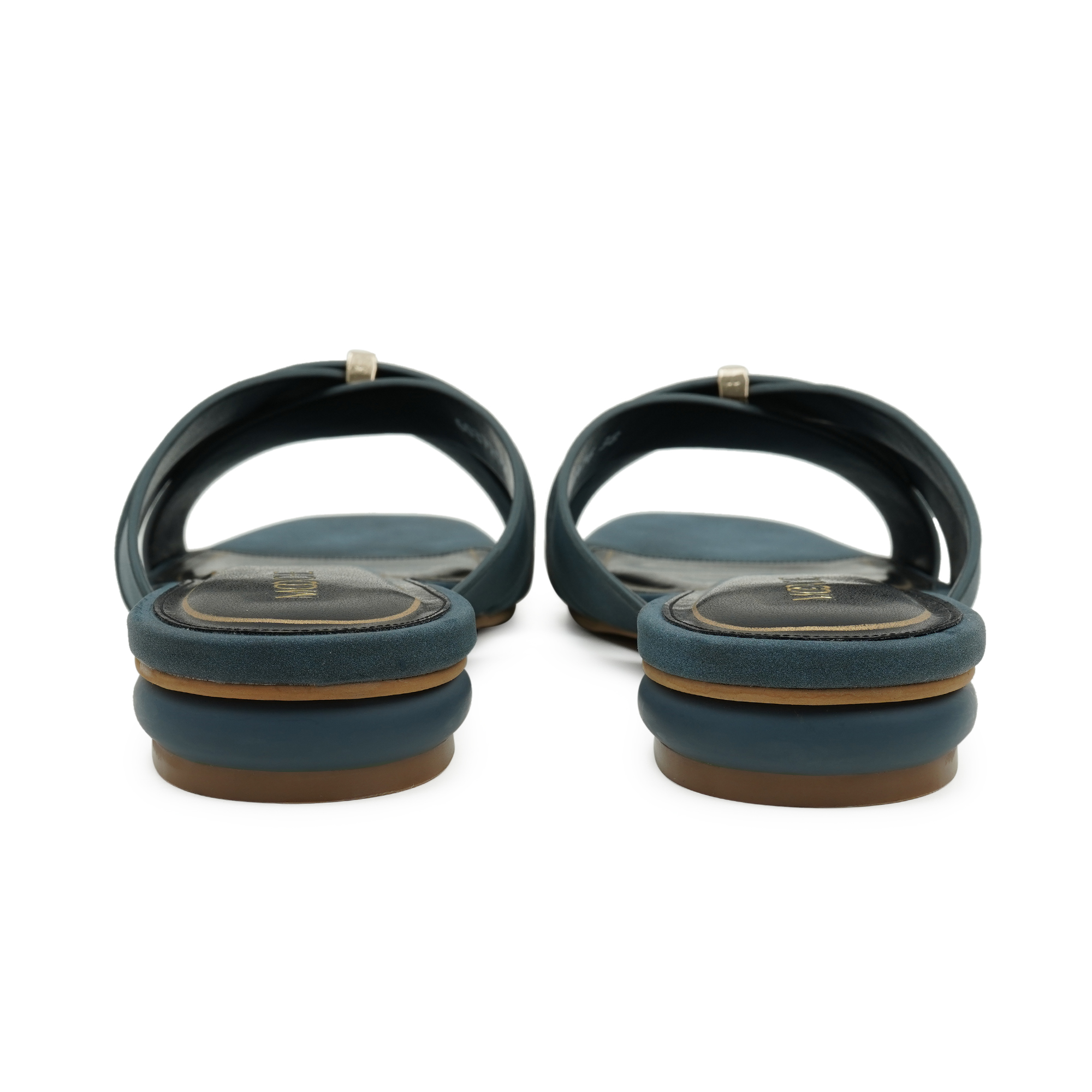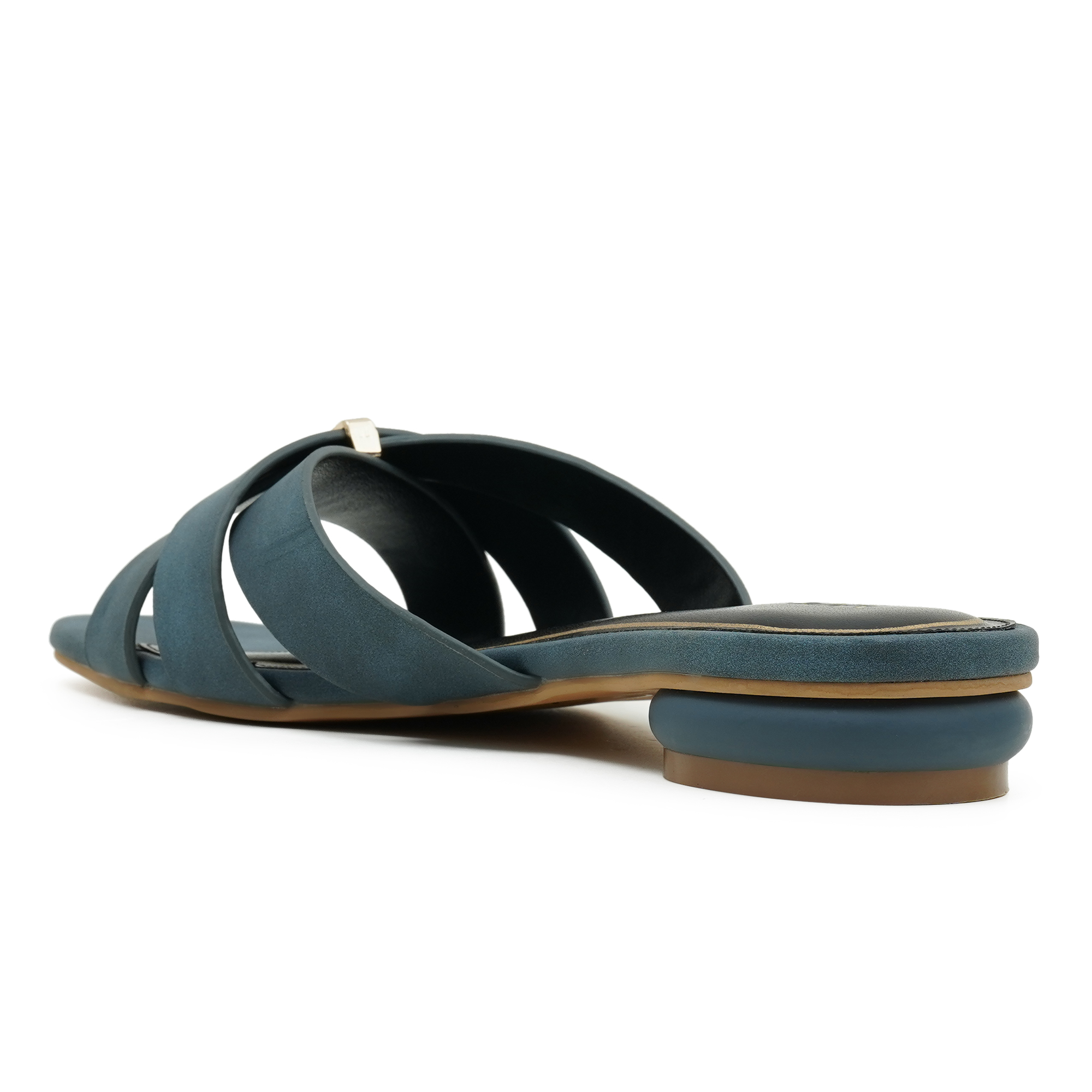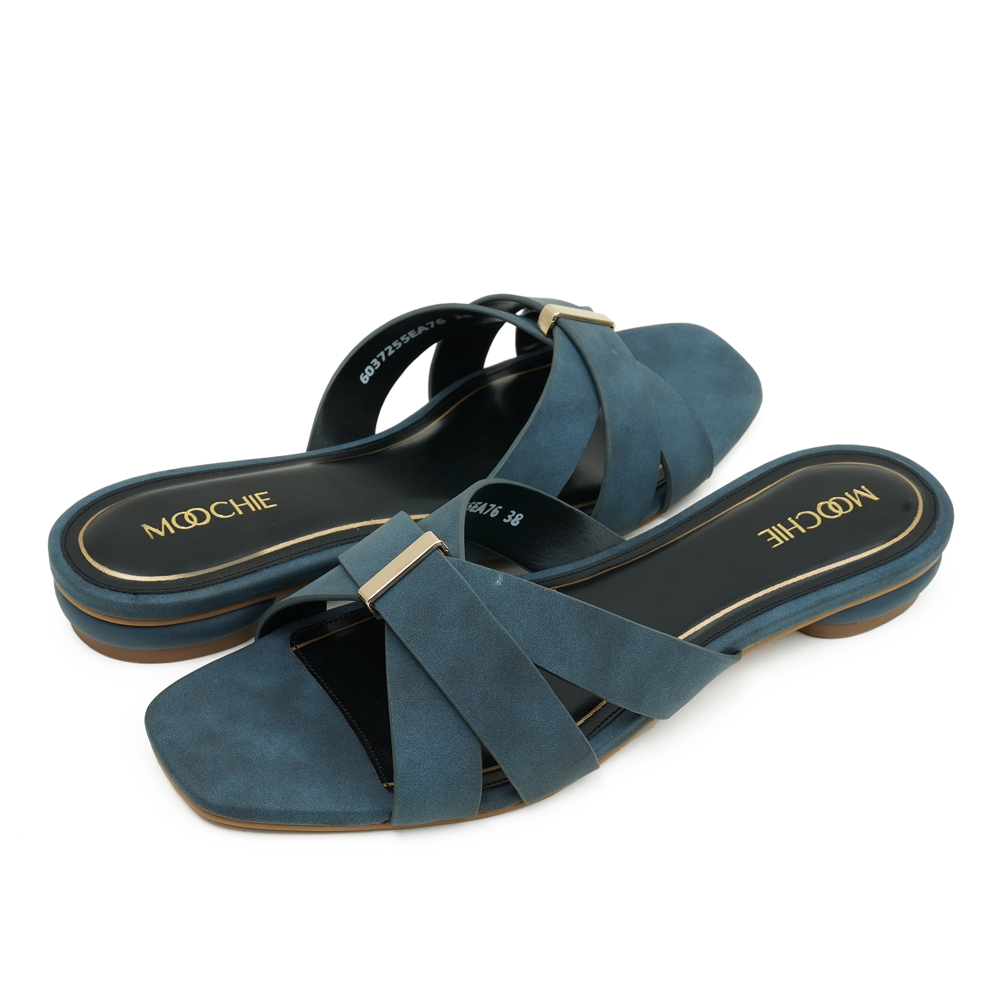 Understated glamour meets effortless wearability. Two velvety micro-suede straps cross elegantly over the foot, secured by a minimalist gold bar that adds a pop of shine without the fuss of buckles. The modern square toe is balanced by a walk-easy mini flat heel, giving you just the right lift for brunch dates, office hours or evening plans. Inside, a cushioned black footbed framed in gold piping keeps every step plush and polished.