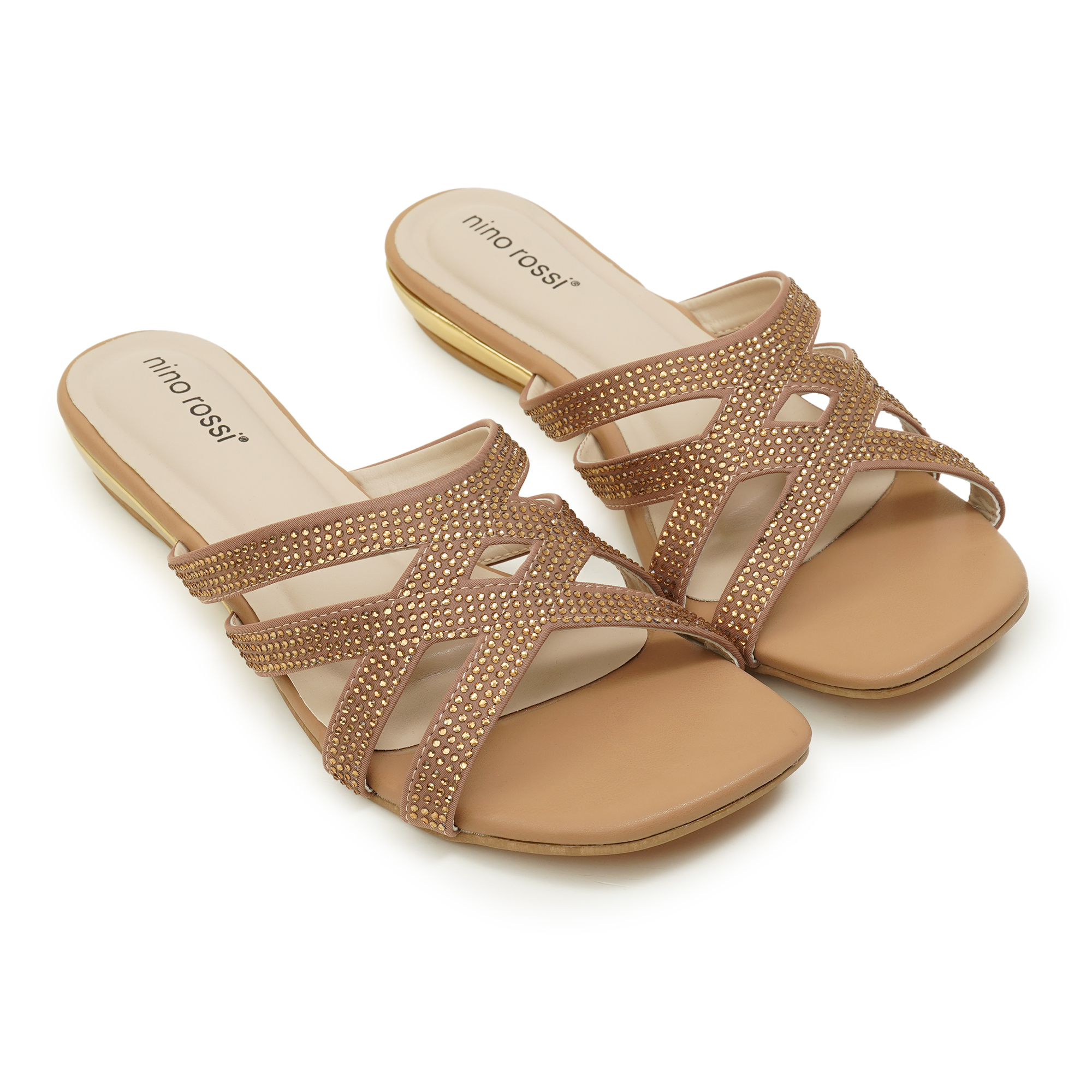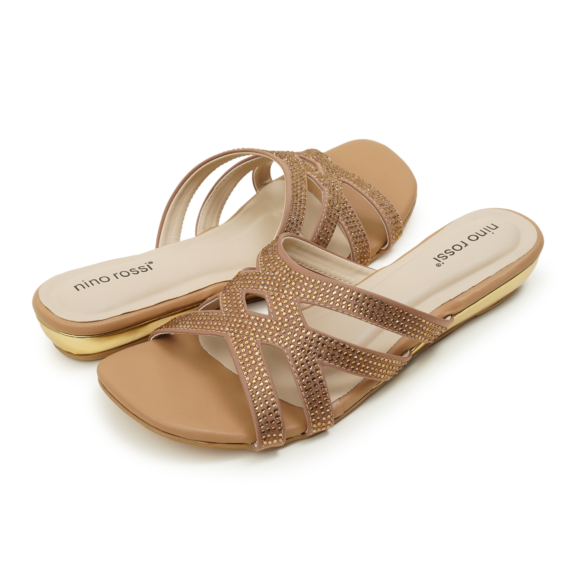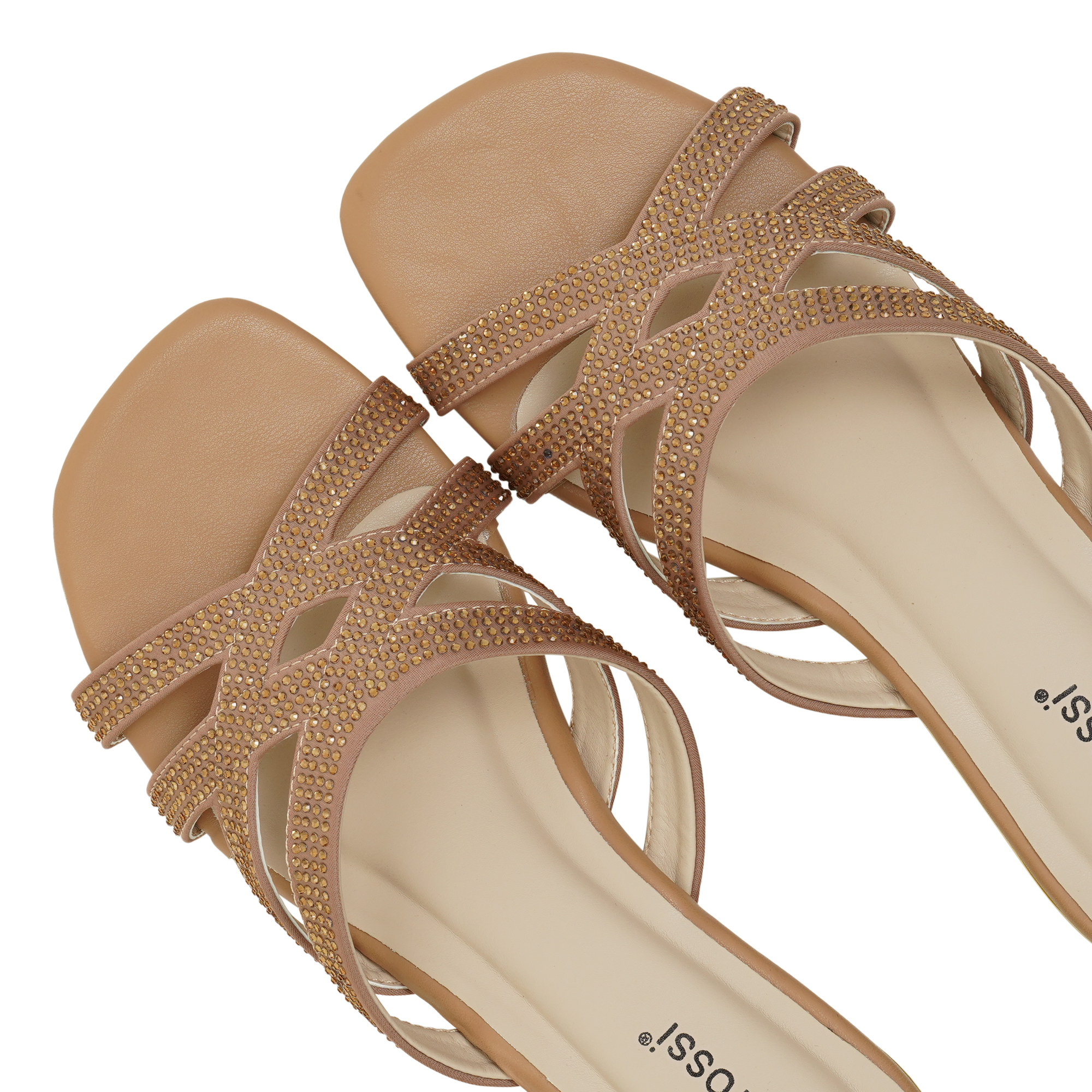 - Soft metallic gold PU with crystal-like embellishments on straps