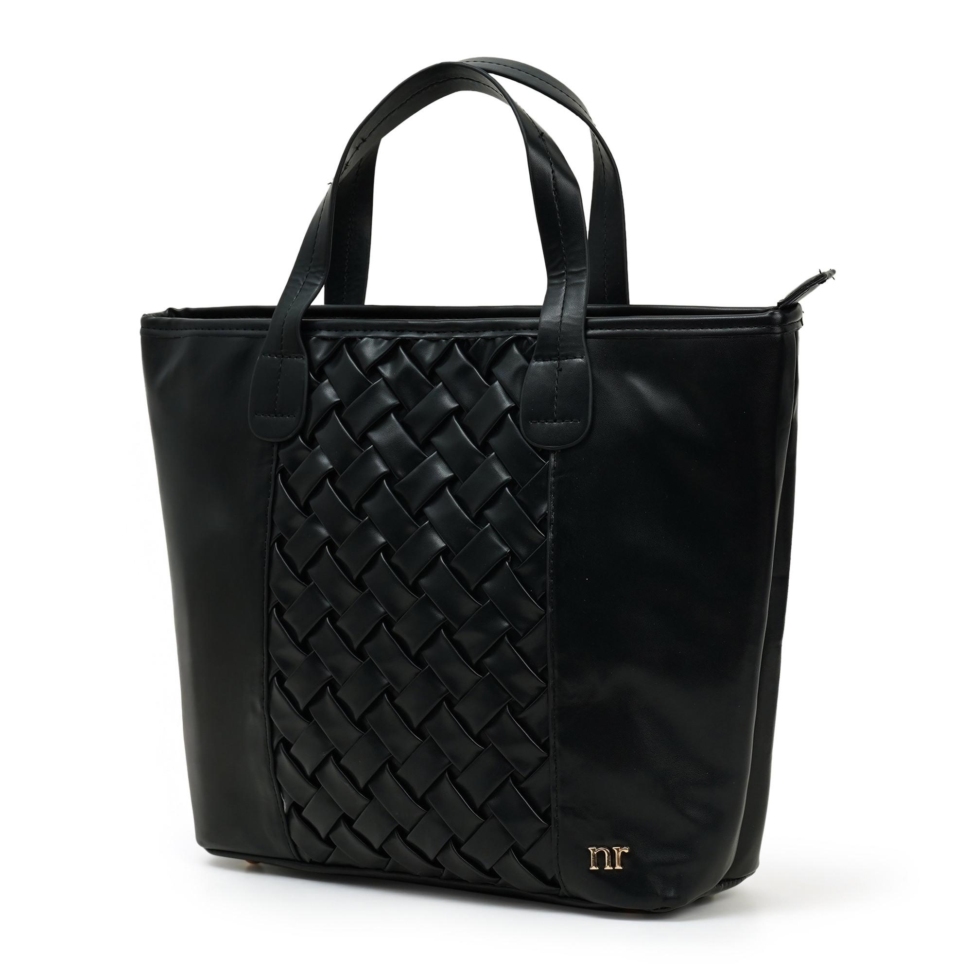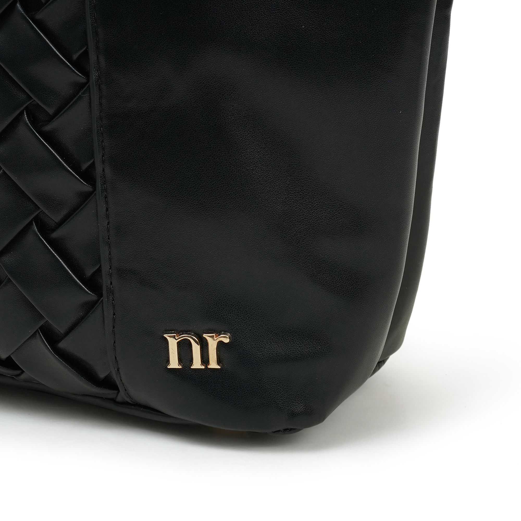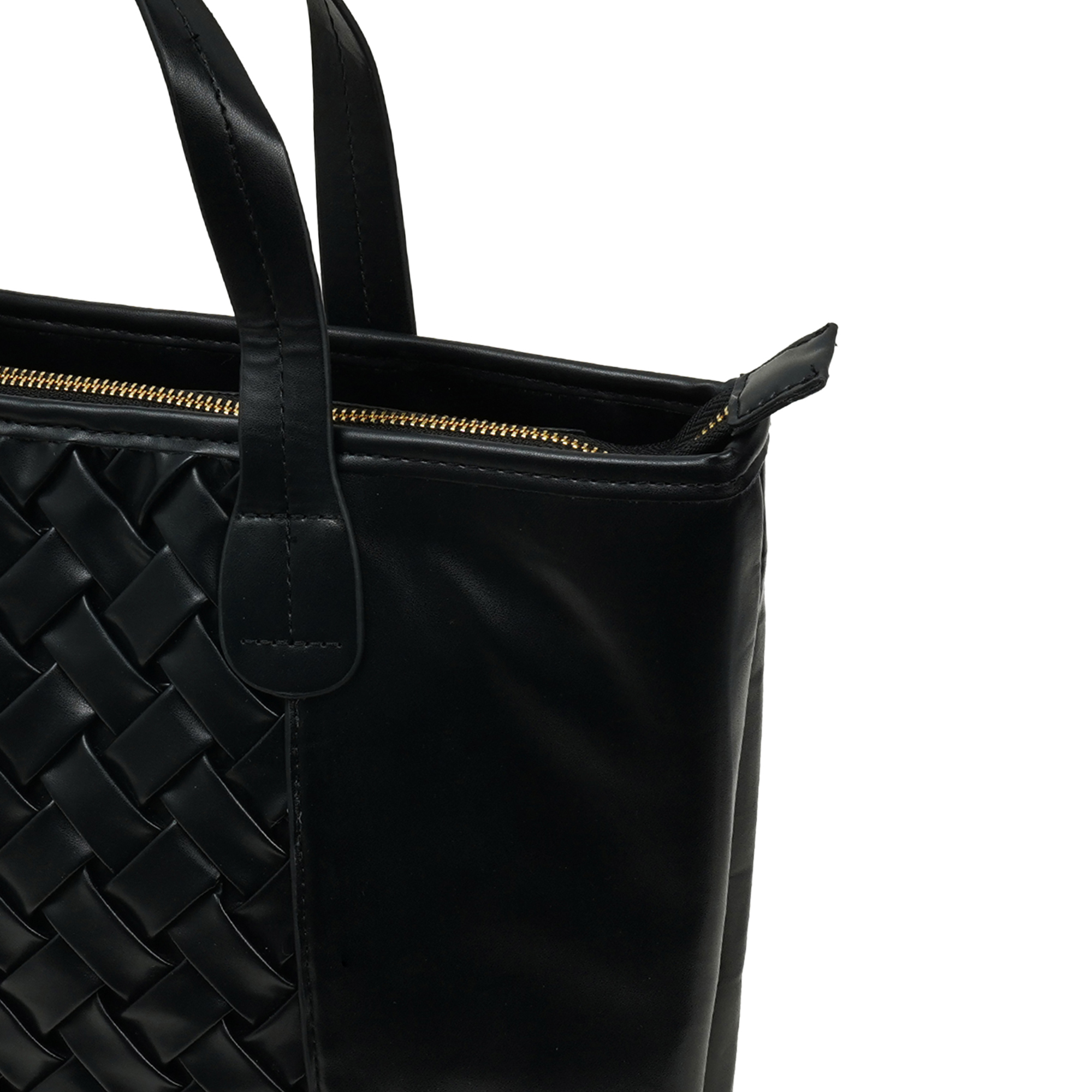 Elegance meets everyday capacity. The Nino Rossi woven-panel tote layers smooth black vegan leather around a striking basket-weave centre, then finishes with a discreet gold logo. A full-length zipper guards a fabric-lined interior roomy enough for a laptop and all-day essentials. Lightweight, wipe-clean and sized for office, travel or café catch-ups.