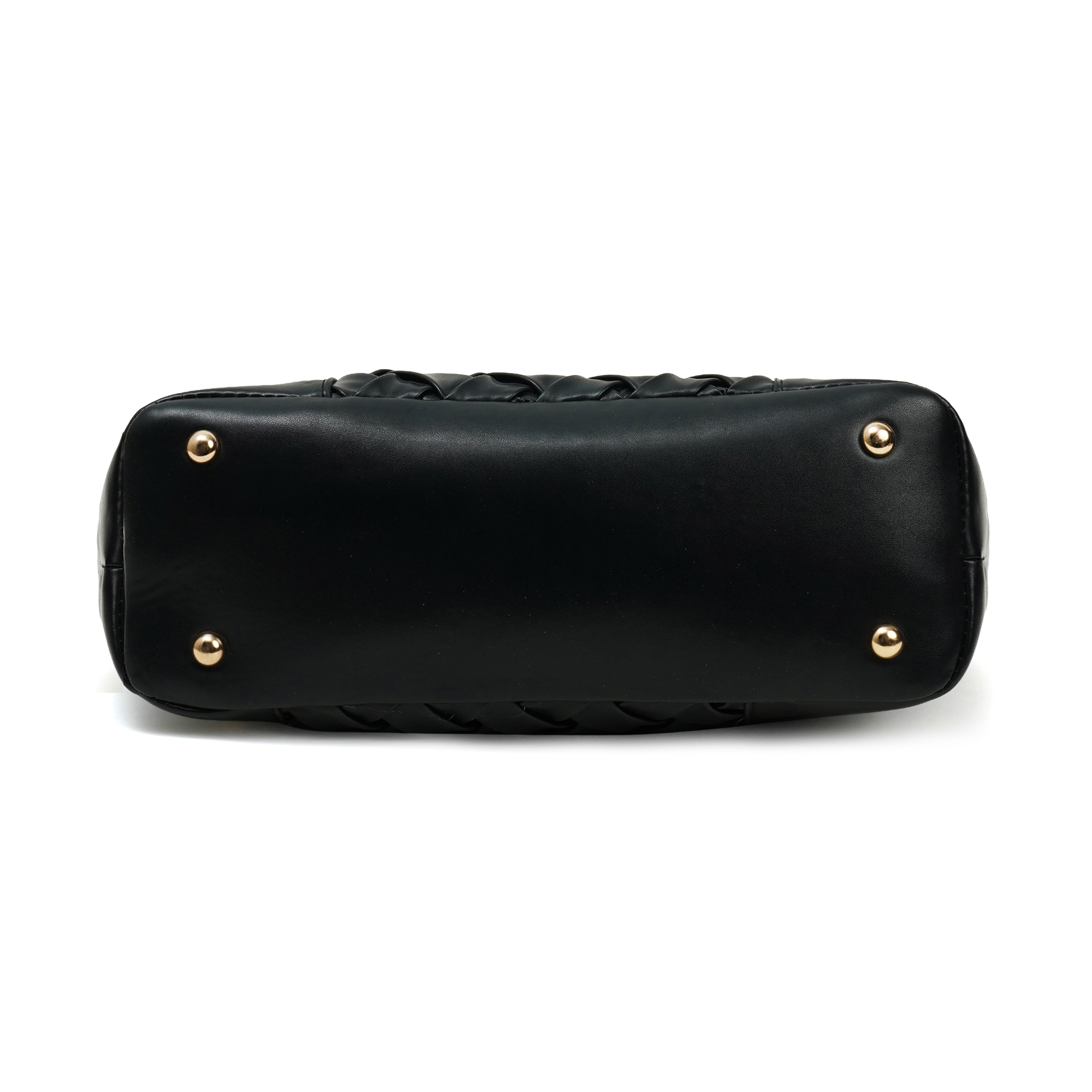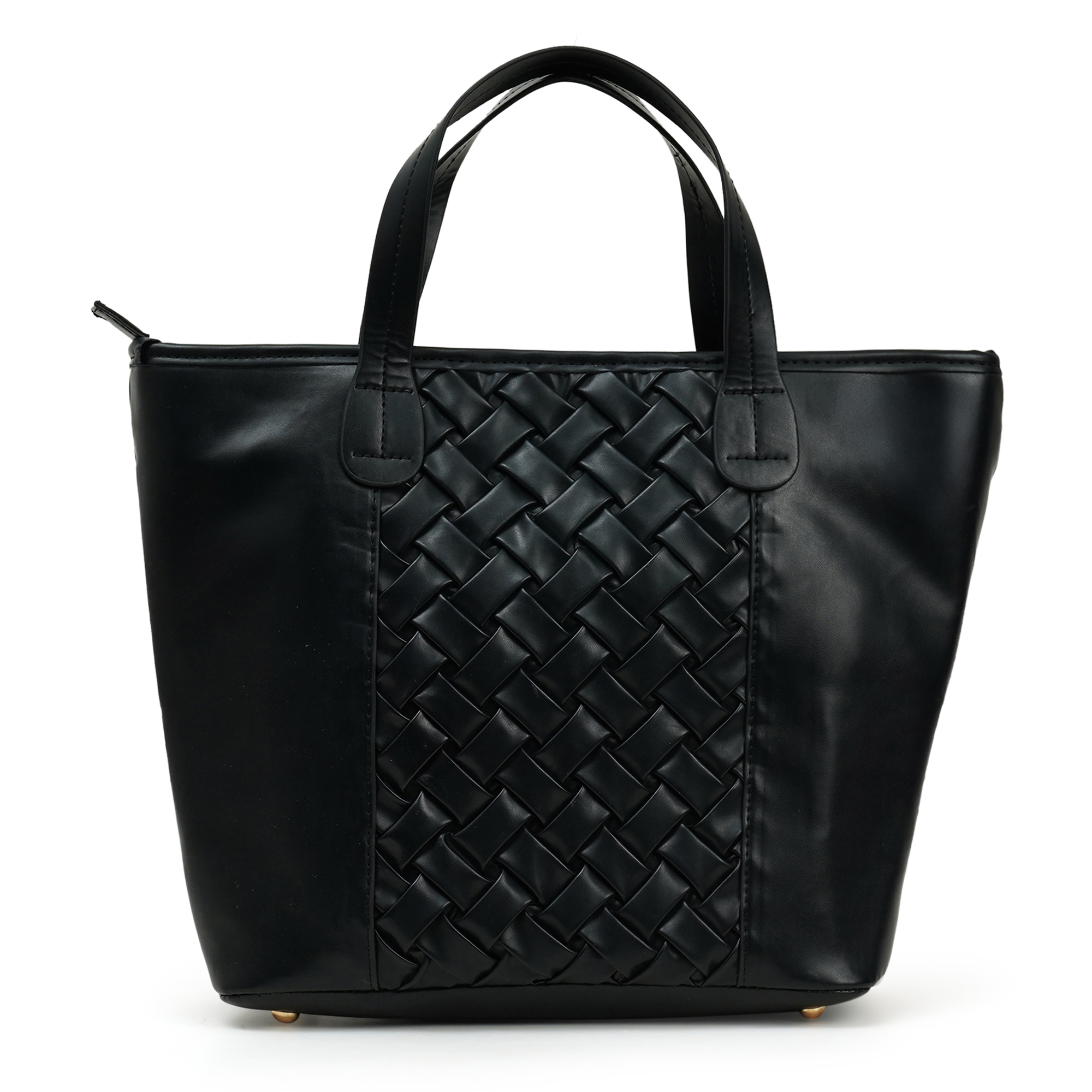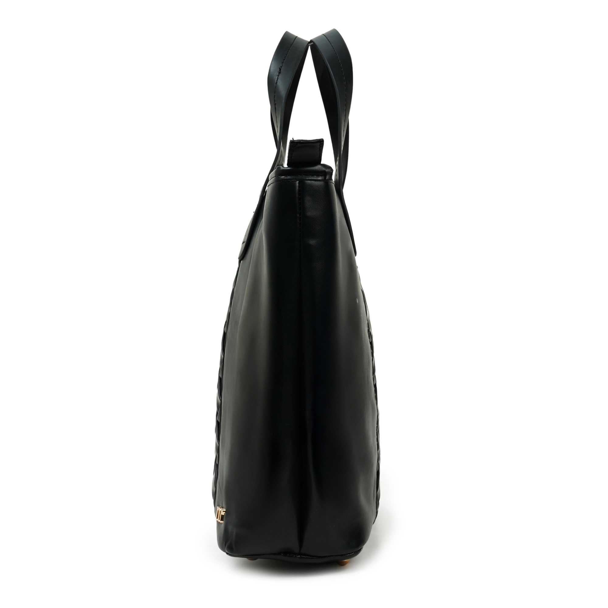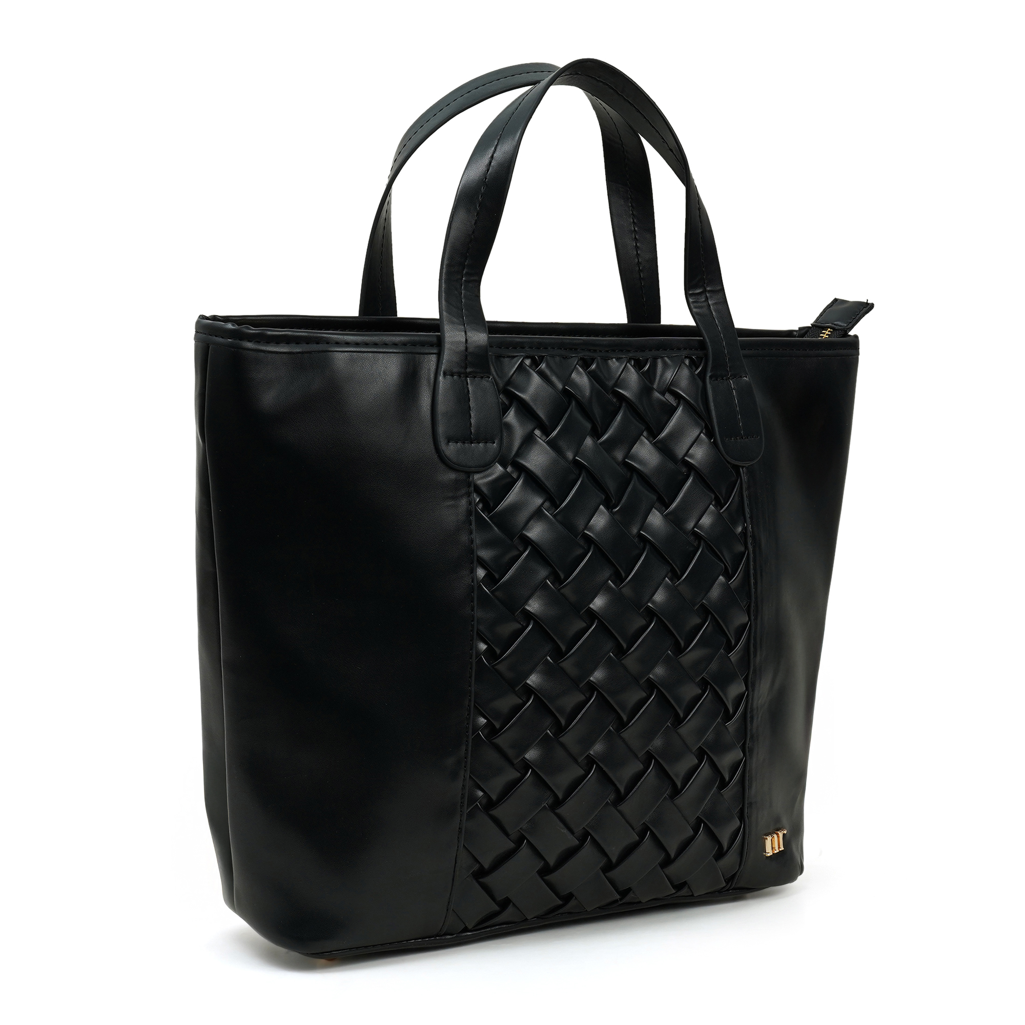 Elegance meets everyday capacity. The Nino Rossi woven-panel tote layers smooth black vegan leather around a striking basket-weave centre, then finishes with a discreet gold logo. A full-length zipper guards a fabric-lined interior roomy enough for a laptop and all-day essentials. Lightweight, wipe-clean and sized for office, travel or café catch-ups.