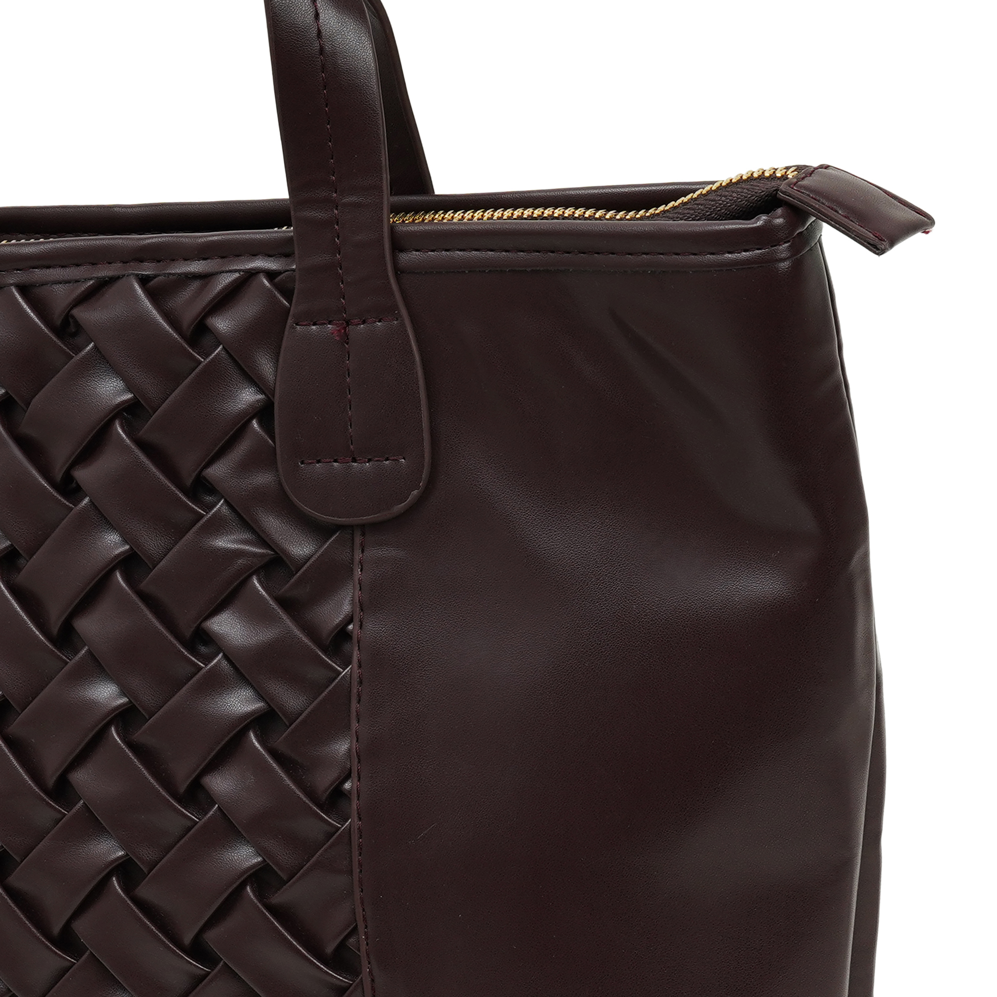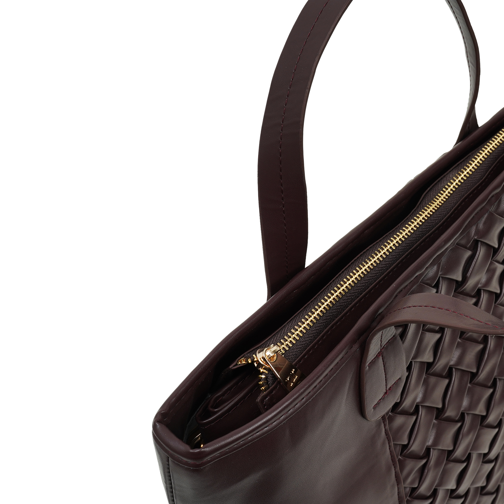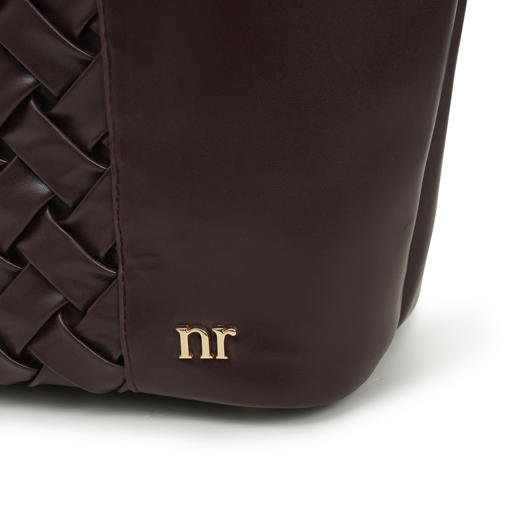 A rich maroon hue meets everyday function. The Nino Rossi woven-panel tote pairs smooth maroon PU with an intricate basket-weave centre and a subtle gold logo. A full-length zipper protects a fabric-lined interior roomy enough for laptop, planner and cosmetics. Lightweight, wipe-clean and sized for work, travel or café catch-ups.