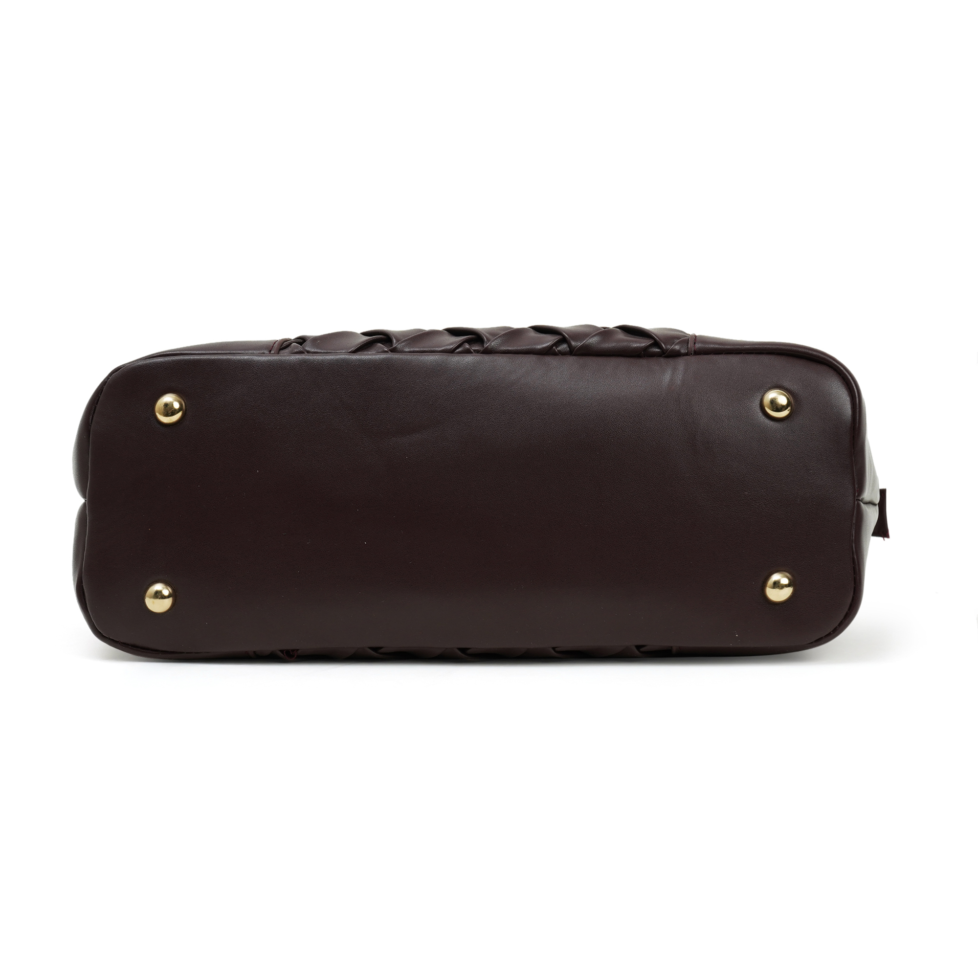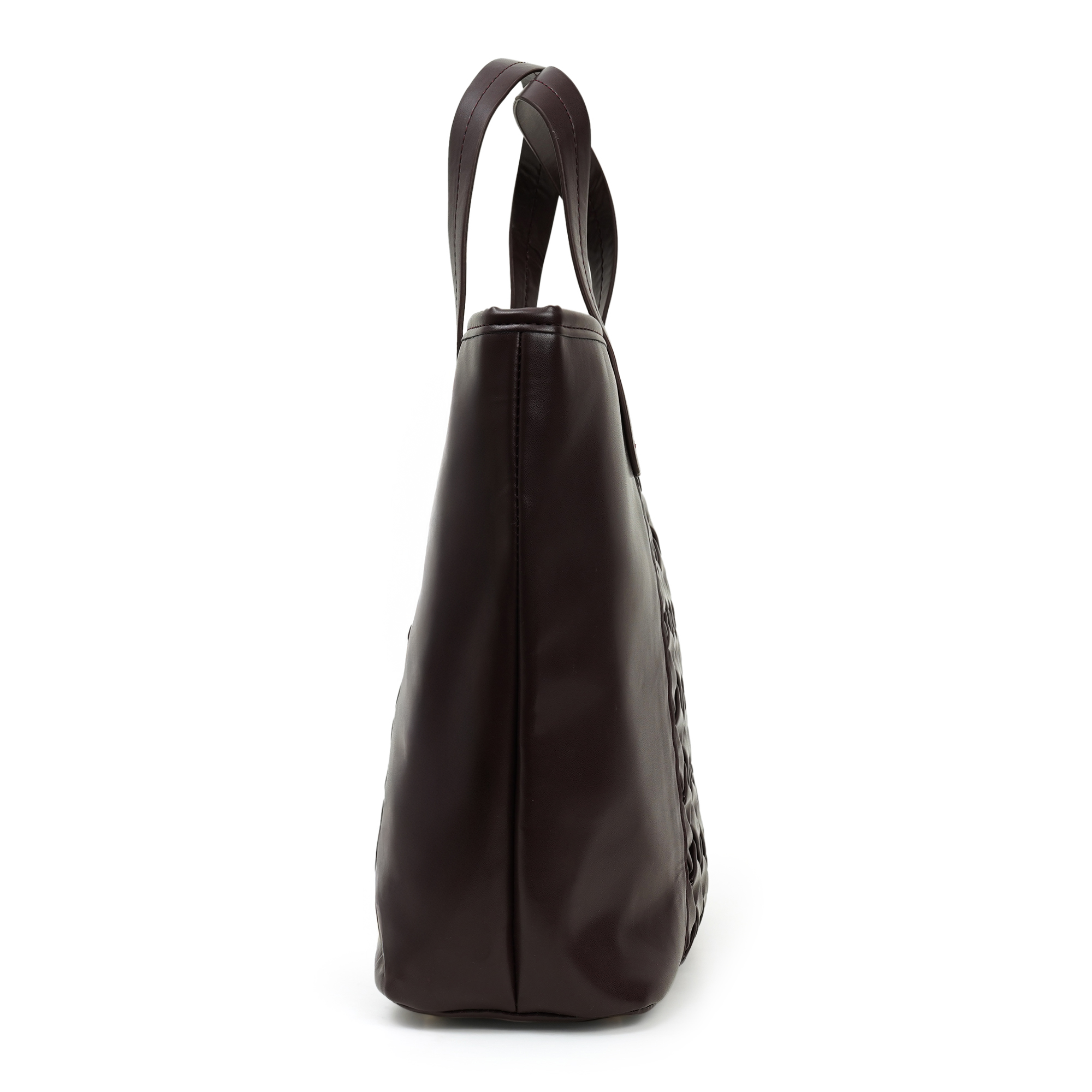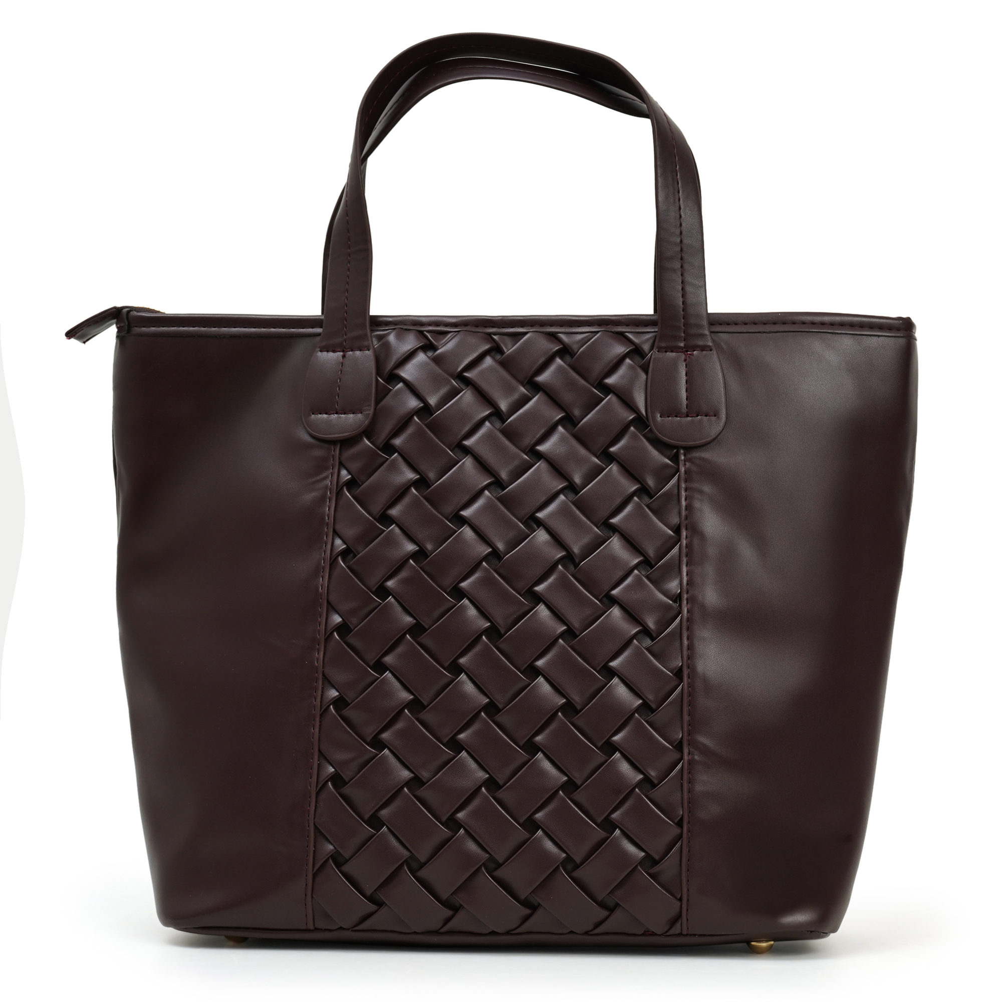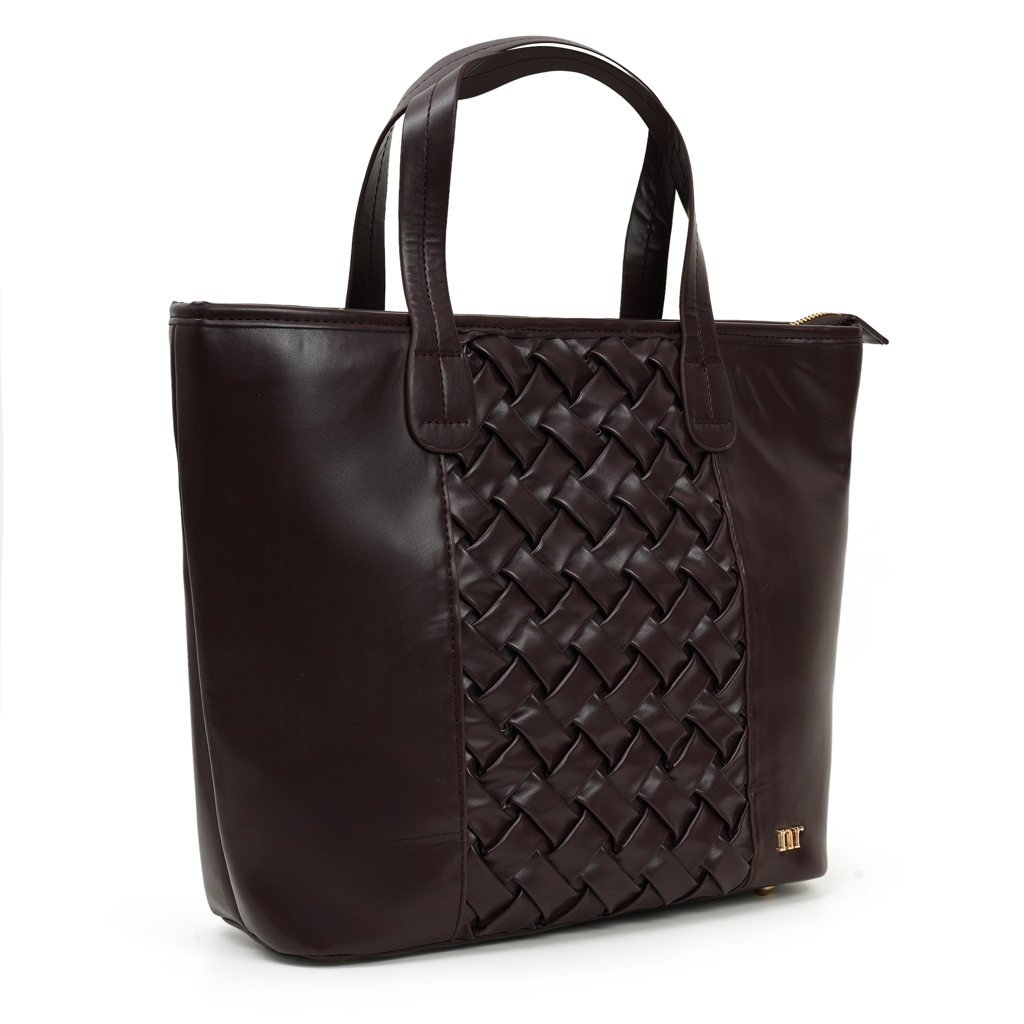 A rich maroon hue meets everyday function. The Nino Rossi woven-panel tote pairs smooth maroon PU with an intricate basket-weave centre and a subtle gold logo. A full-length zipper protects a fabric-lined interior roomy enough for laptop, planner and cosmetics. Lightweight, wipe-clean and sized for work, travel or café catch-ups.