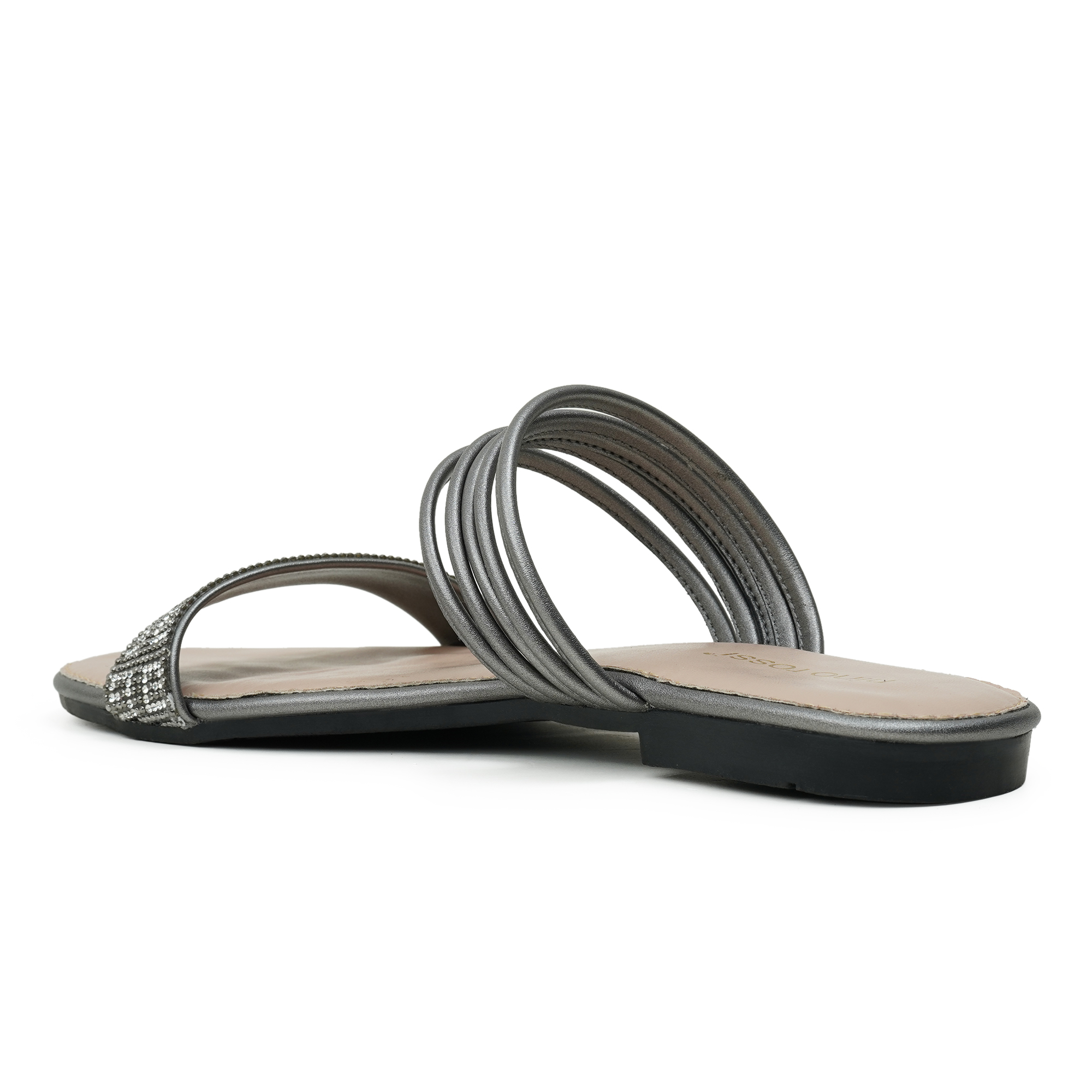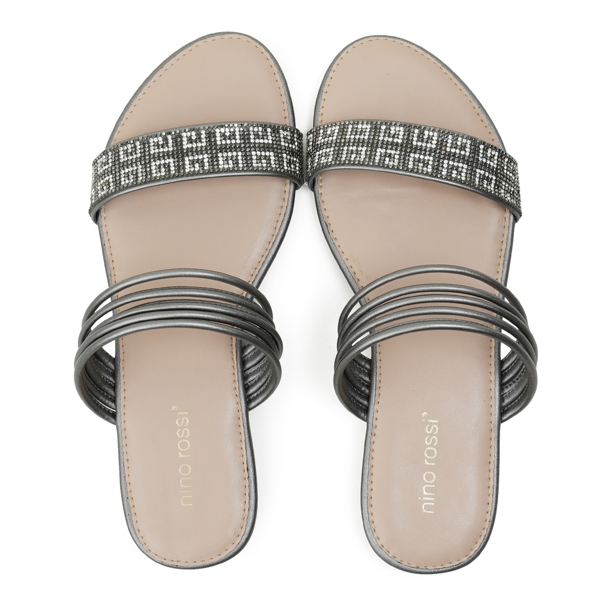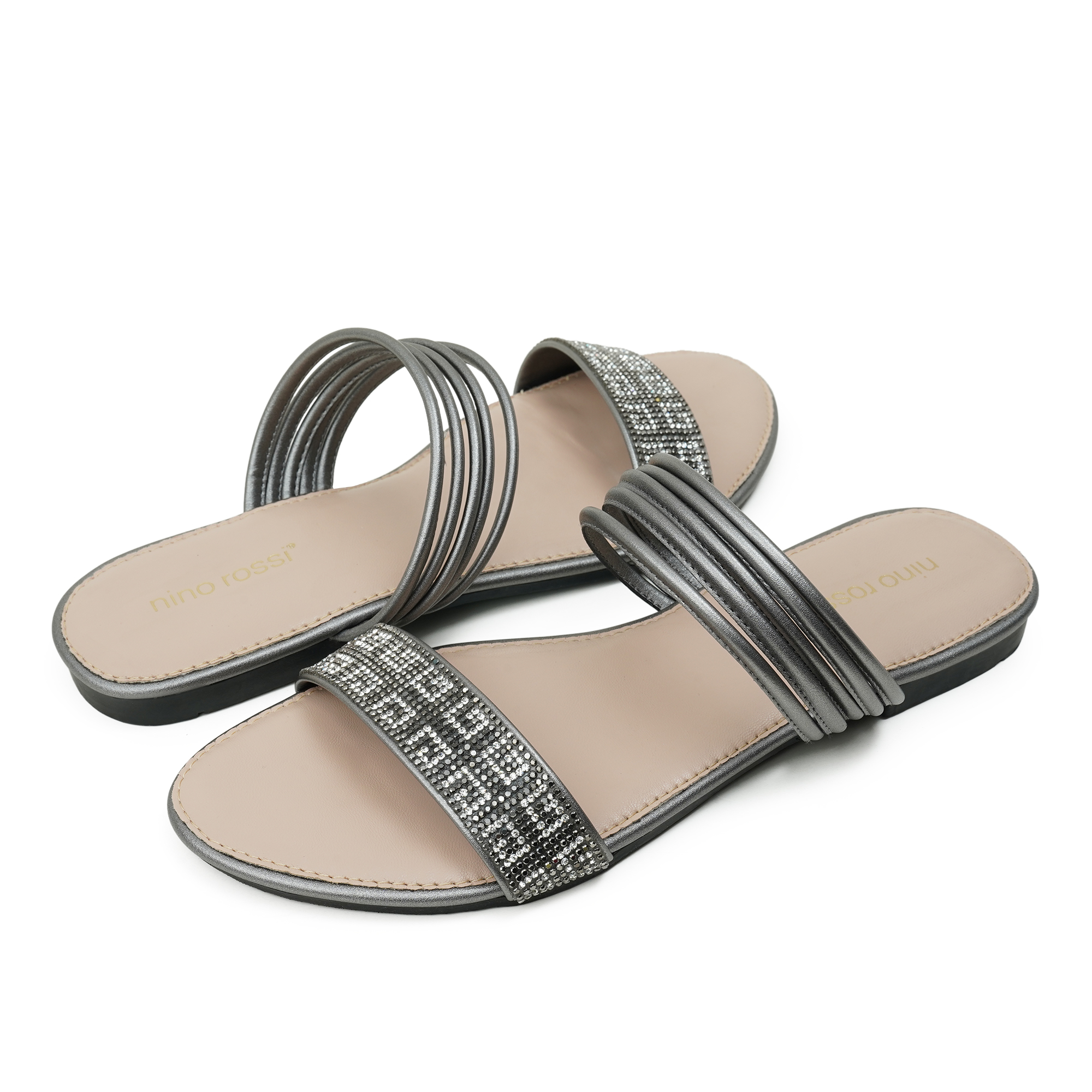 Standout style with Nino Rossi Open Flat Sandals in Puter. Crafted from PU across upper, lining, and sole, these flats offer a sleek, comfortable slip-on silhouette with a flat heel- perfect for daily wear or casual evenings.