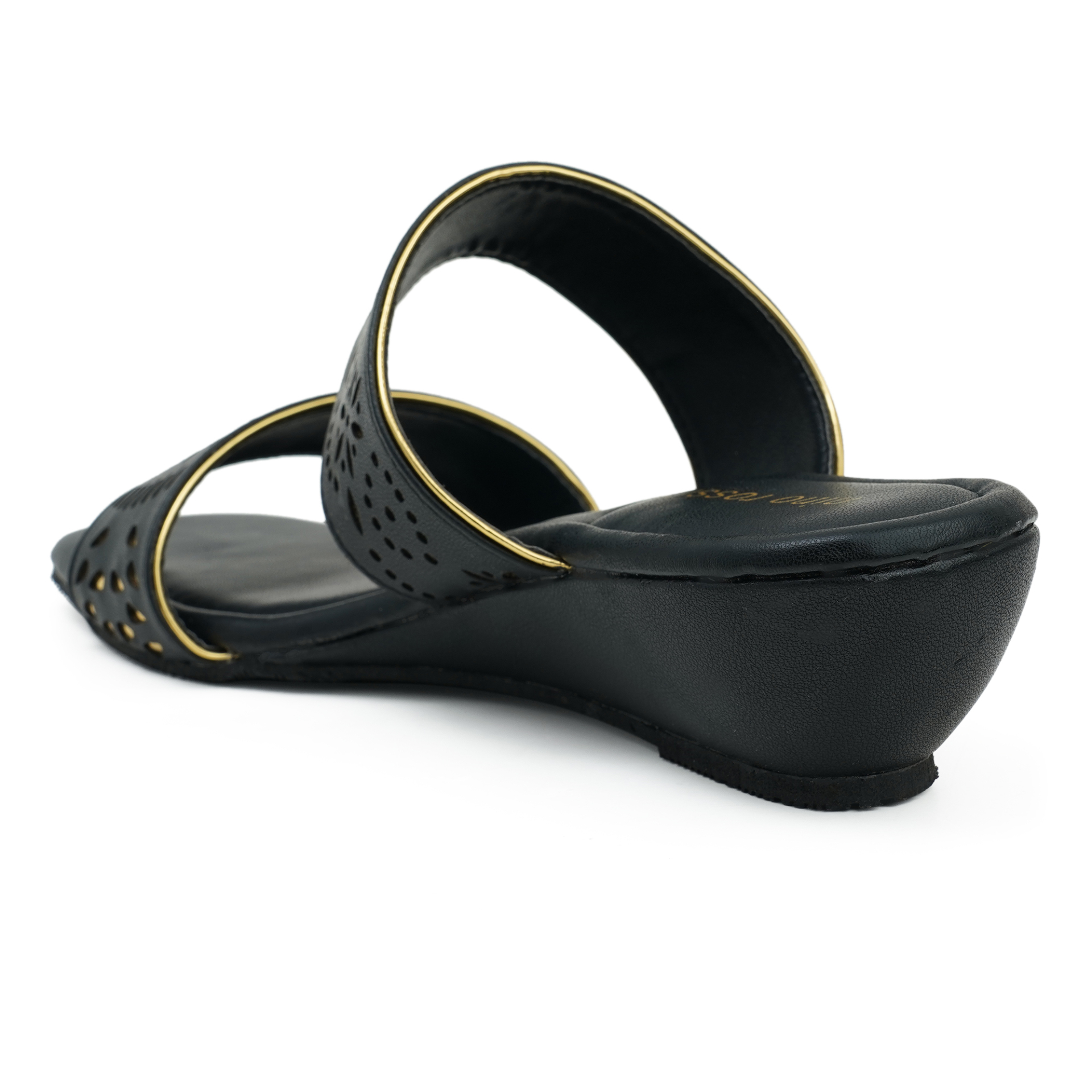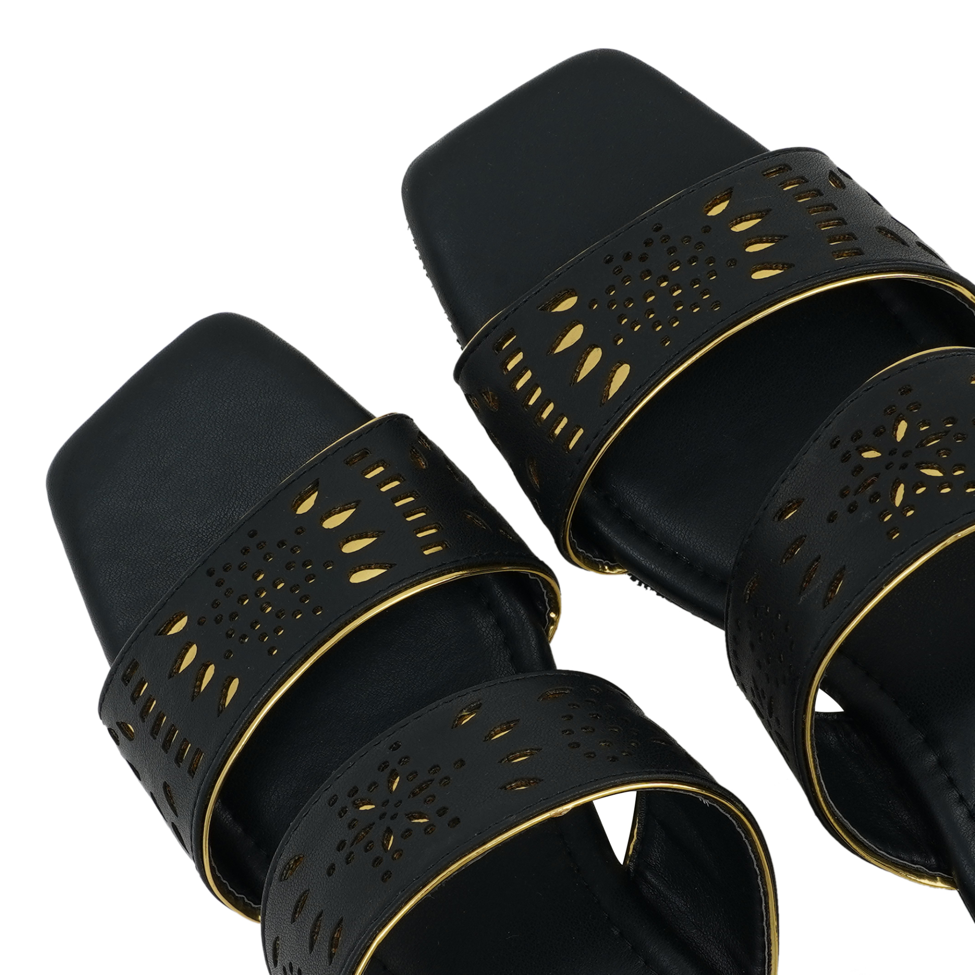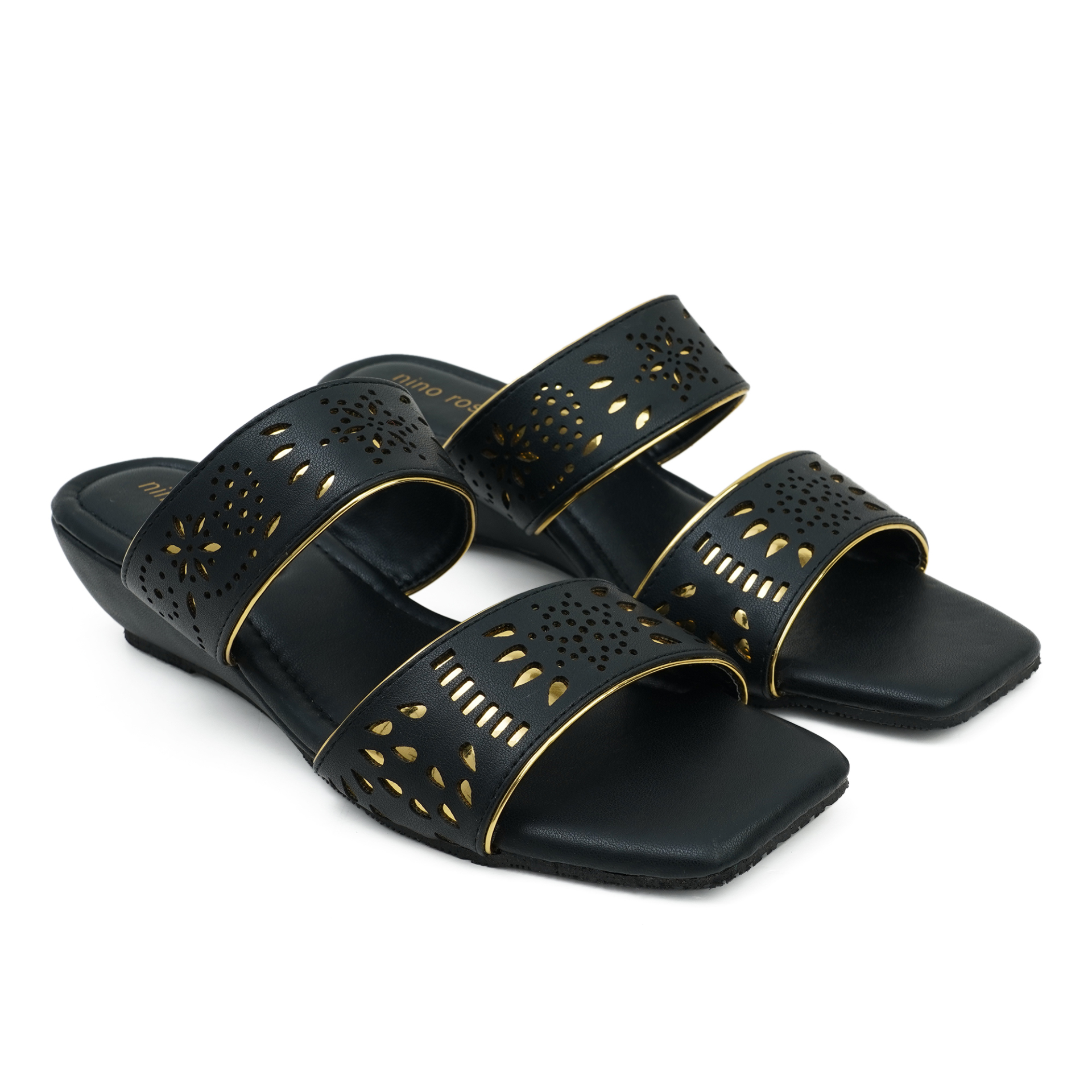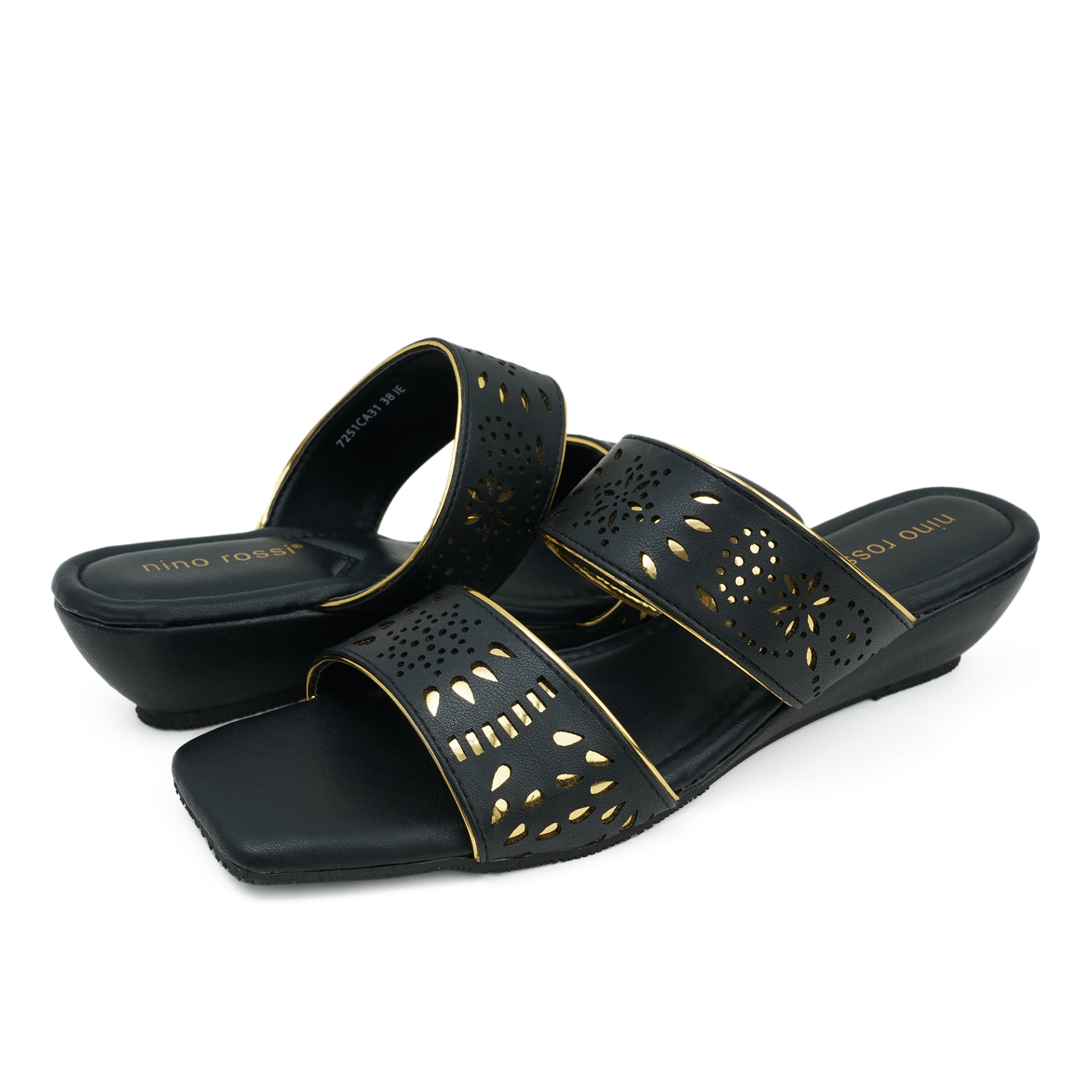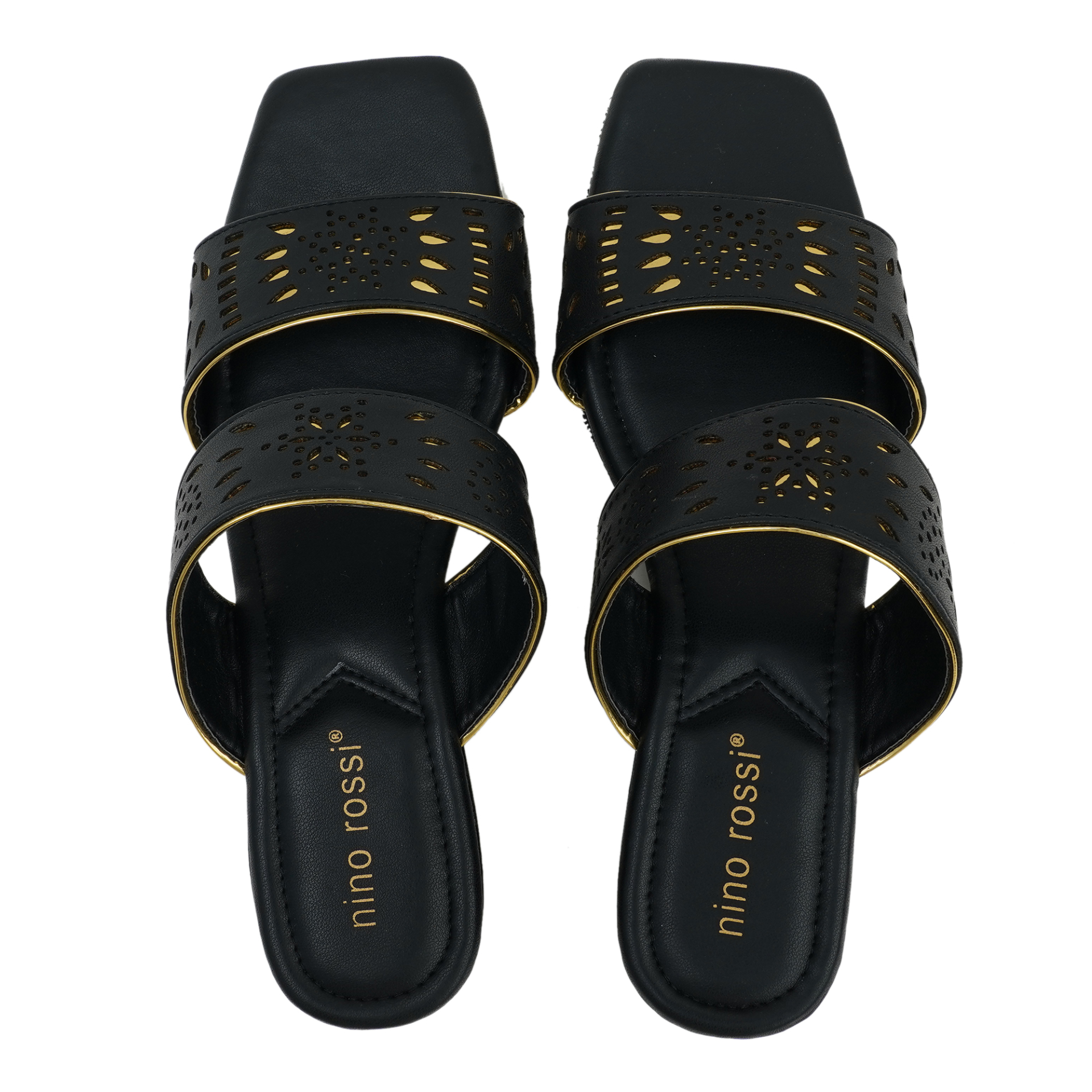 Bold yet refined, the Nino Rossi Women’s Mid Heel Sandal is a perfect blend of glamour and grace. Designed with a black PU upper featuring intricate cut-out patterns over a golden underlay, it creates a stunning contrast that catches every glance. The mid-heel design ensures comfort without compromising on style, making it ideal for parties, dinners, or evenings out. Modern, elegant, and effortlessly striking — this sandal adds golden confidence to your every step.