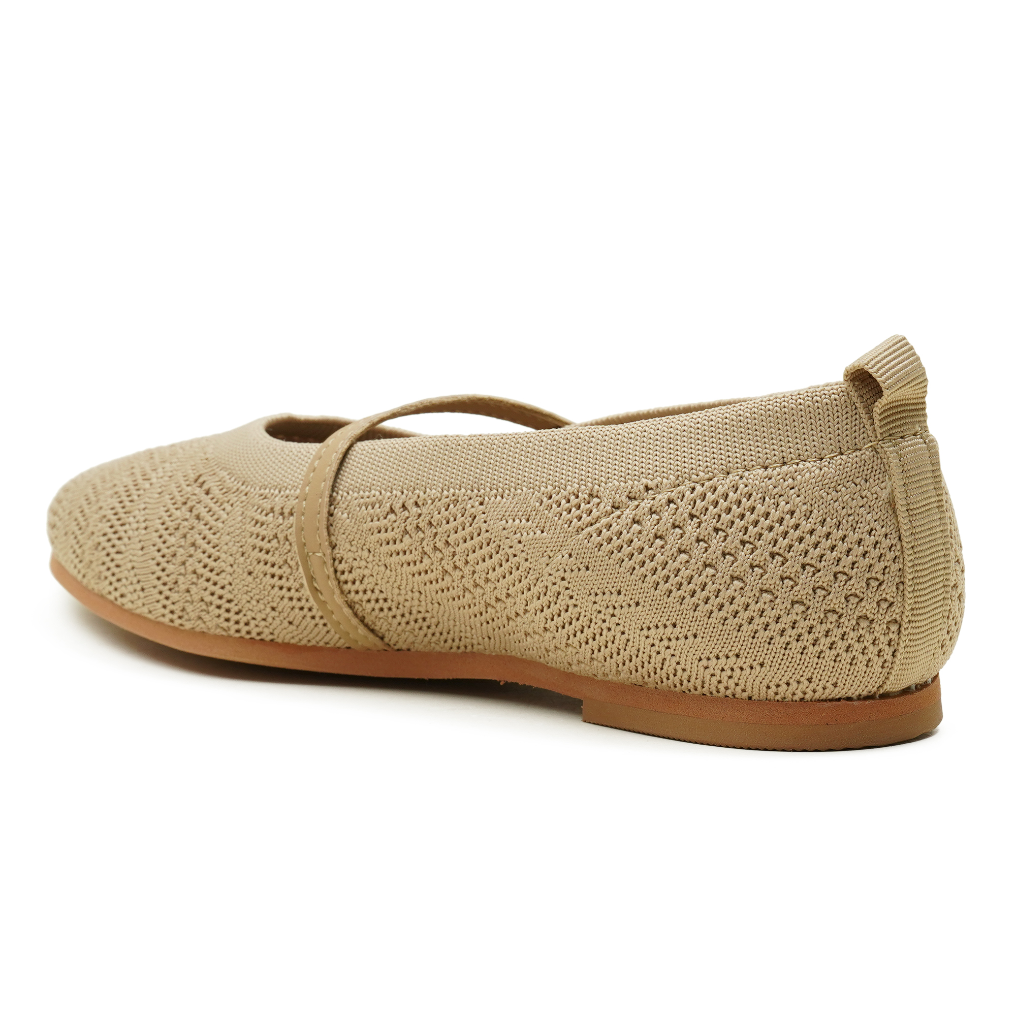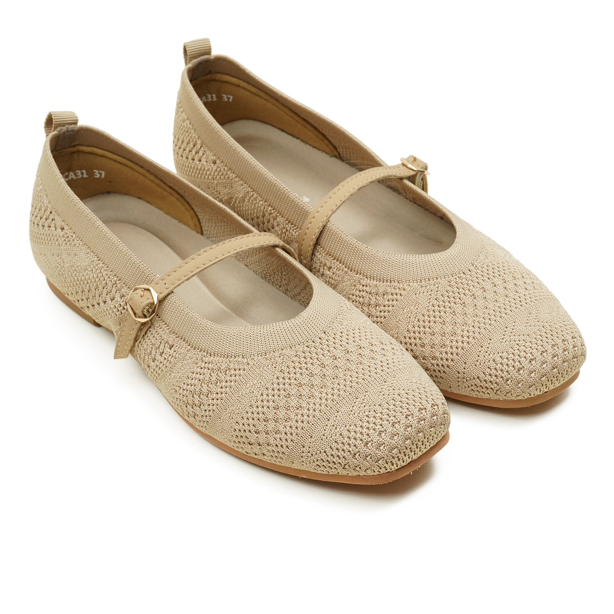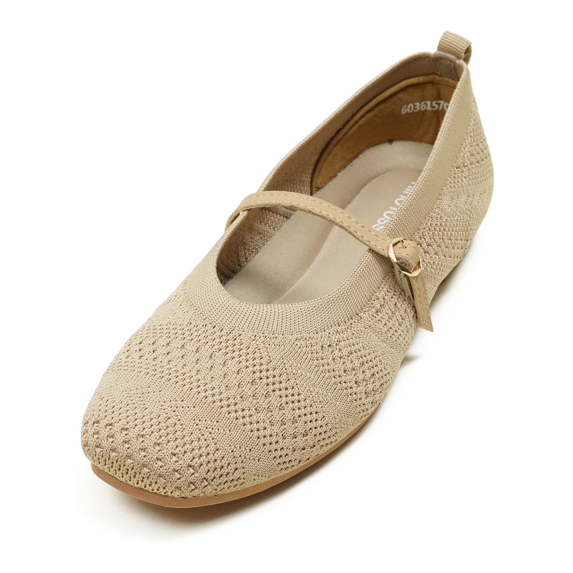 Keep it classy and comfortable with the Nino Rossi Women’s Pump in beige, designed in a ballet-inspired Mary Jane style. The knit-textured upper gives a soft, flexible feel, while the strap with a gold-tone buckle adds both a secure fit and a polished finish. With a cushioned footbed and flat sole, this pair is made for day-long comfort—perfect for workdays, outings, and effortless everyday styling.