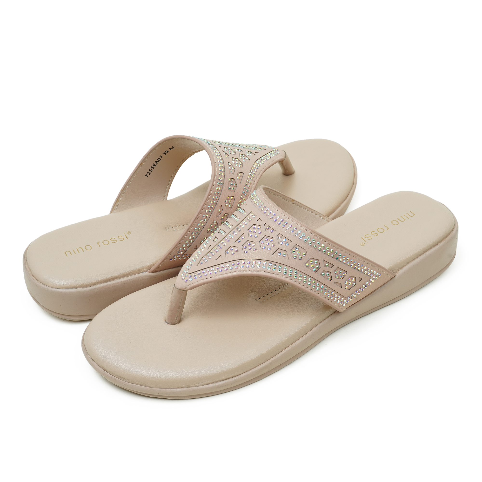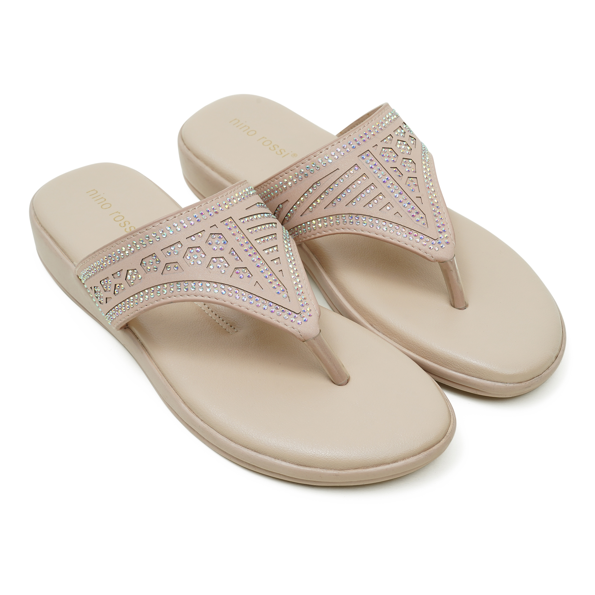 Add a touch of sparkle to your daily style with the Nino Rossi Women’s Sandal in a soft pink tone. Designed with a comfortable, cushioned footbed, it helps keep your feet relaxed through long hours of wear. The beautifully detailed, embellished cutwork strap gives a dressy finish while still feeling light and easy on the feet. With its open-toe thong silhouette and slip-on convenience, it’s perfect for casual outings, travel, and everyday wear.