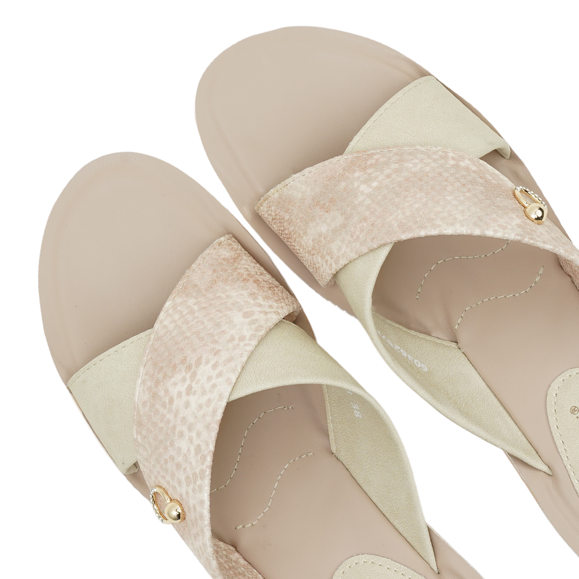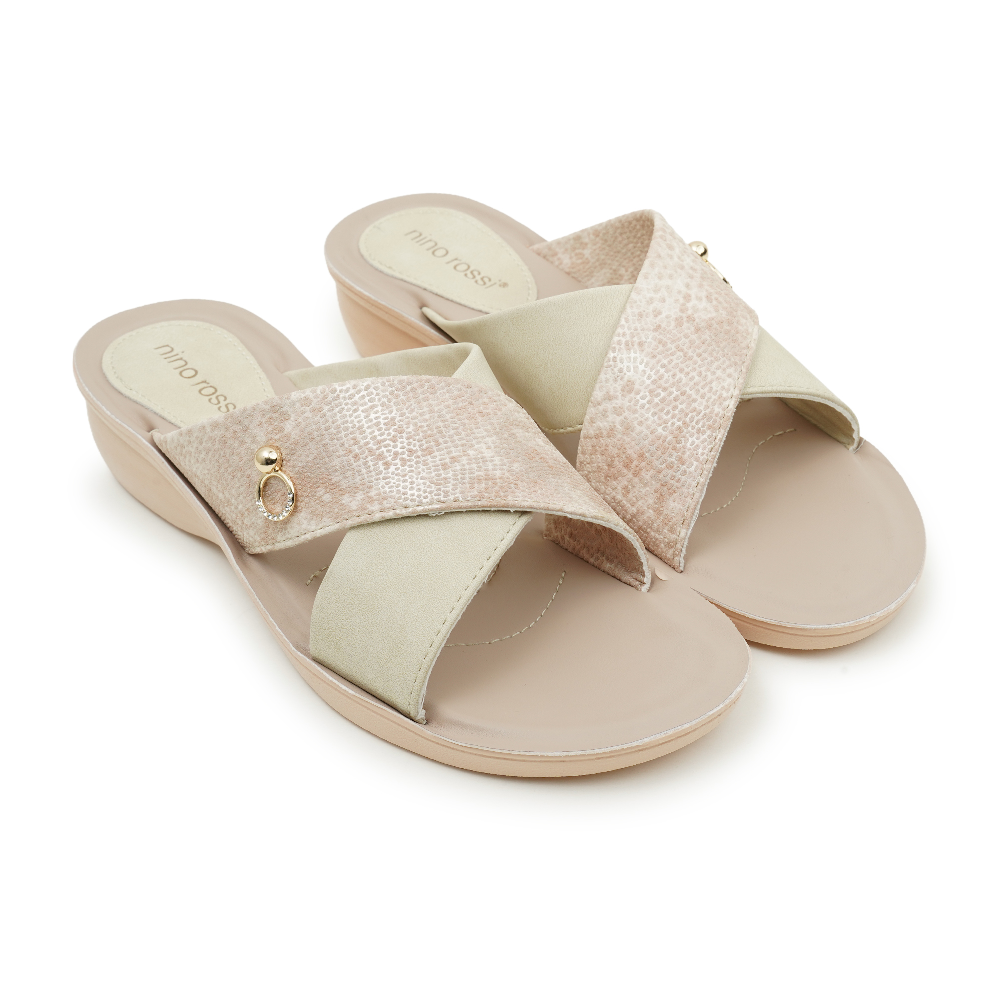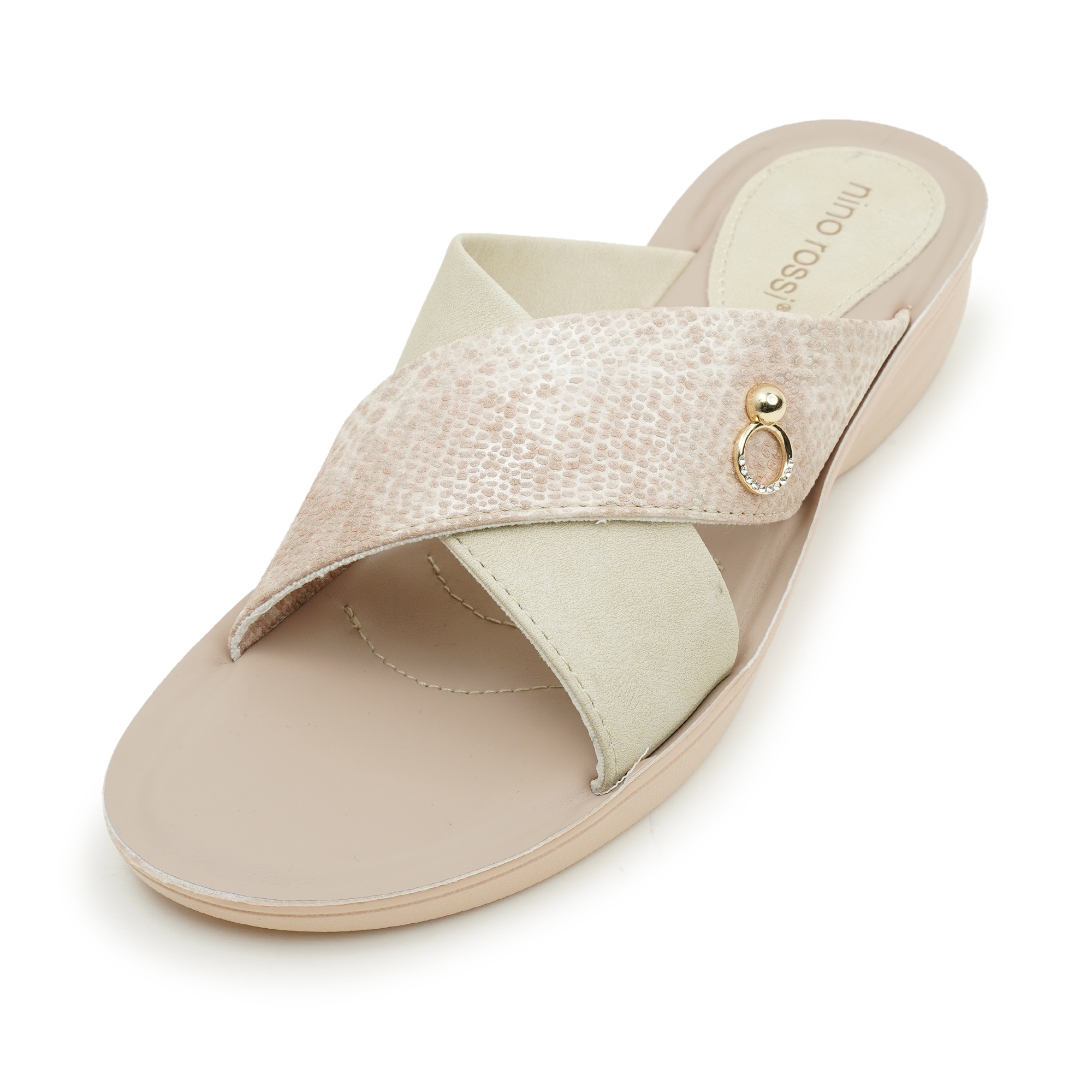 Designed for the modern woman who values both style and ease, these slides feature a go to criss-cross strap design. One strap boasts a textured, shimmering finish while the other offers a smooth, matte look, accented by a delicate gold-tone ring charm. Whether you're heading to a casual brunch or lounging at home, these 'Feellight' slippers provide a featherweight walking experience without compromising on chic aesthetics.