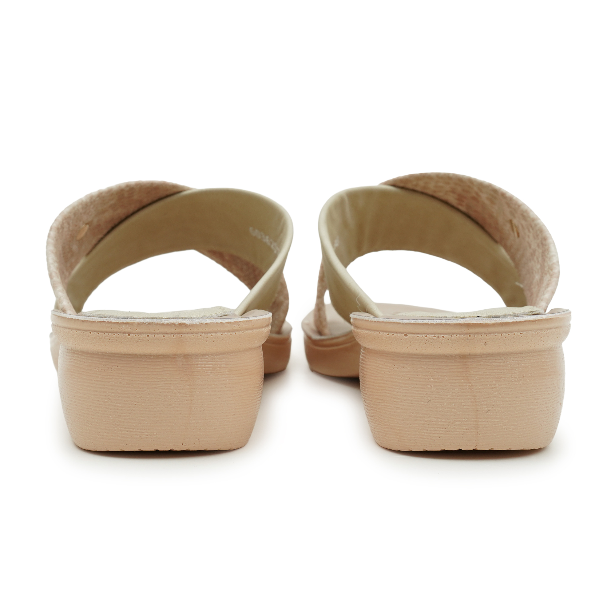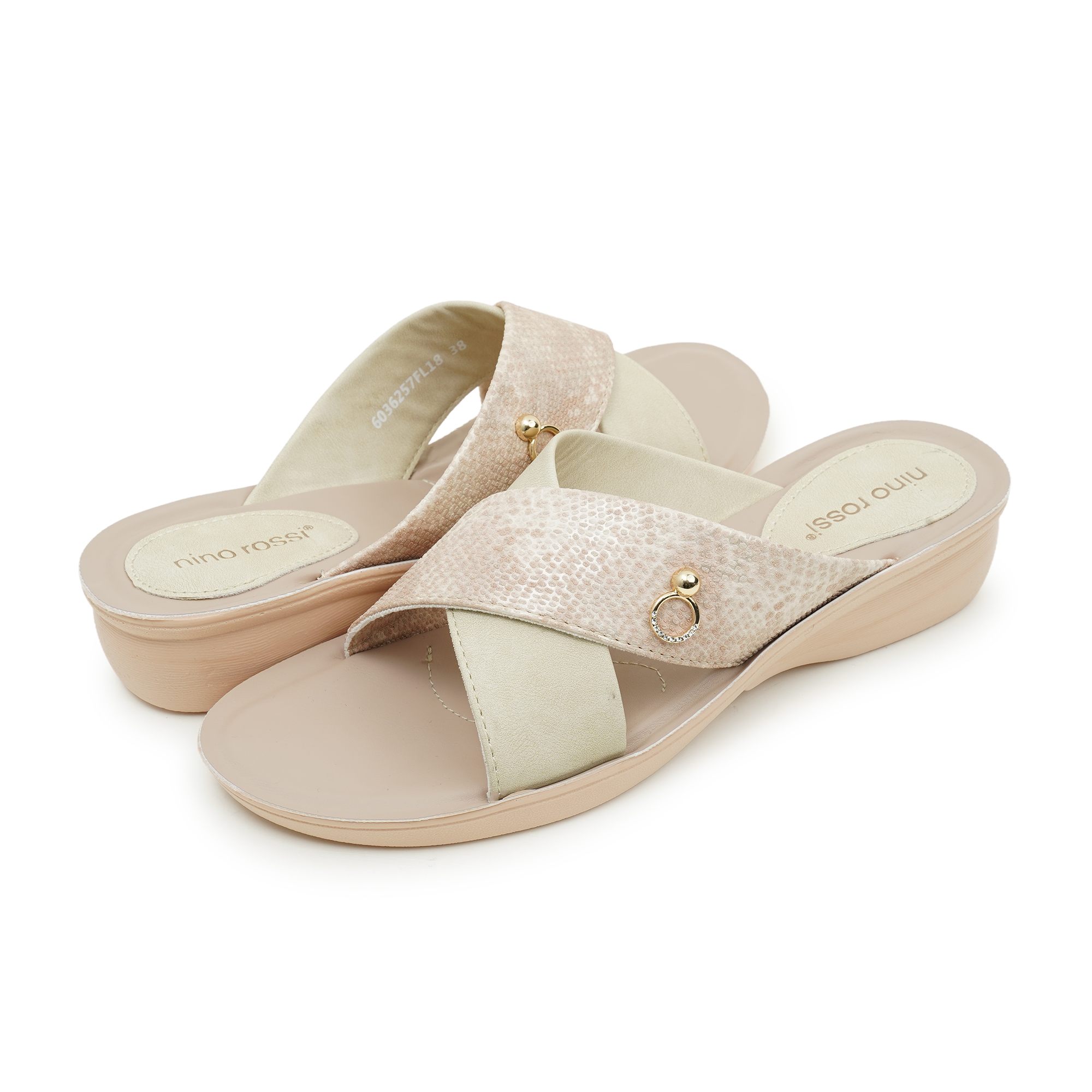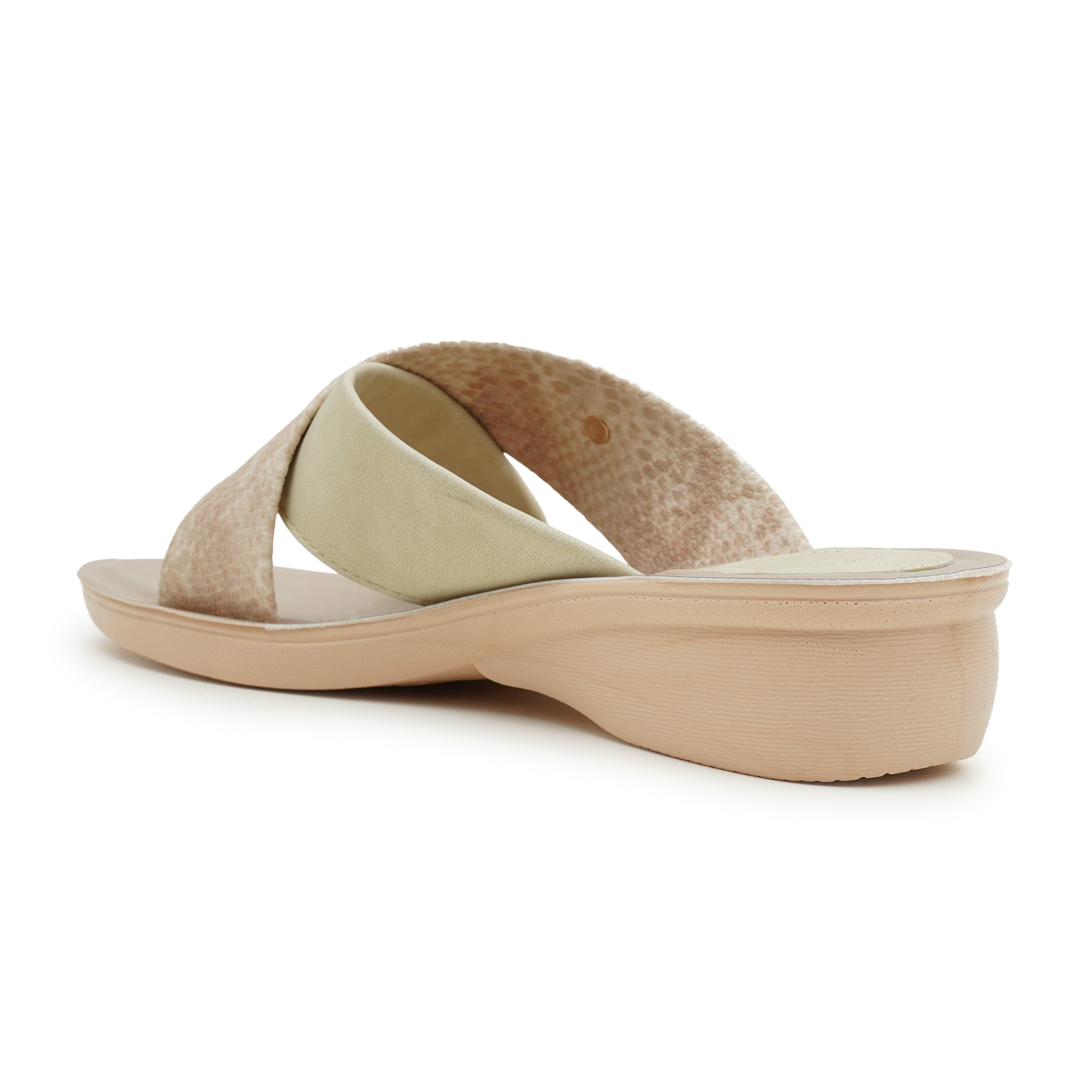 Designed for the modern woman who values both style and ease, these slides feature a go to criss-cross strap design. One strap boasts a textured, shimmering finish while the other offers a smooth, matte look, accented by a delicate gold-tone ring charm. Whether you're heading to a casual brunch or lounging at home, these 'Feellight' slippers provide a featherweight walking experience without compromising on chic aesthetics.