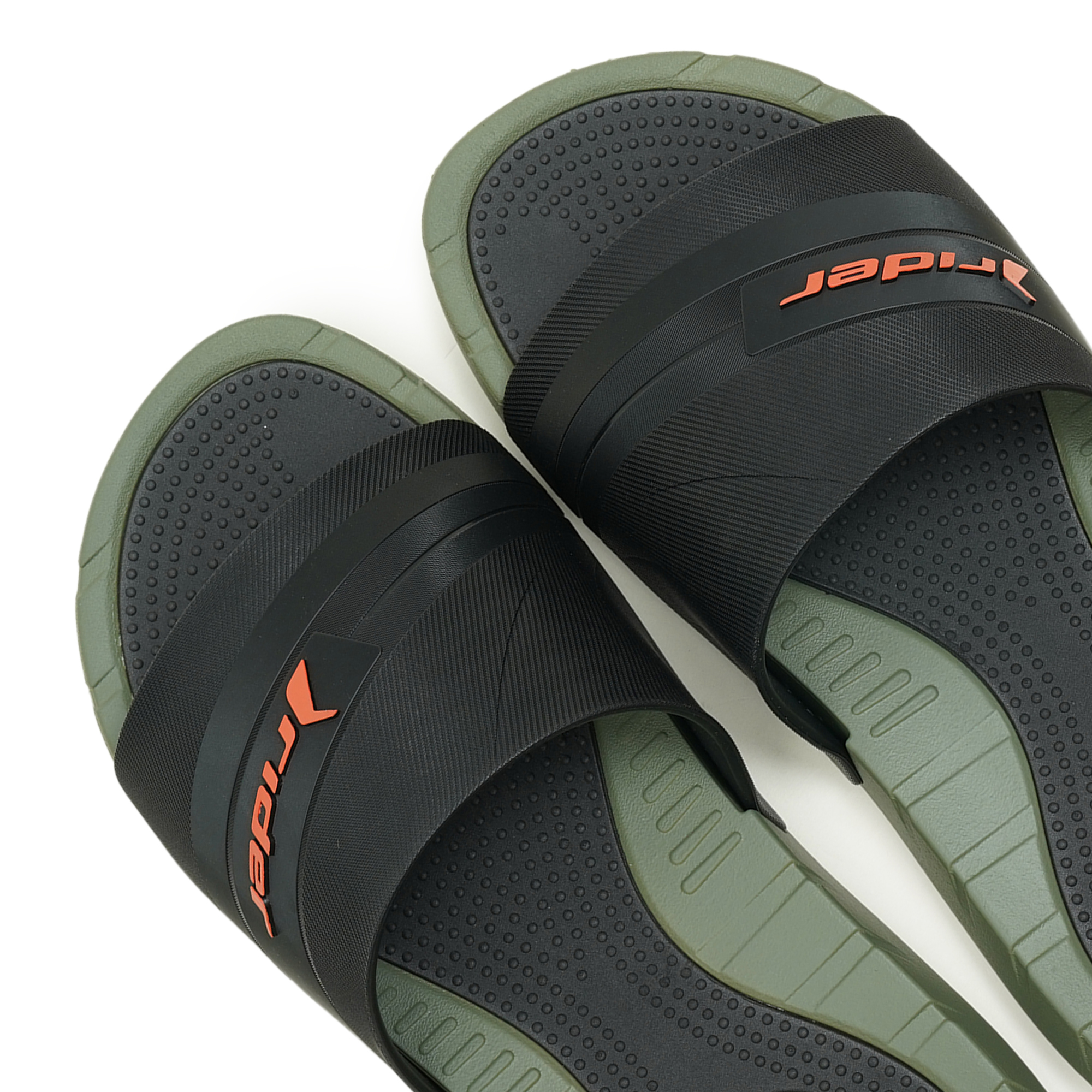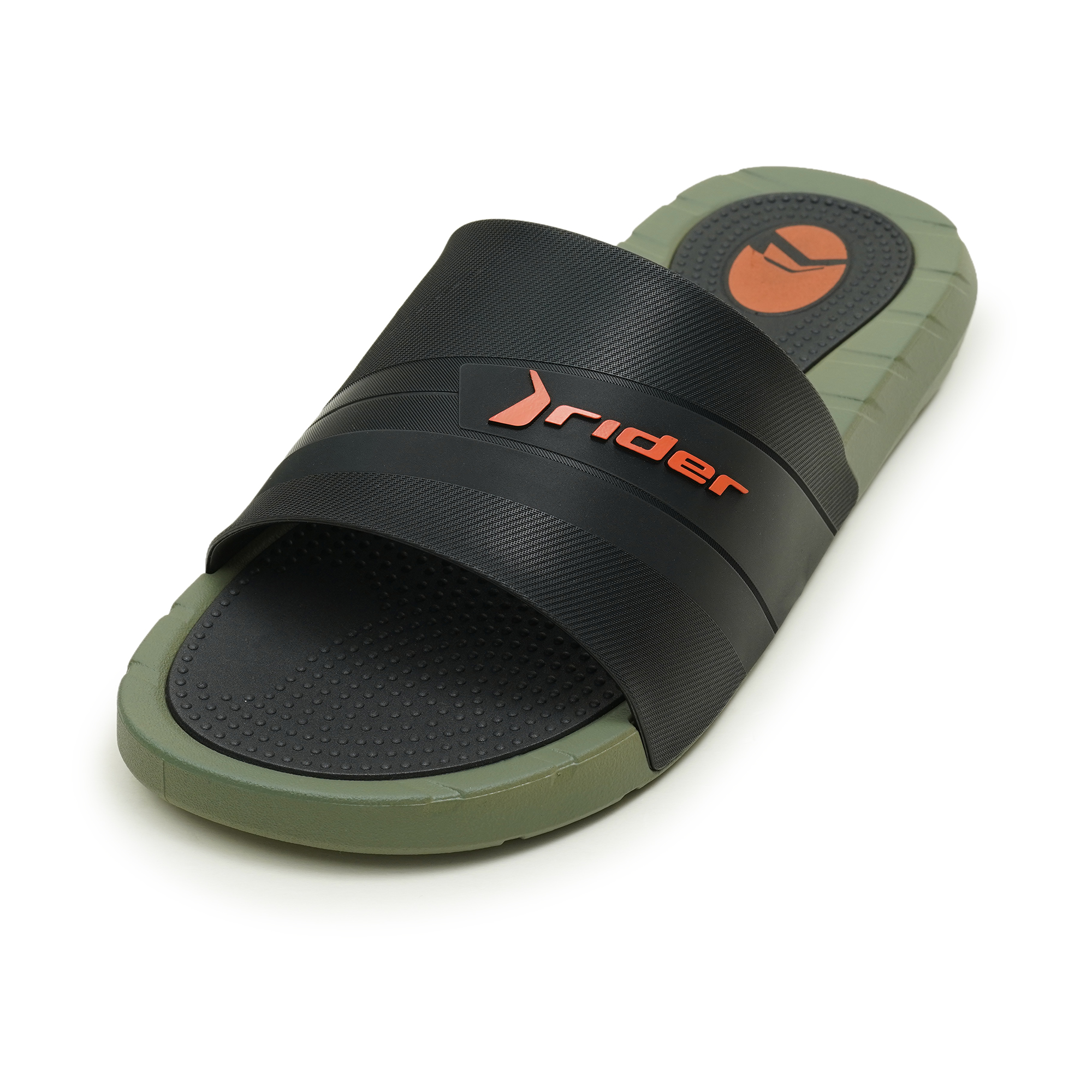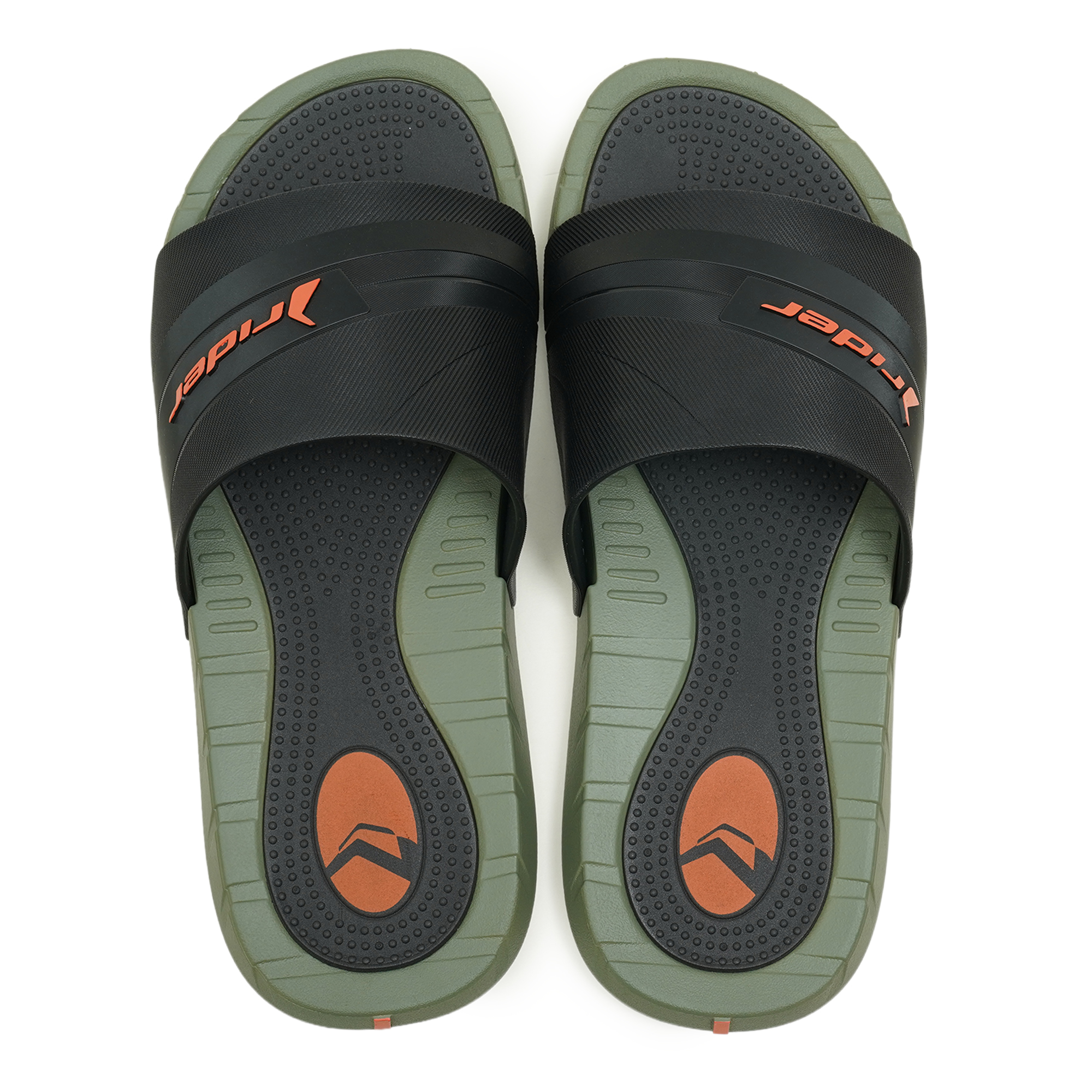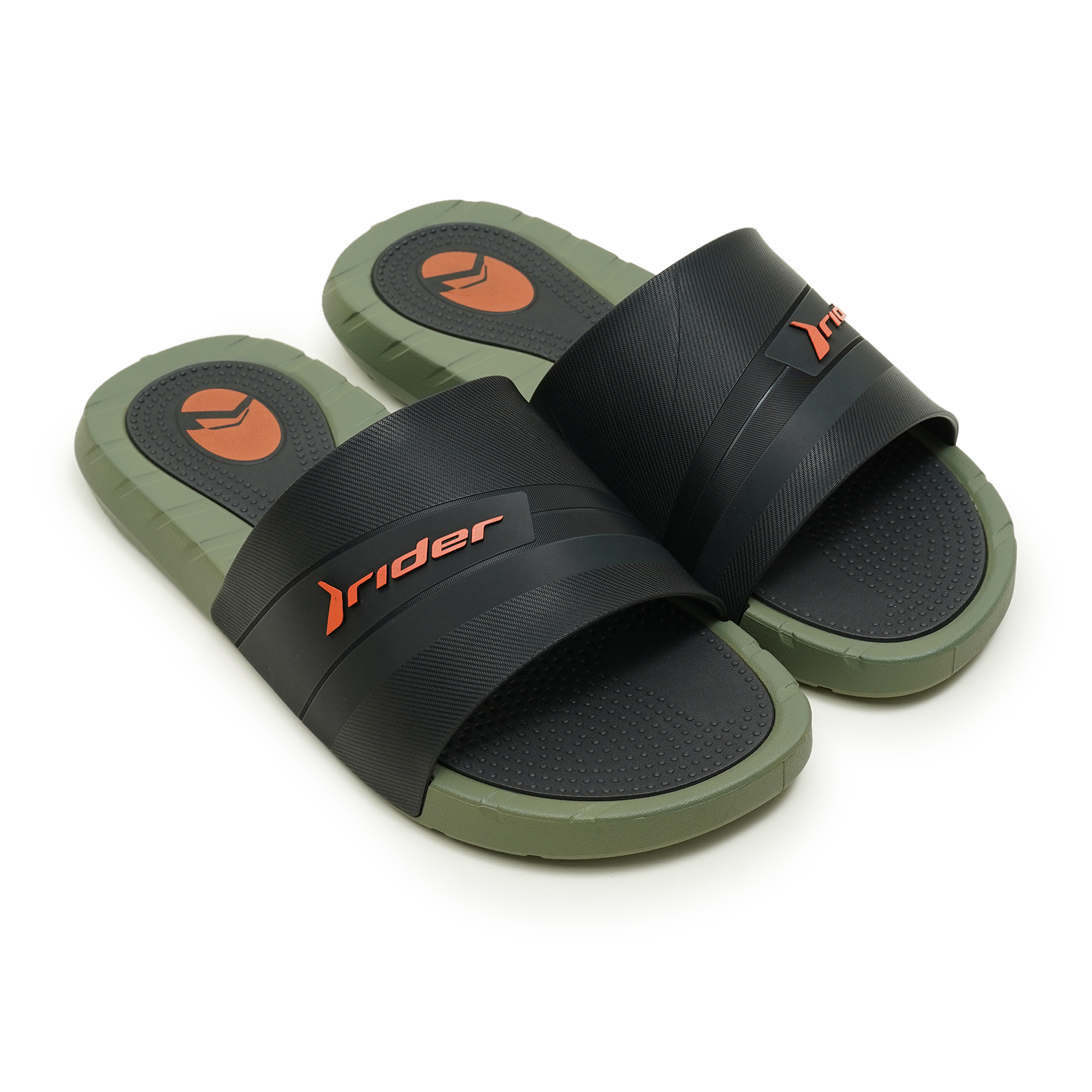 Experience rugged comfort and a bold look with the Rider Rush Slide Sandals. These slides feature a distinctive color-block design combining a deep olive green base with a striking black upper, accented by bright orange Rider branding. Built for durability and comfort from 100% PVC, they are perfect for casual wear, post-workout recovery, or any activity where easy-on, easy-off footwear is preferred.