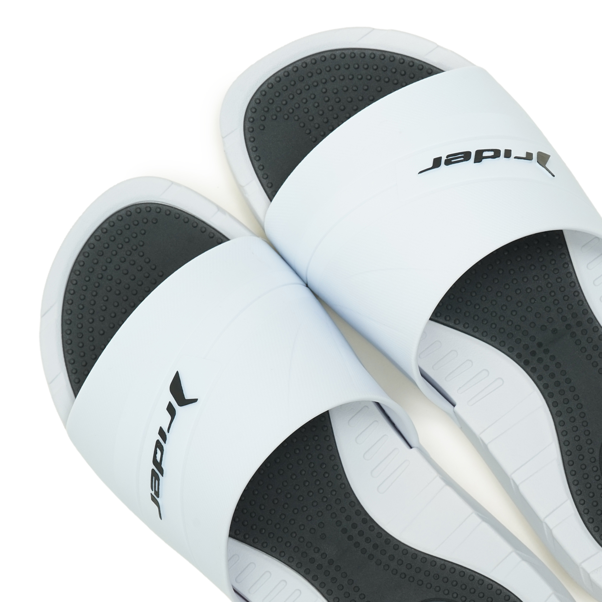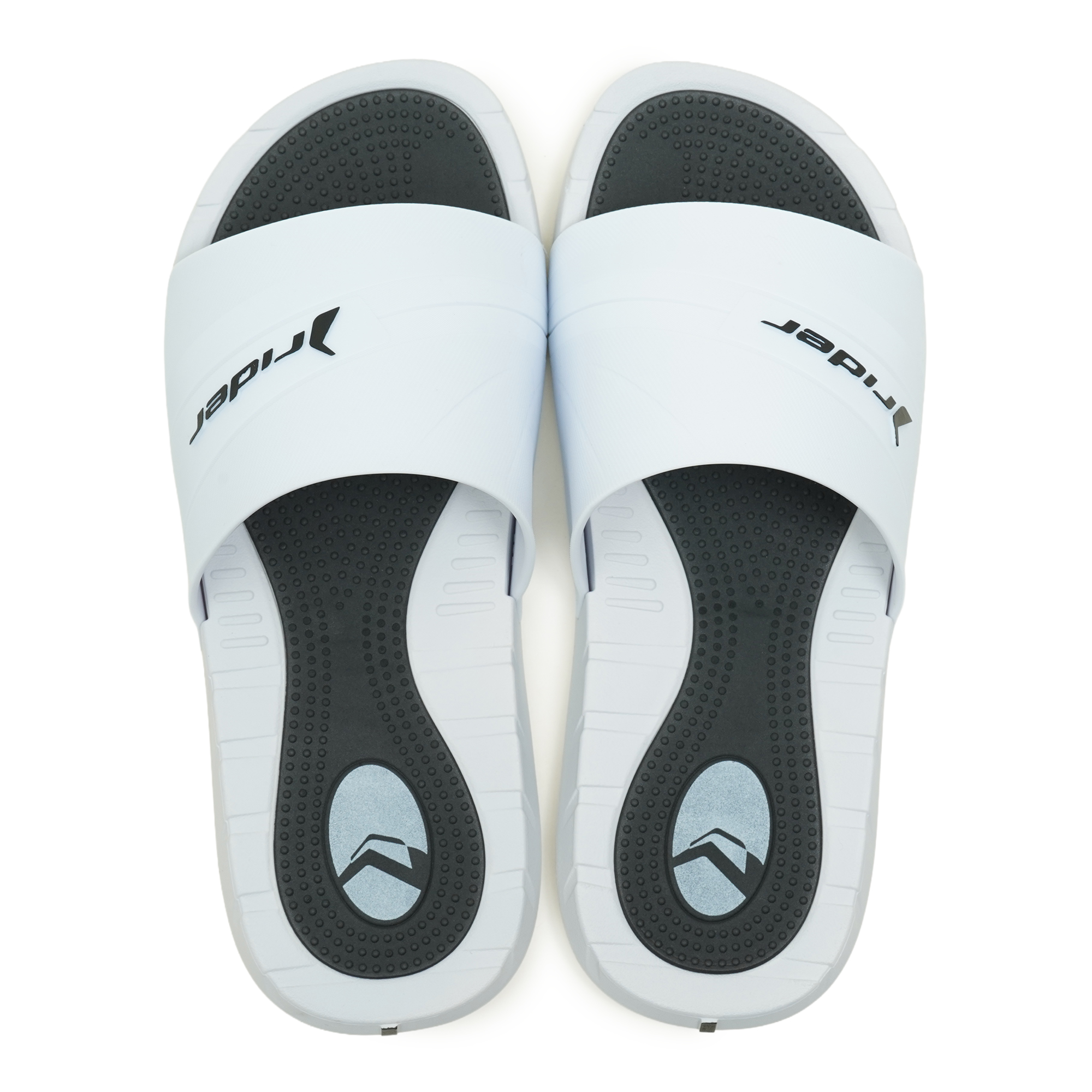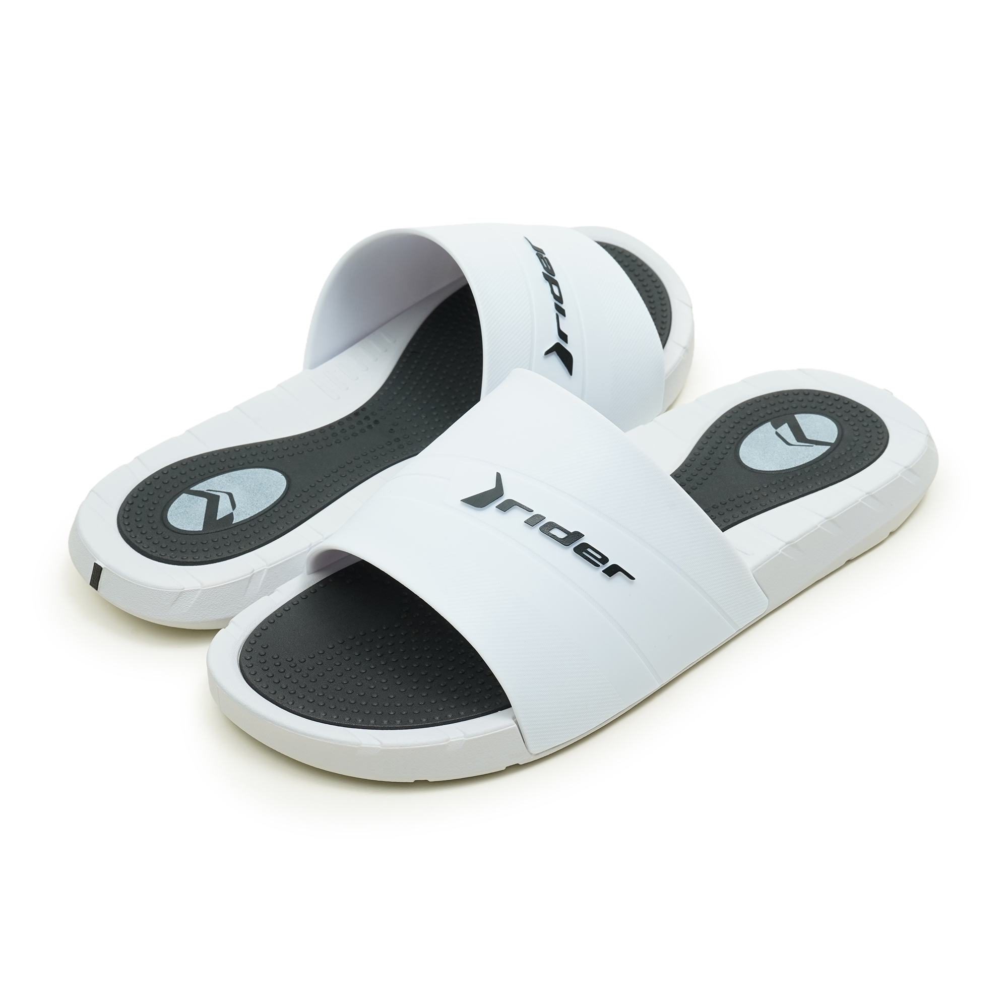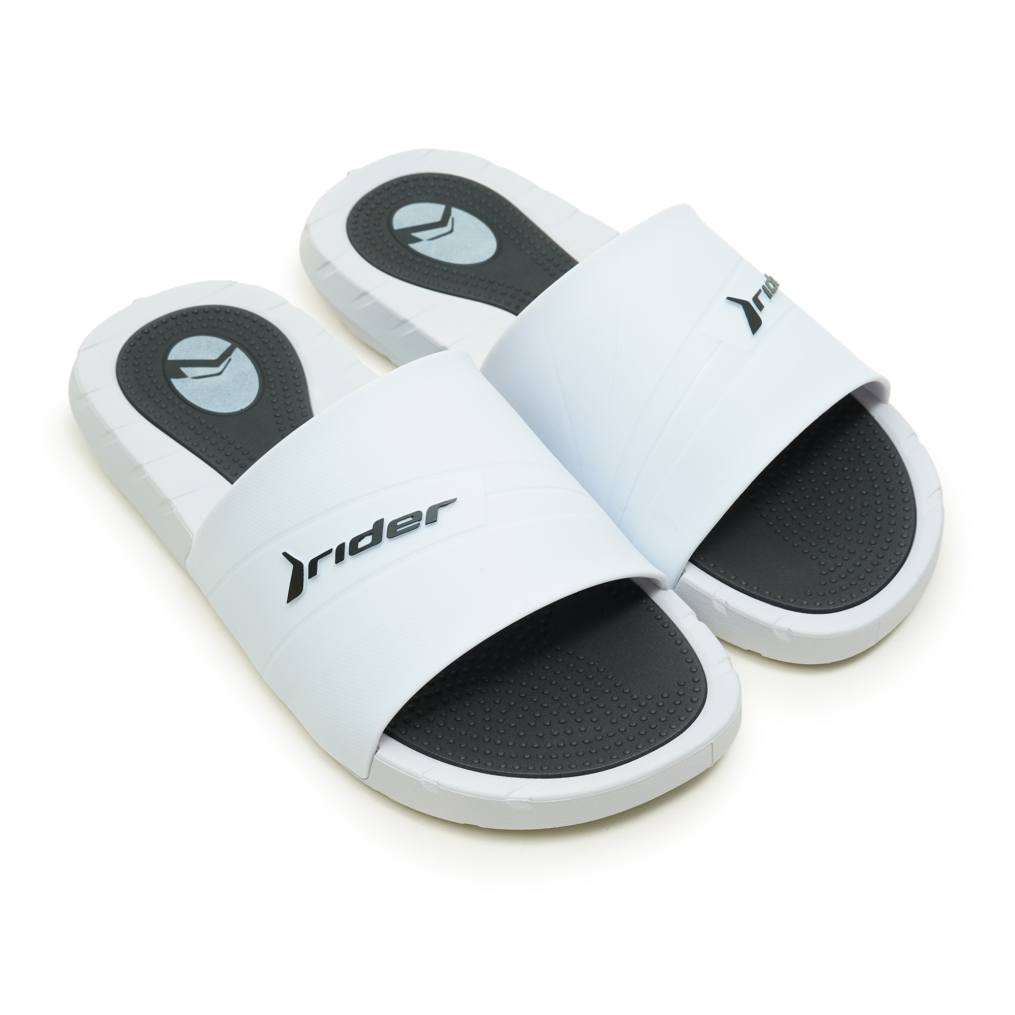 Rider brings to this slide the fusion of matte and polished finishes, inspired by sneakers. With textures and chamfers that enrich the design, the upper highlights the logo in contrast. The anatomical insole, with massaging textures, ensures comfort, while color details add irreverence without losing versatility.
