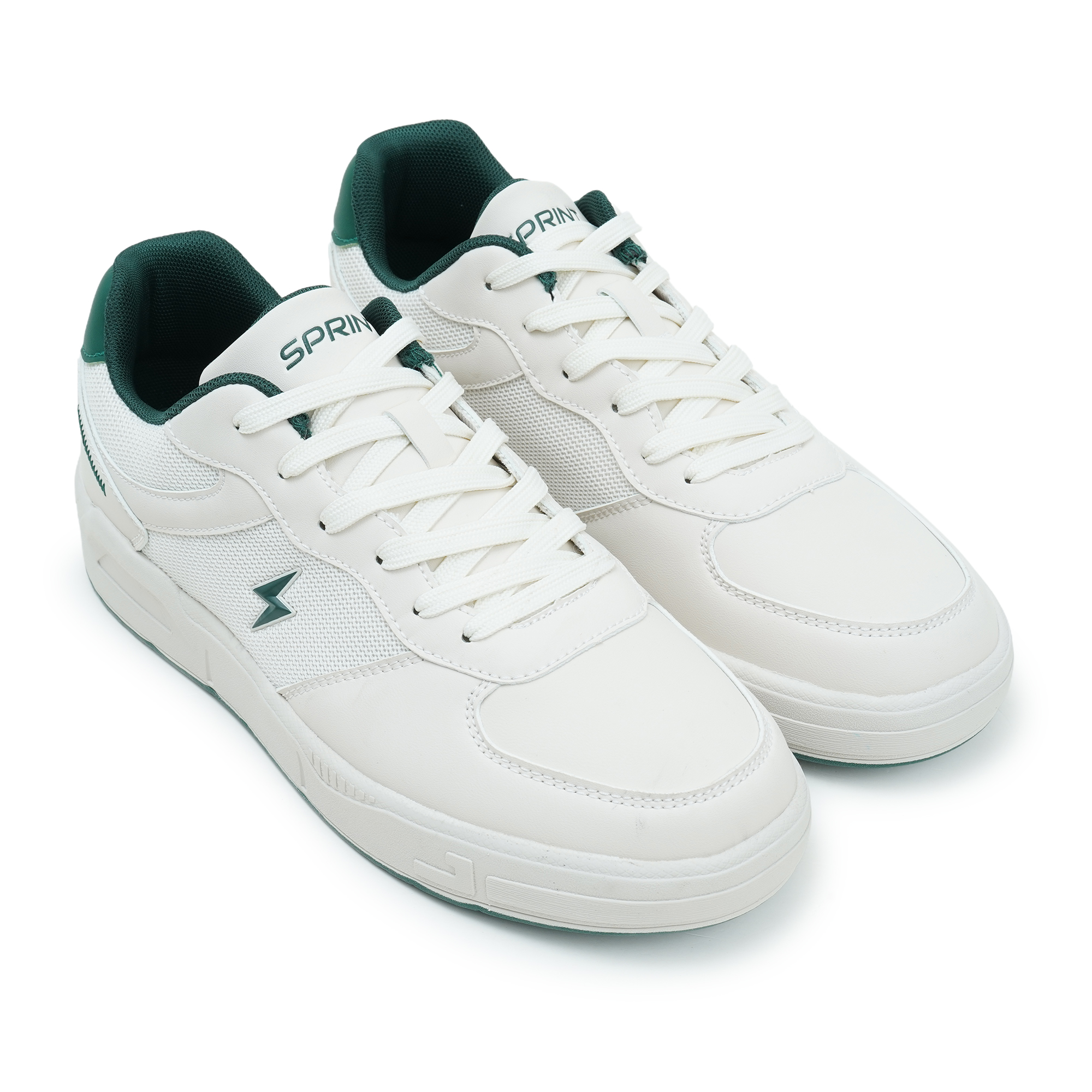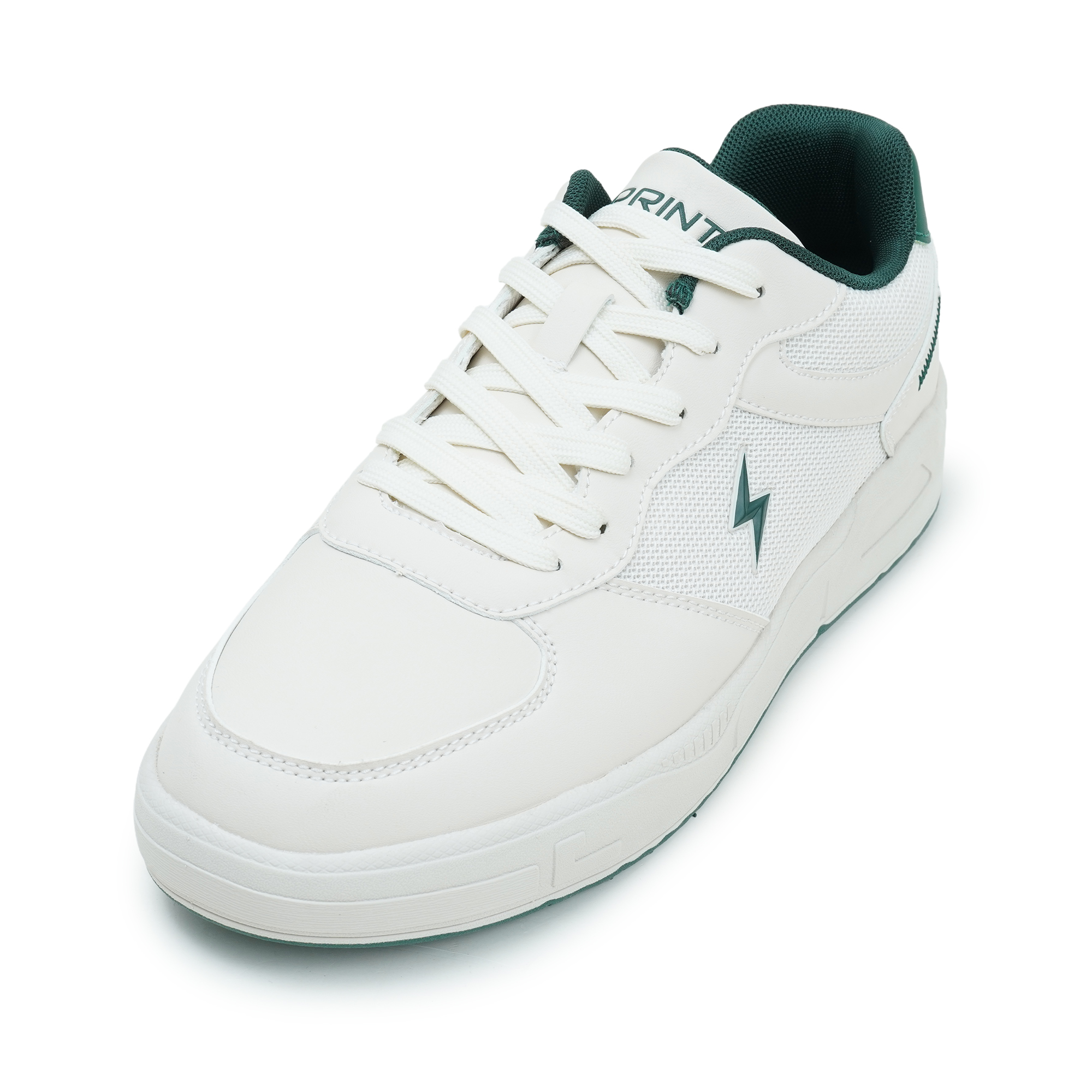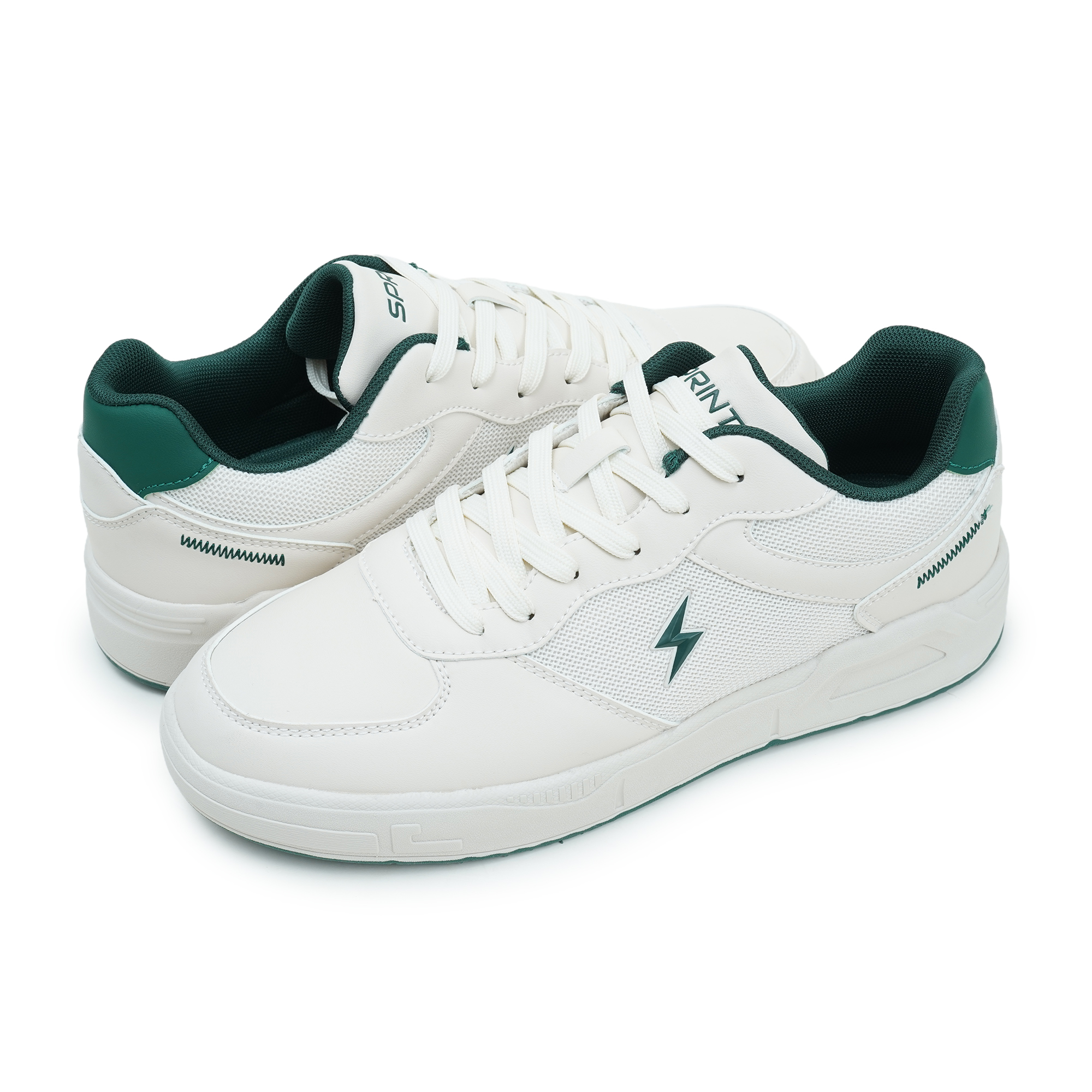 Sprint’s men’s white canvas sneaker pairs a smooth PU upper with mesh panels for a crisp, breathable look that’s perfect for everyday wear. The streamlined silhouette features a padded collar and tongue for added comfort while a cushioned EVA midsole absorbs impact for all-day support. A durable rubber outsole delivers reliable traction and includes contrasting green trim that complements the interior lining and heel accent. Tonal stitching and a subtle lightning-bolt logo on the side add sporty character without overpowering the minimalist design. Versatile and clean, this sneaker transitions easily from casual outings to light active use.
