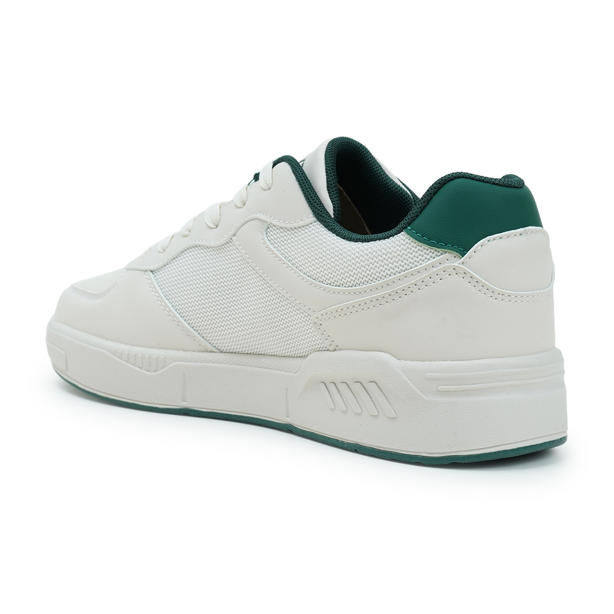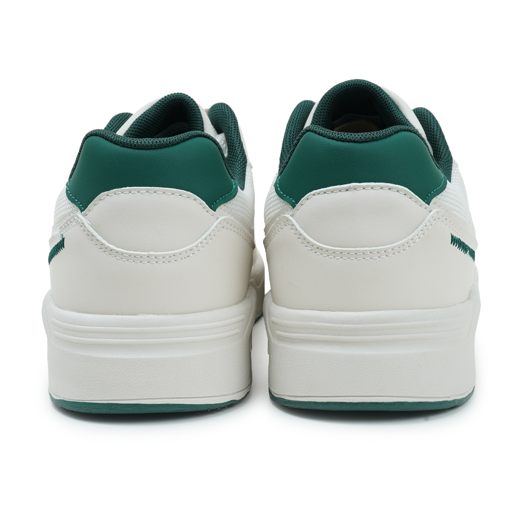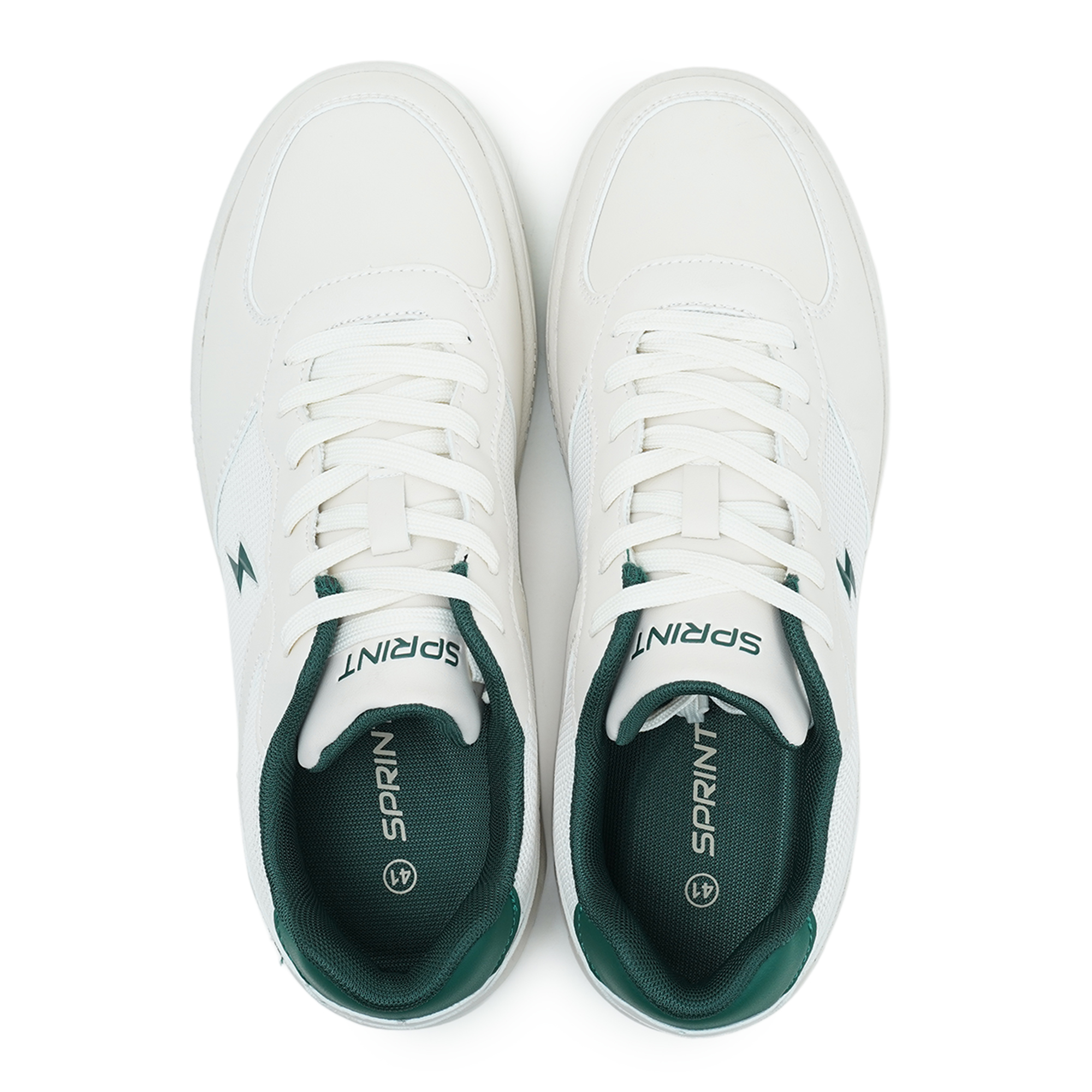 Sprint’s men’s white canvas sneaker pairs a smooth PU upper with mesh panels for a crisp, breathable look that’s perfect for everyday wear. The streamlined silhouette features a padded collar and tongue for added comfort while a cushioned EVA midsole absorbs impact for all-day support. A durable rubber outsole delivers reliable traction and includes contrasting green trim that complements the interior lining and heel accent. Tonal stitching and a subtle lightning-bolt logo on the side add sporty character without overpowering the minimalist design. Versatile and clean, this sneaker transitions easily from casual outings to light active use.