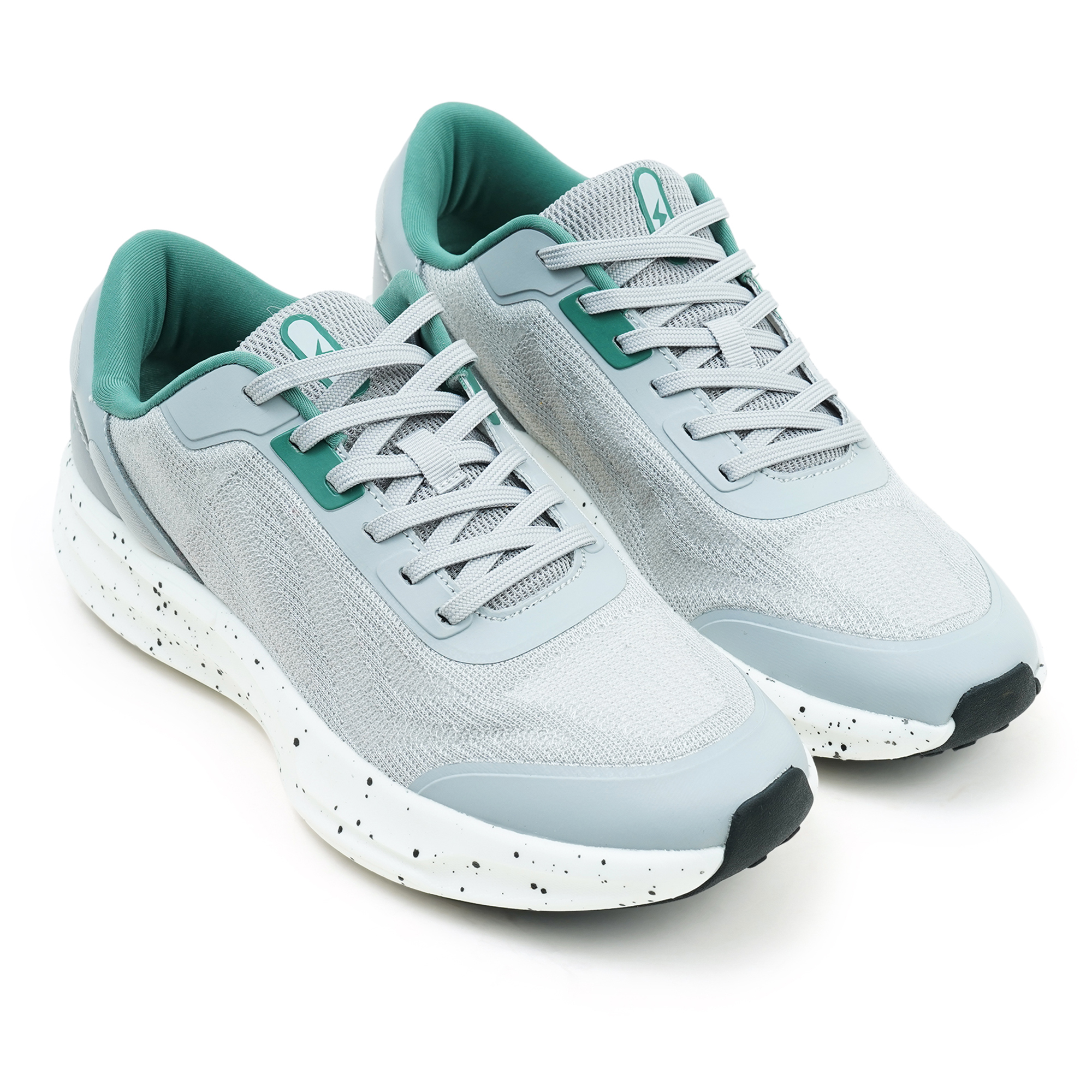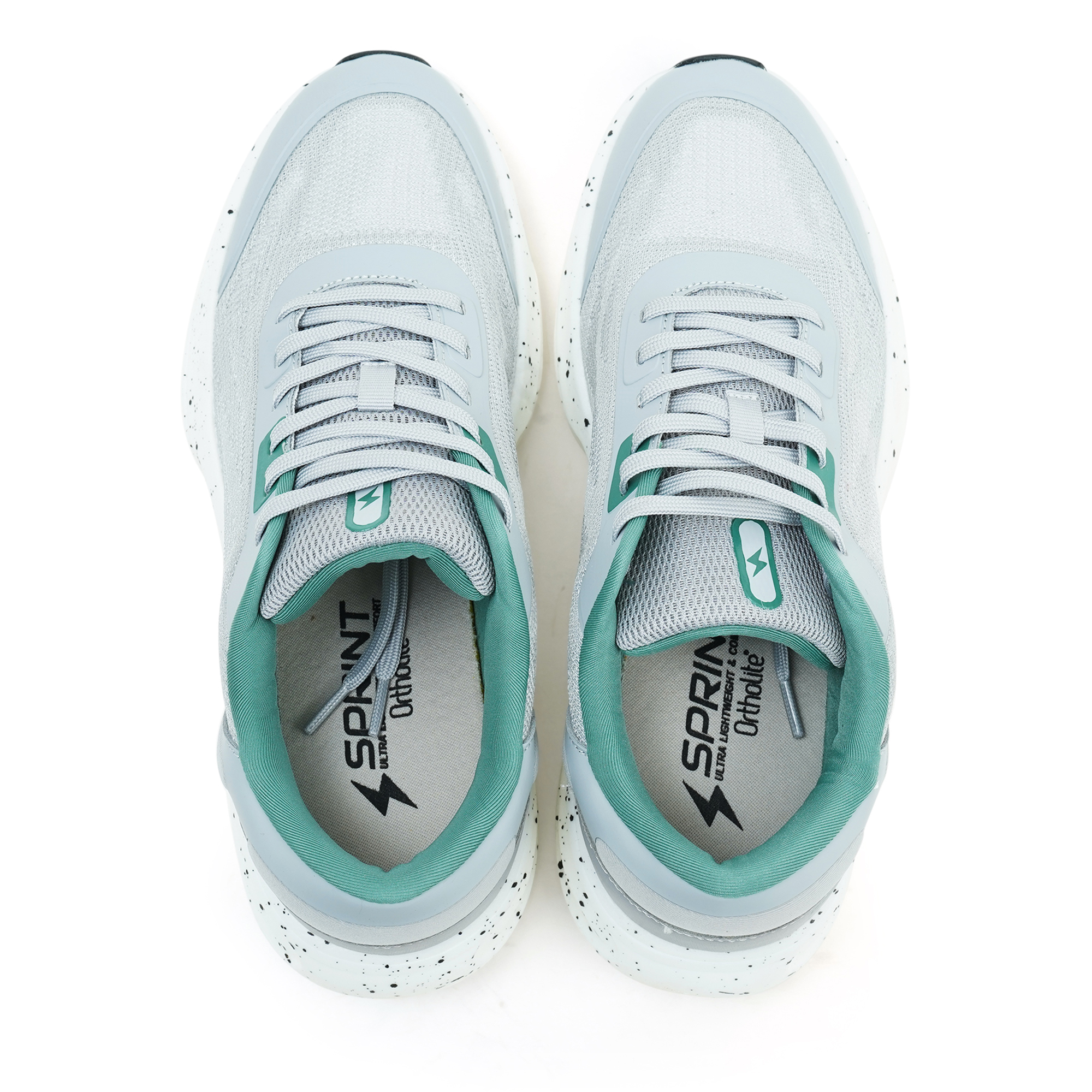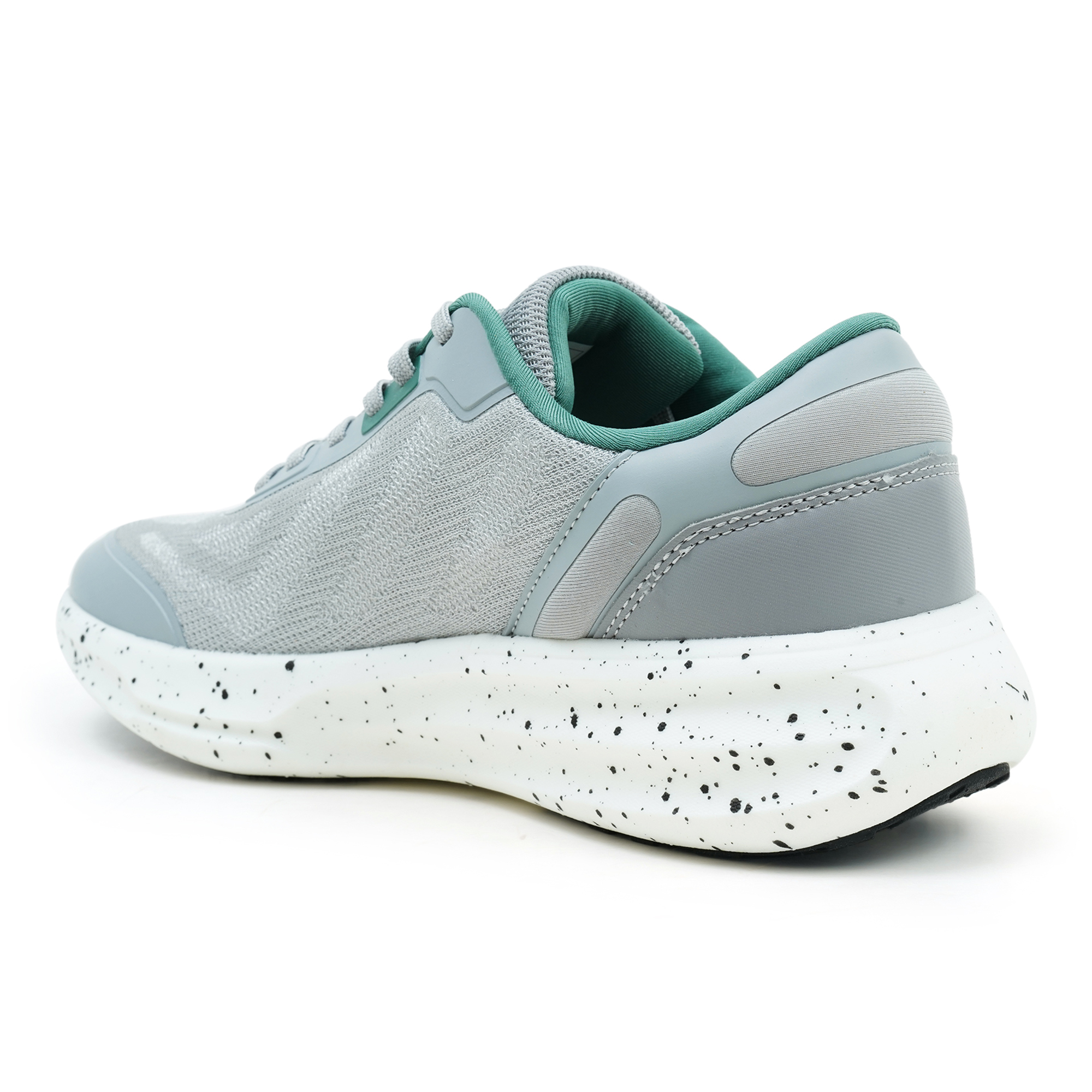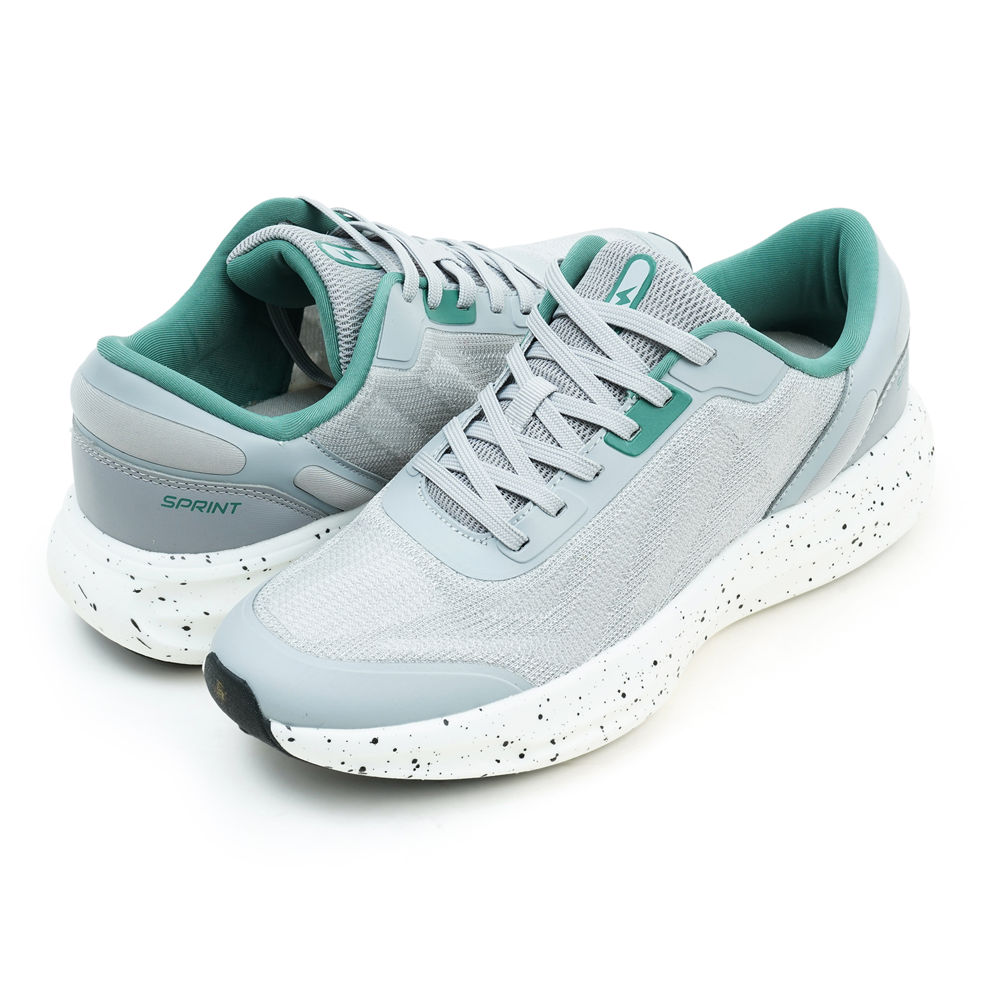 Refresh your activewear with the Sprint Men’s Sprots Shoe Mesh Runner. This isn't just a basic grey shoe; it features a breathable, silver-grey mesh upper accented by a vibrant teal collar and lining for a modern, energetic look. The standout feature is the cushioned EVA midsole, finished with a trendy black speckled effect. While the foam keeps you comfortable, the TPR rubber inserts at the toe and heel provide the durability and grip you need for city running
