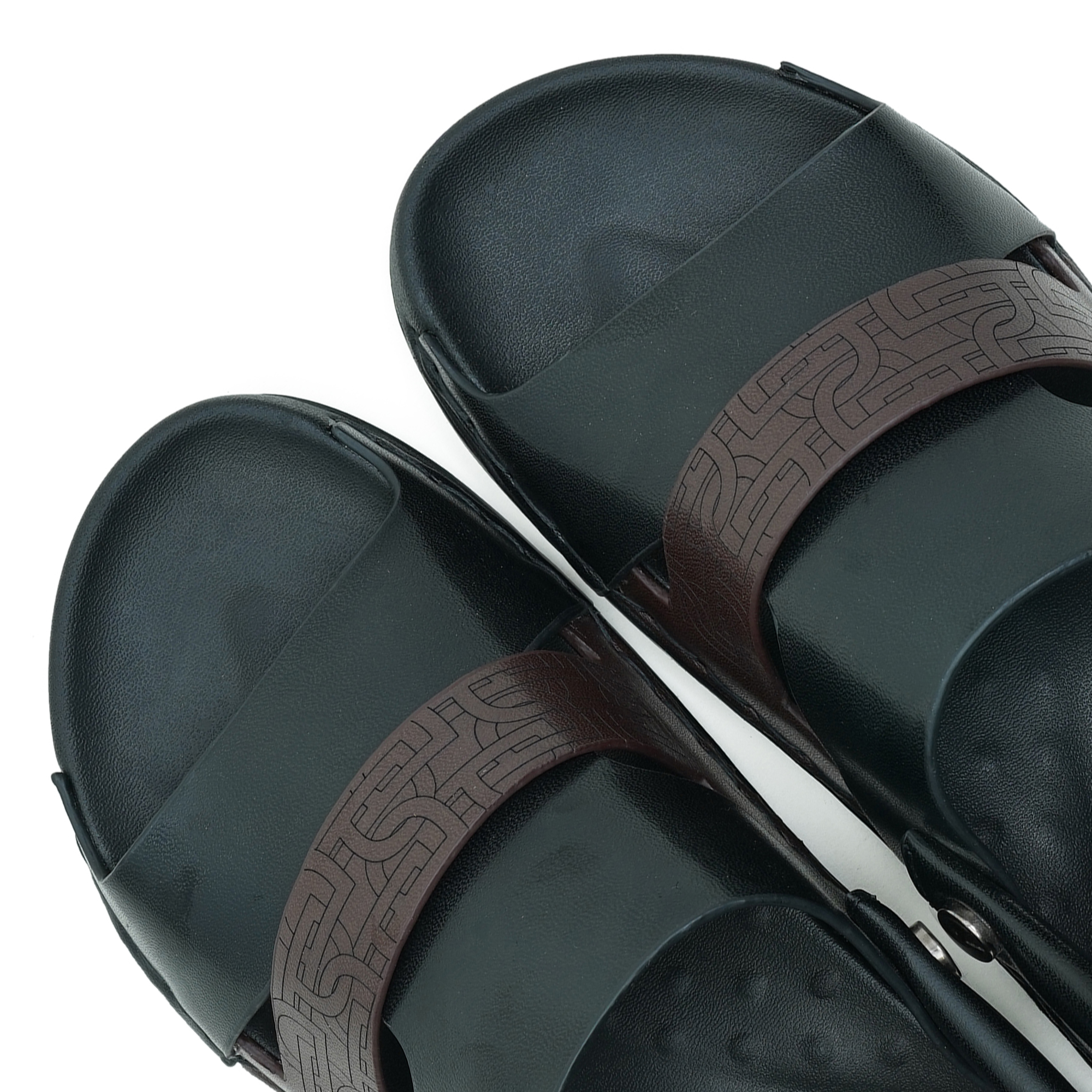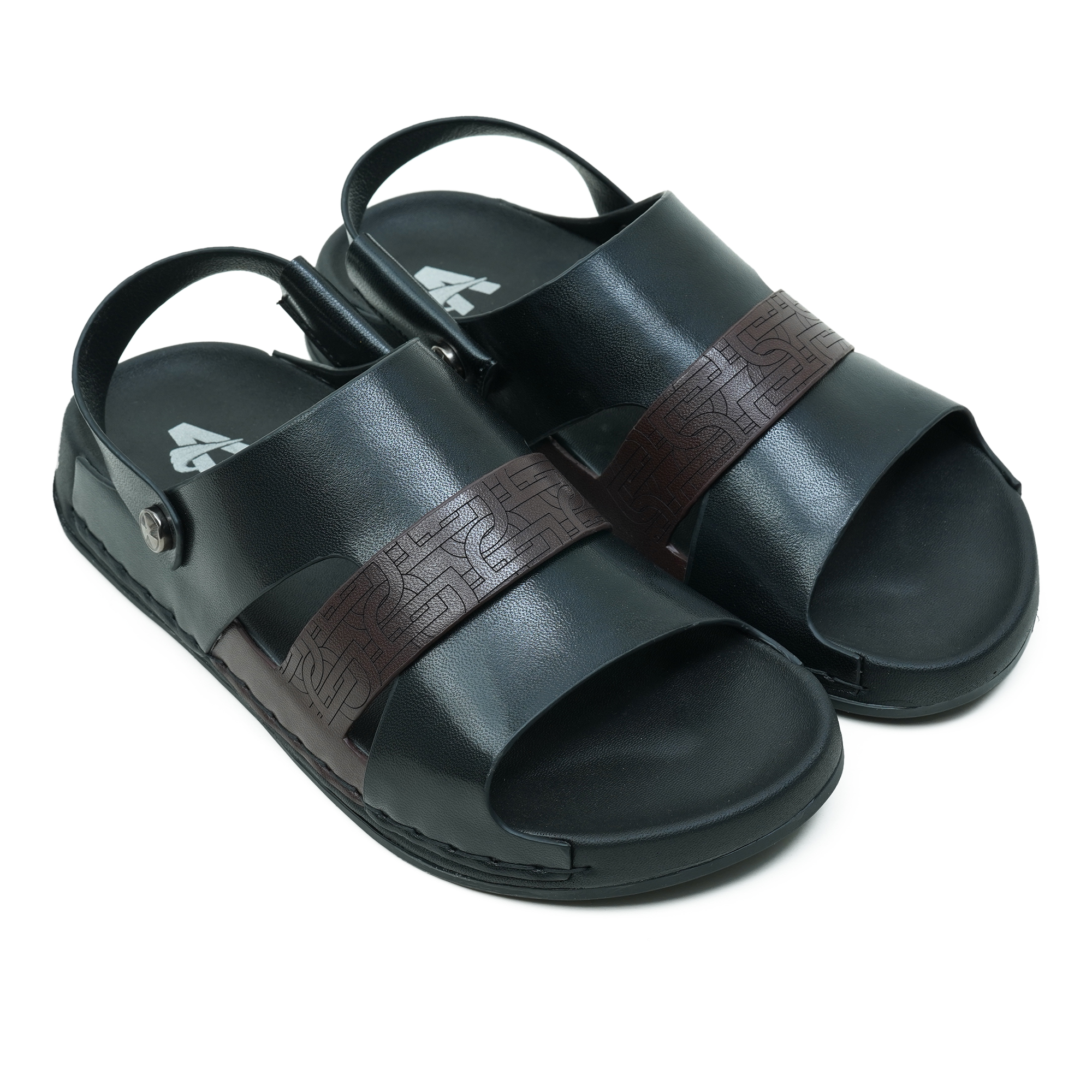 - Wide front vamp with decorative embossed brown strap detail