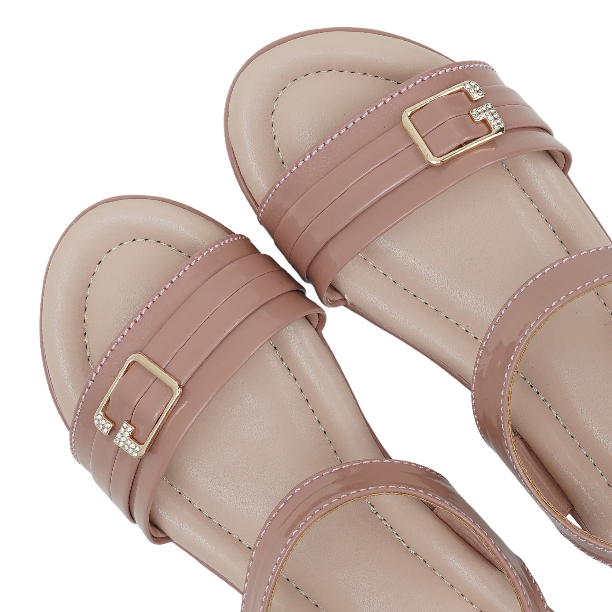 - Slim decorative belt across the toe with gold-tone buckle and rhinestone accents